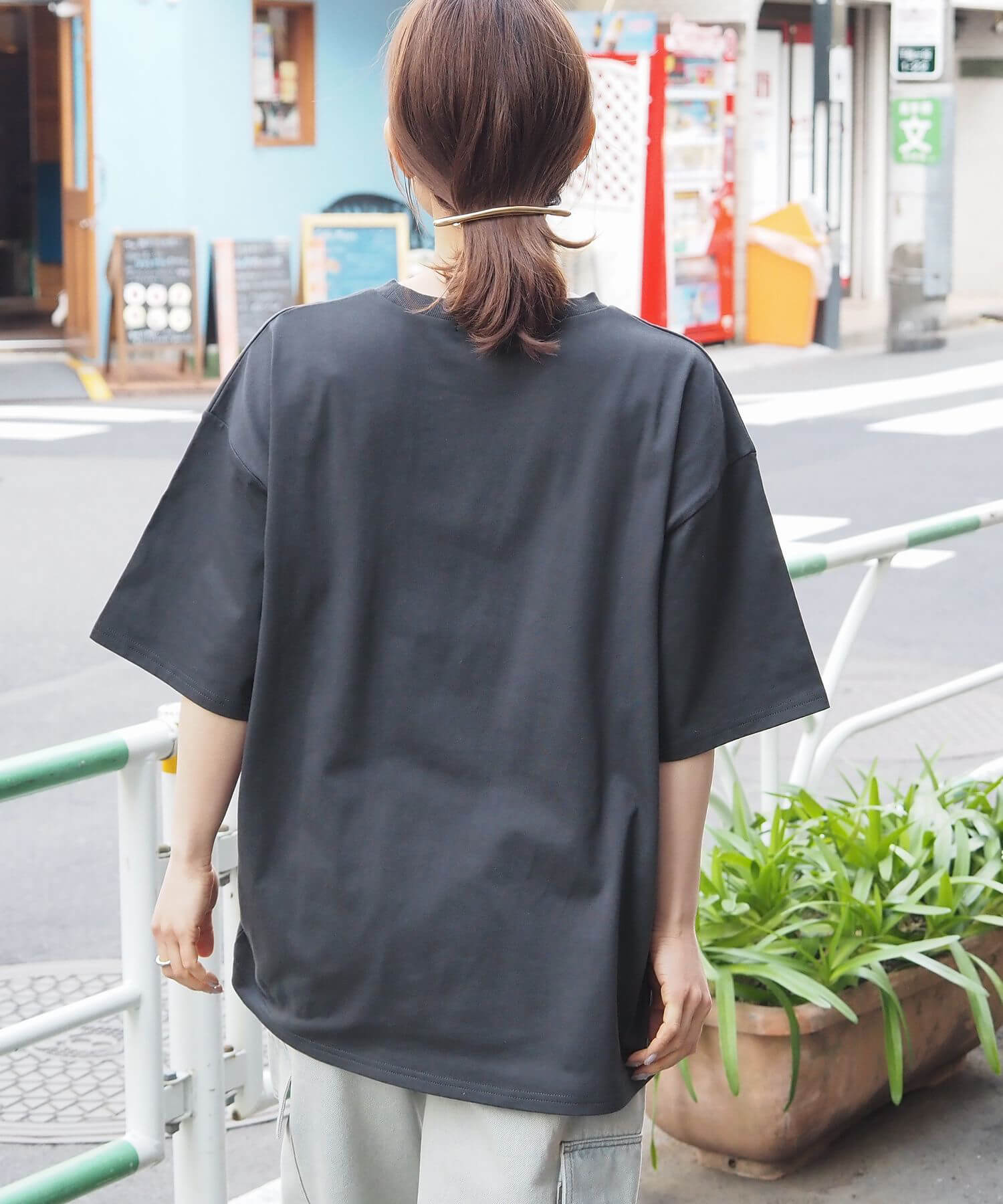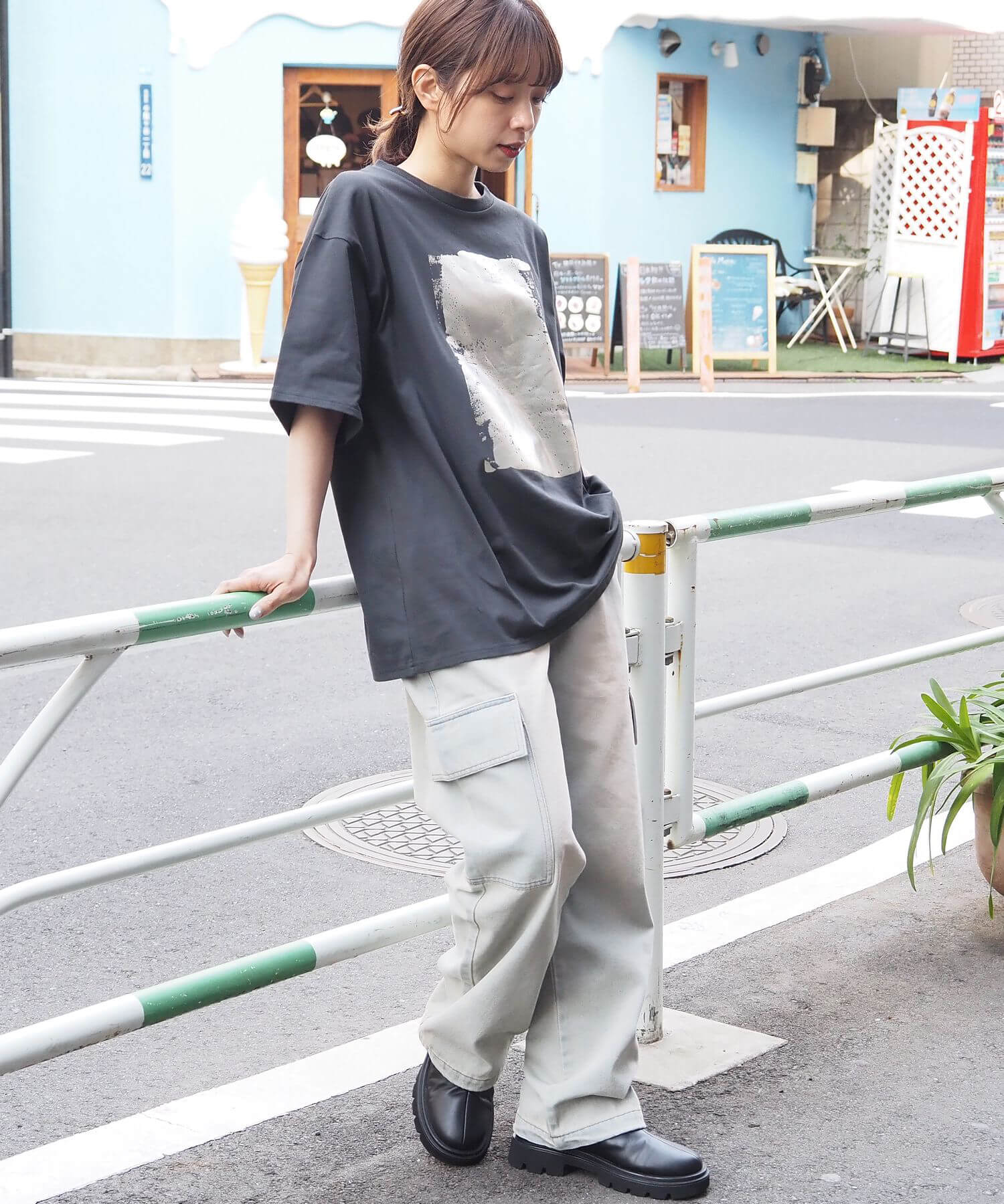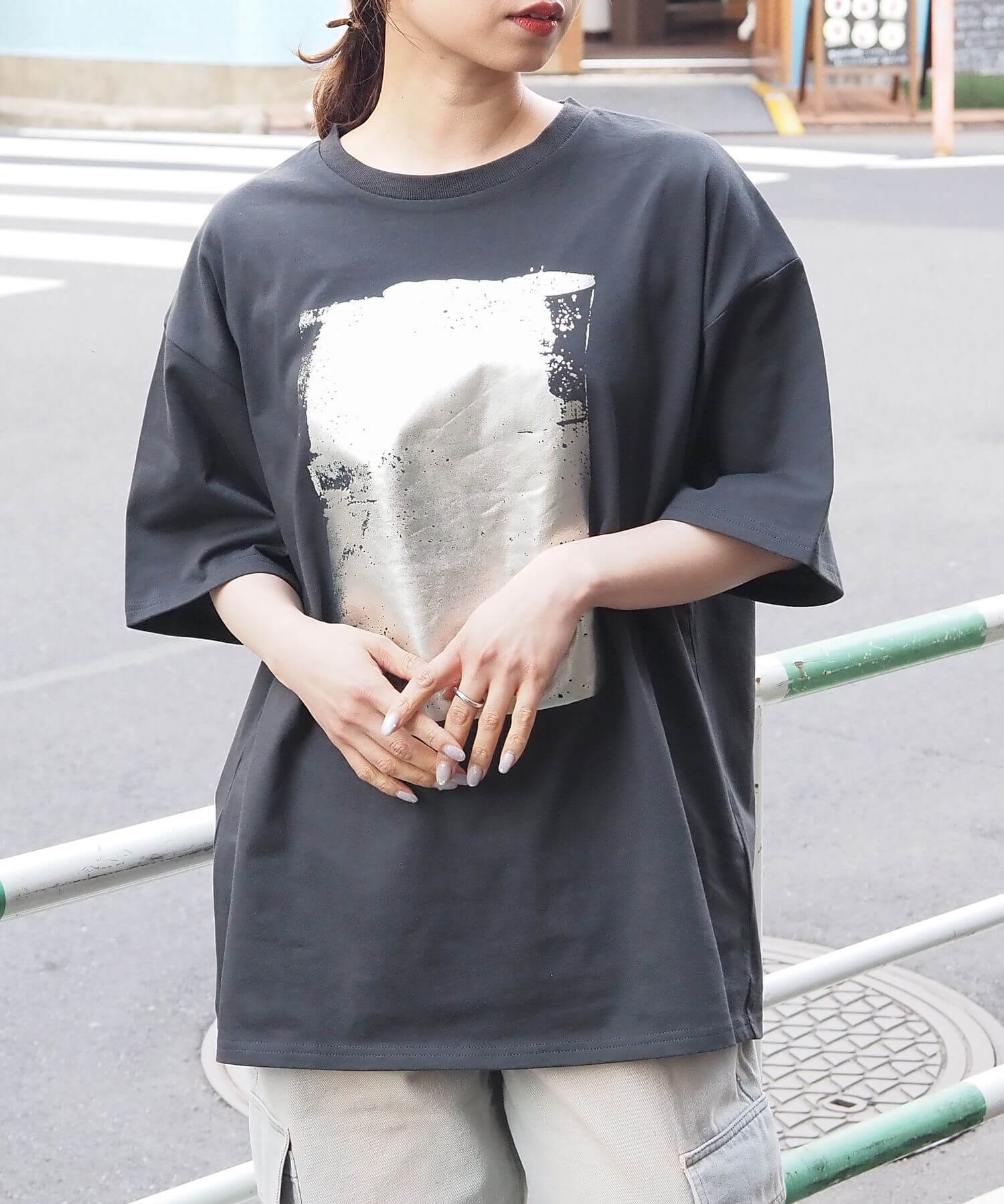 ・カーゴパンツなど、ワイドシルエットのパンツでメンズライクにコーディネート。光沢のある箔プリントがモード感をプラスし、こなれた印象に◎