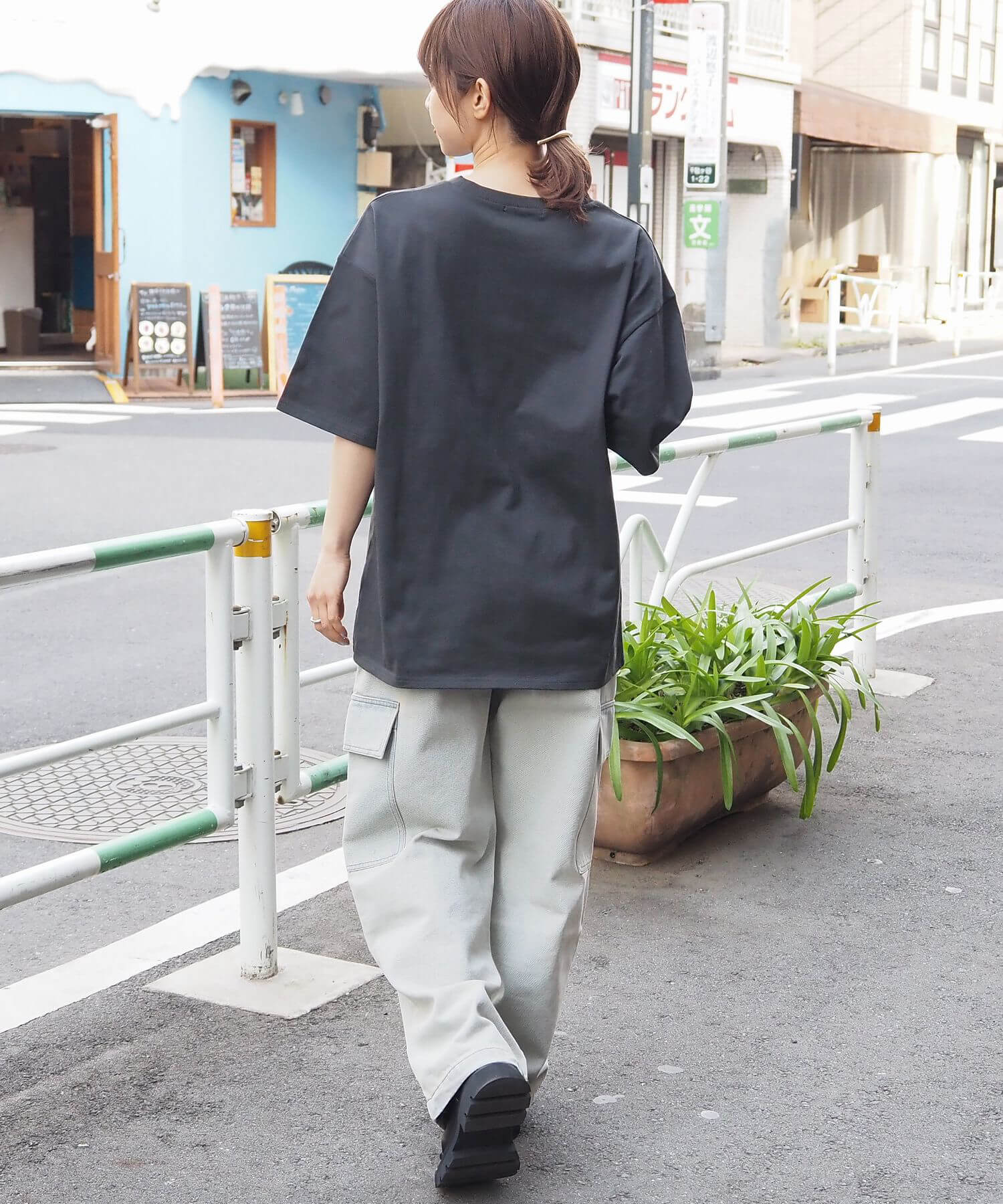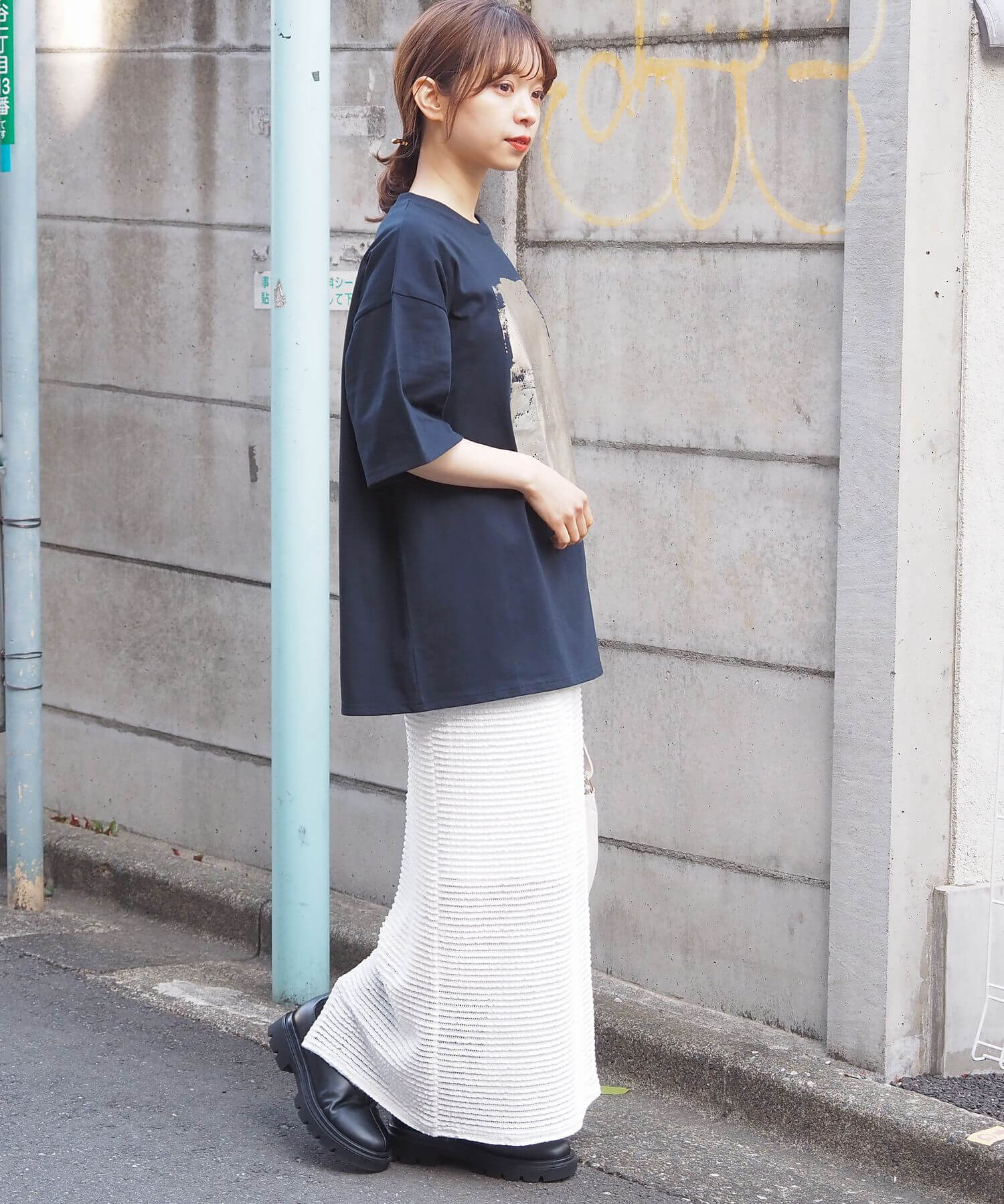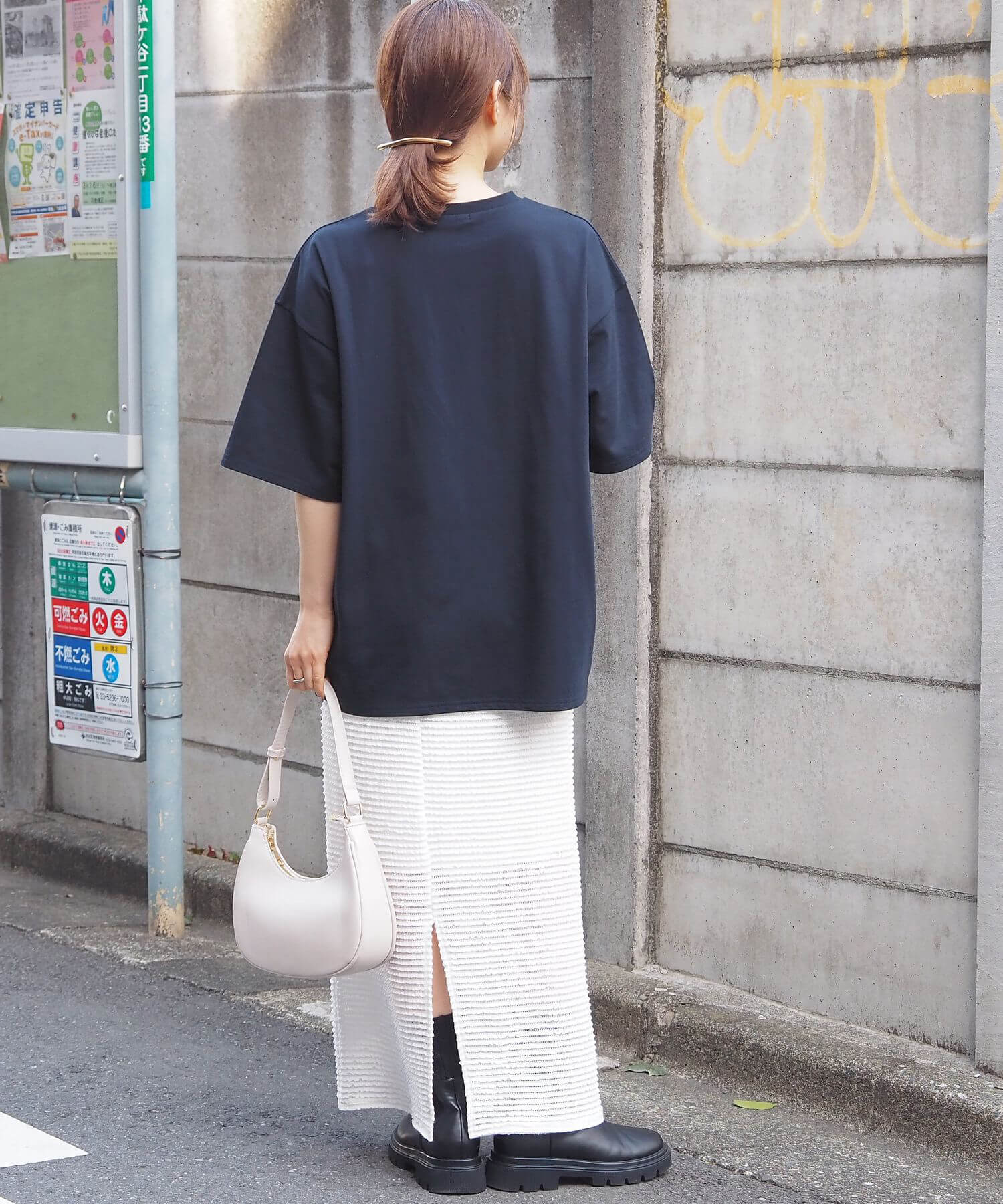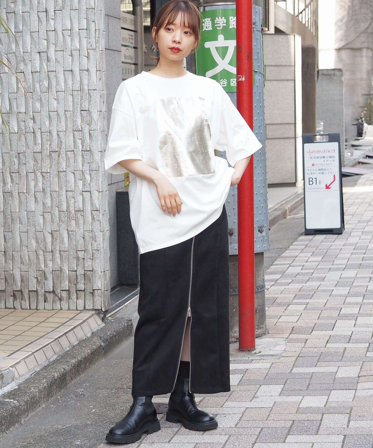 ・カーゴパンツなど、ワイドシルエットのパンツでメンズライクにコーディネート。光沢のある箔プリントがモード感をプラスし、こなれた印象に◎