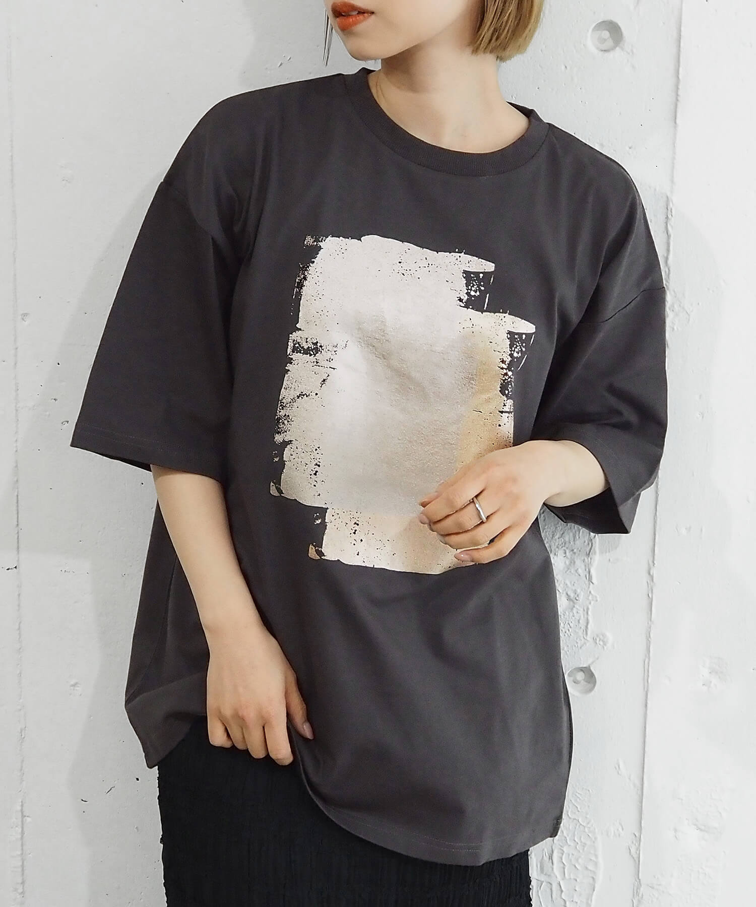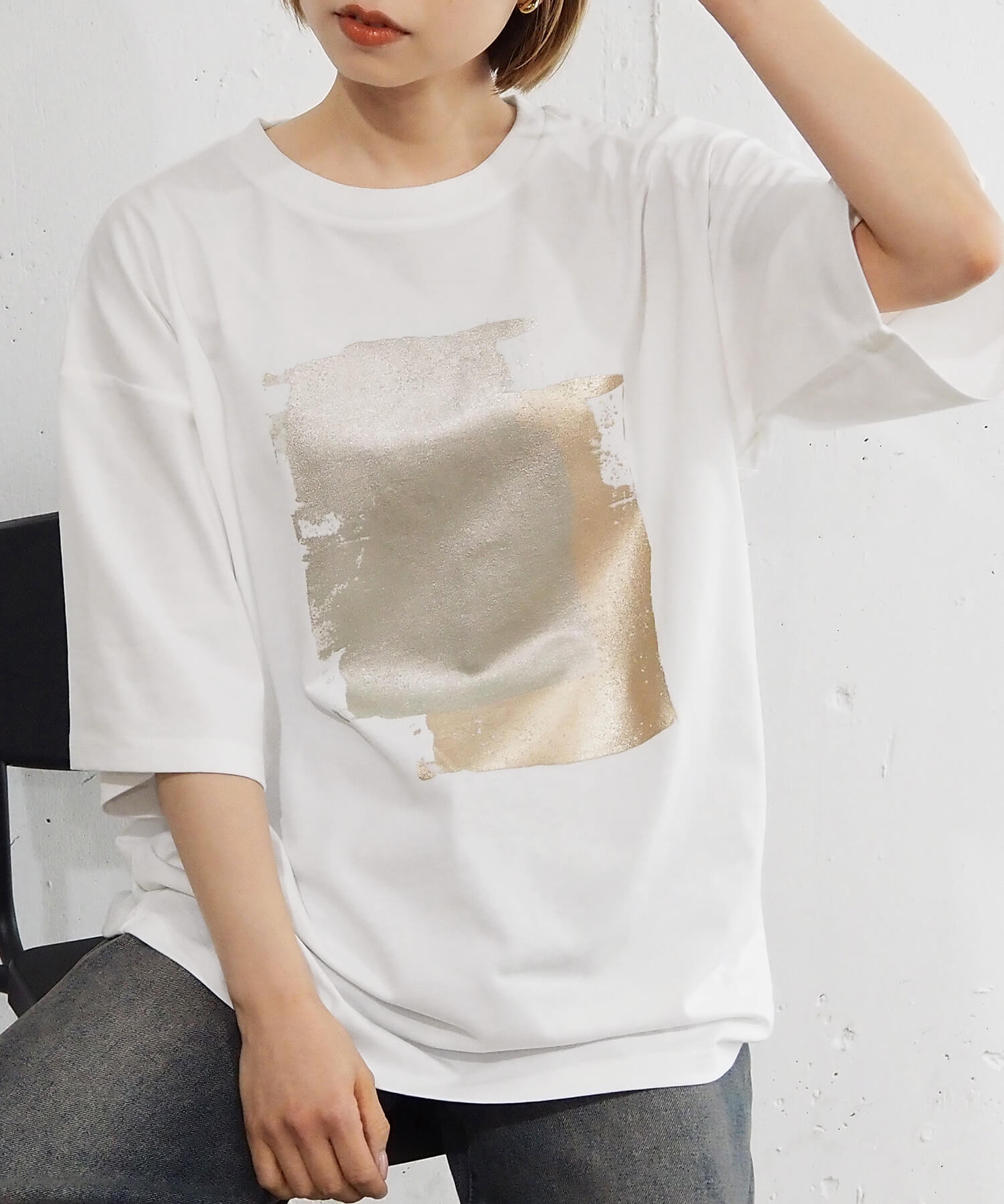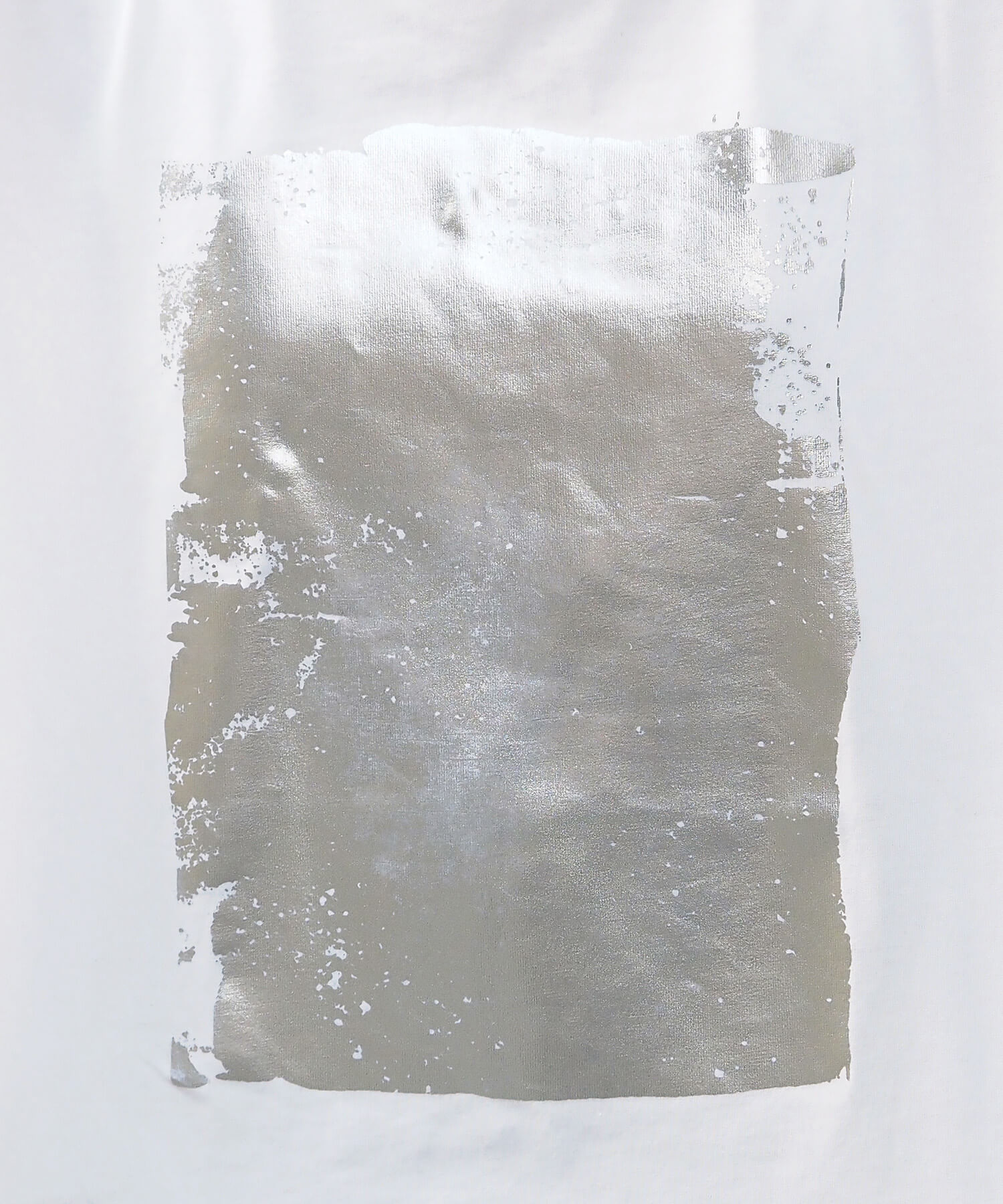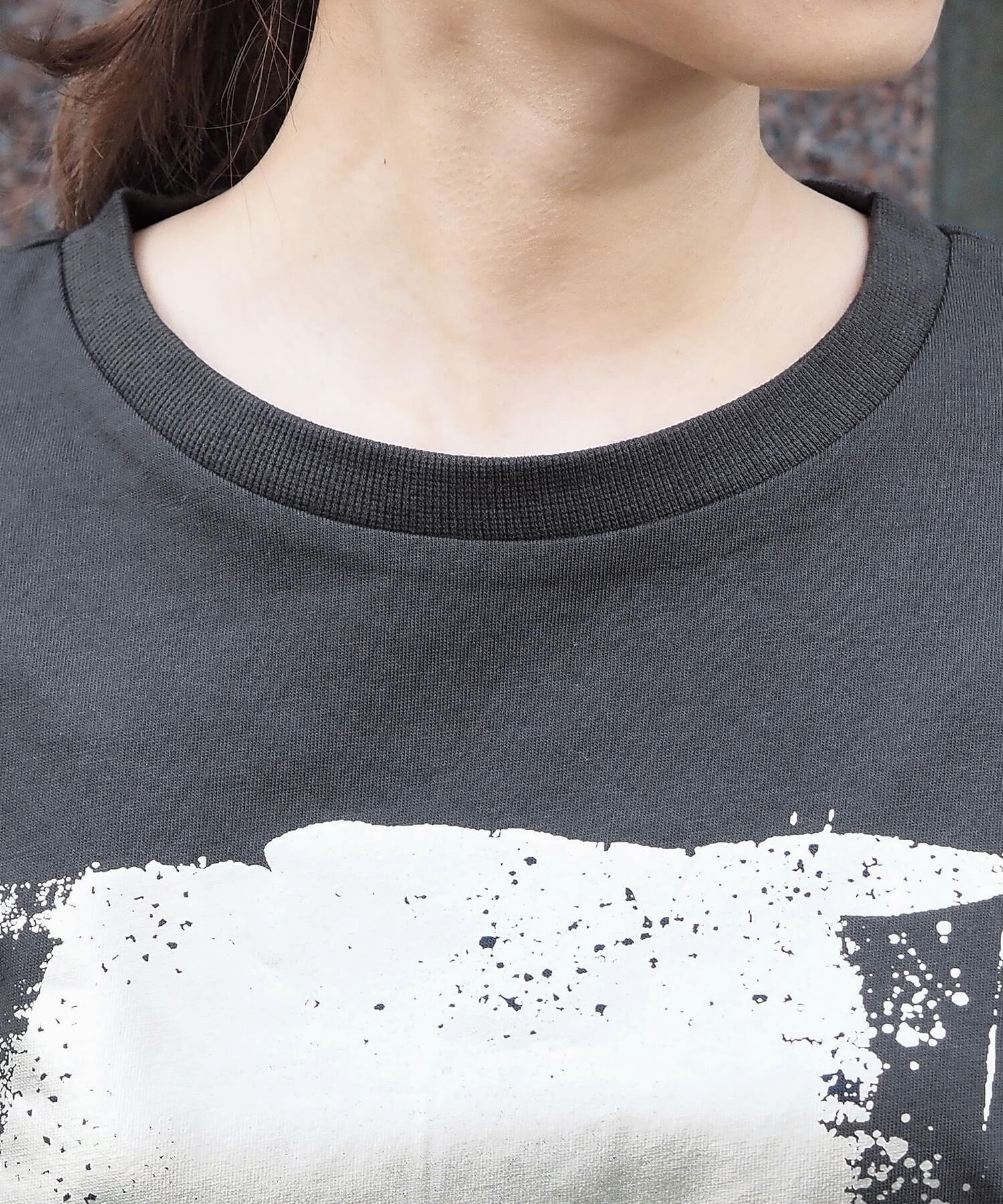 ・ペイント風デザインの箔プリントをフロントに大きく入れ、シンプルながらインパクトのある1枚に。