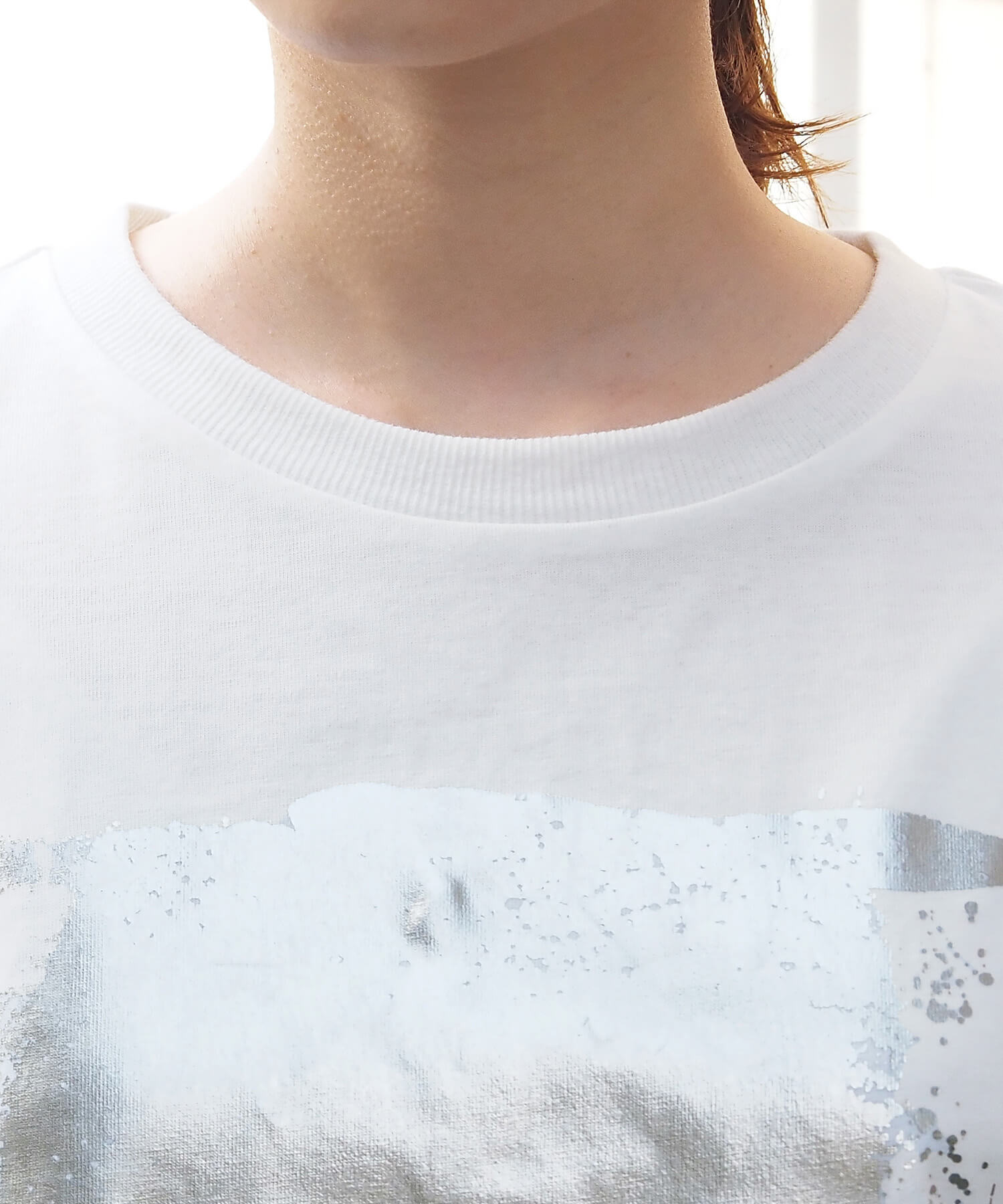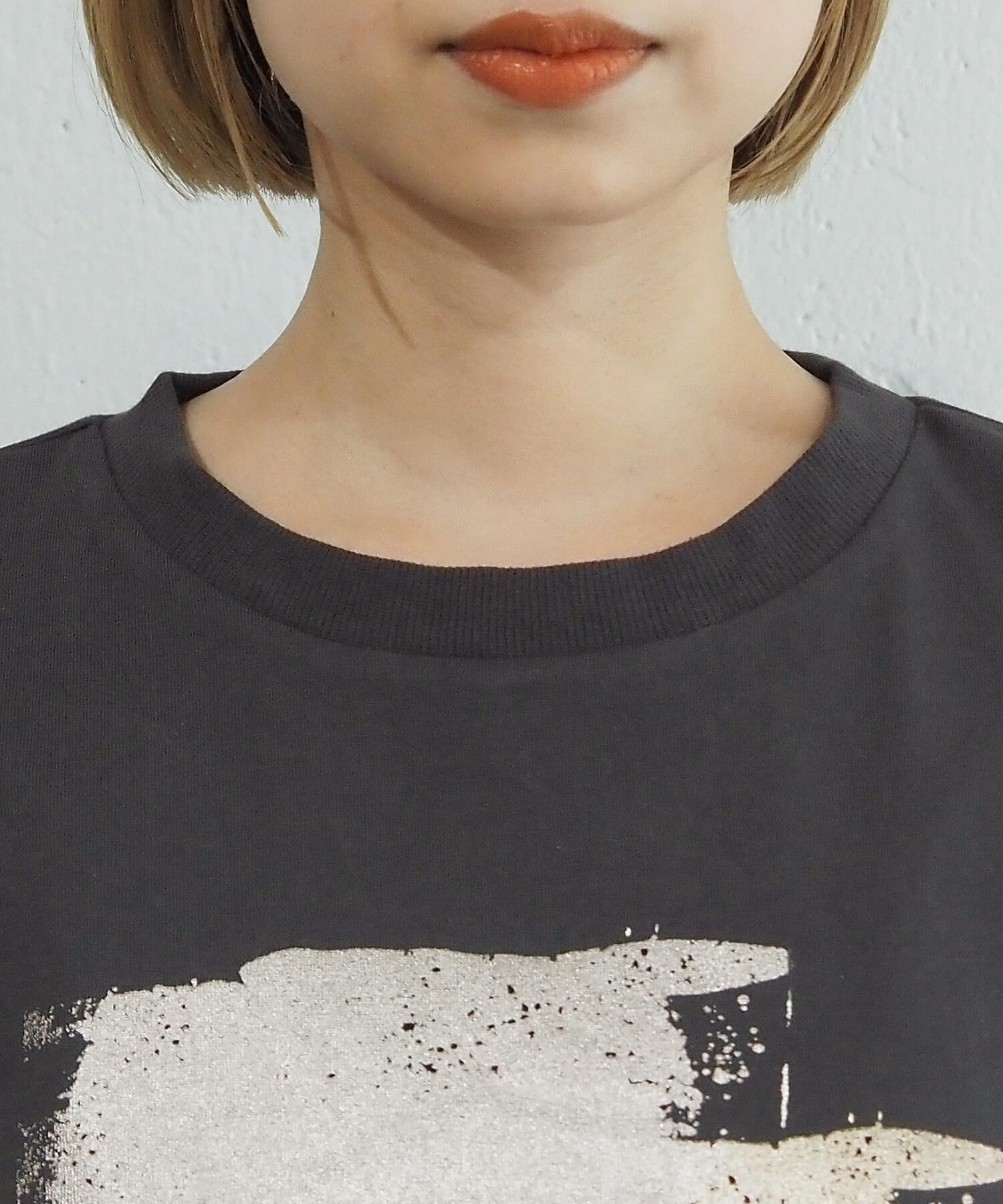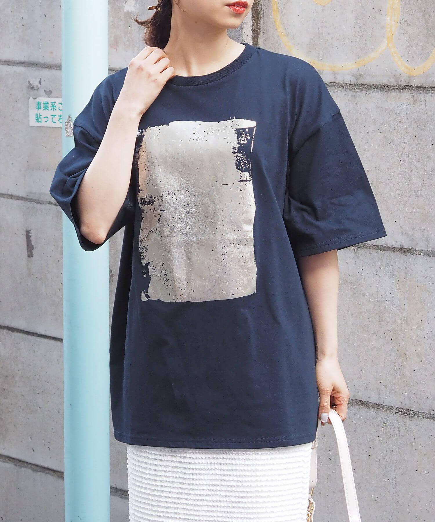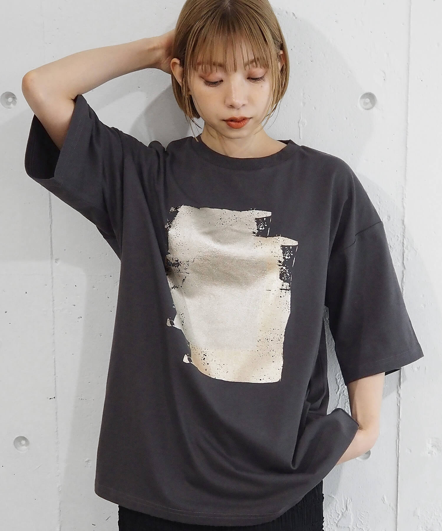 ・ペイント風デザインの箔プリントをフロントに大きく入れ、シンプルながらインパクトのある1枚に。