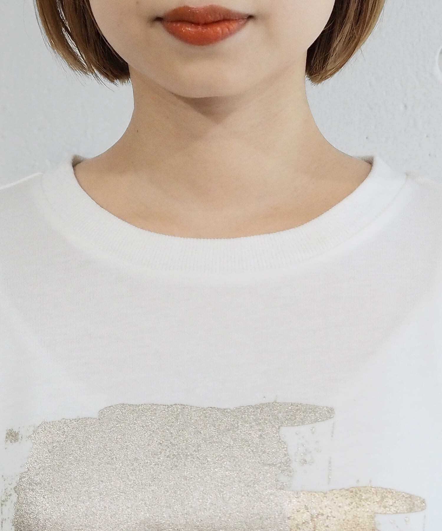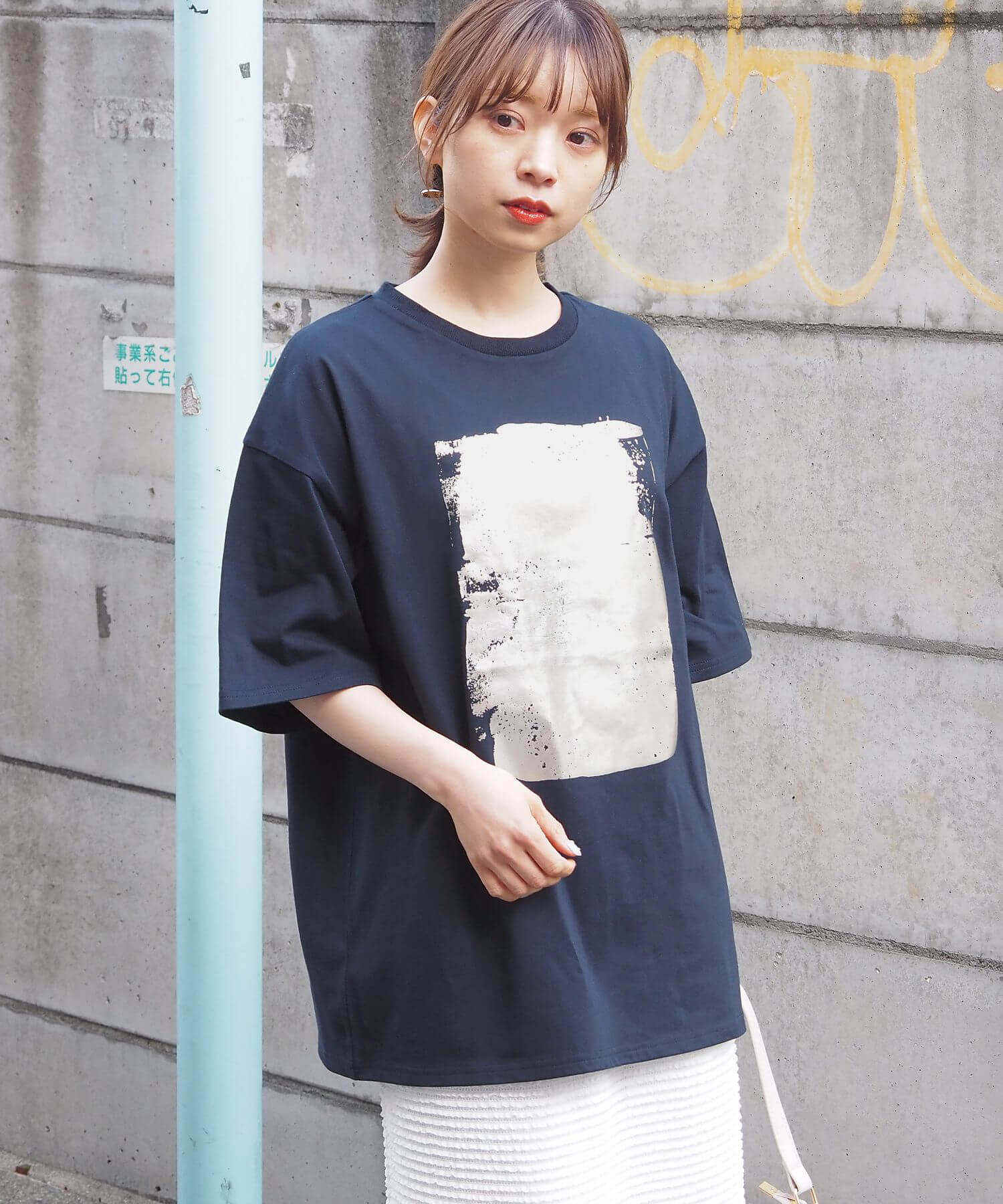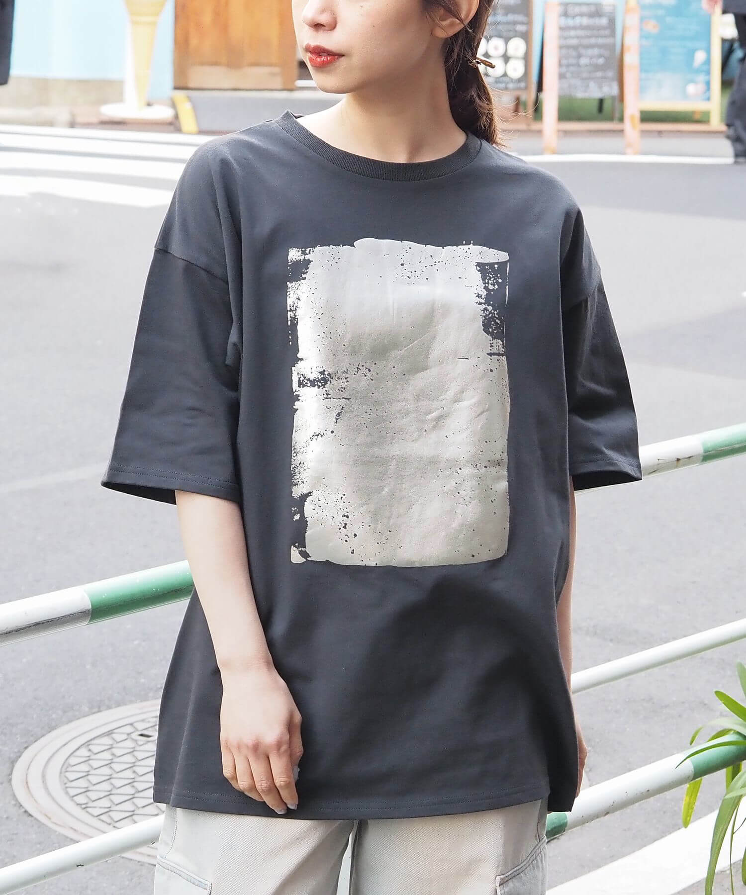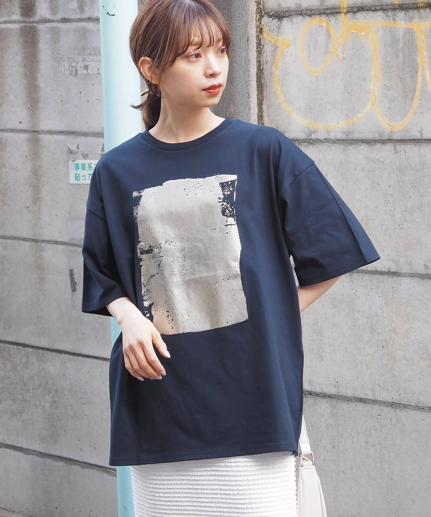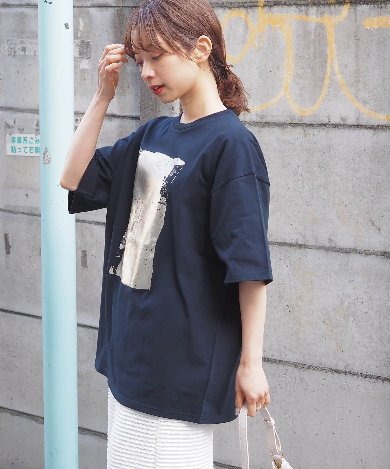 ・ペイント風デザインの箔プリントをフロントに大きく入れ、シンプルながらインパクトのある1枚に。