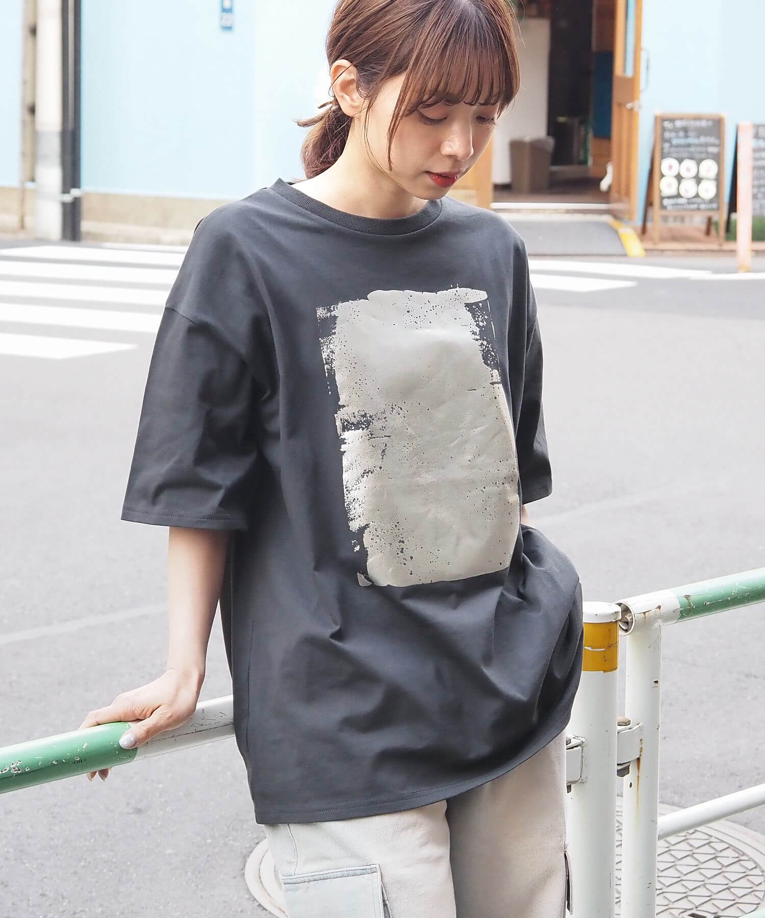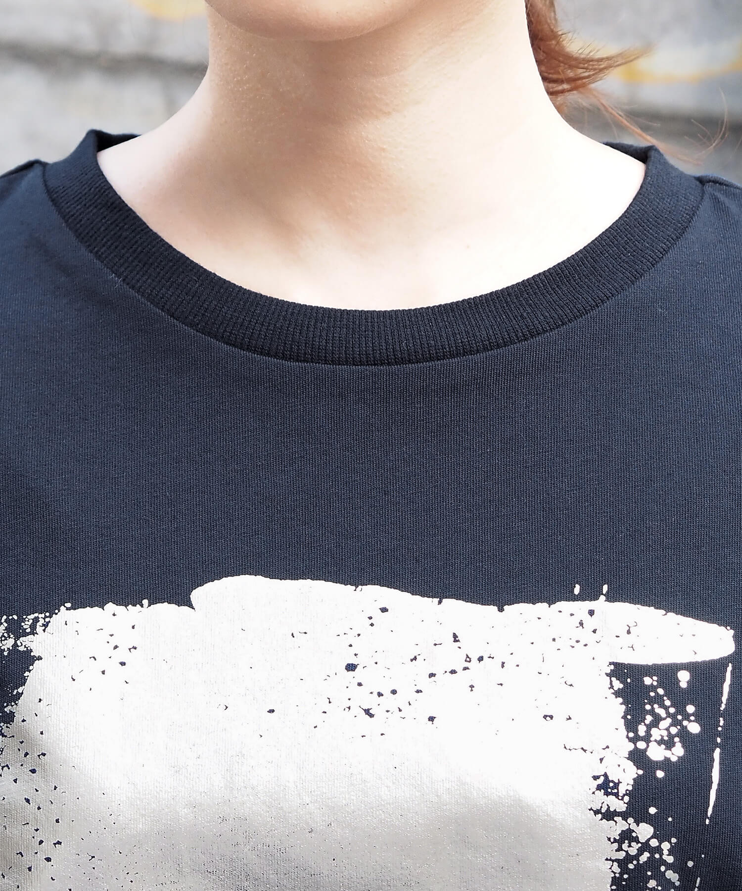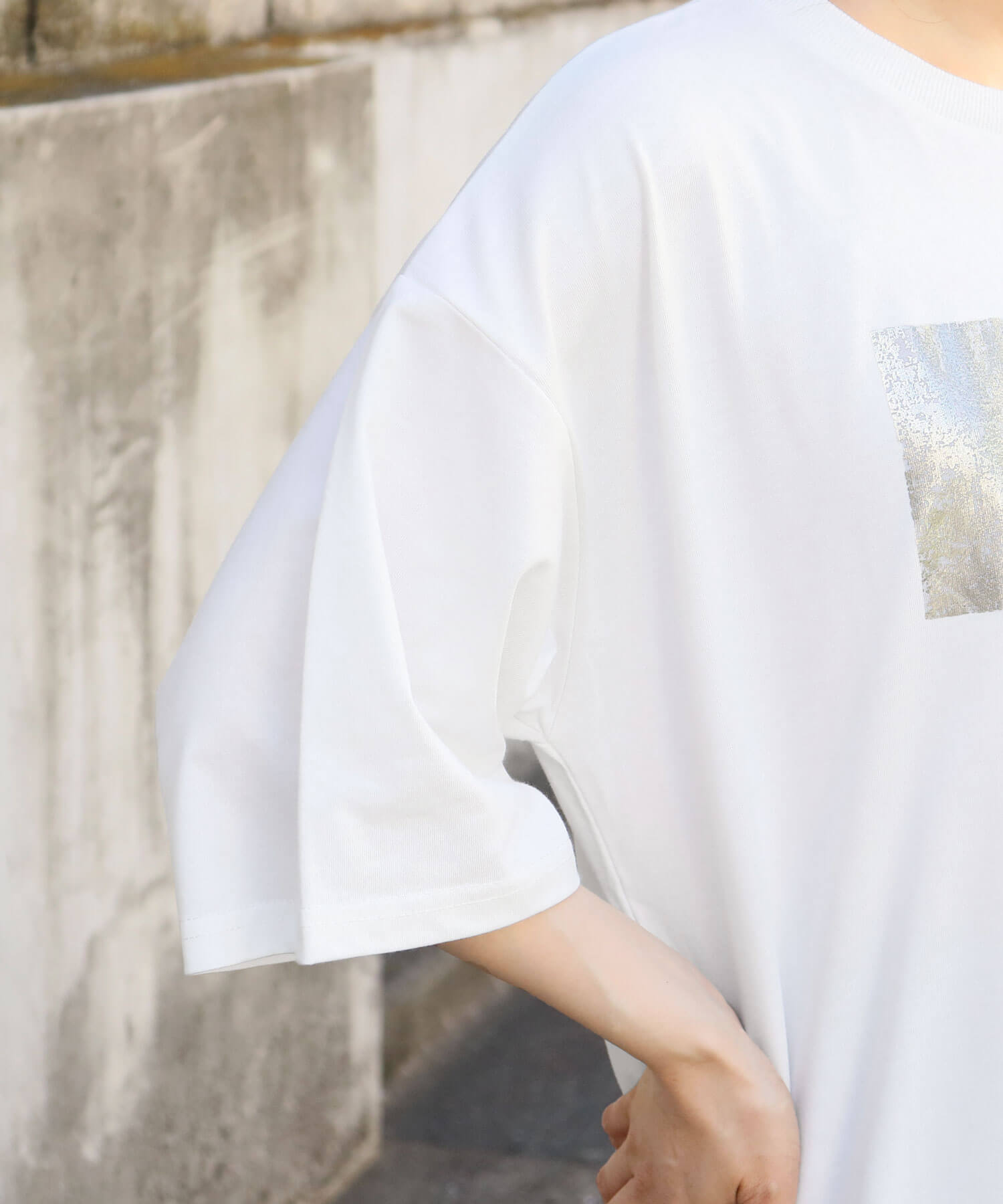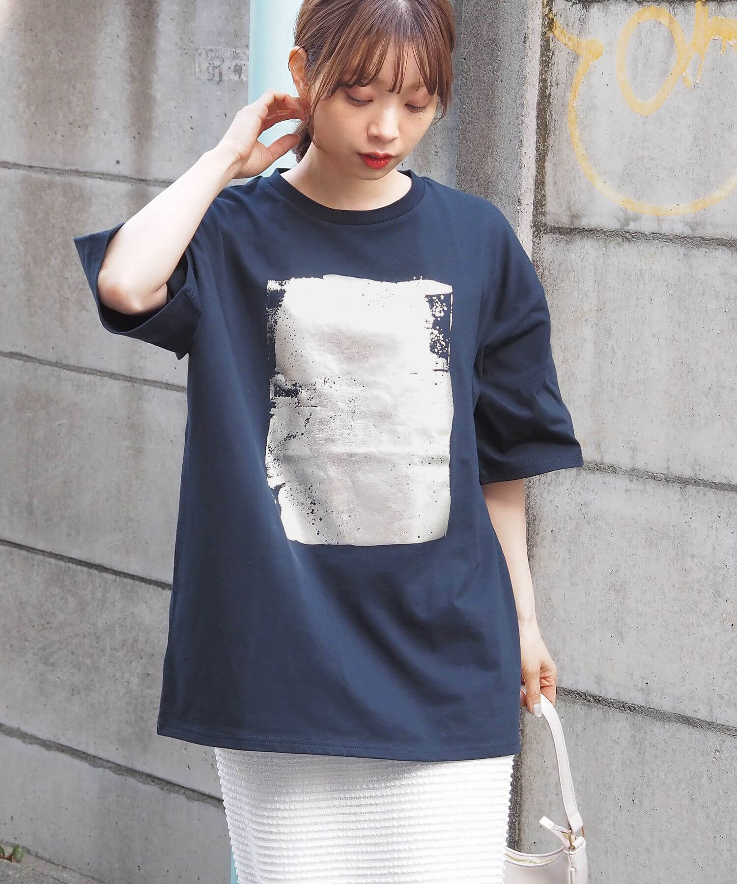 ・ペイント風デザインの箔プリントをフロントに大きく入れ、シンプルながらインパクトのある1枚に。