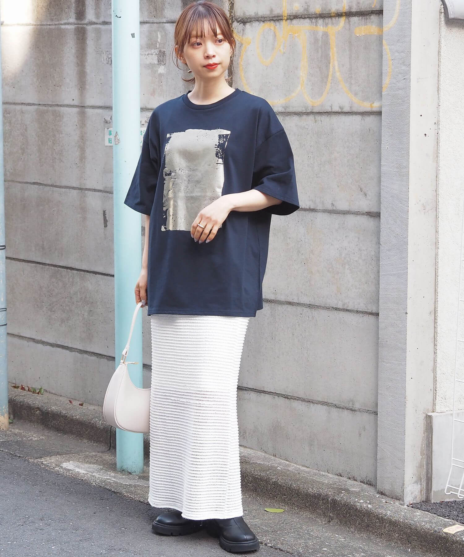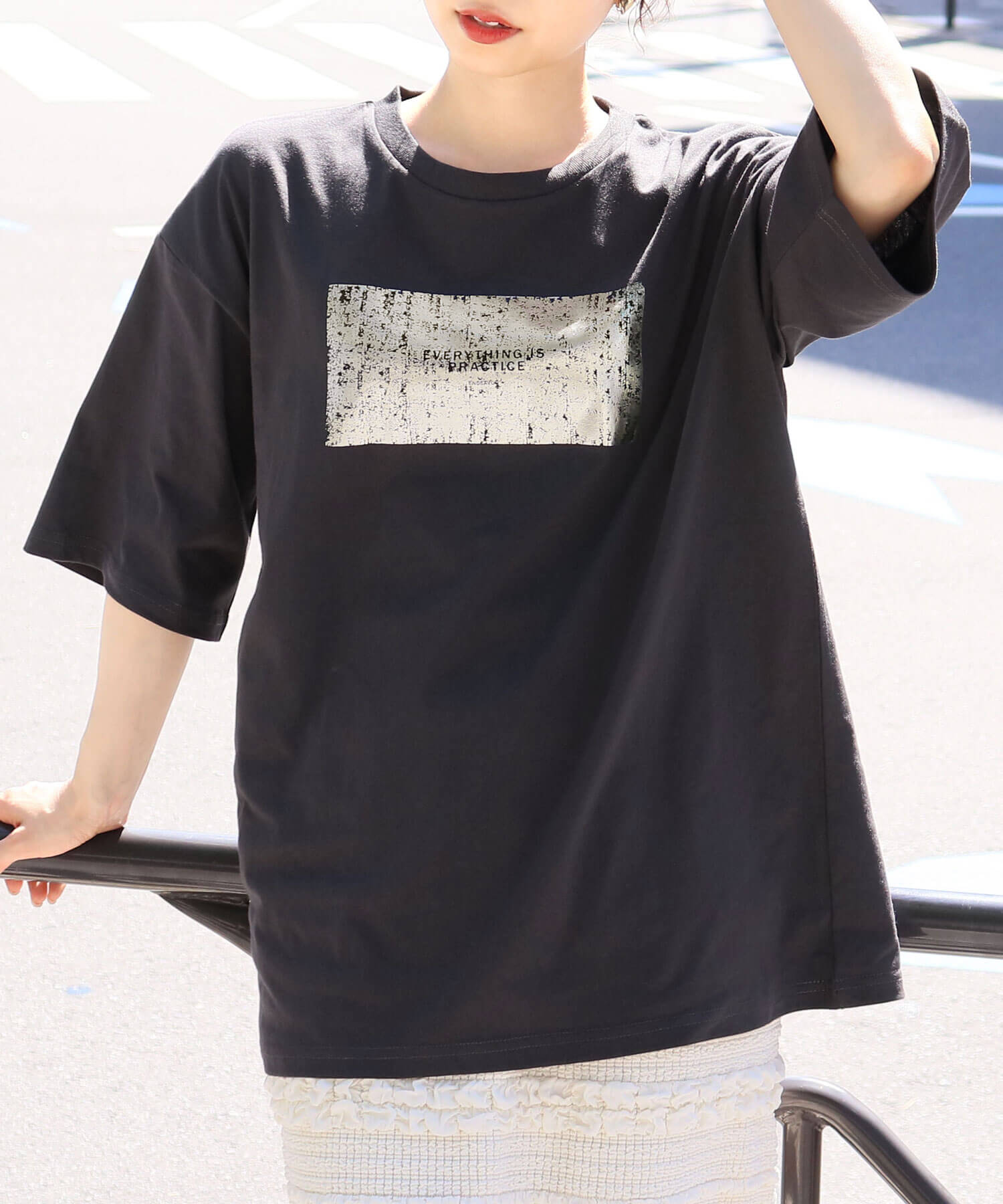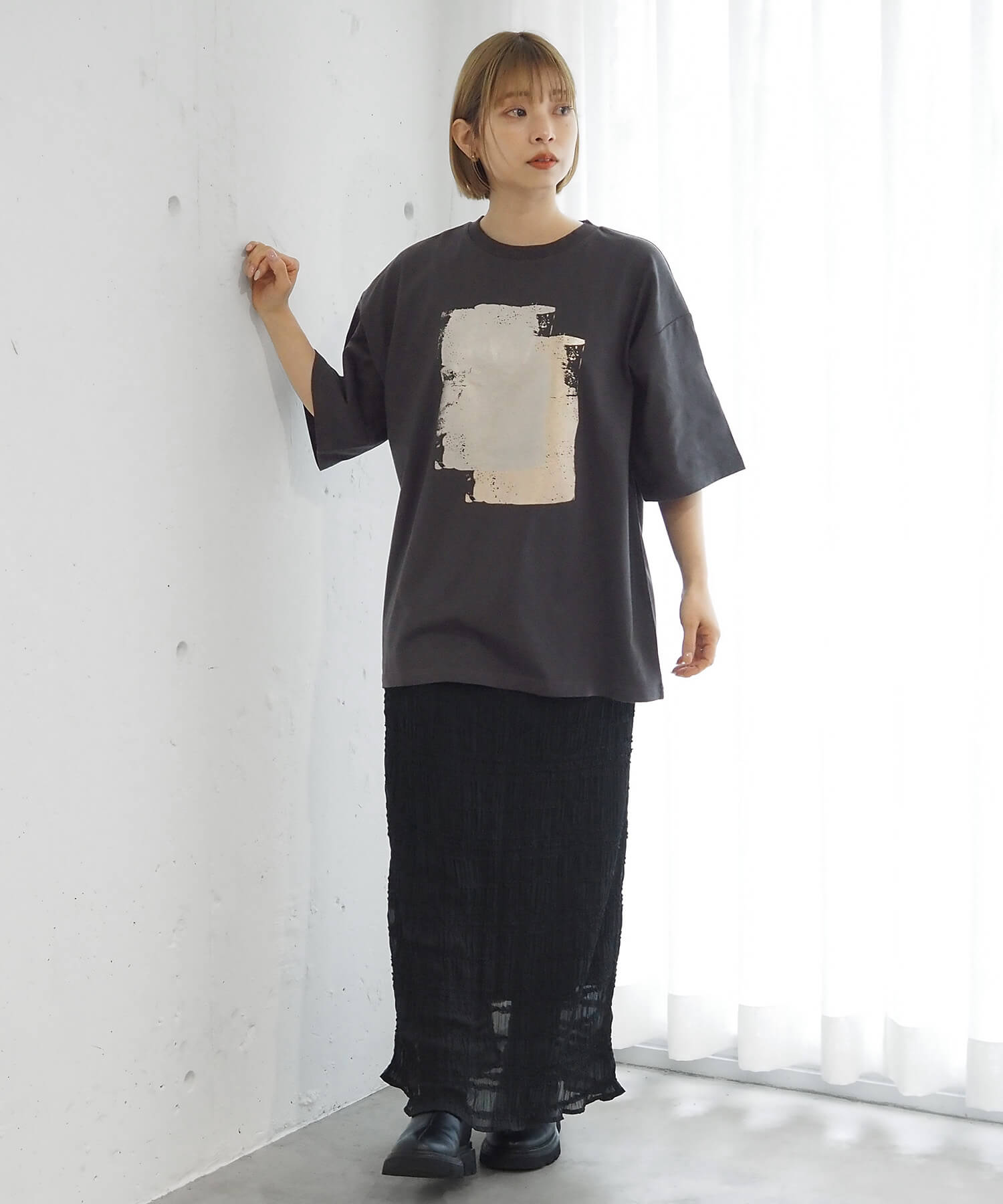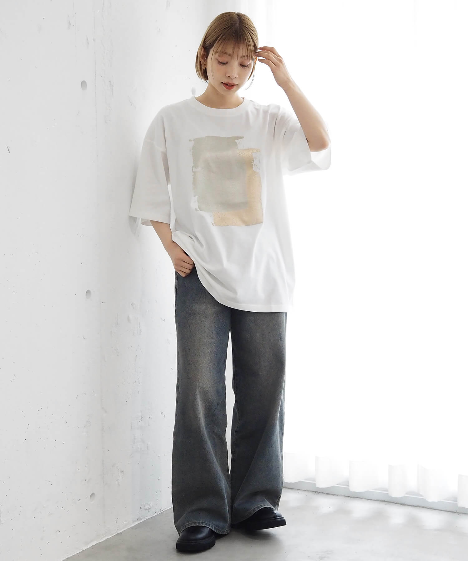 ・ペイント風デザインの箔プリントをフロントに大きく入れ、シンプルながらインパクトのある1枚に。