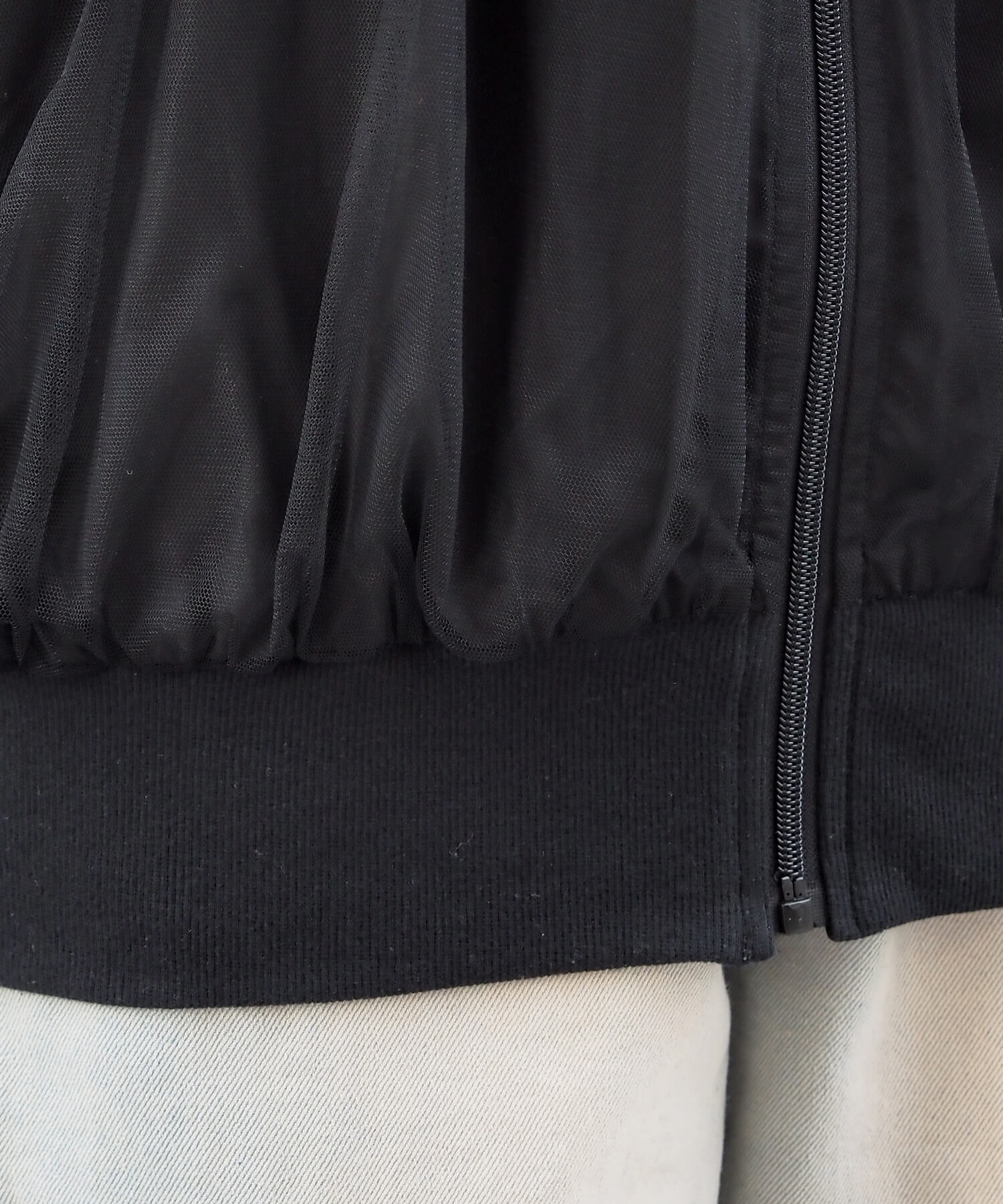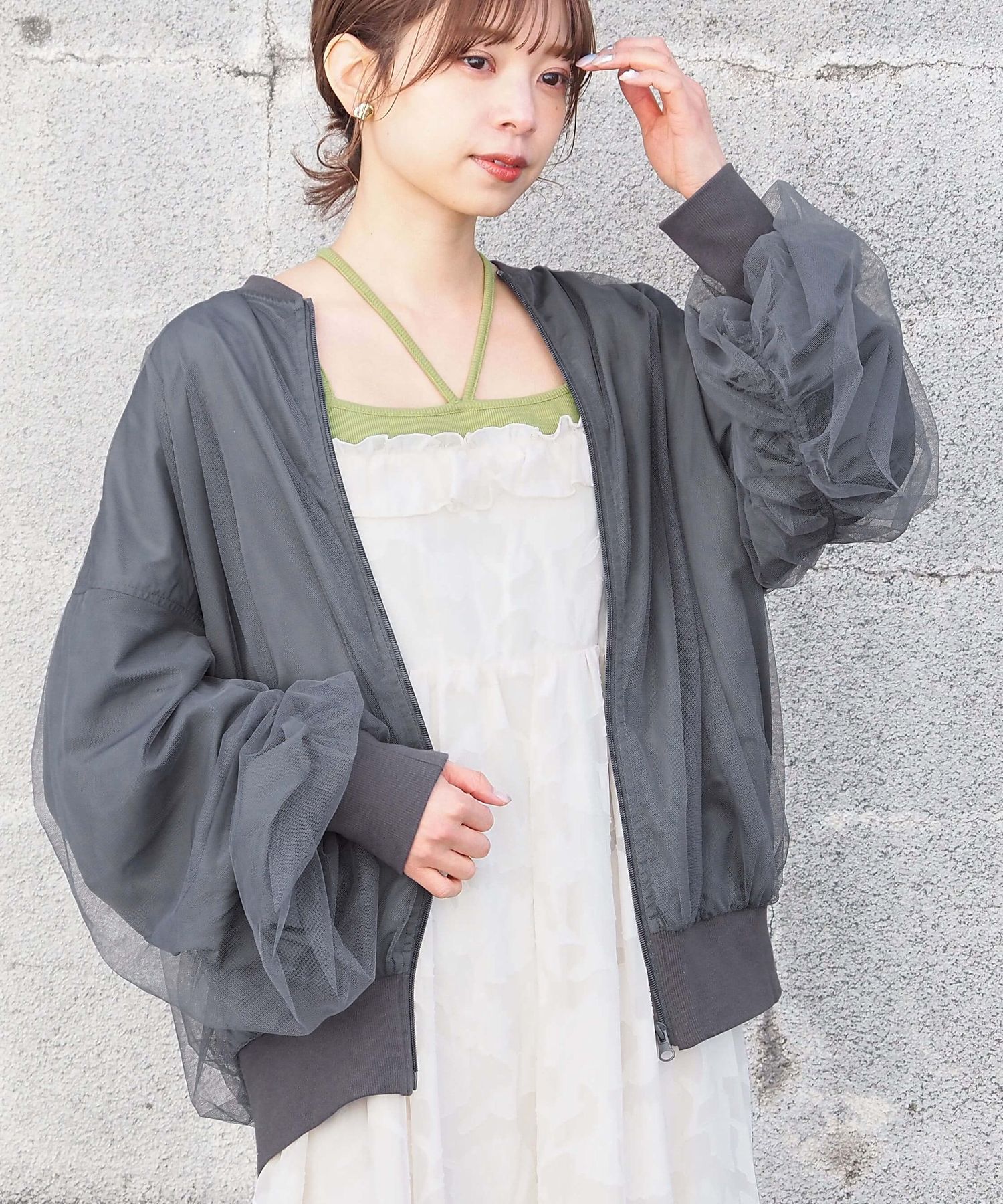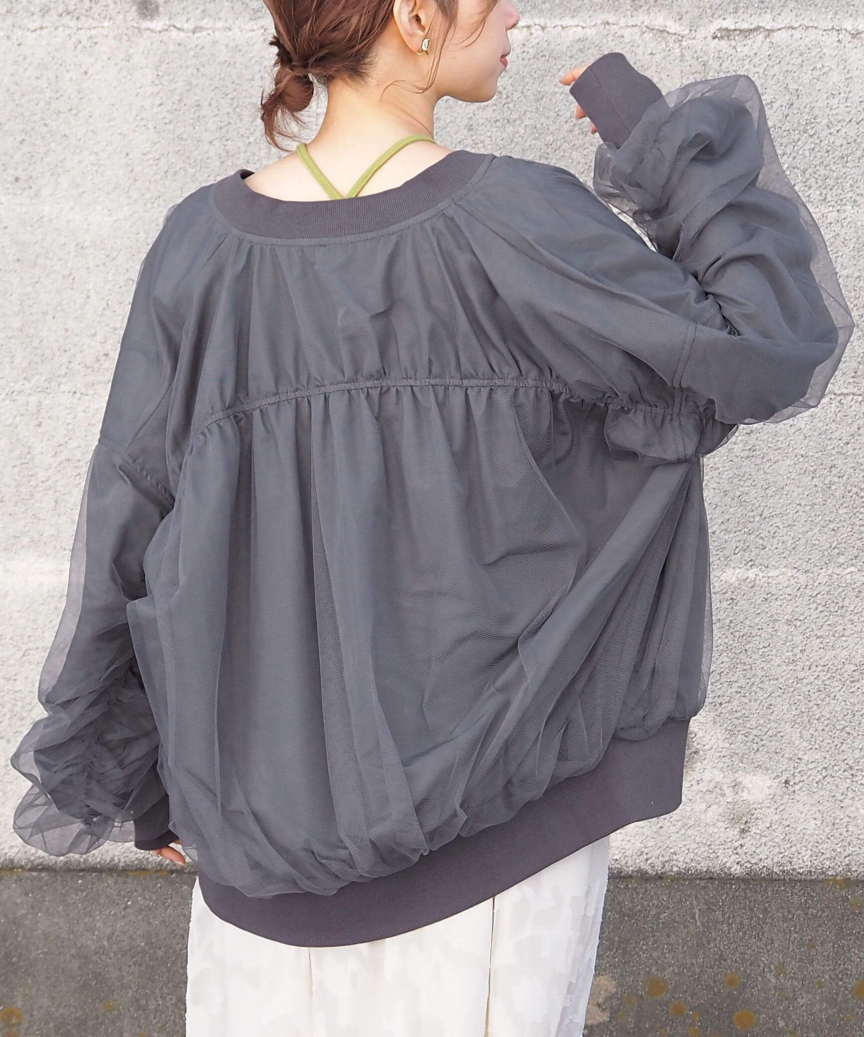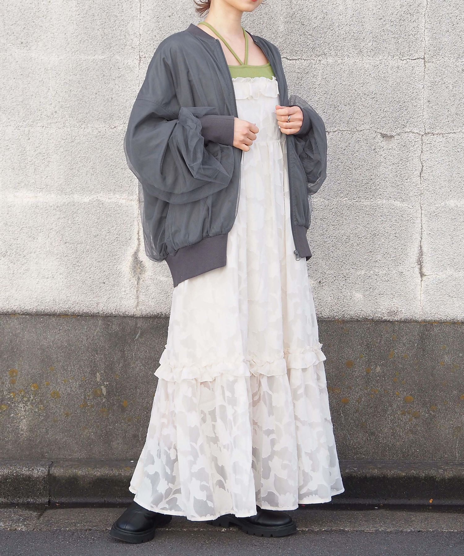 ・チュールの透け感はもちろん、軽さのあるブルゾンは春夏の着こなしに馴染みやすく、幅広い着回しが可能です。