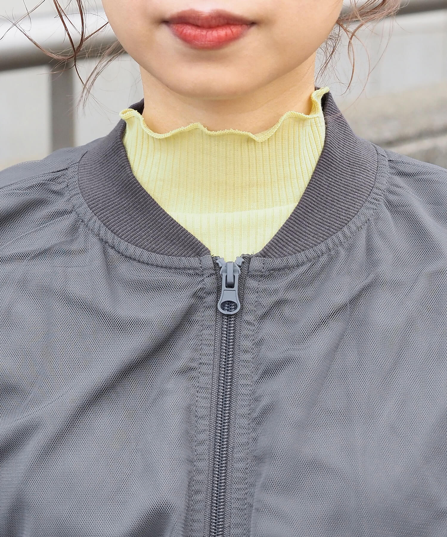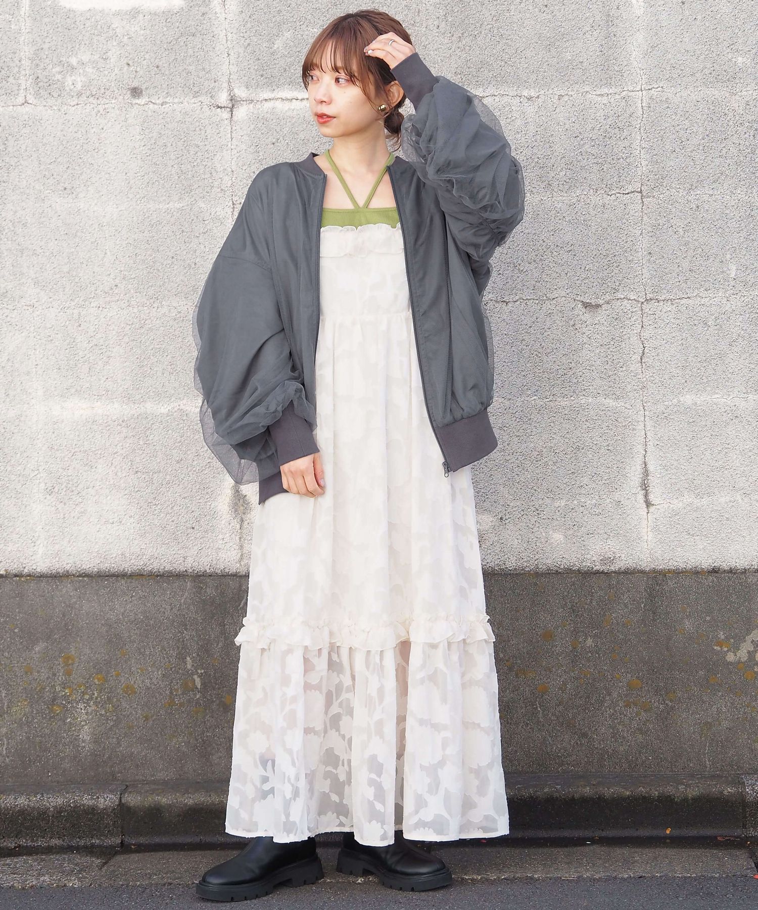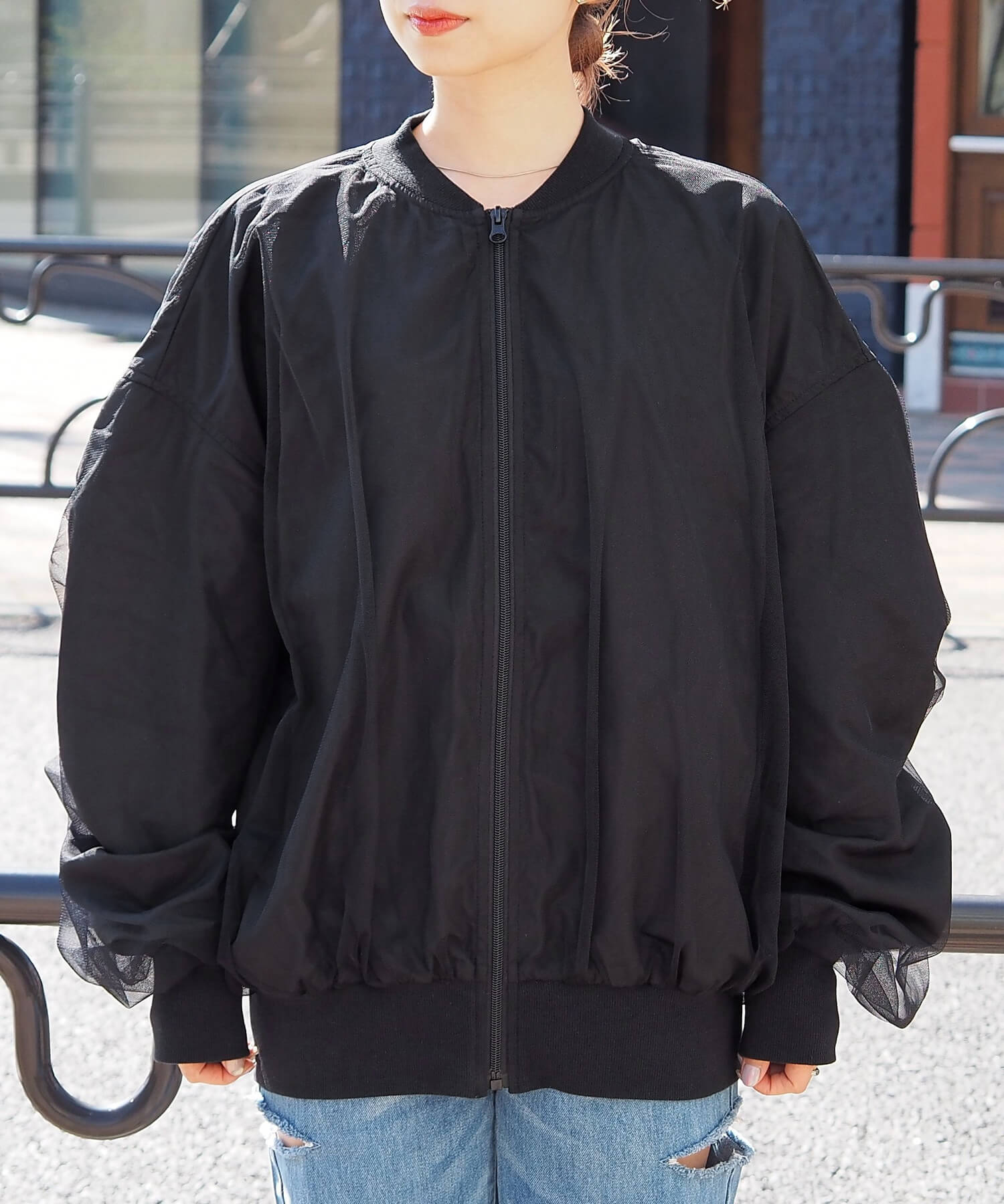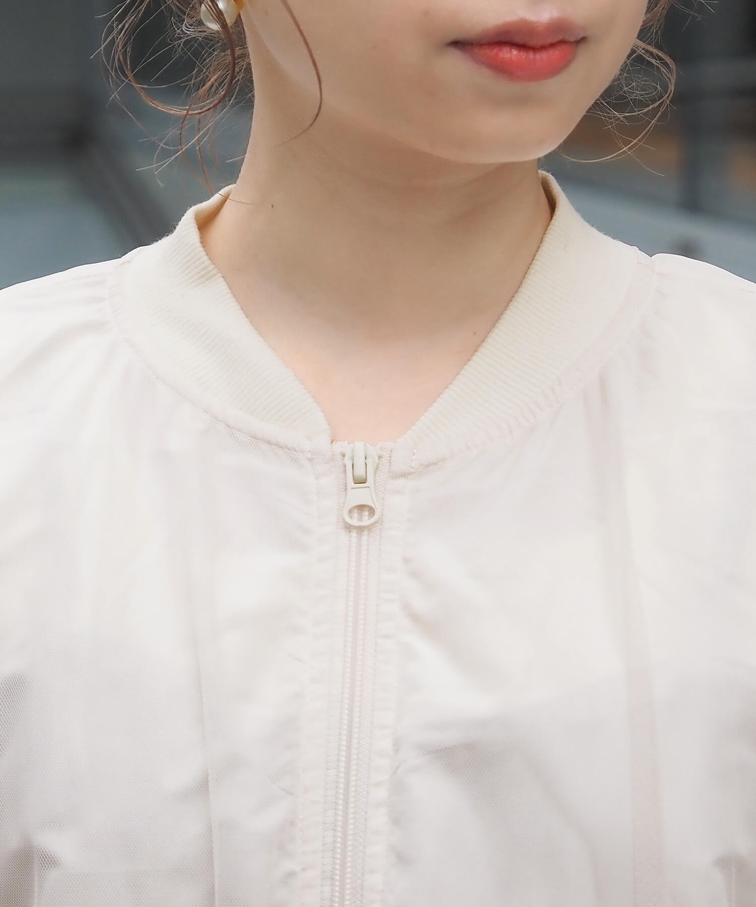 ・チュールの透け感はもちろん、軽さのあるブルゾンは春夏の着こなしに馴染みやすく、幅広い着回しが可能です。