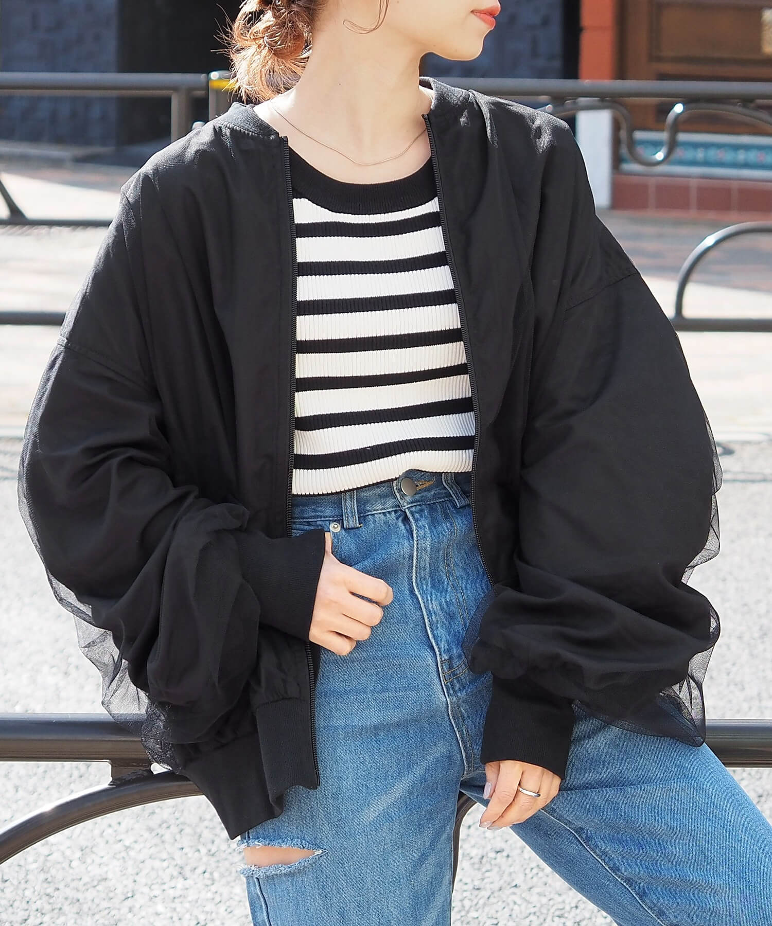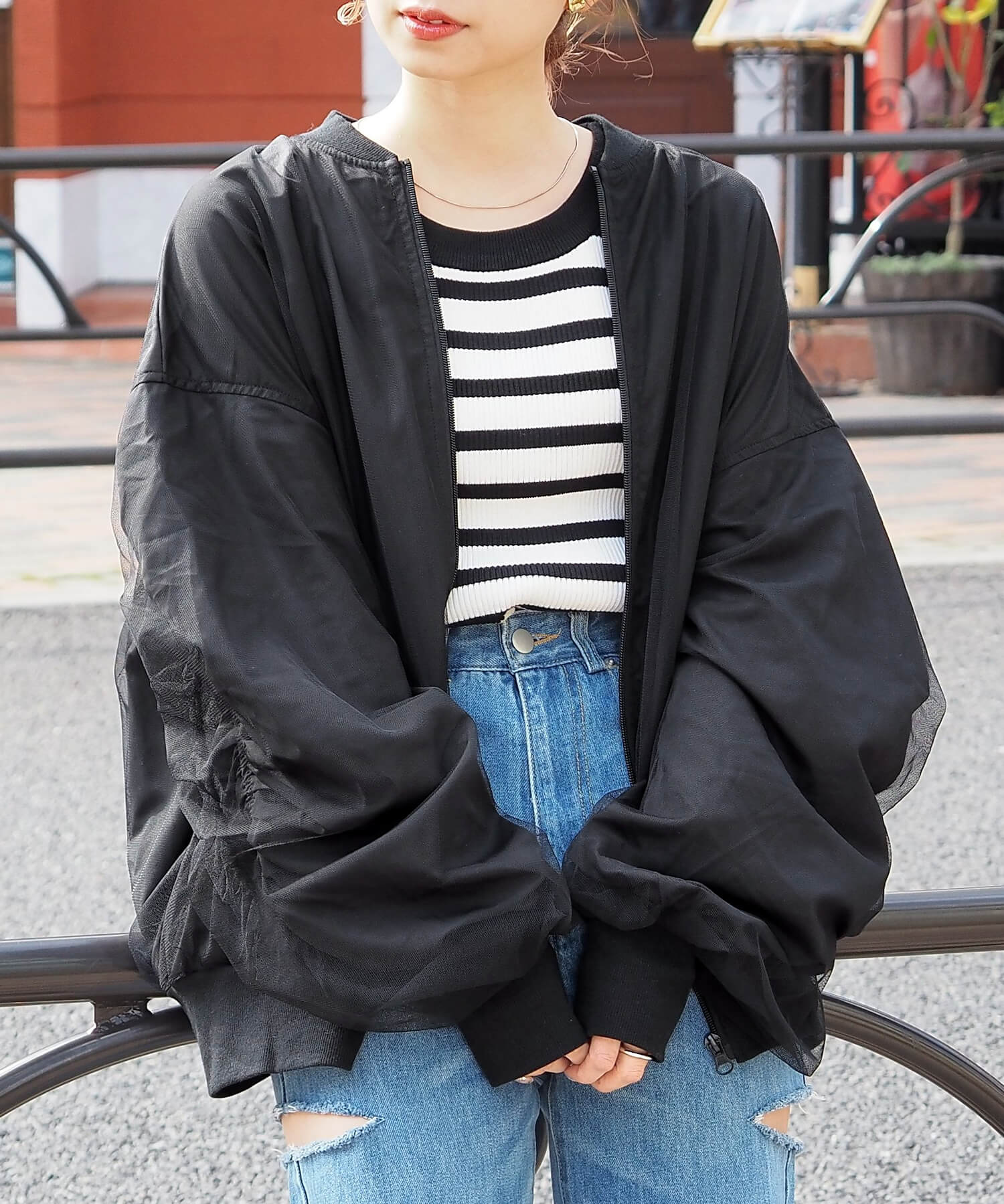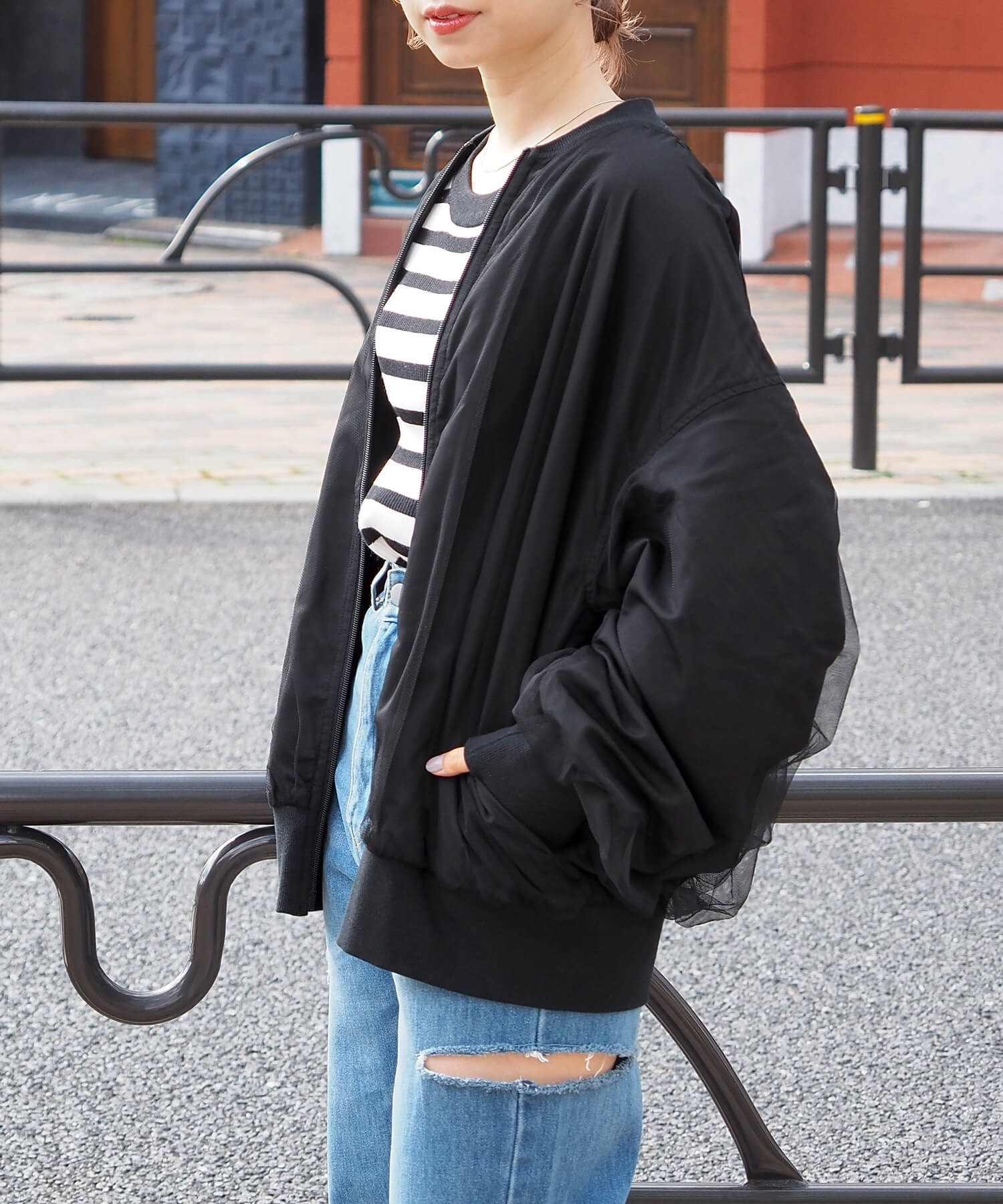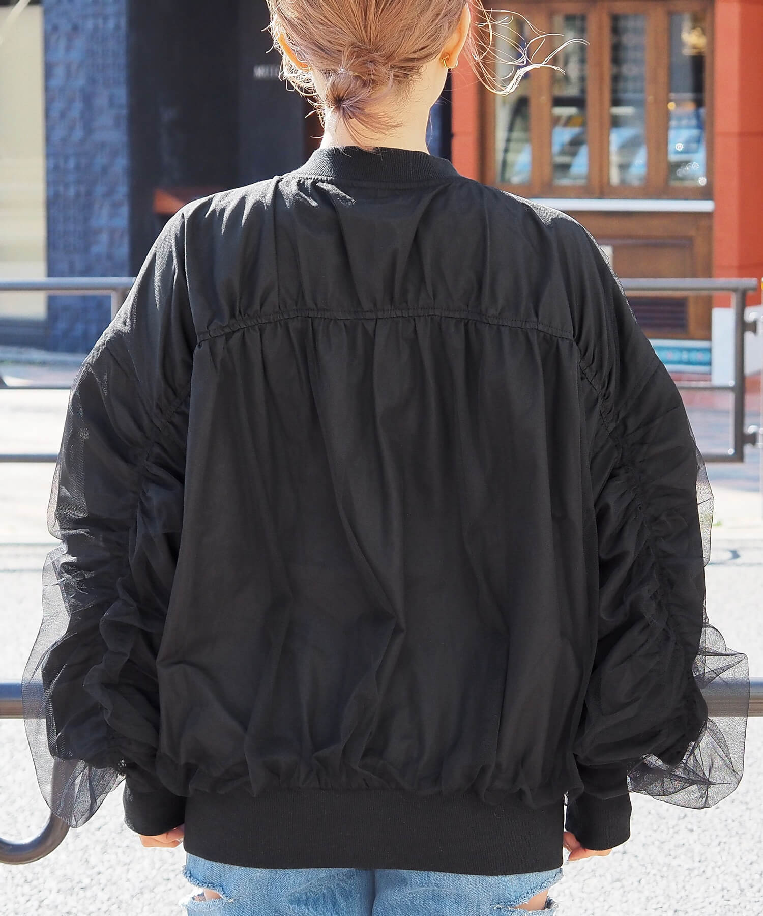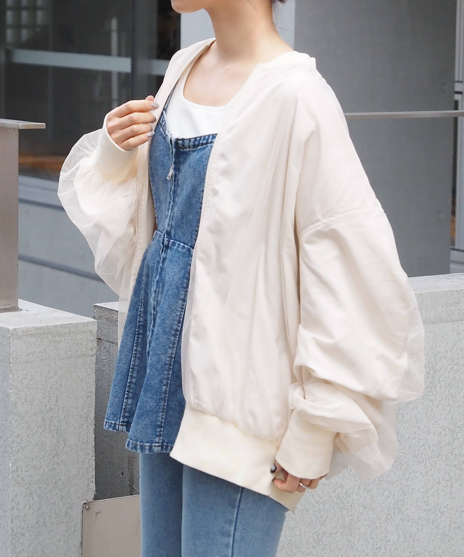 ・チュールの透け感はもちろん、軽さのあるブルゾンは春夏の着こなしに馴染みやすく、幅広い着回しが可能です。