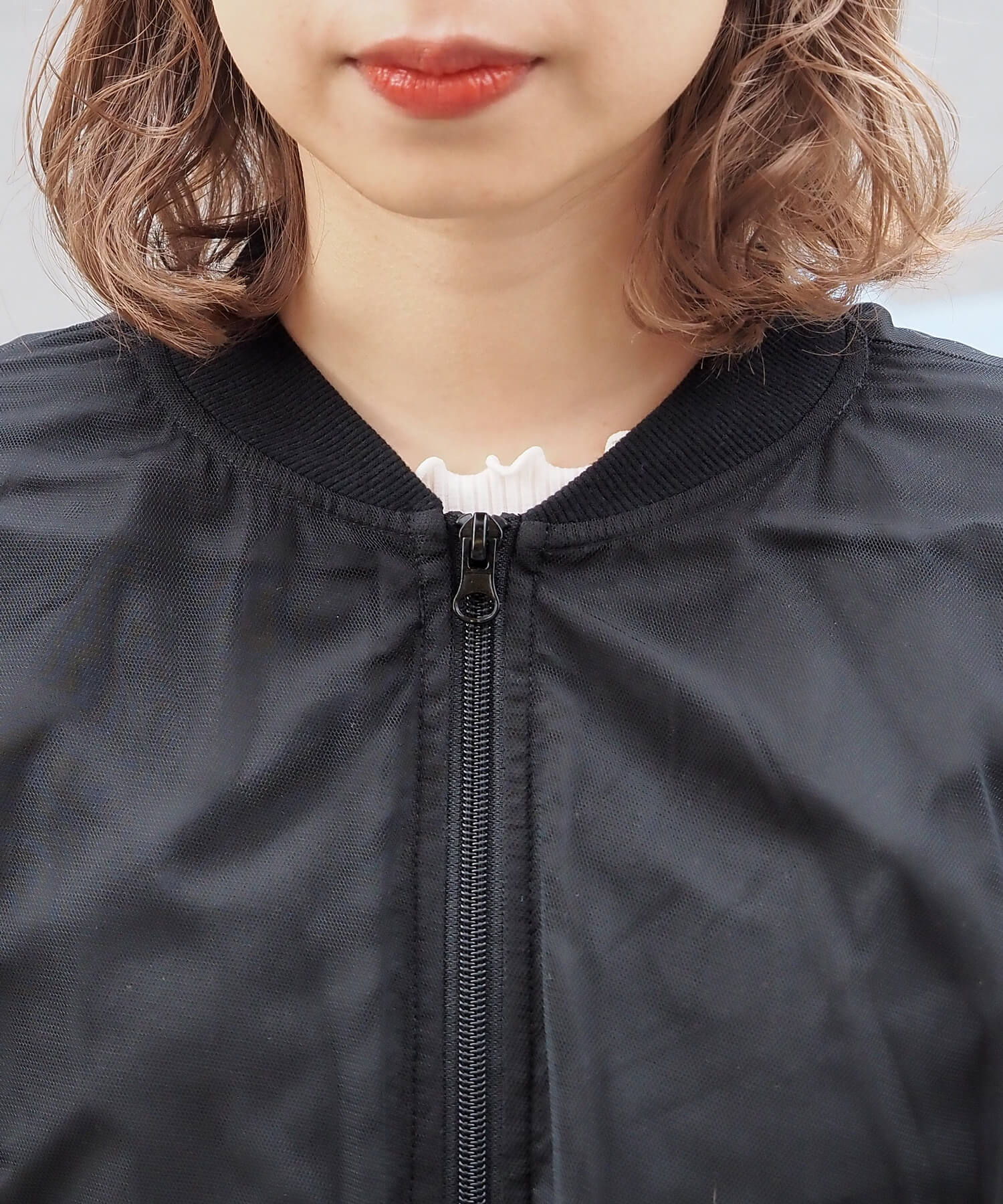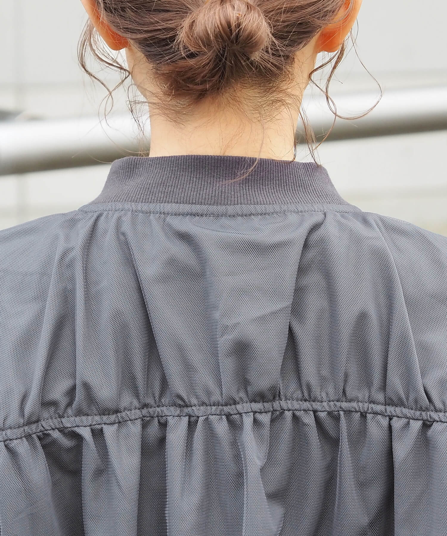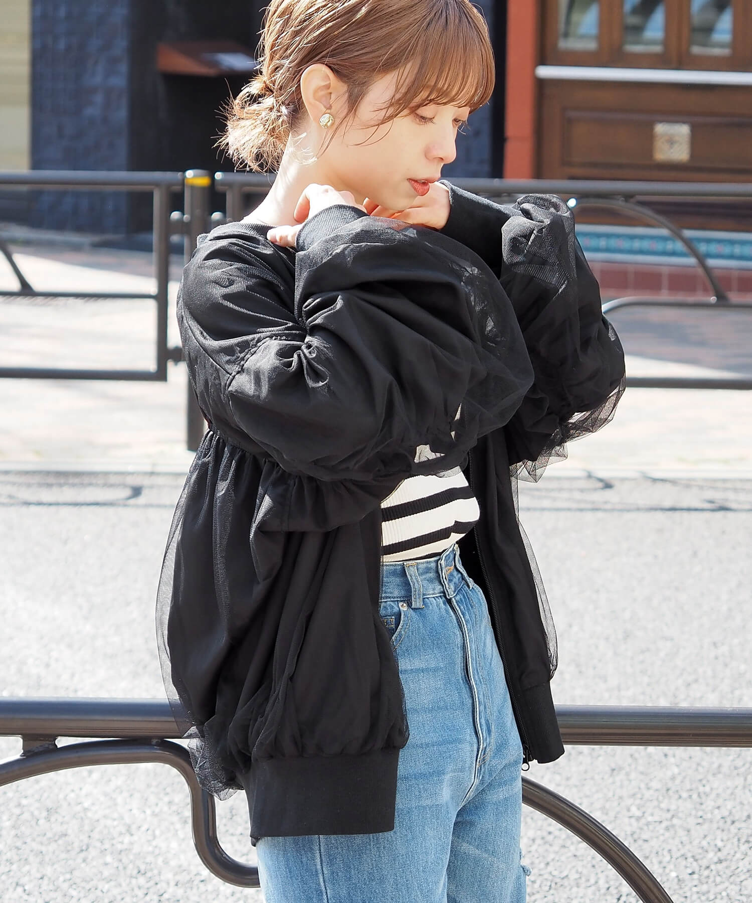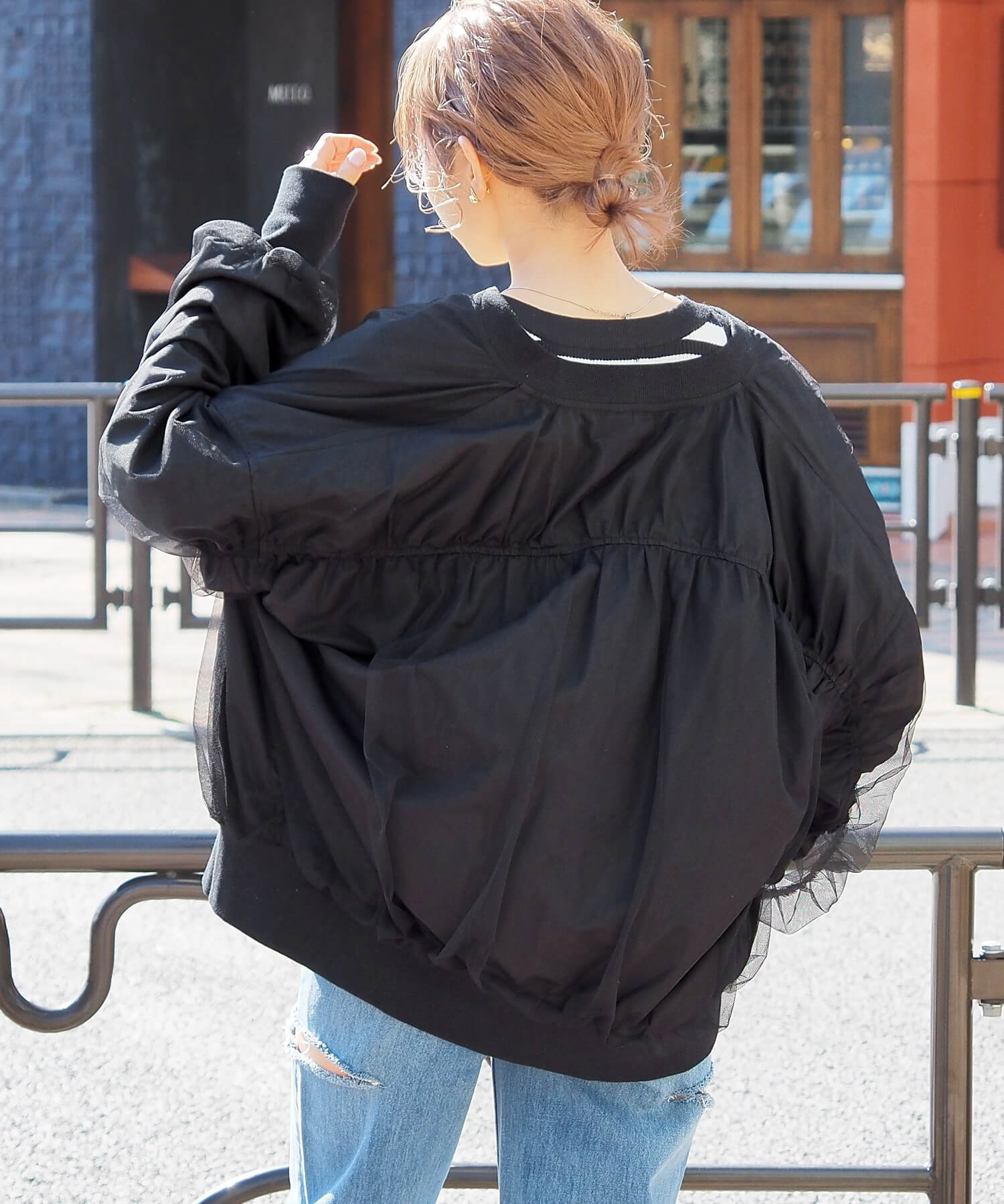 ・チュールの透け感はもちろん、軽さのあるブルゾンは春夏の着こなしに馴染みやすく、幅広い着回しが可能です。