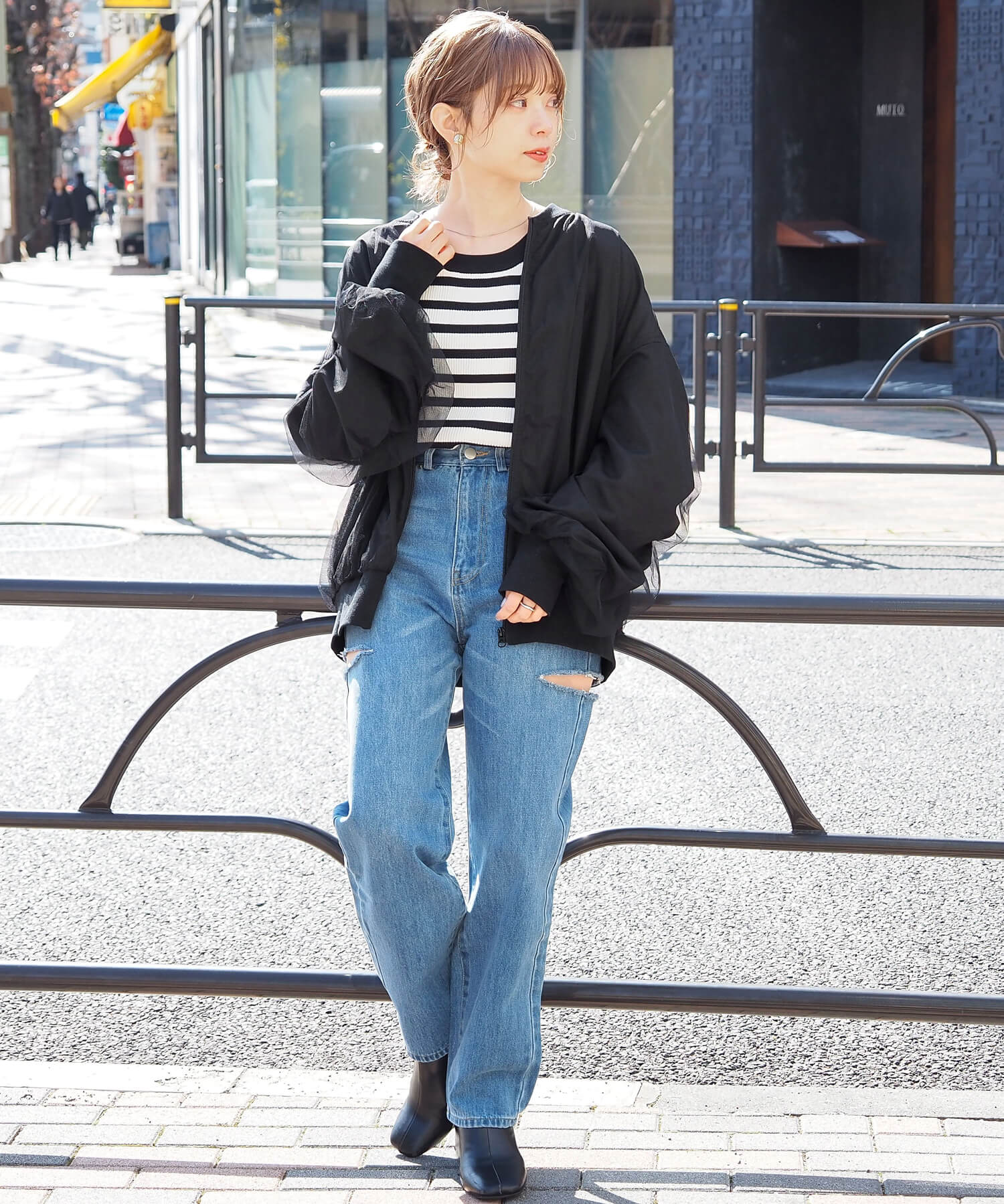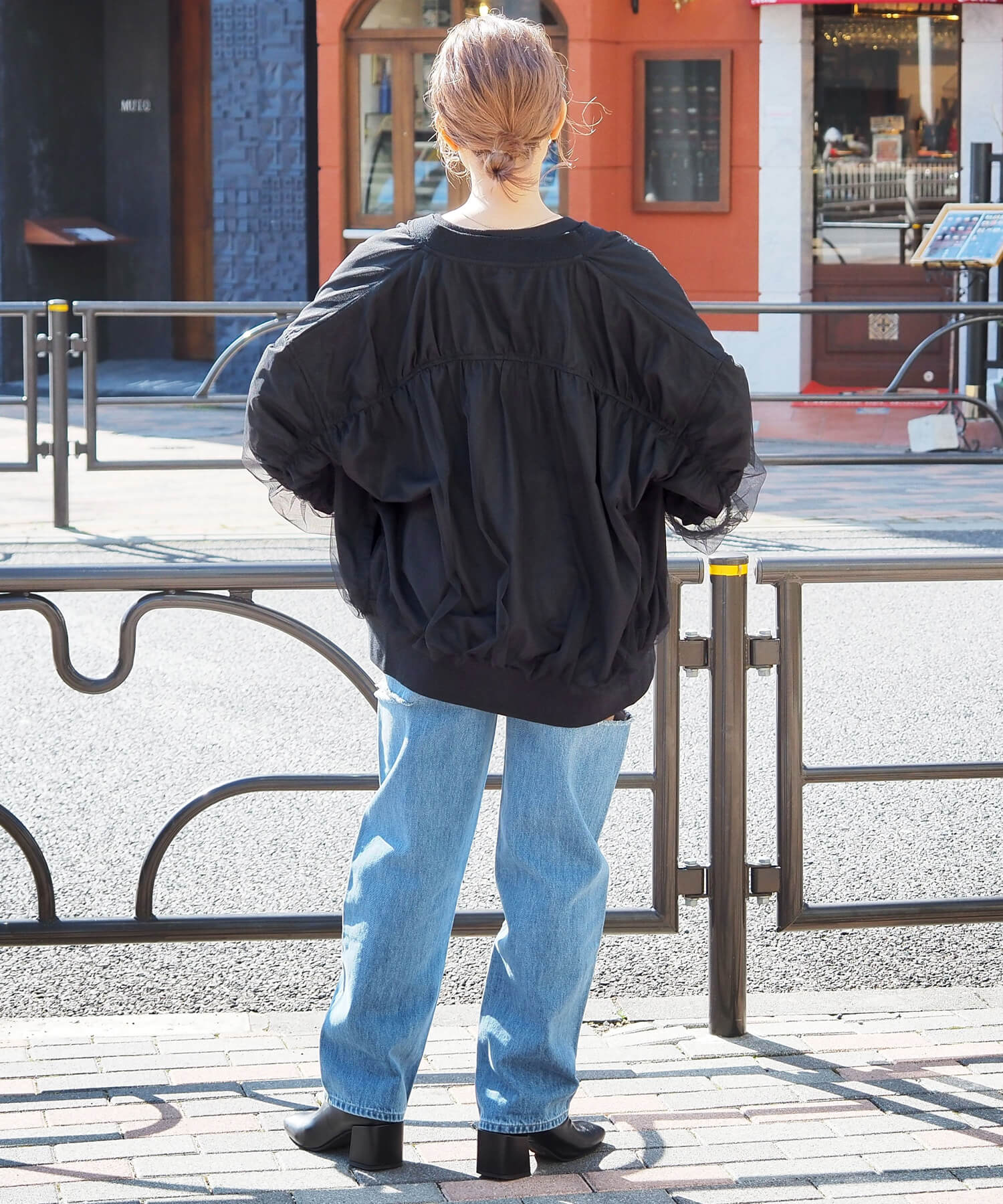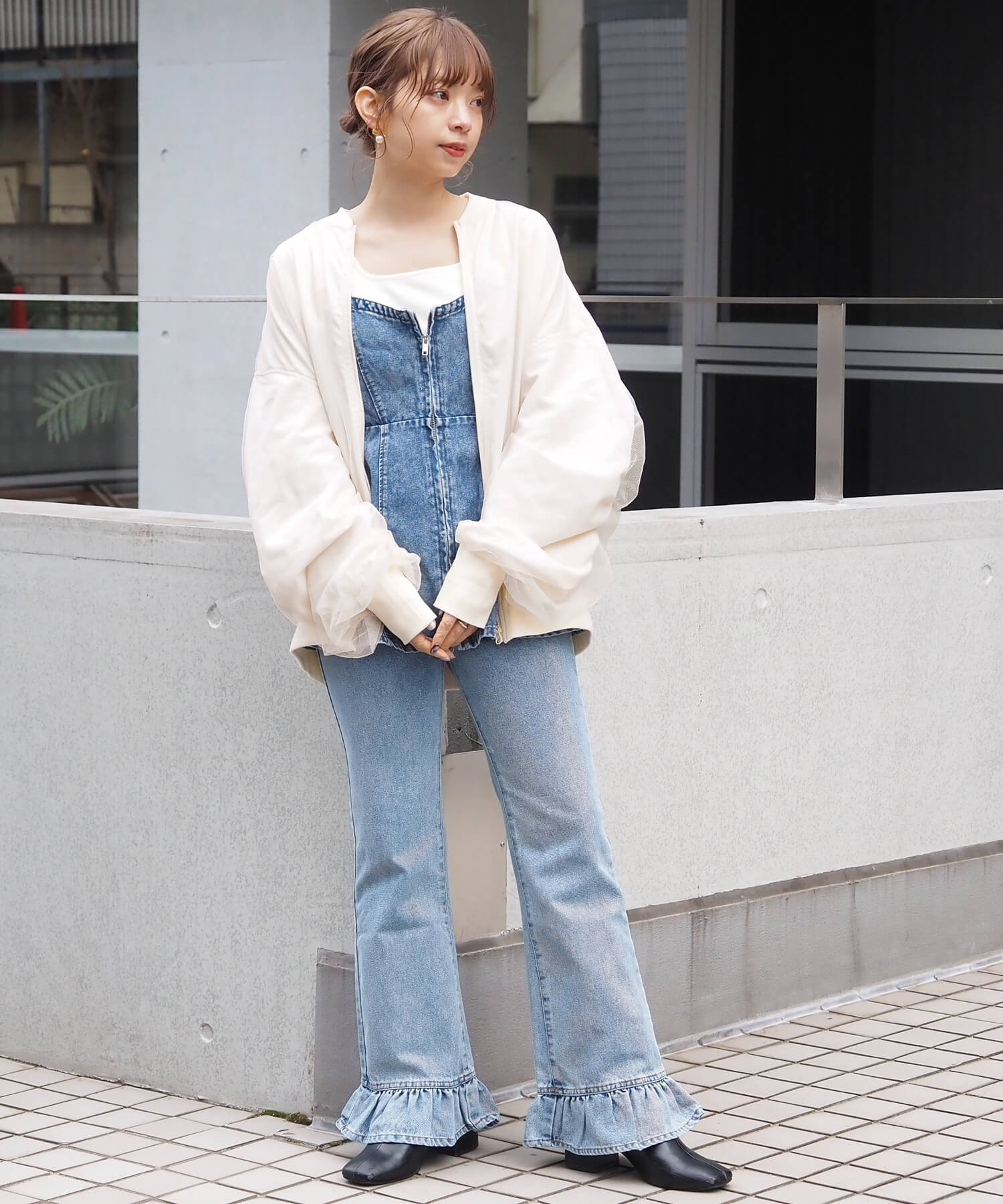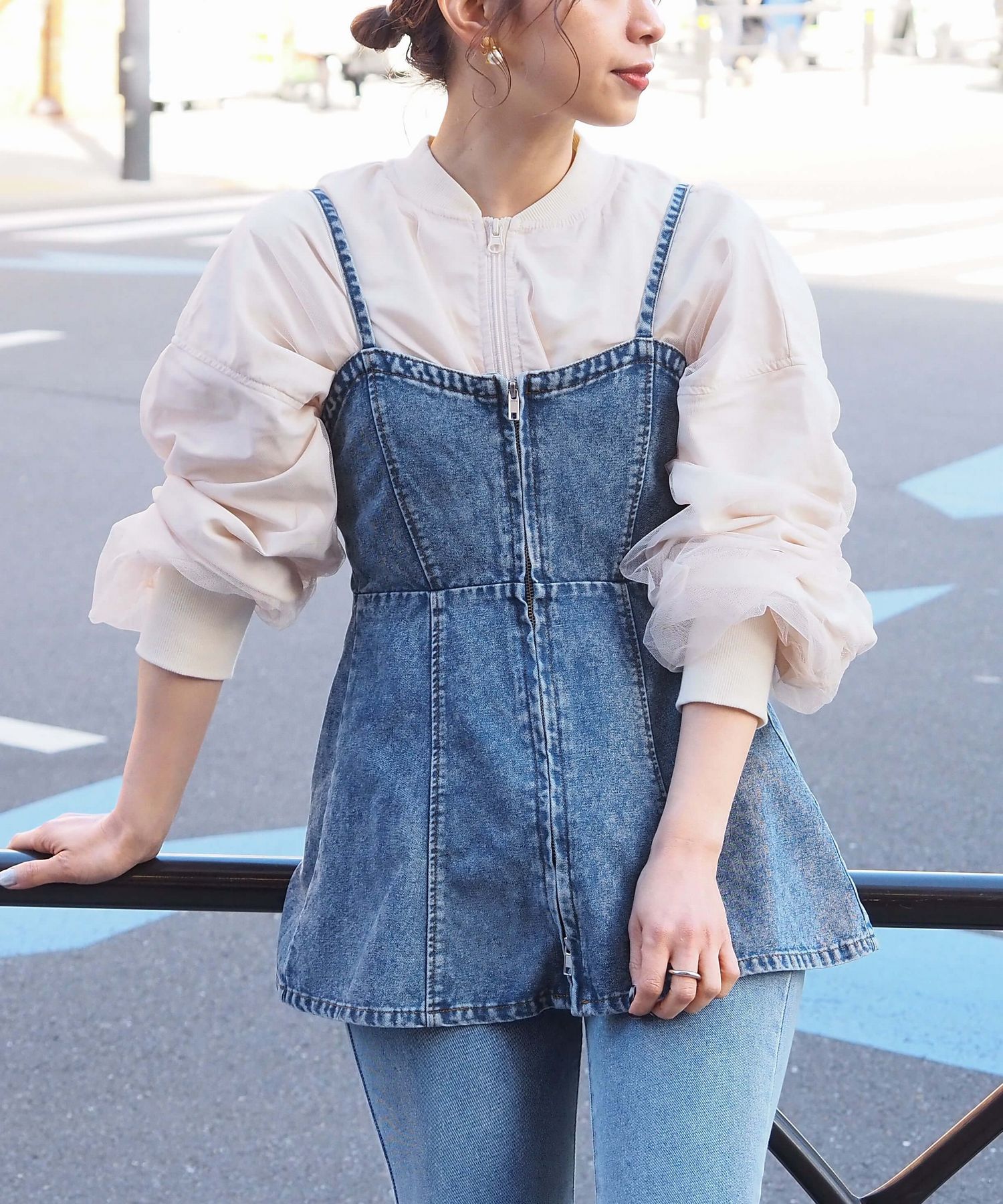 ・チュールの透け感はもちろん、軽さのあるブルゾンは春夏の着こなしに馴染みやすく、幅広い着回しが可能です。