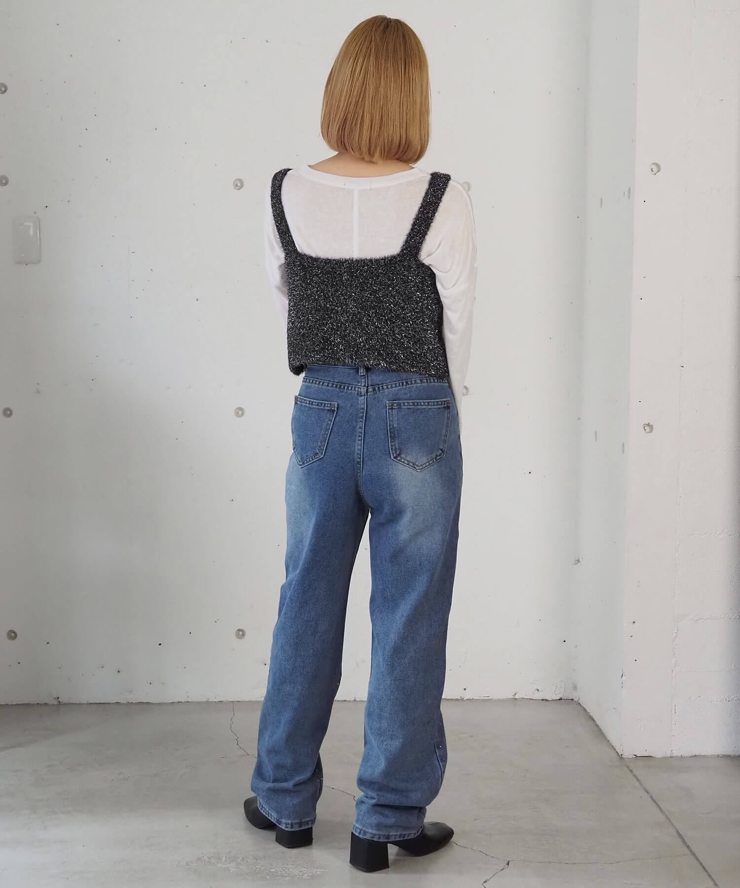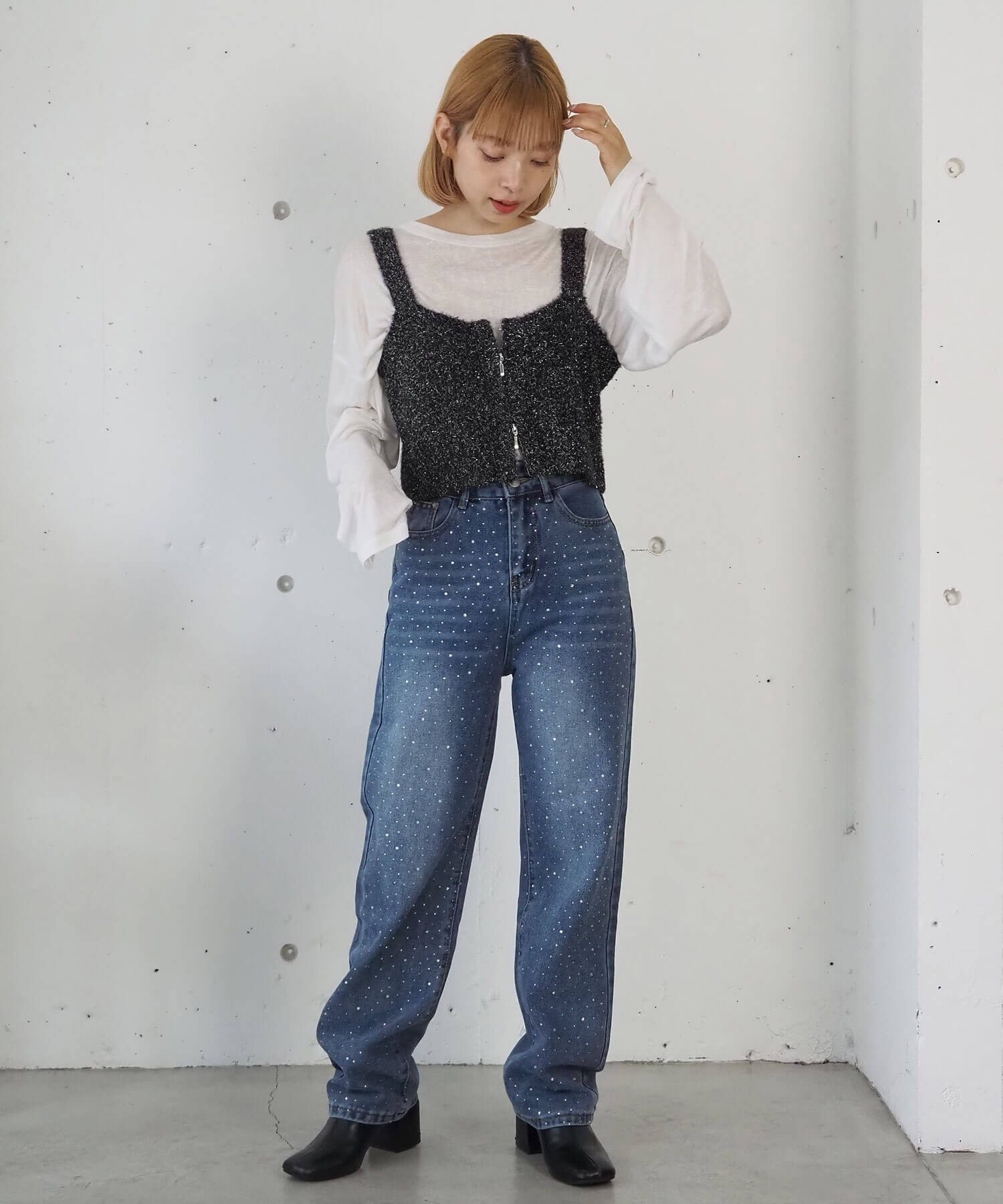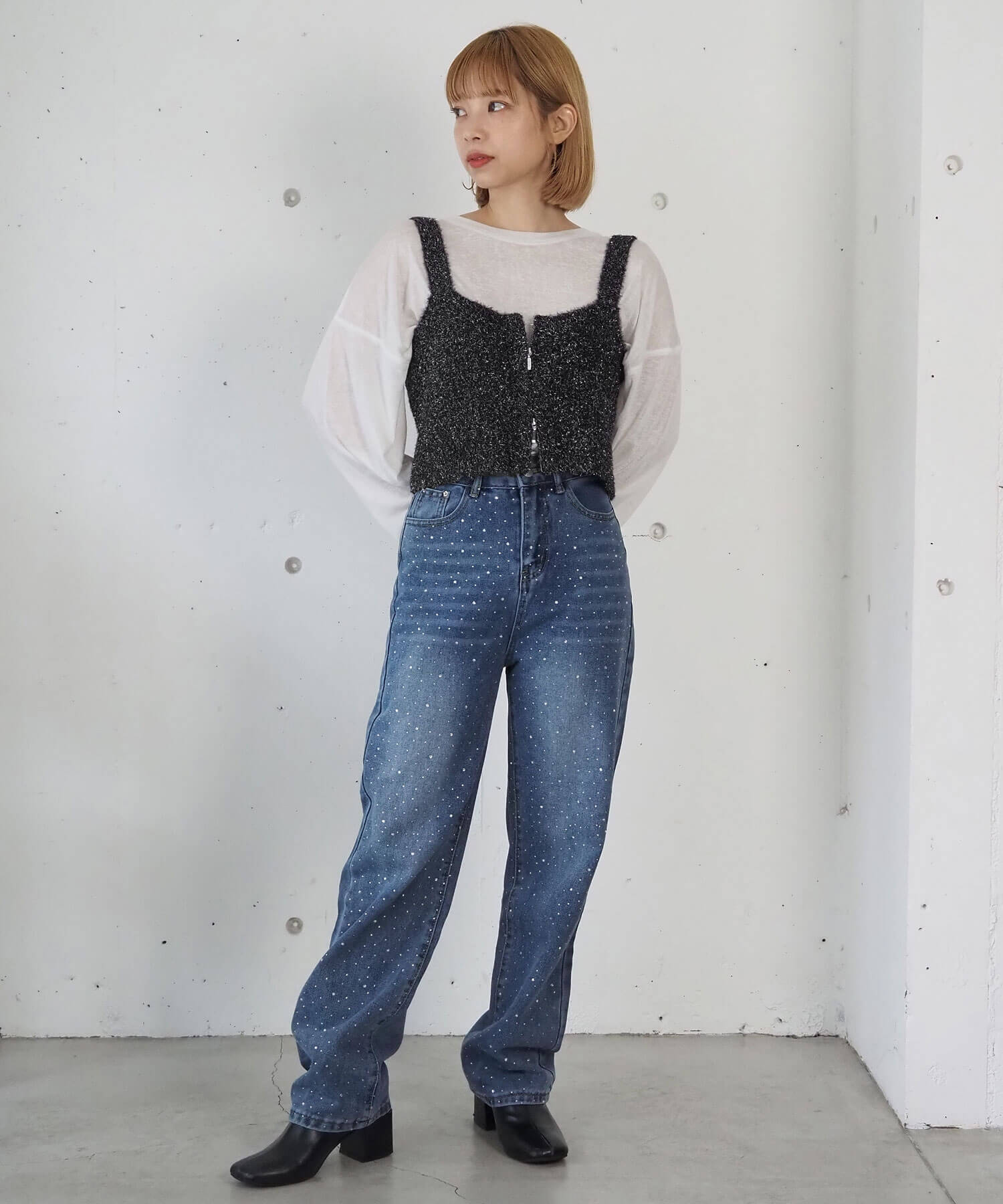 ・クロップド丈を活かし、ハイウェストボトムで脚長効果抜群のスタイルアップコーデが完成します。