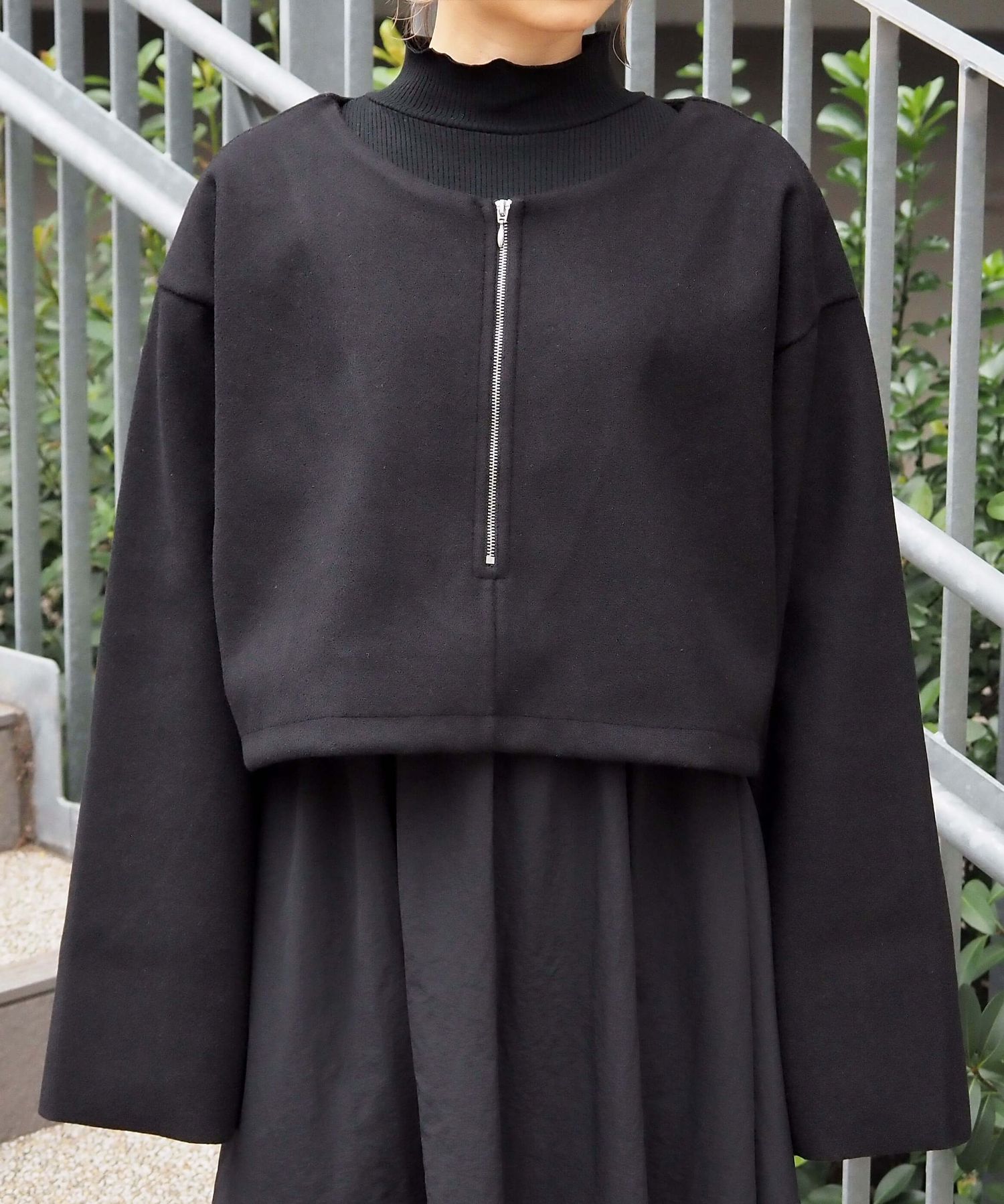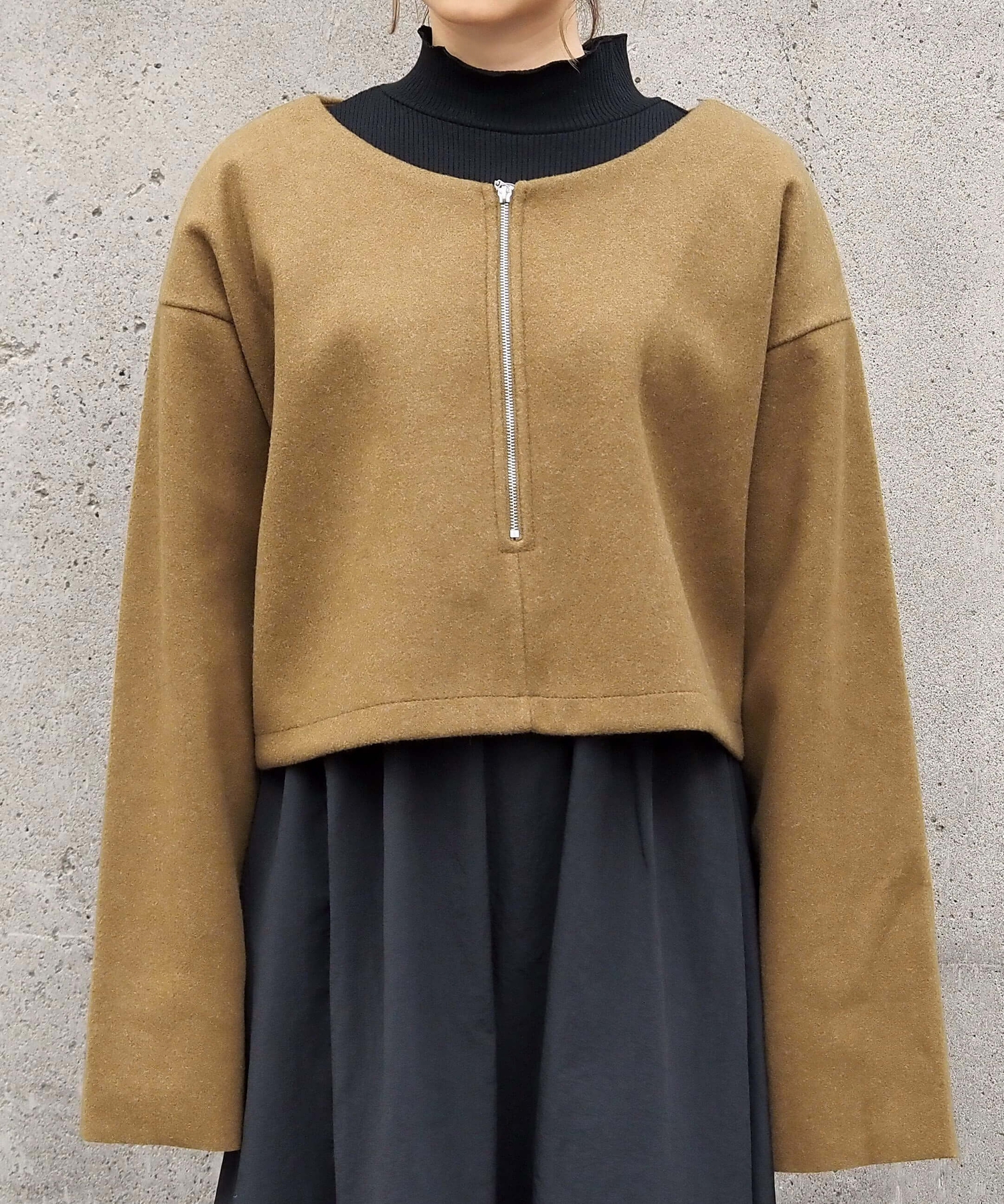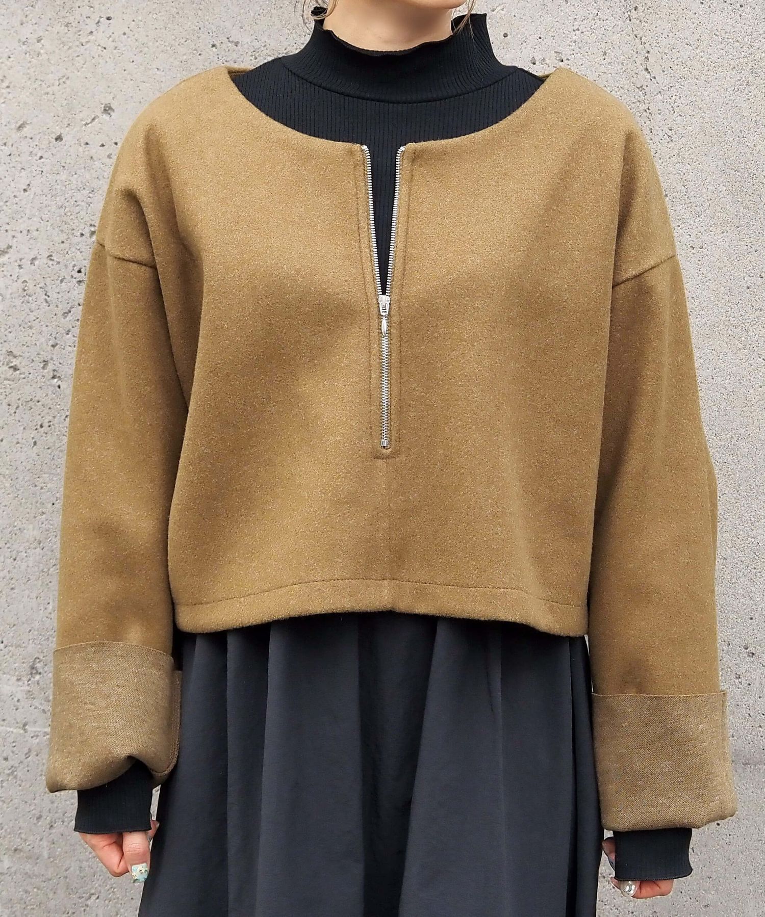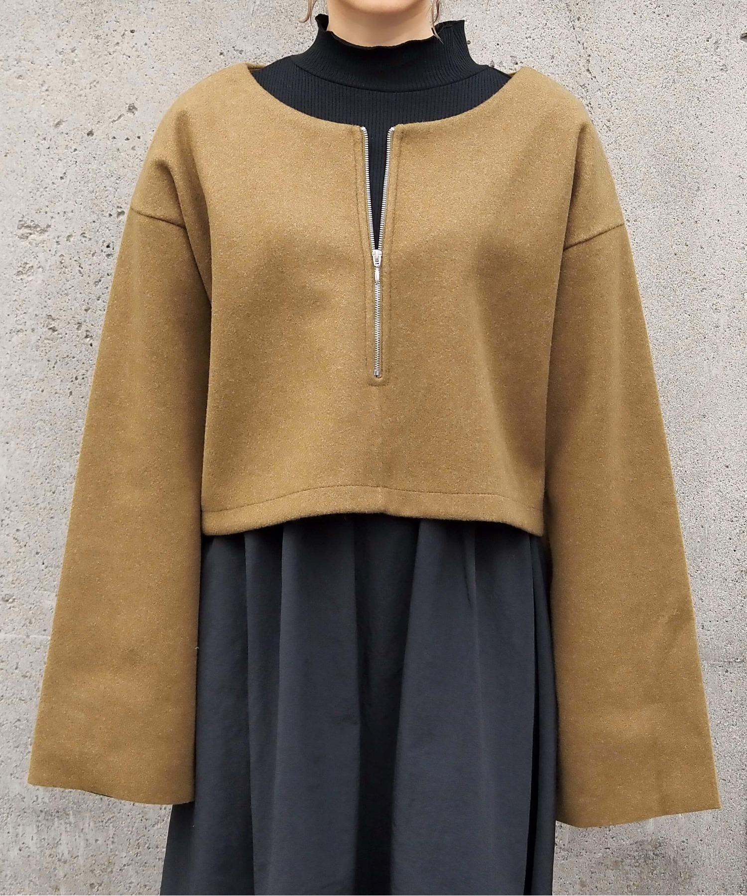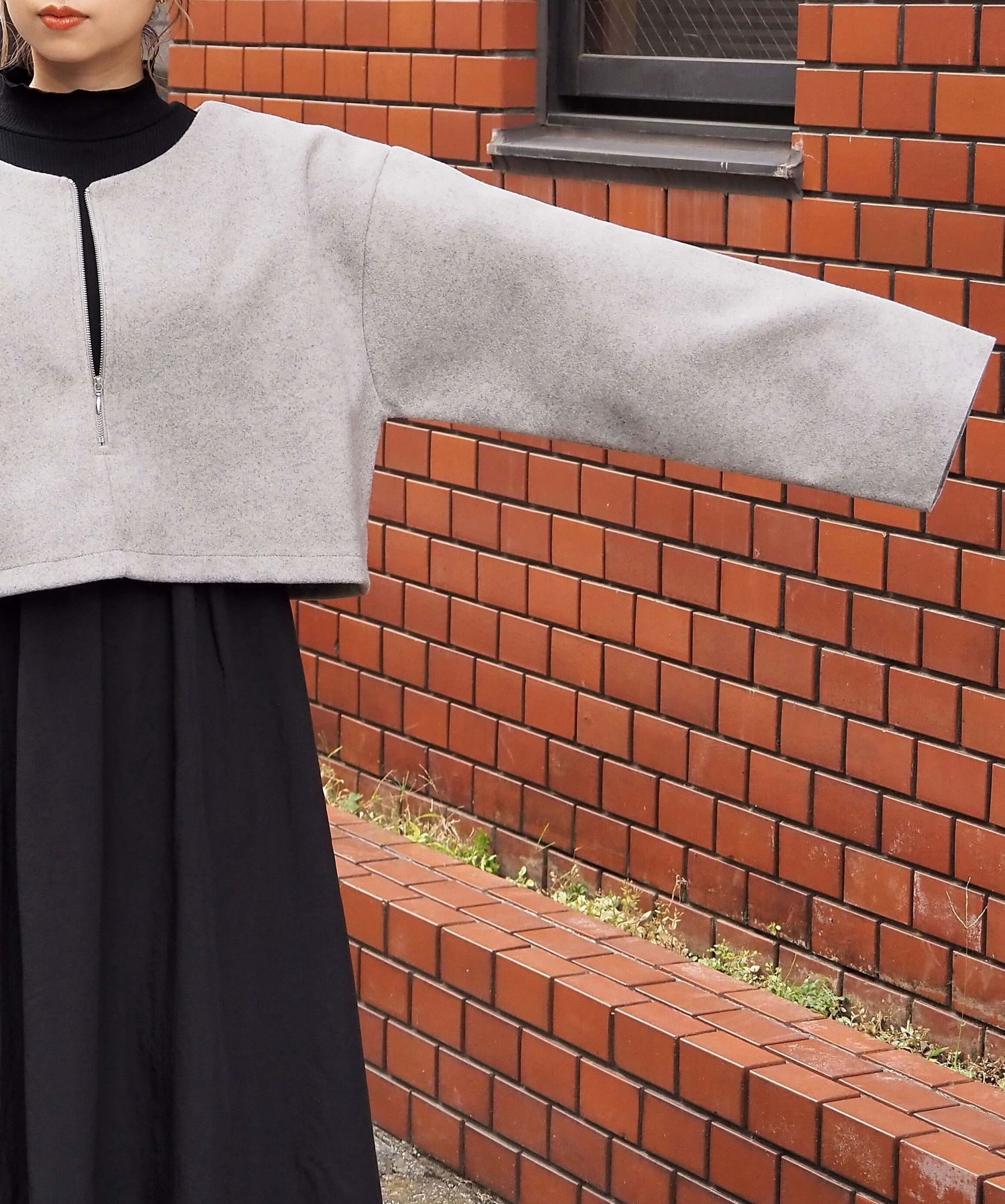 ・ウールライクなトップスは、コンパクトなショート丈とこなれ感のあるワイドスリーブがポイント。アクセサリーいらずのハーフジップデザインで、着こなしがぐっと格上げされます。