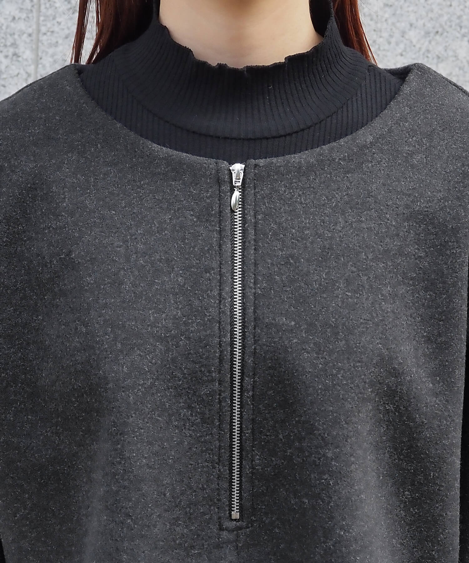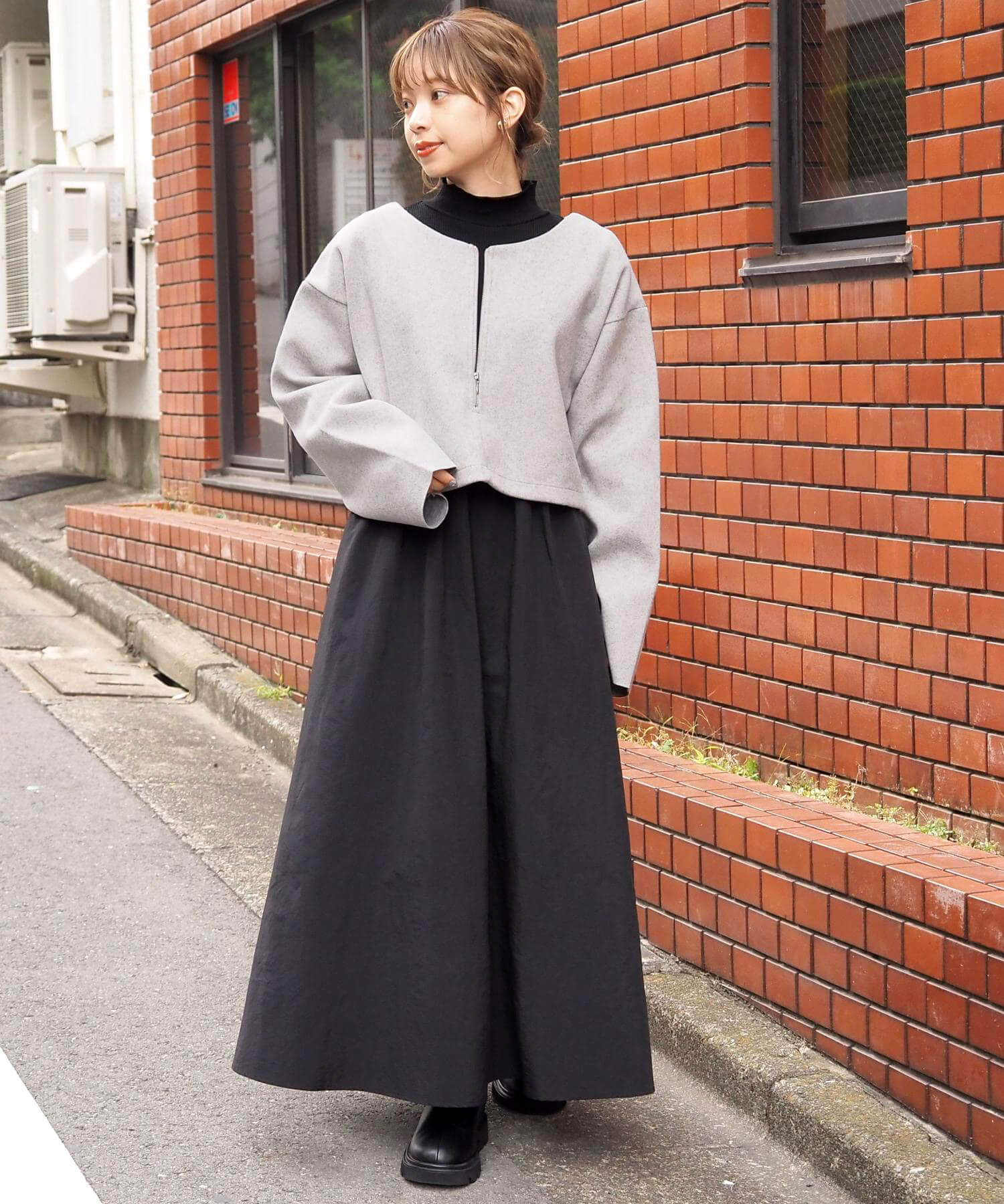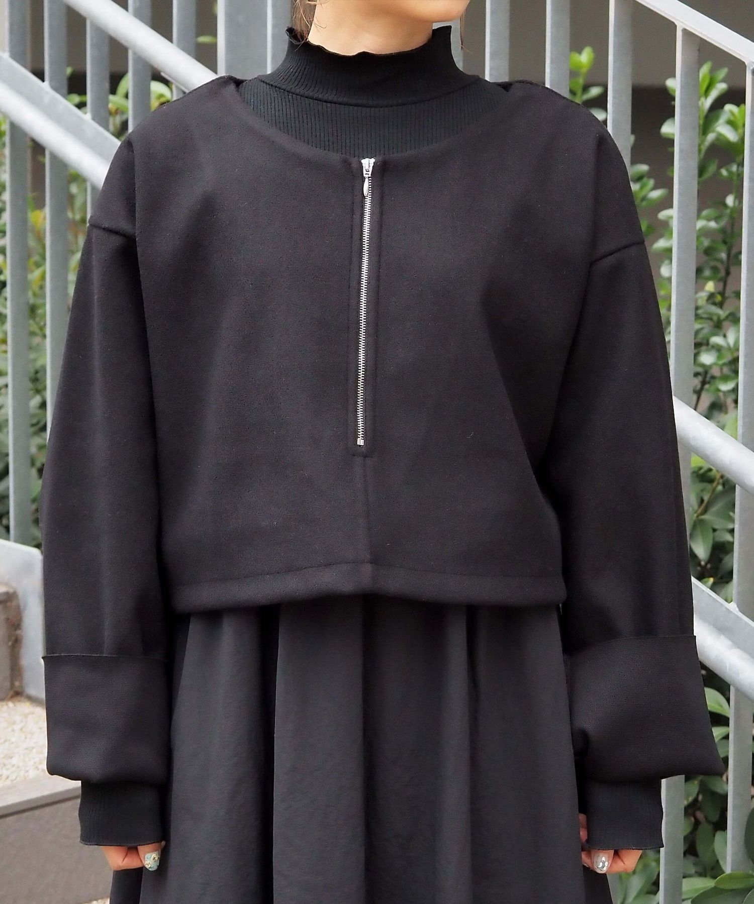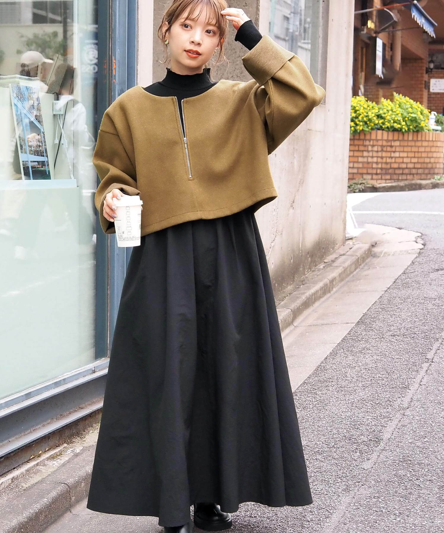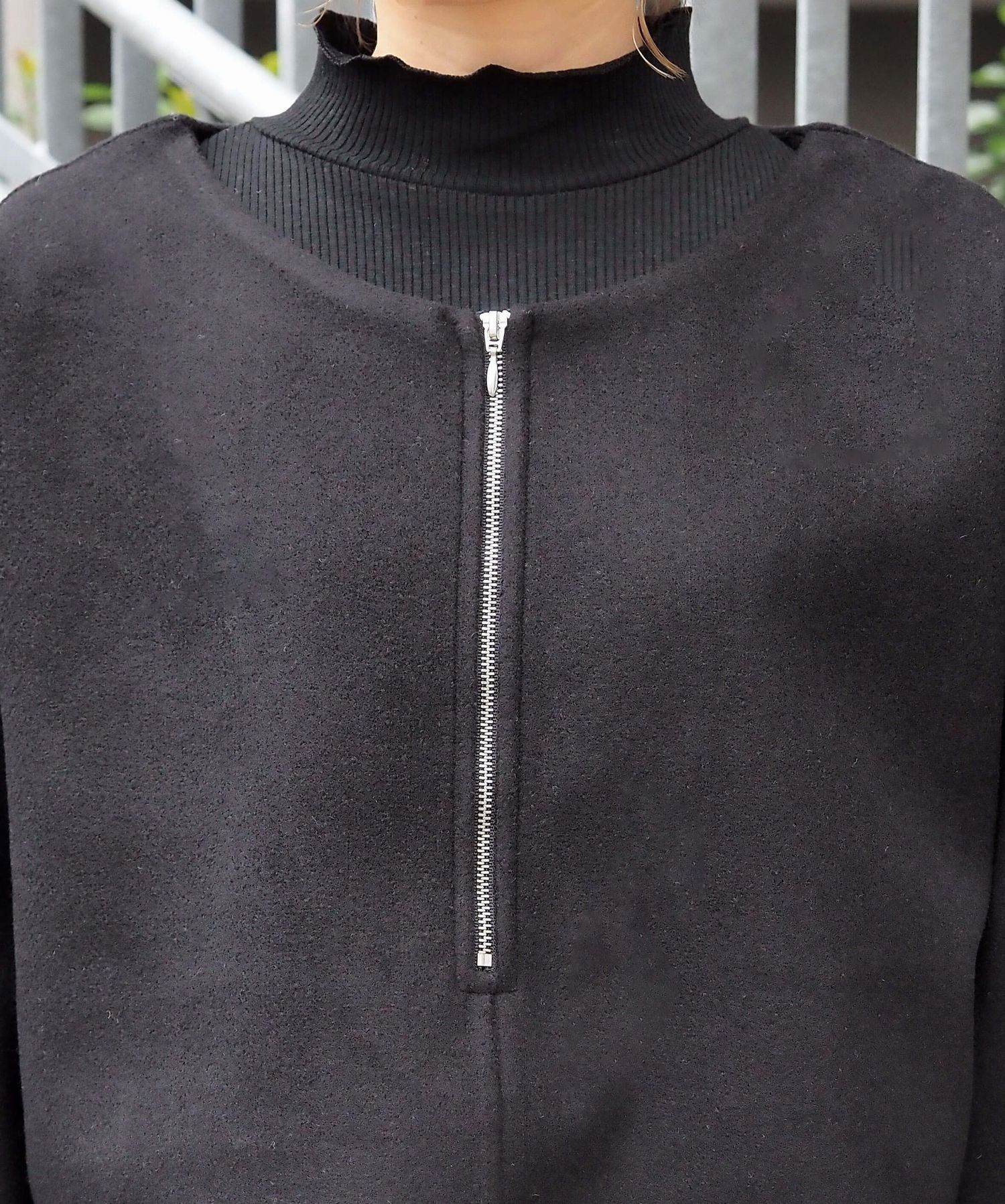 ・ウールライクなトップスは、コンパクトなショート丈とこなれ感のあるワイドスリーブがポイント。アクセサリーいらずのハーフジップデザインで、着こなしがぐっと格上げされます。