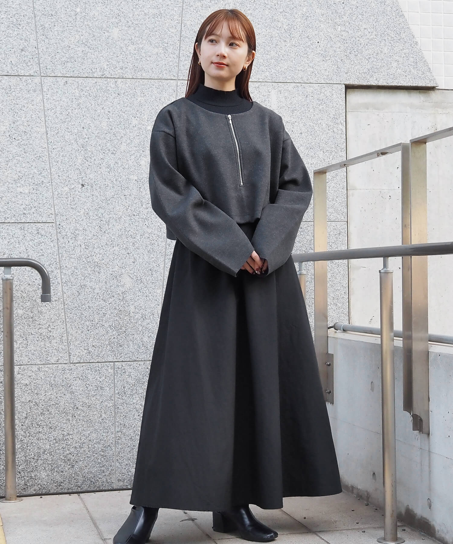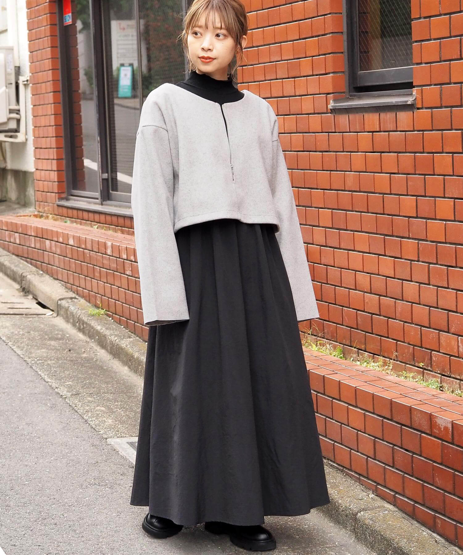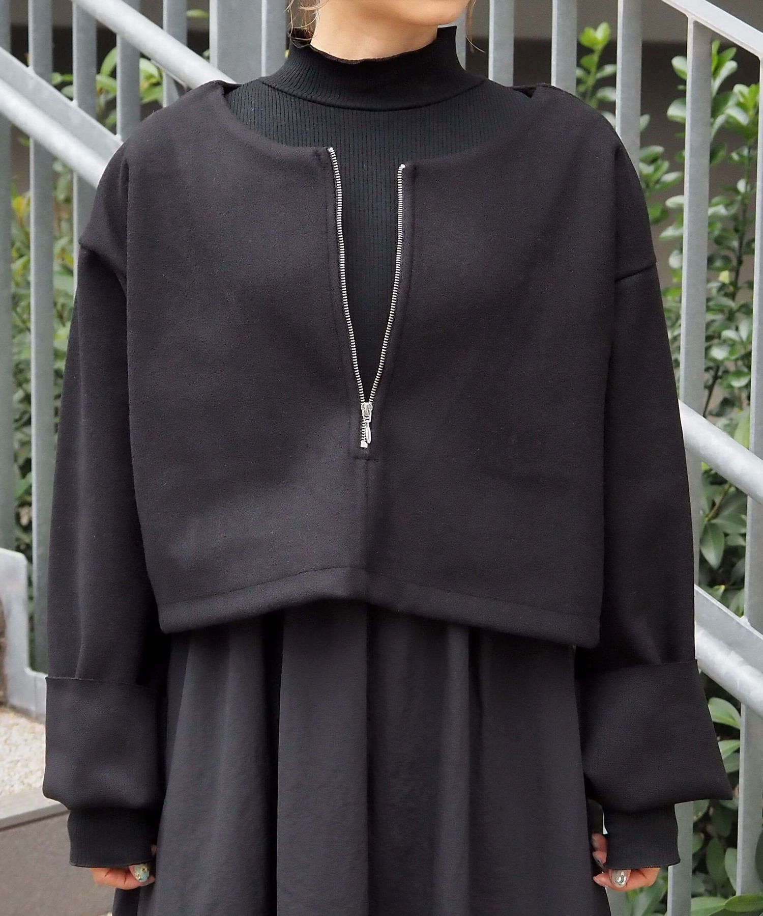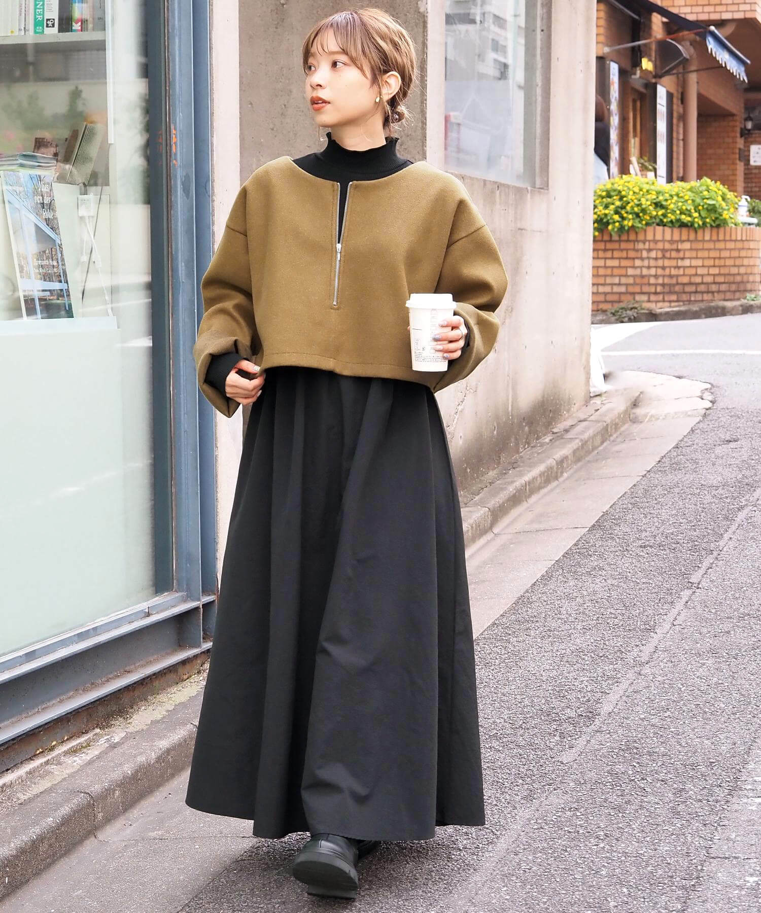 ・ウールライクなトップスは、コンパクトなショート丈とこなれ感のあるワイドスリーブがポイント。アクセサリーいらずのハーフジップデザインで、着こなしがぐっと格上げされます。