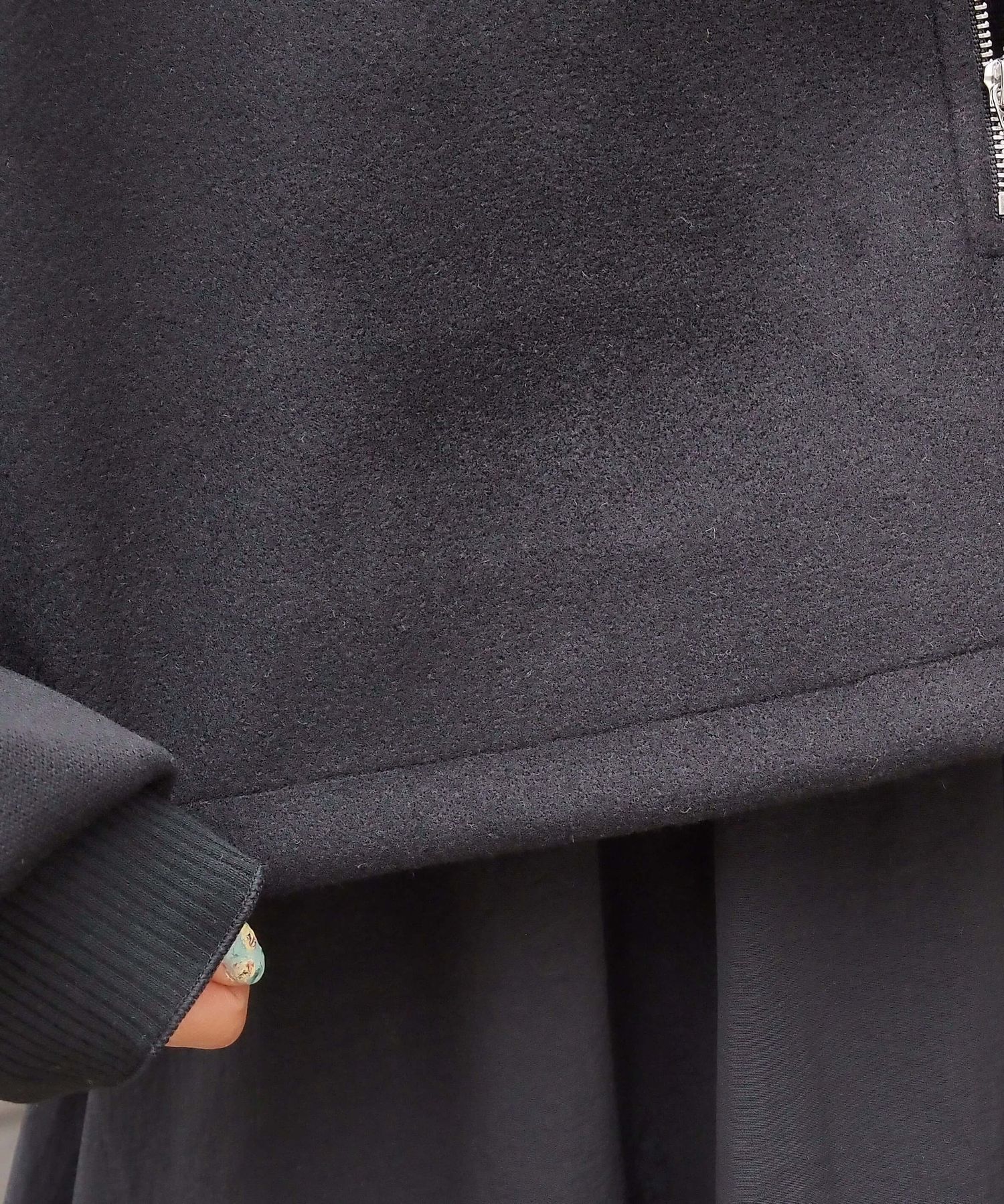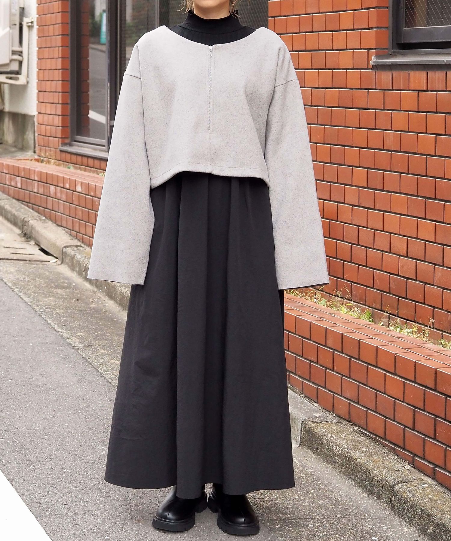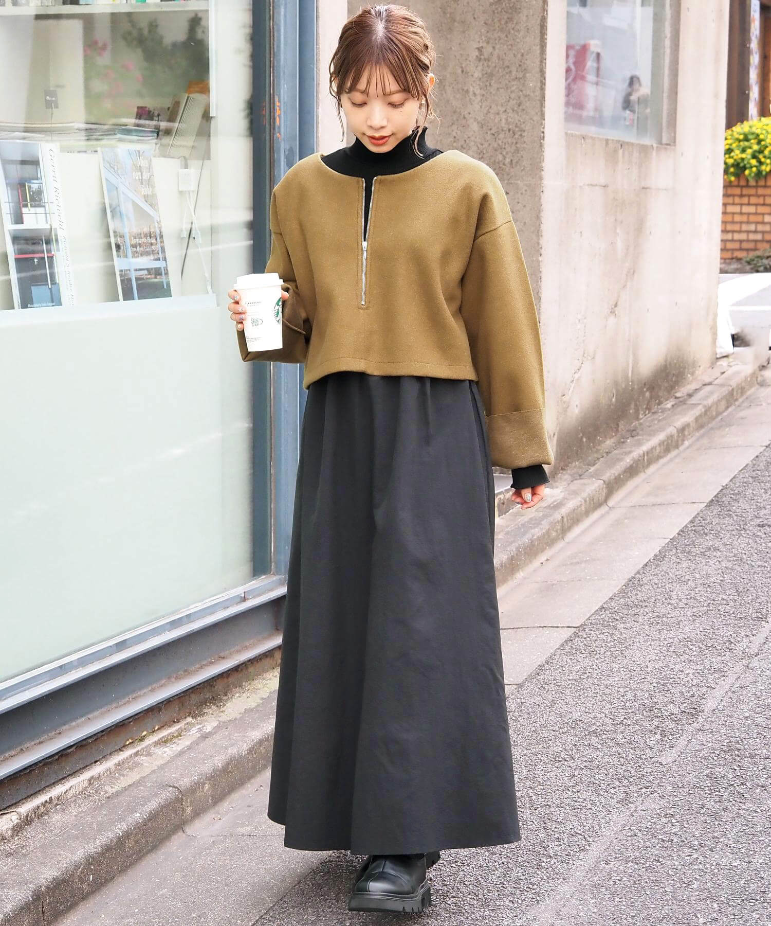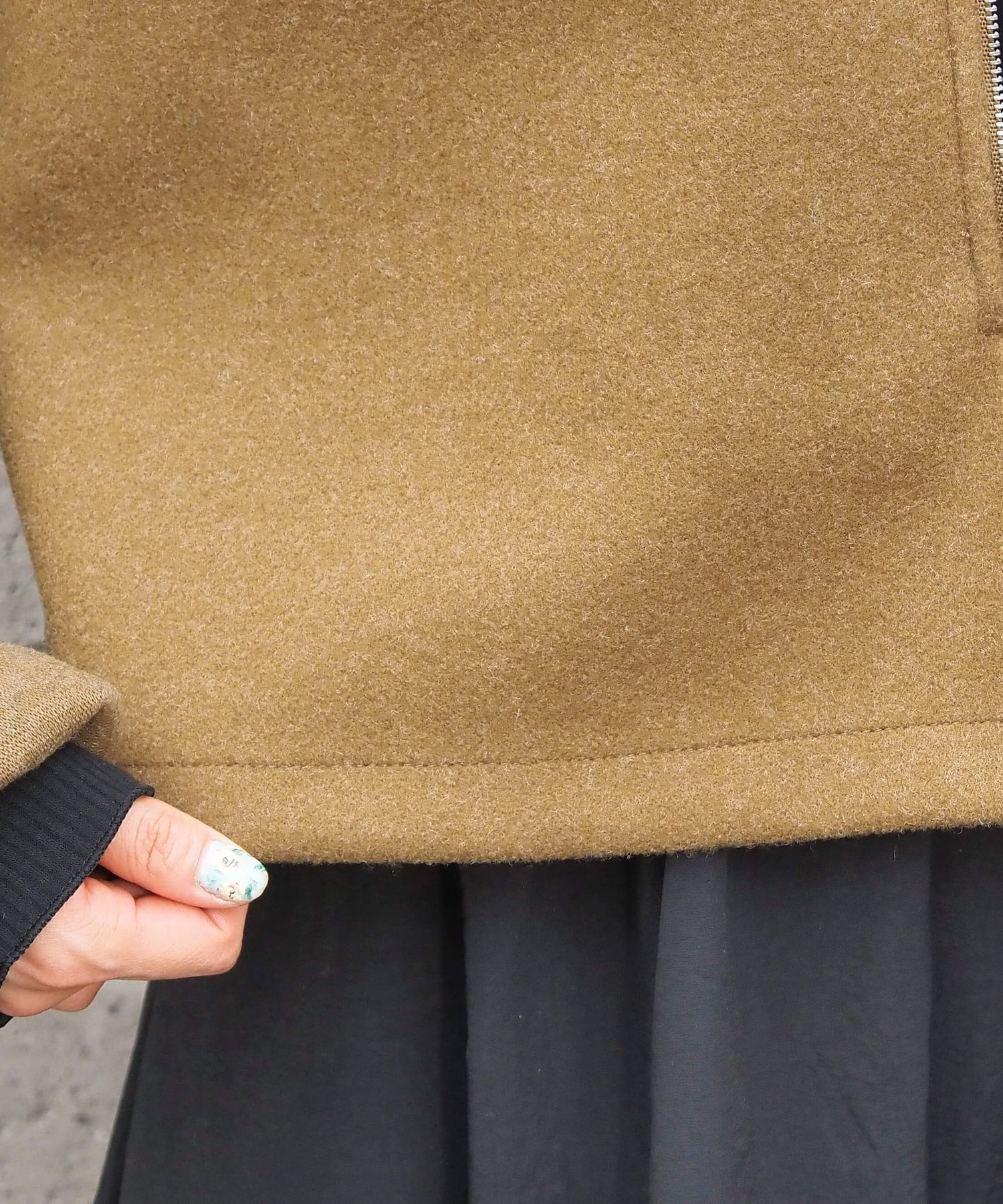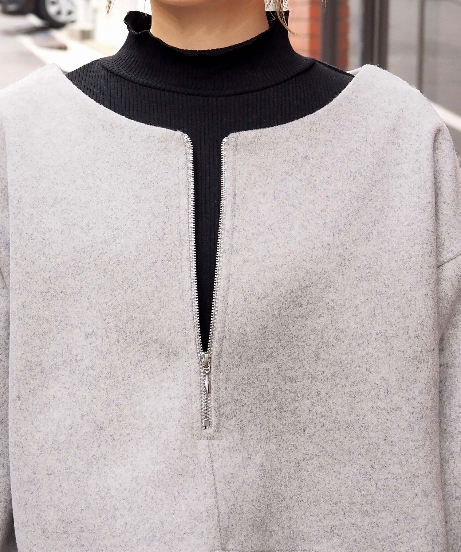 ・ウールライクなトップスは、コンパクトなショート丈とこなれ感のあるワイドスリーブがポイント。アクセサリーいらずのハーフジップデザインで、着こなしがぐっと格上げされます。