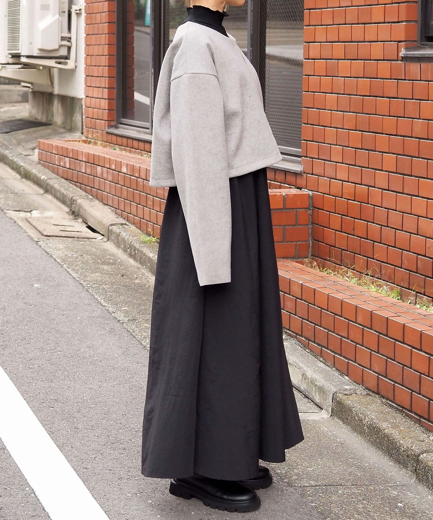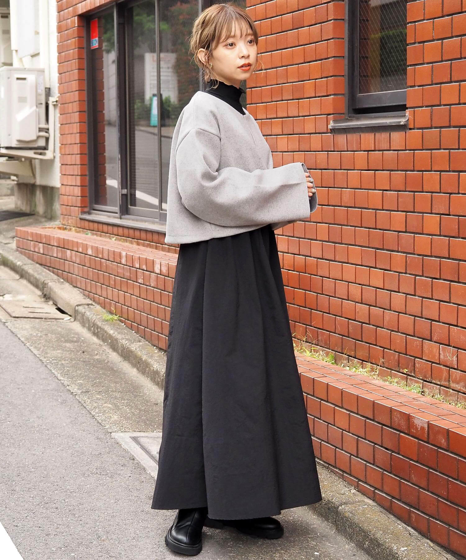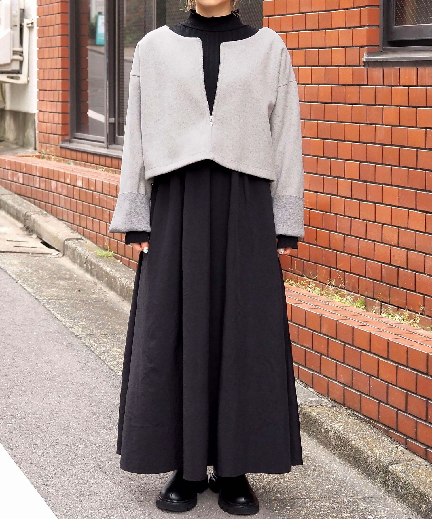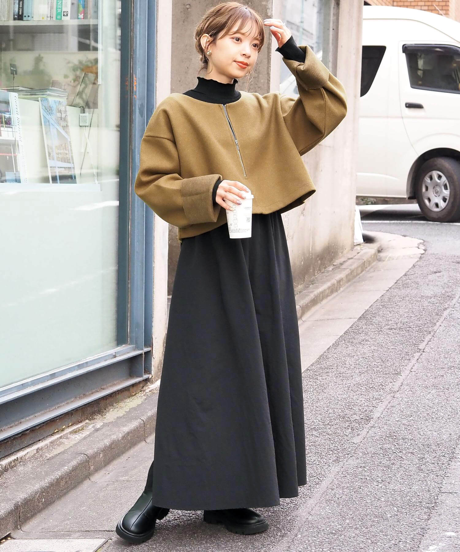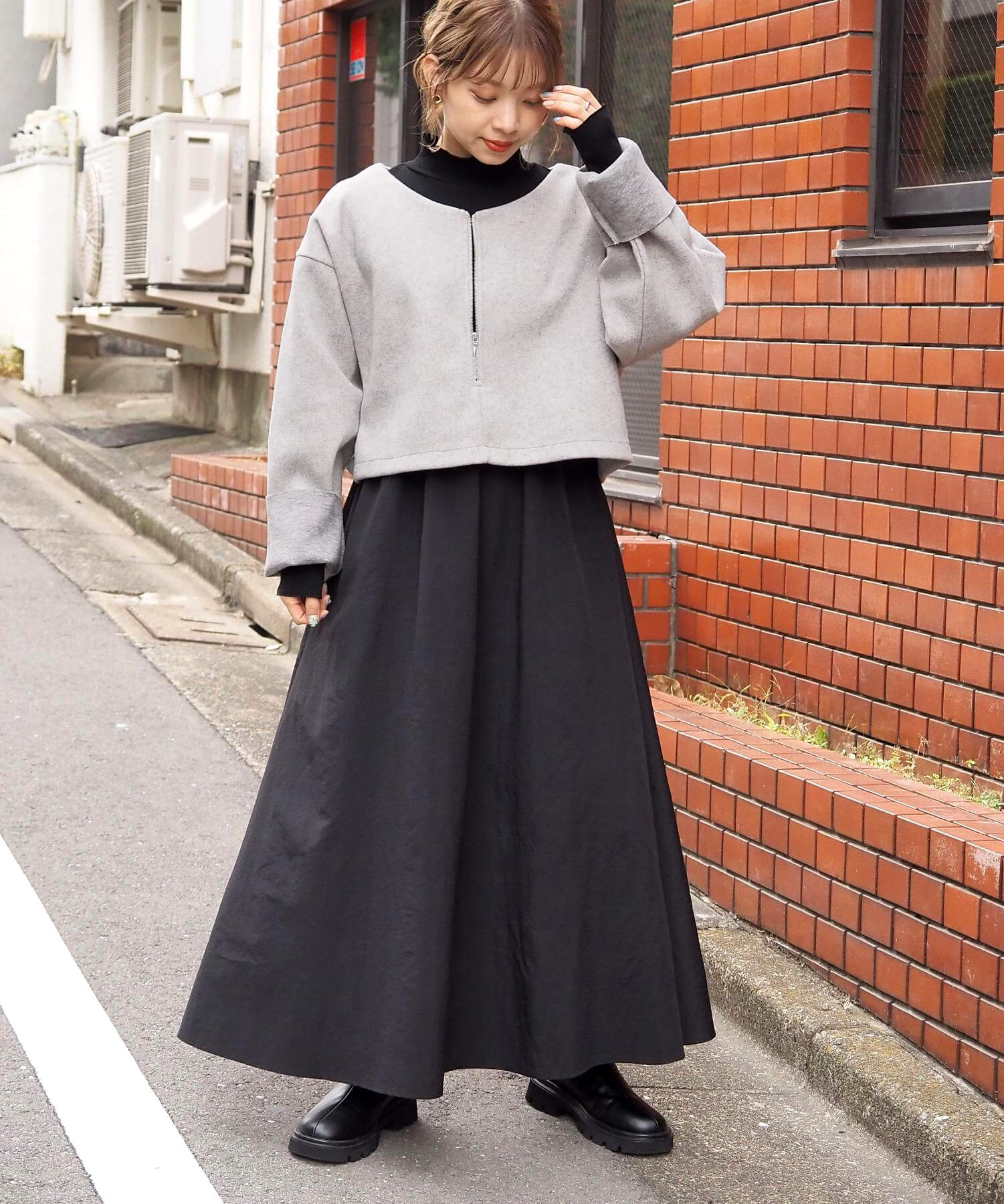 ・ウールライクなトップスは、コンパクトなショート丈とこなれ感のあるワイドスリーブがポイント。アクセサリーいらずのハーフジップデザインで、着こなしがぐっと格上げされます。