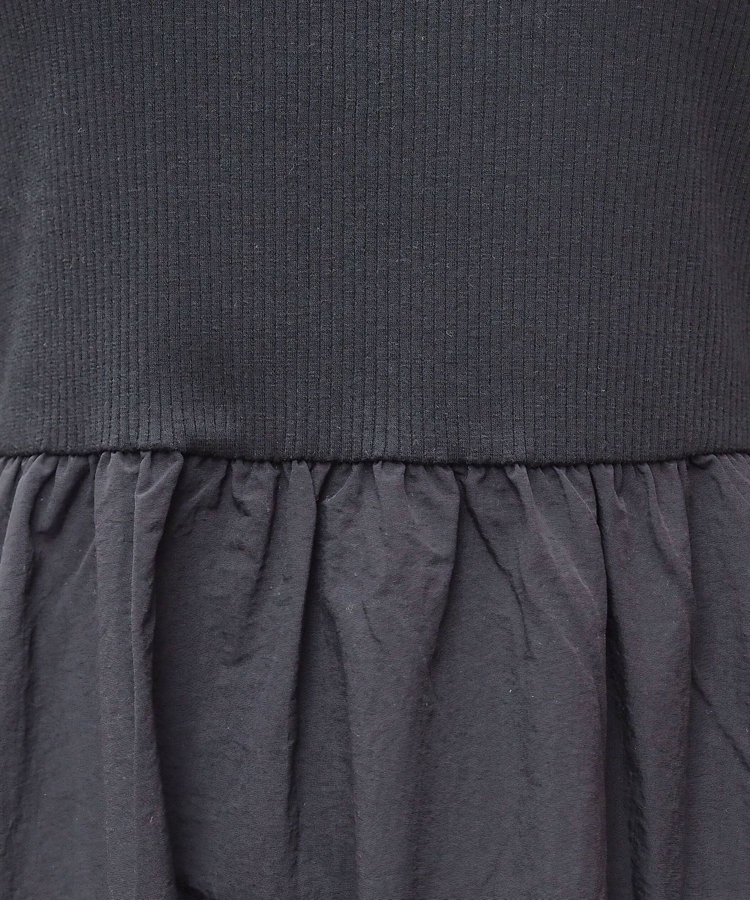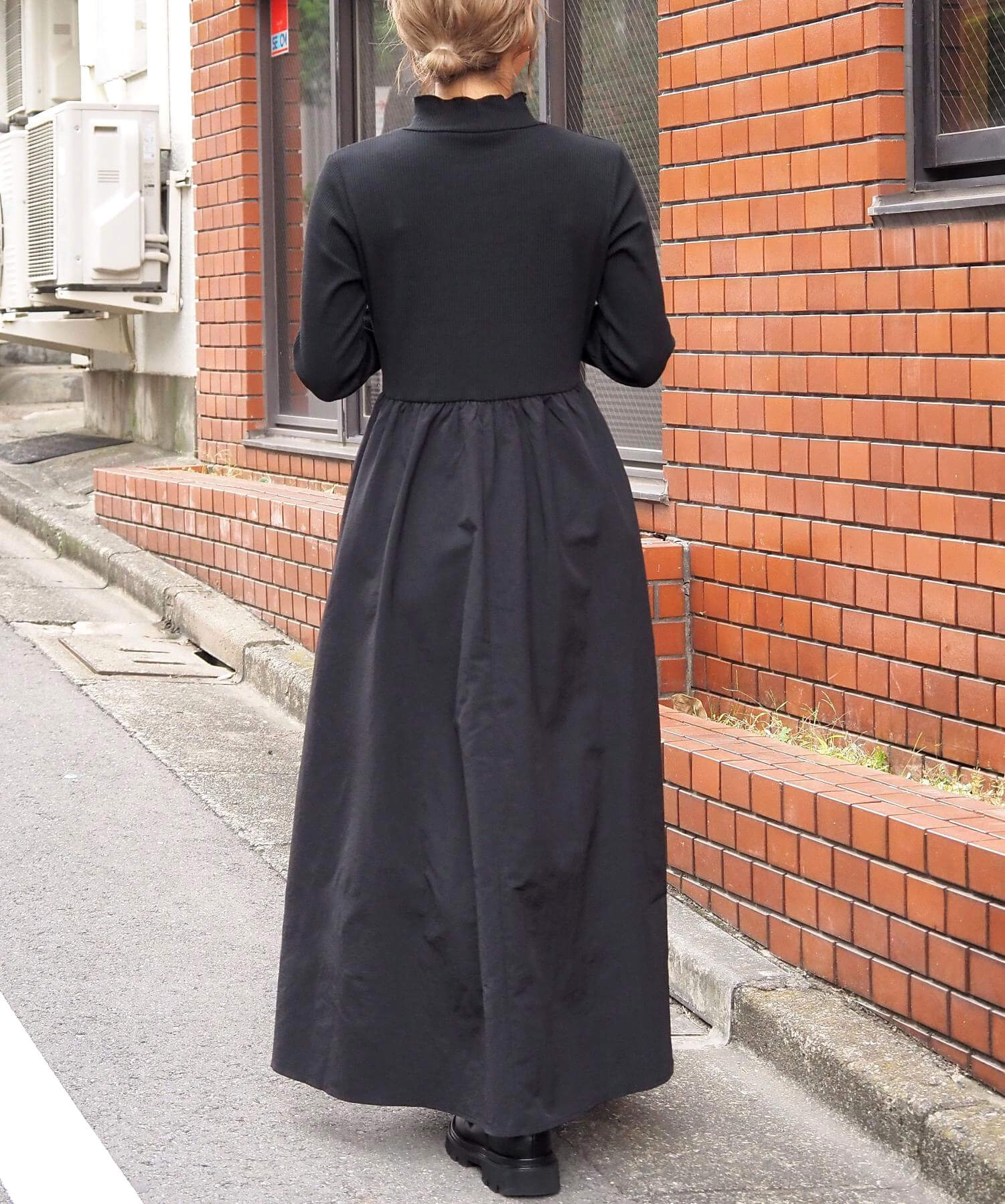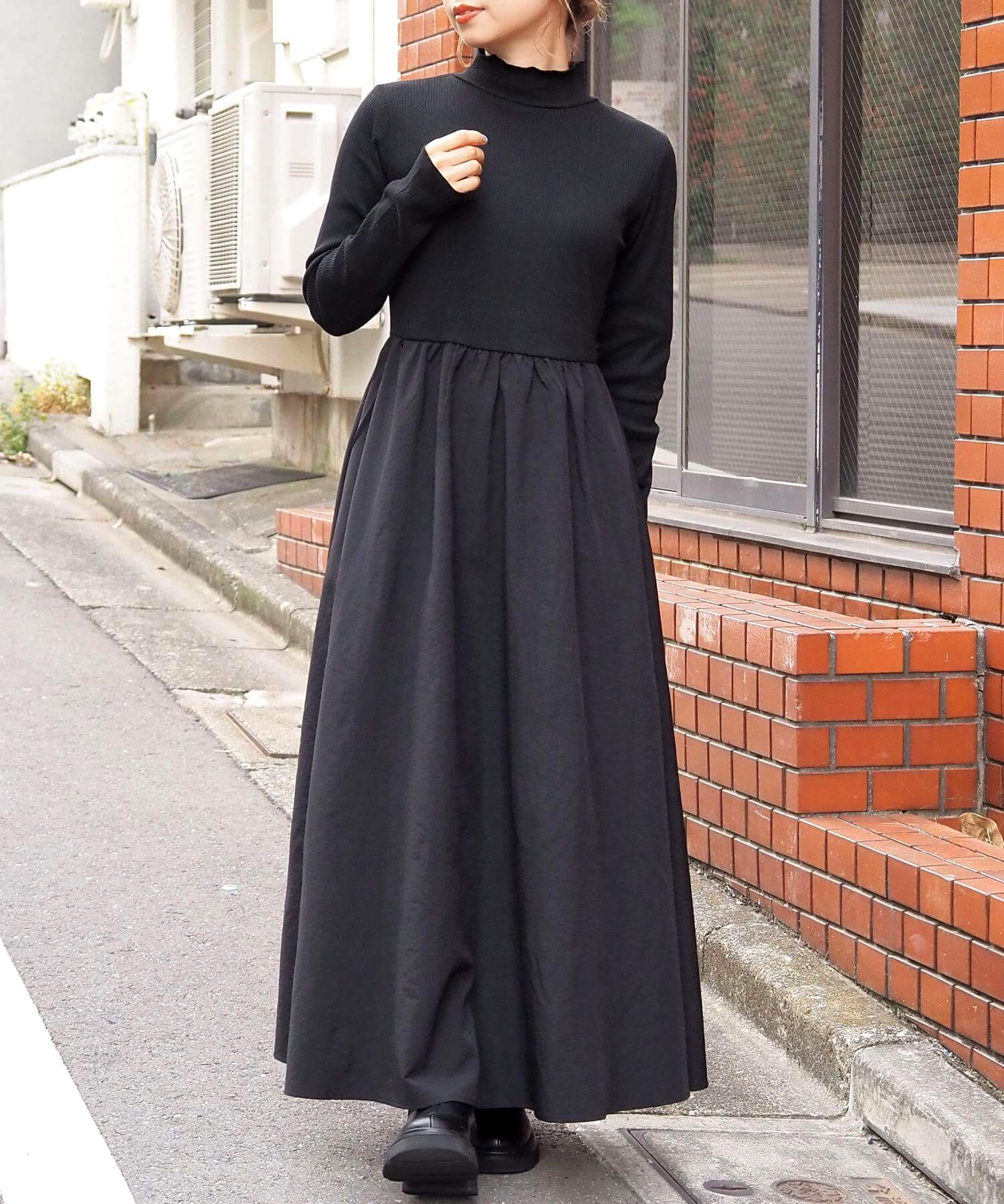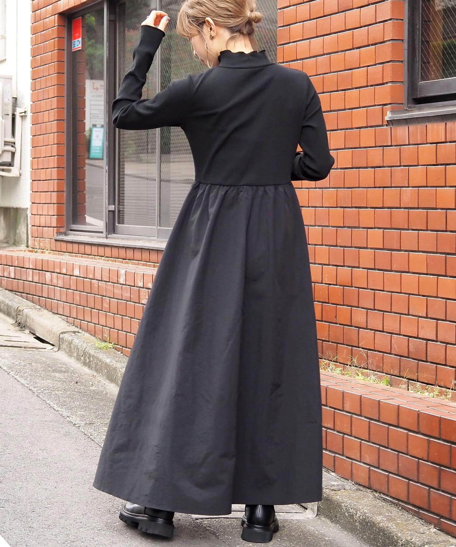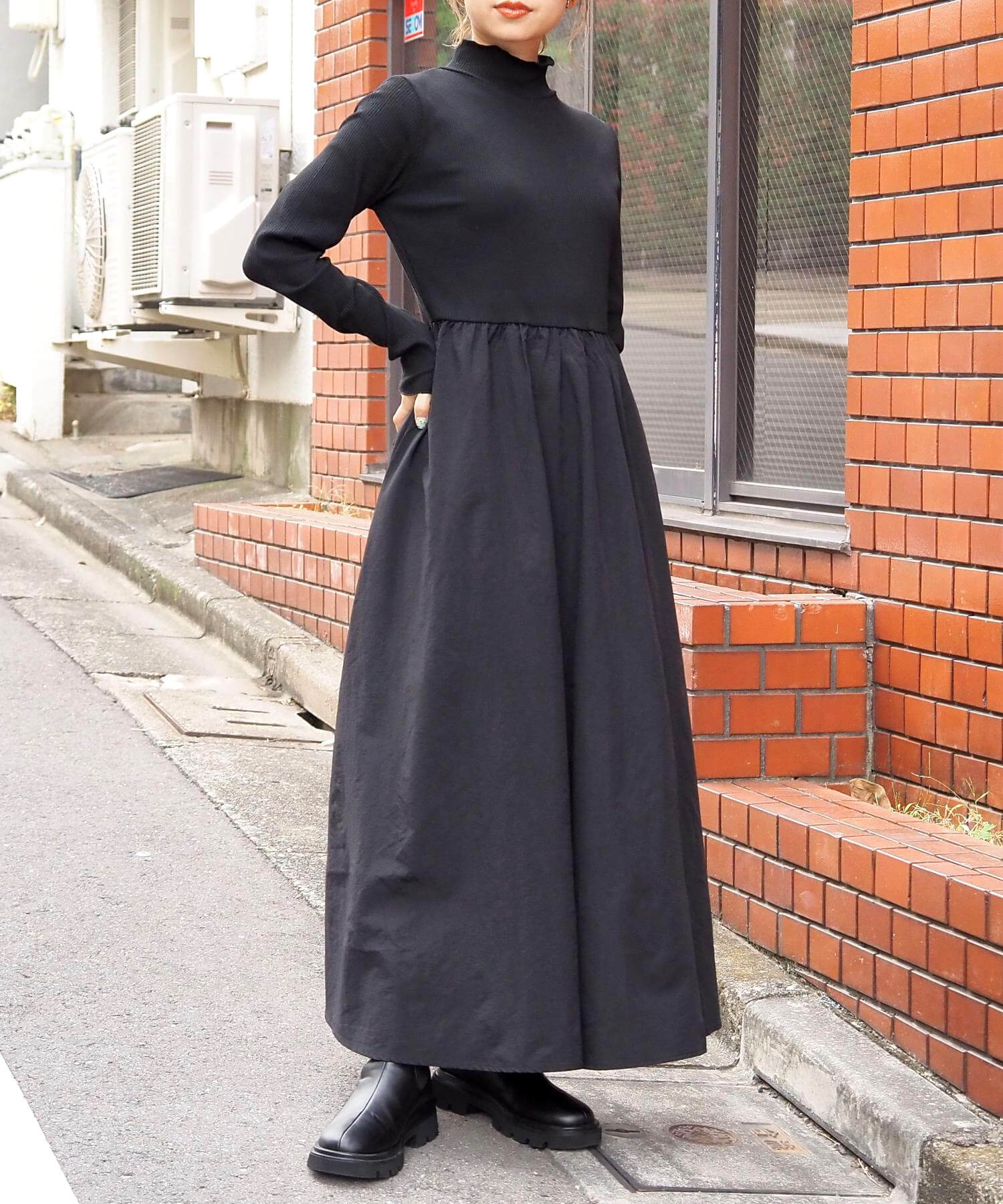 ・スタイルアップ効果の高いワンピースは、トップス部分を着心地の良いテレコ素材、スカート部分をトレンドのナイロン素材で切り替えました。ハイウエストとフレアラインの美シルエットが魅力です。