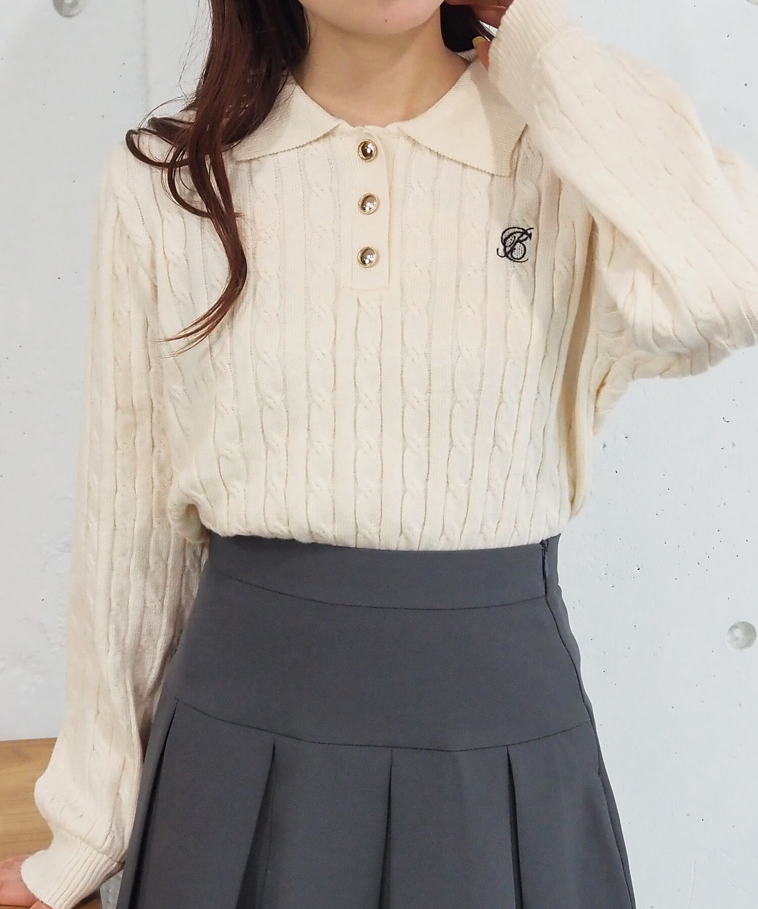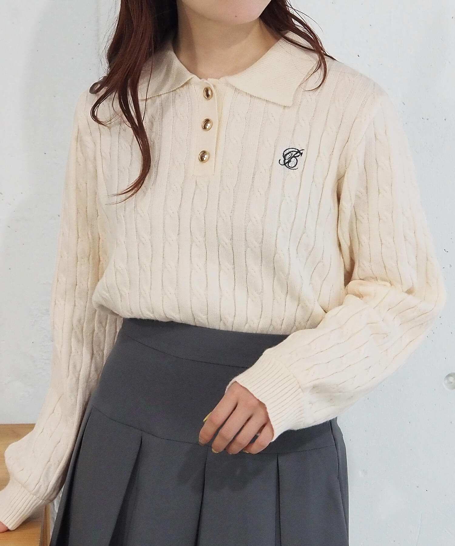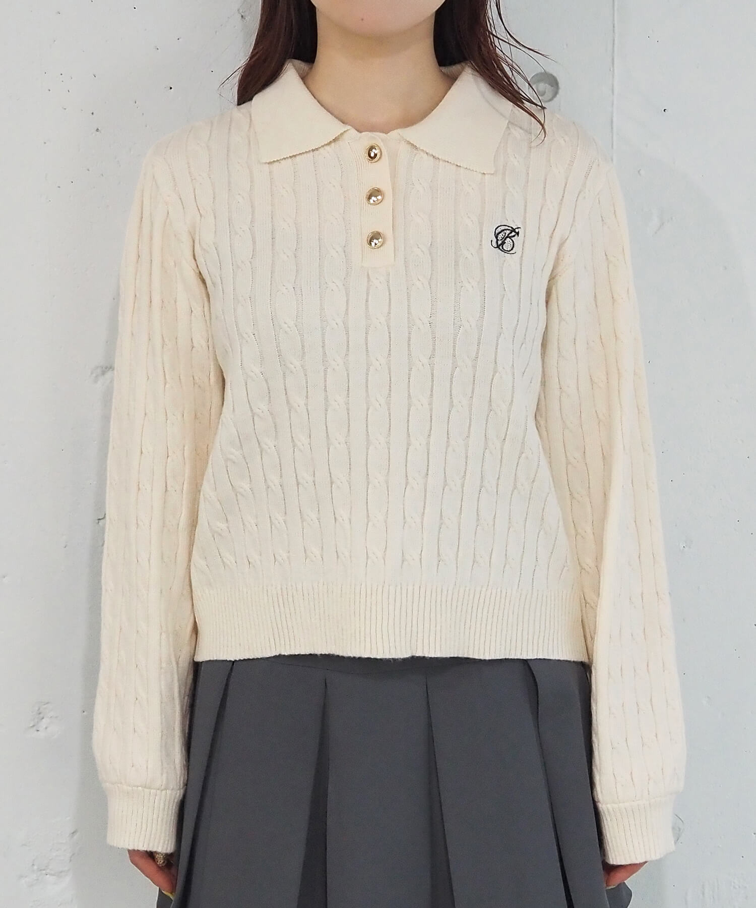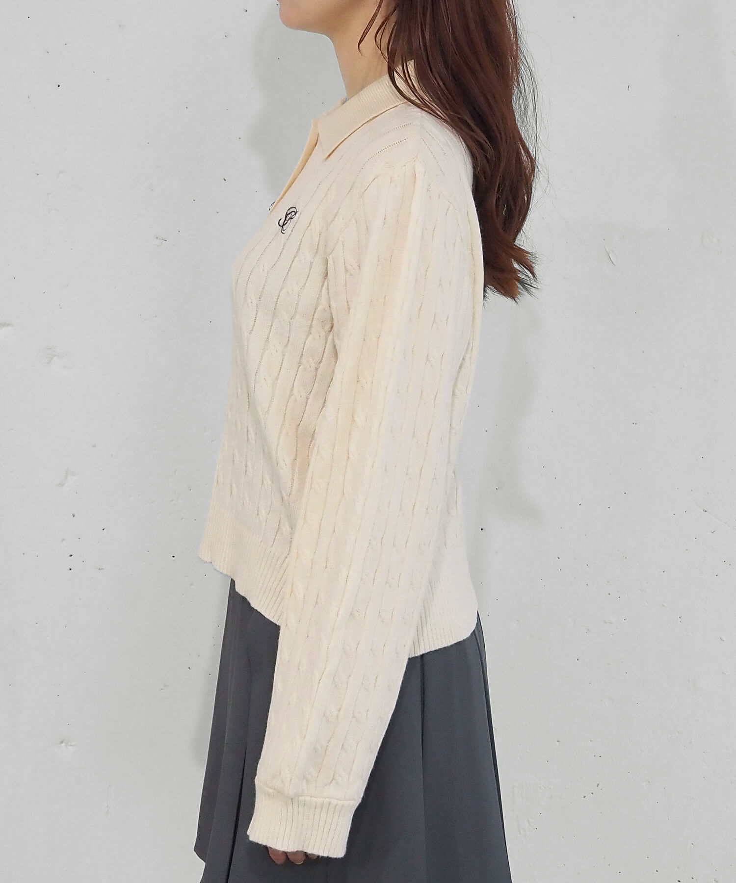 ・ロゴ刺繍やレトロな襟付きデザインが今っぽいケーブルニットです。