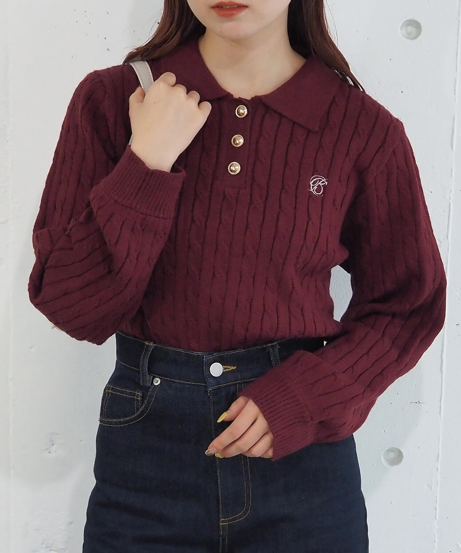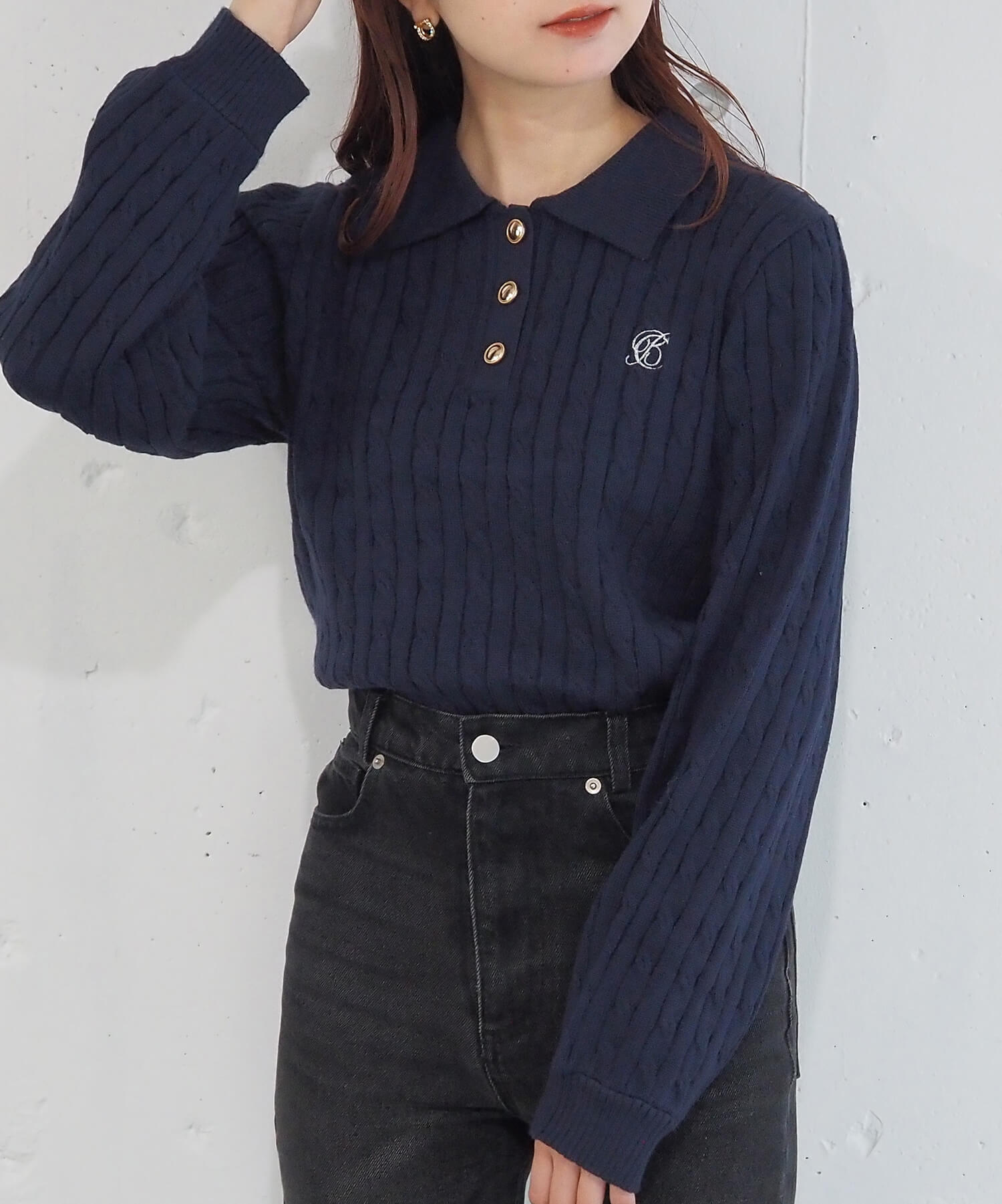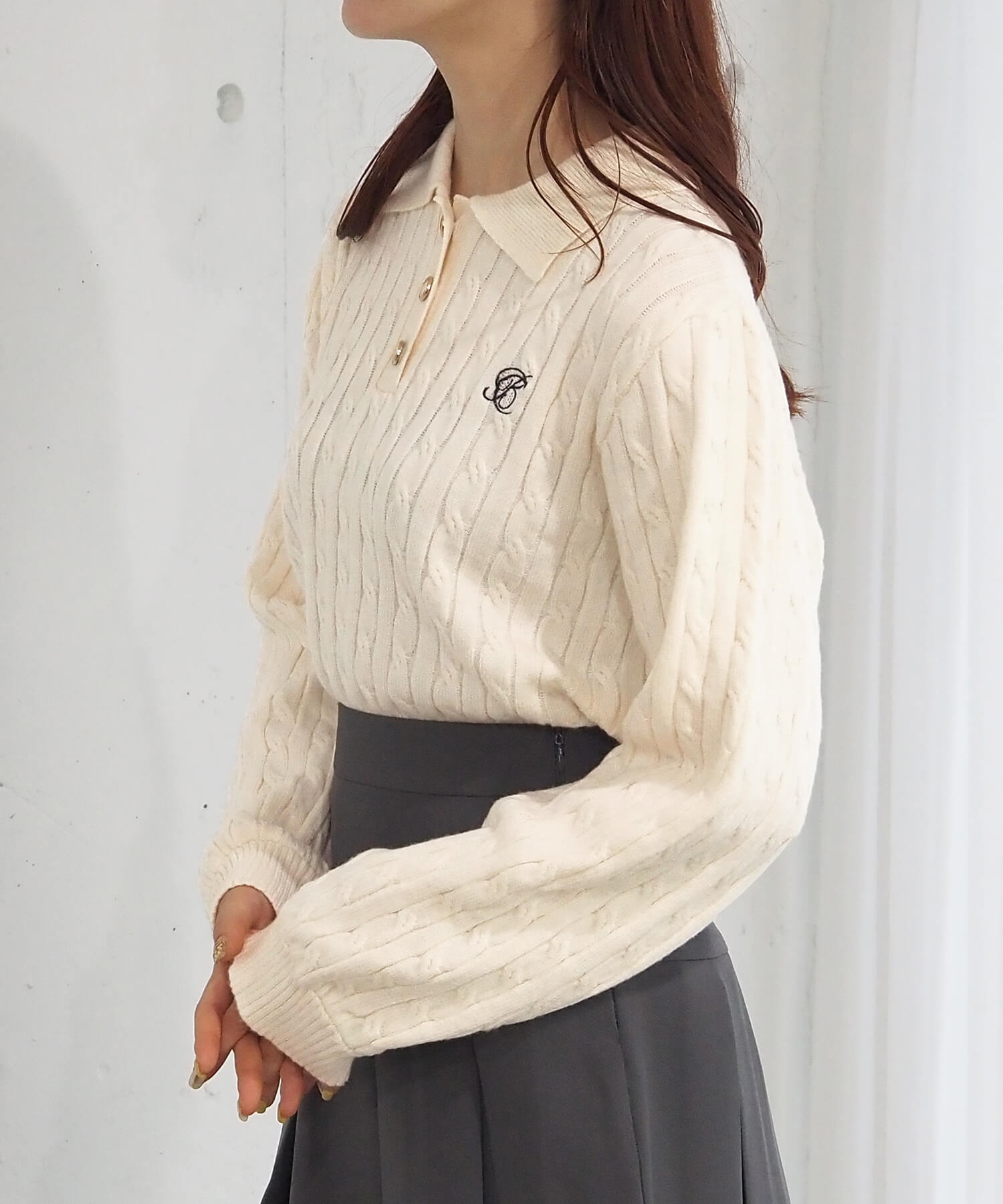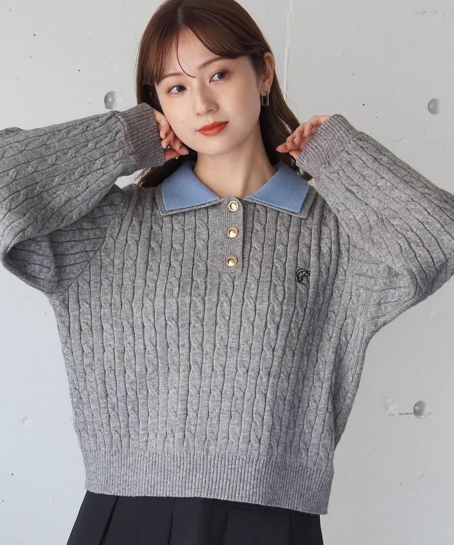 ・ロゴ刺繍やレトロな襟付きデザインが今っぽいケーブルニットです。