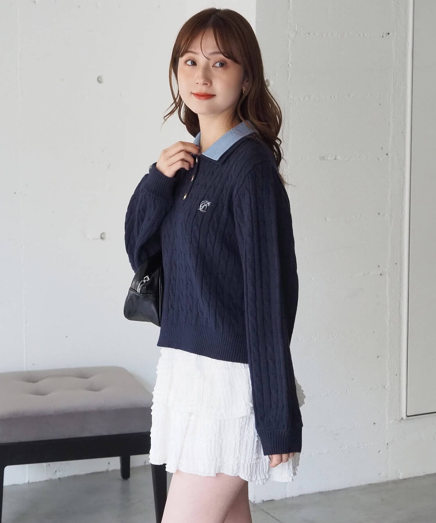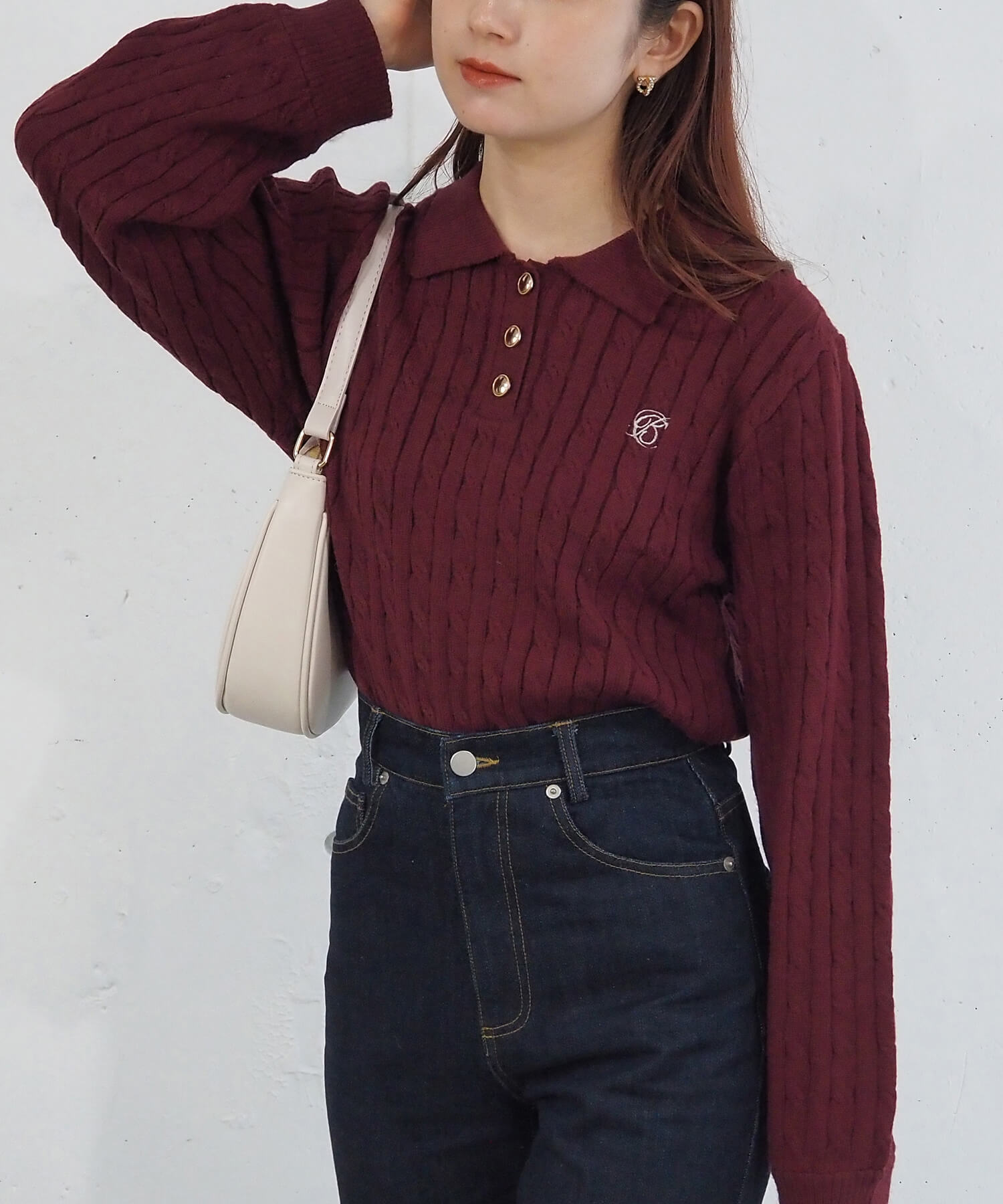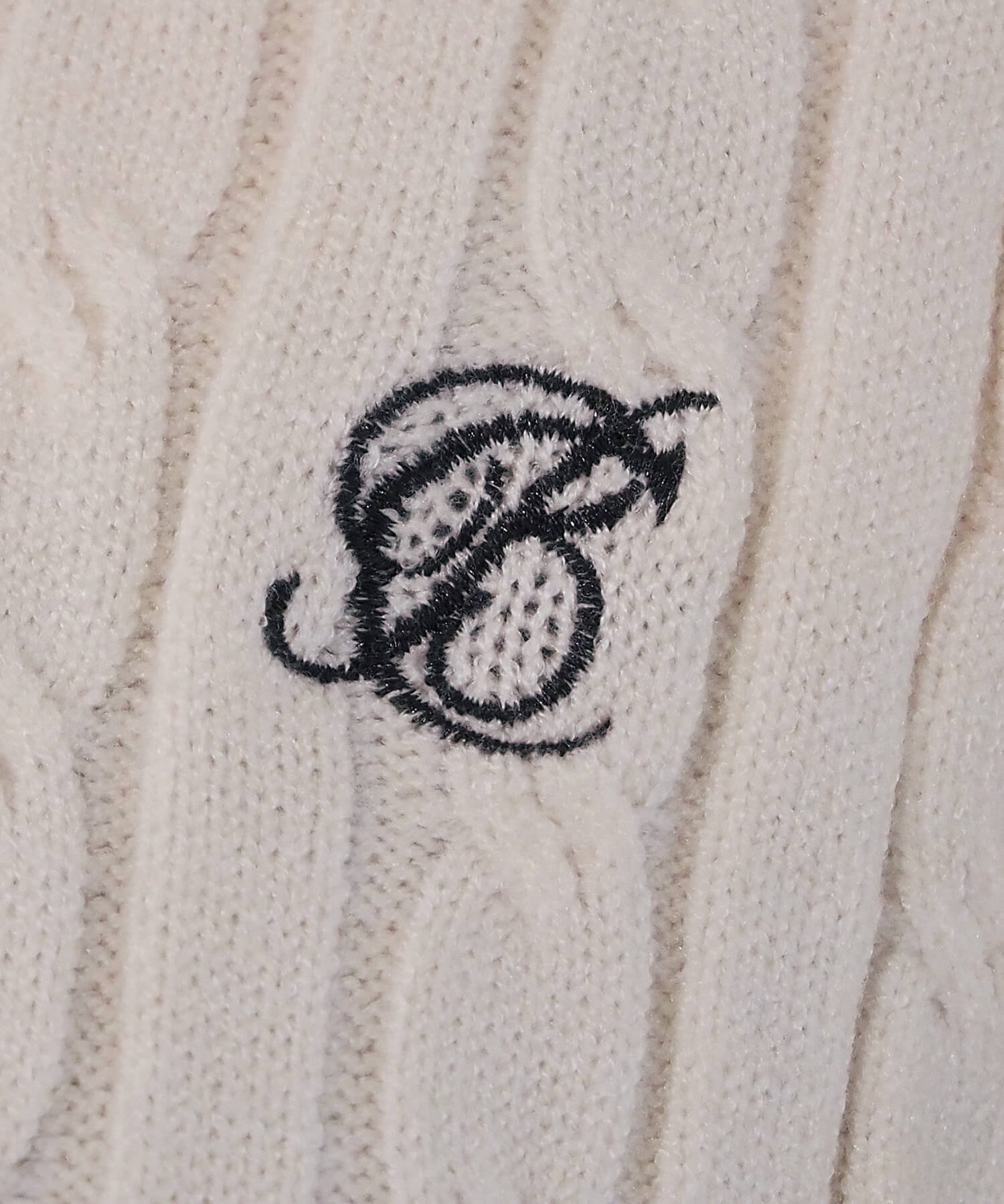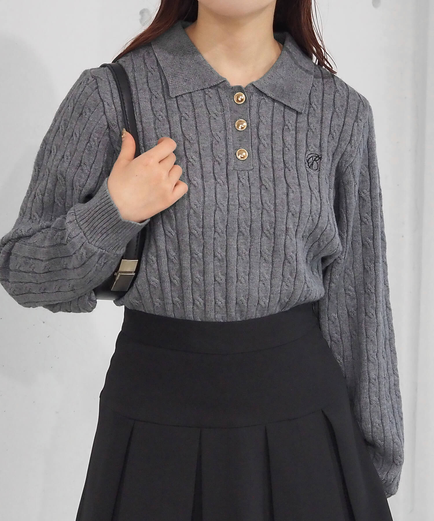・ロゴ刺繍やレトロな襟付きデザインが今っぽいケーブルニットです。