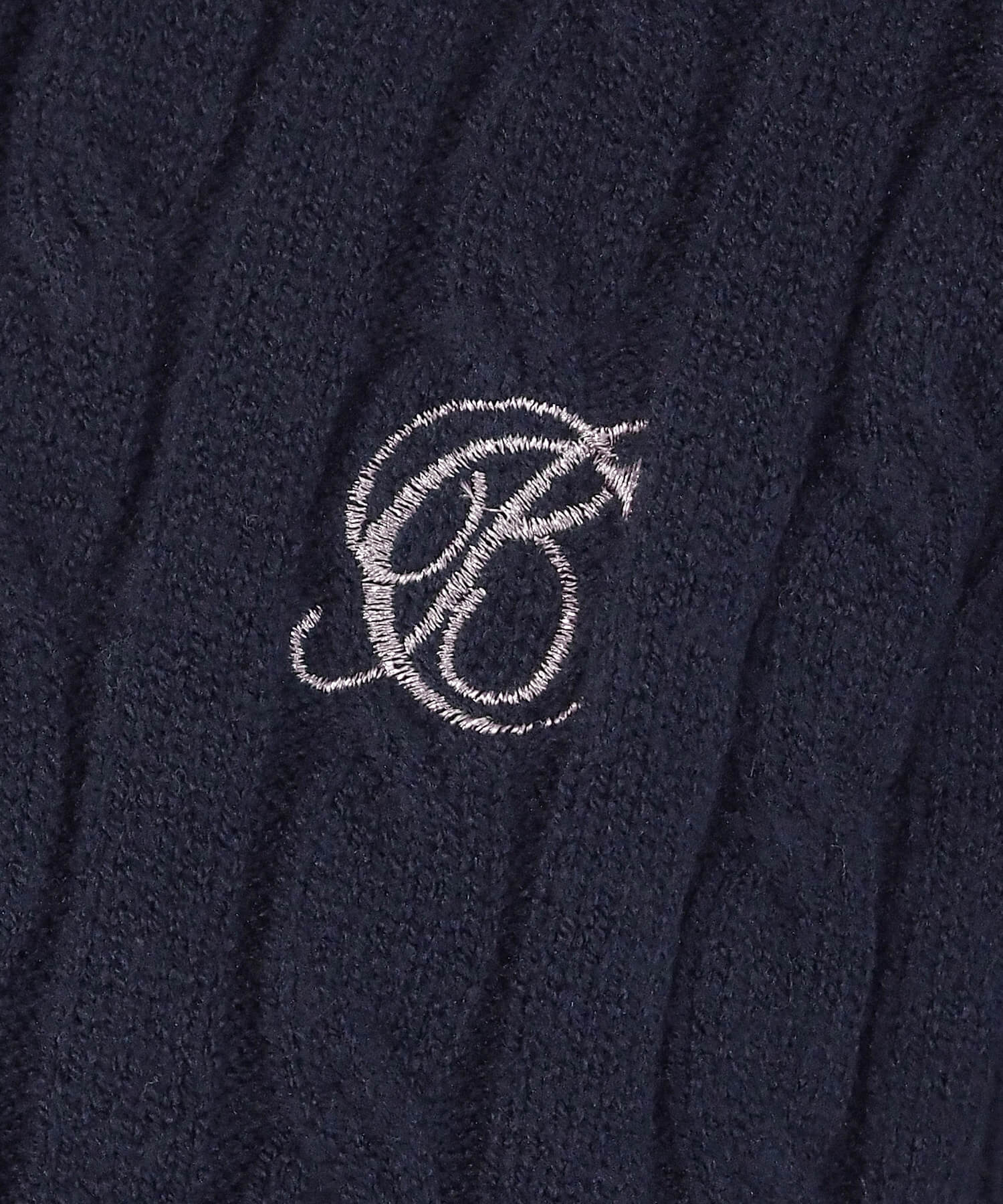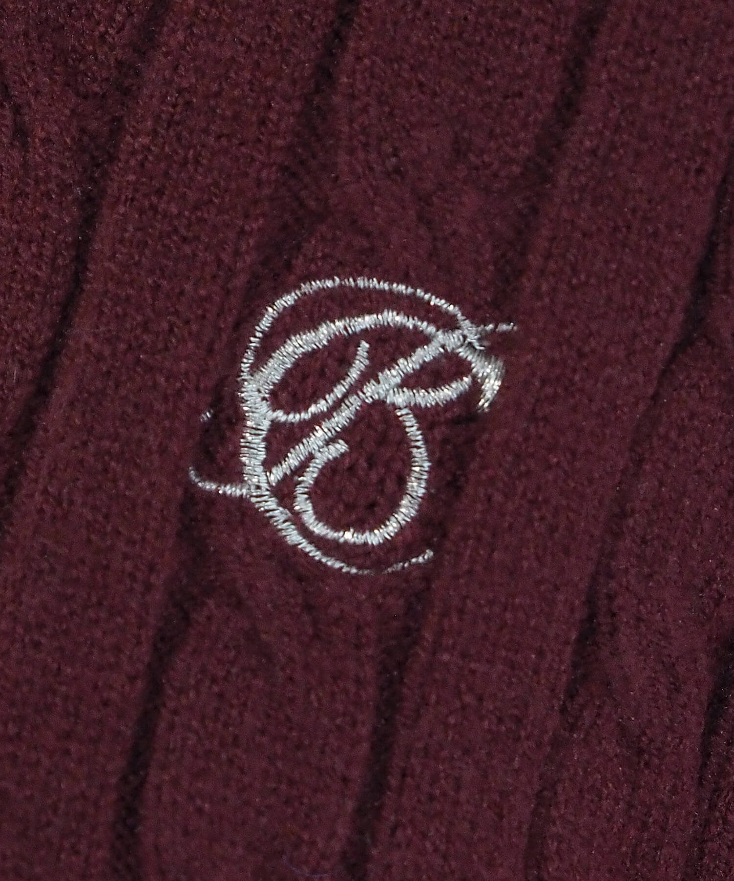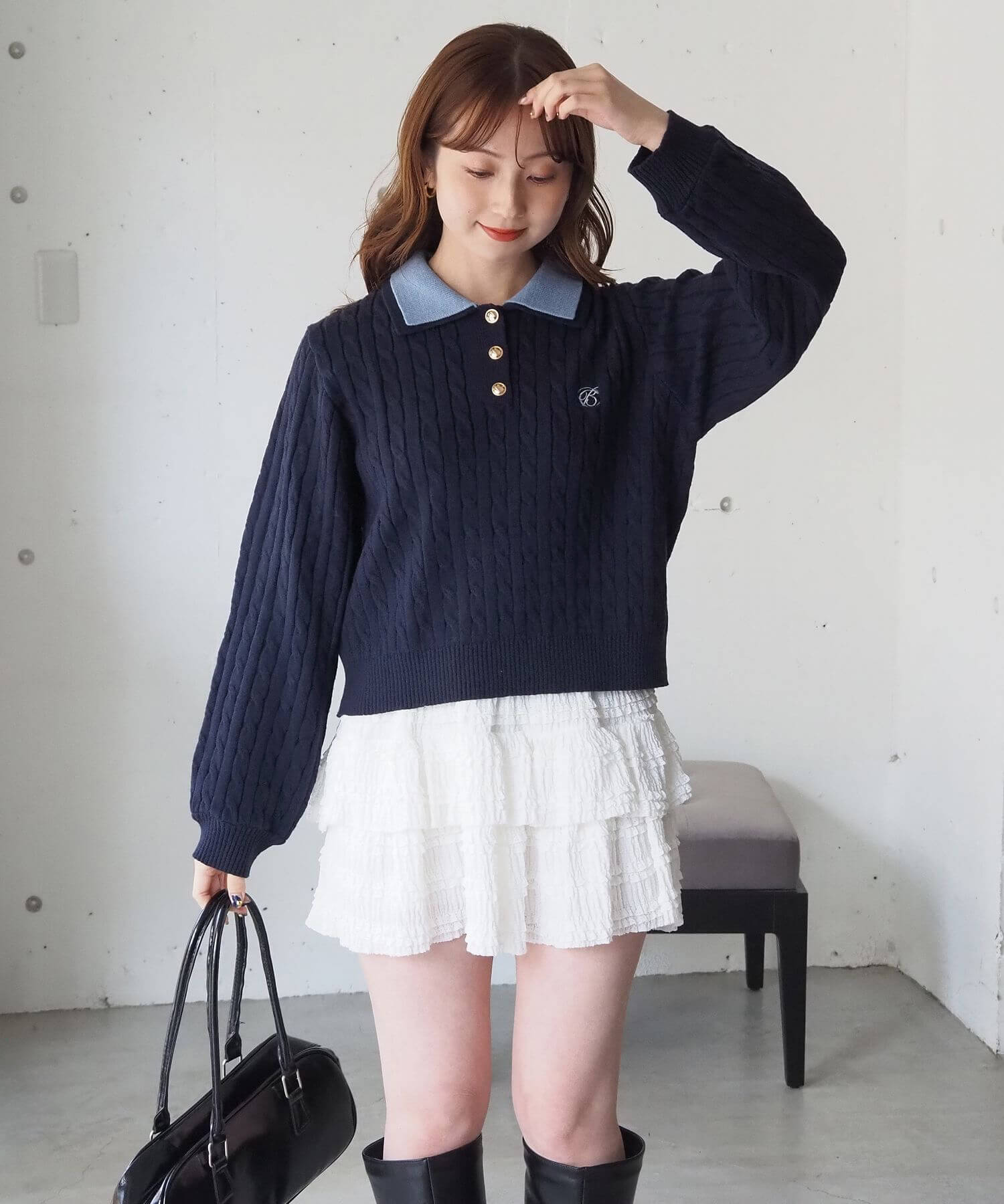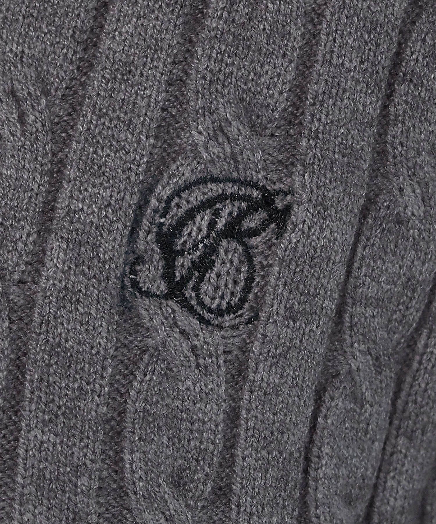・ロゴ刺繍やレトロな襟付きデザインが今っぽいケーブルニットです。