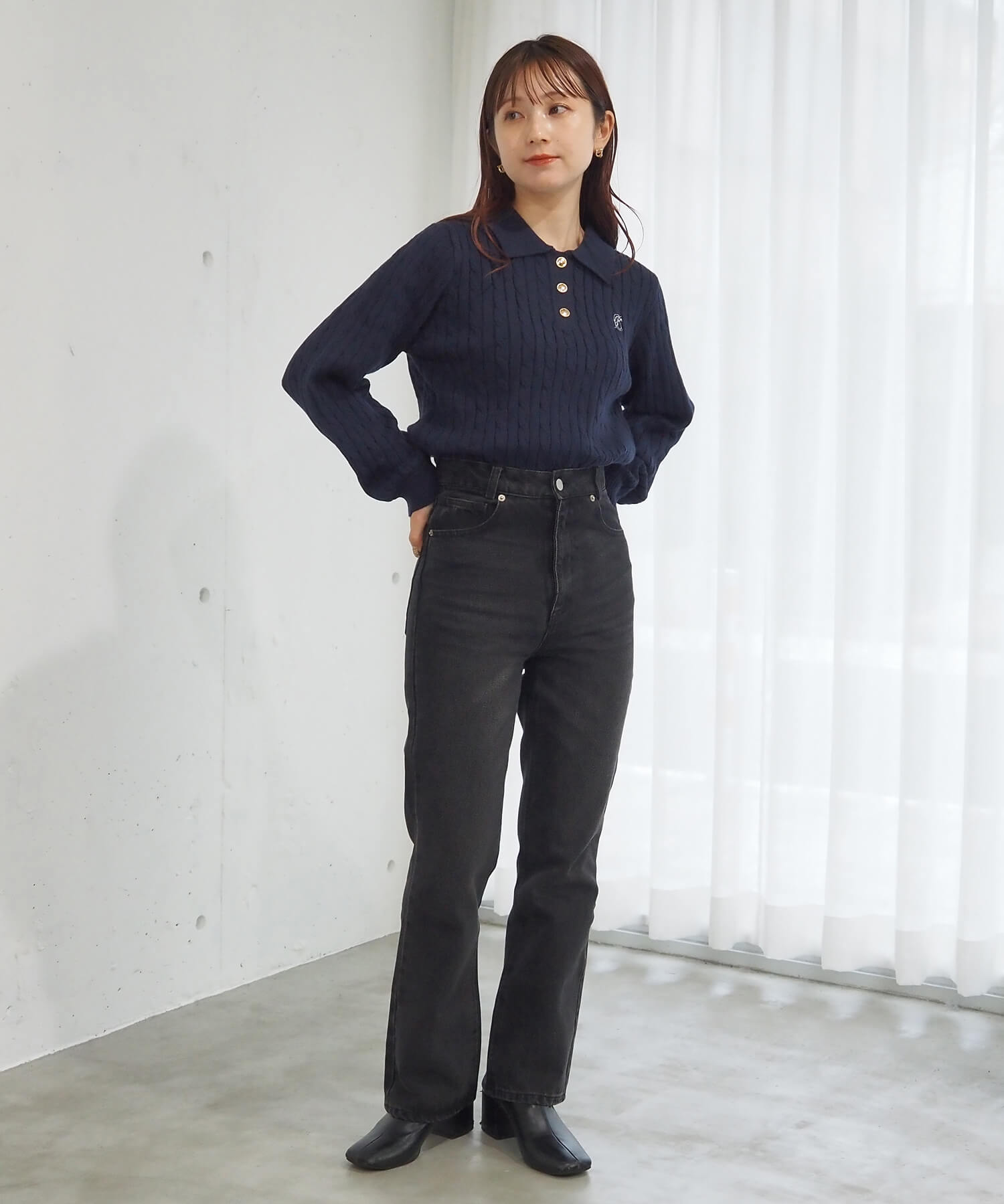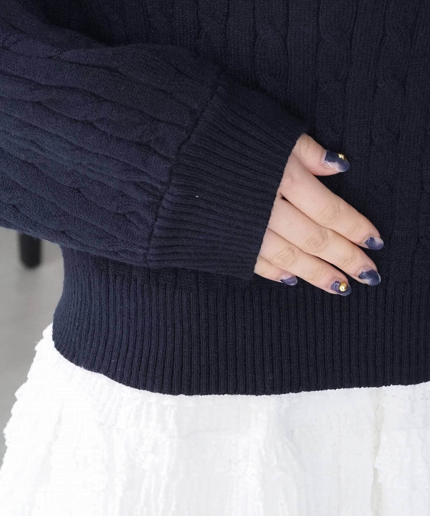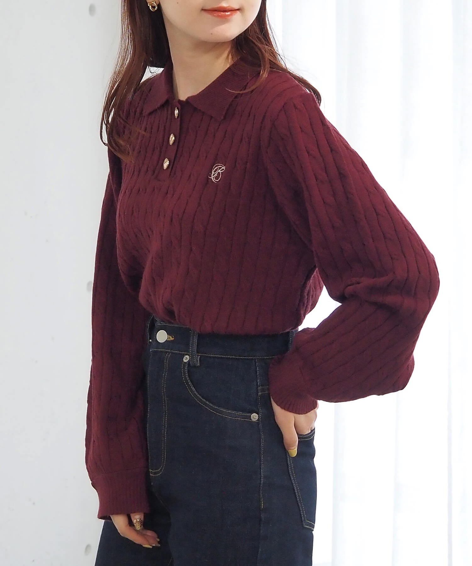 ・上品なケーブルニットをポロテイストにアップデートさせた、今季らしい1枚。