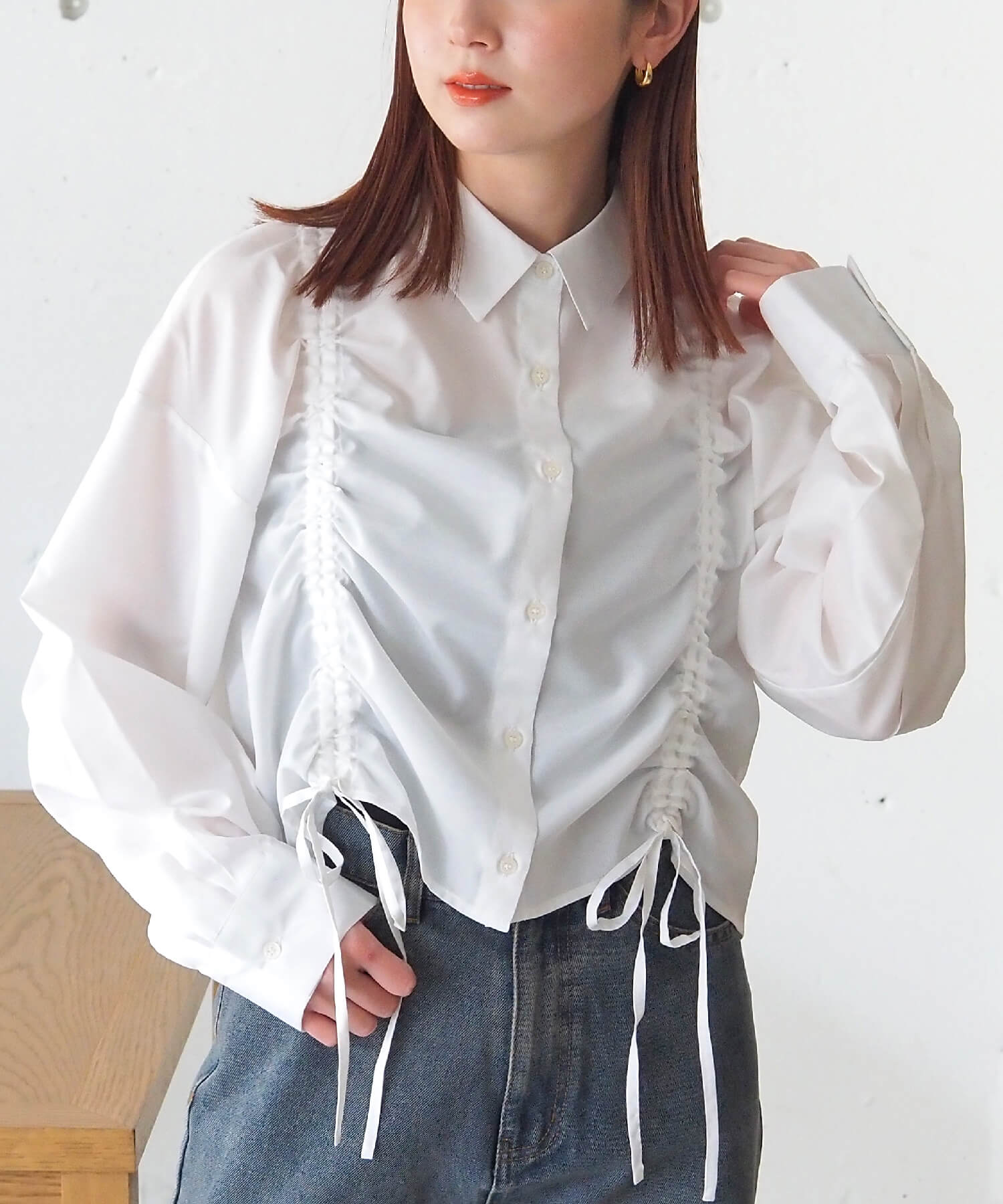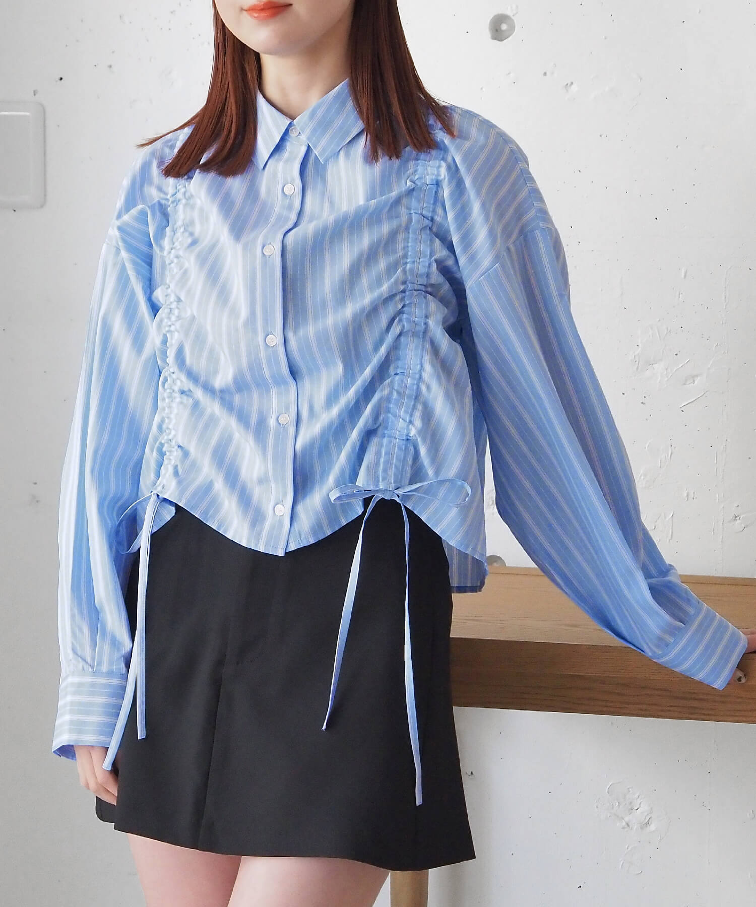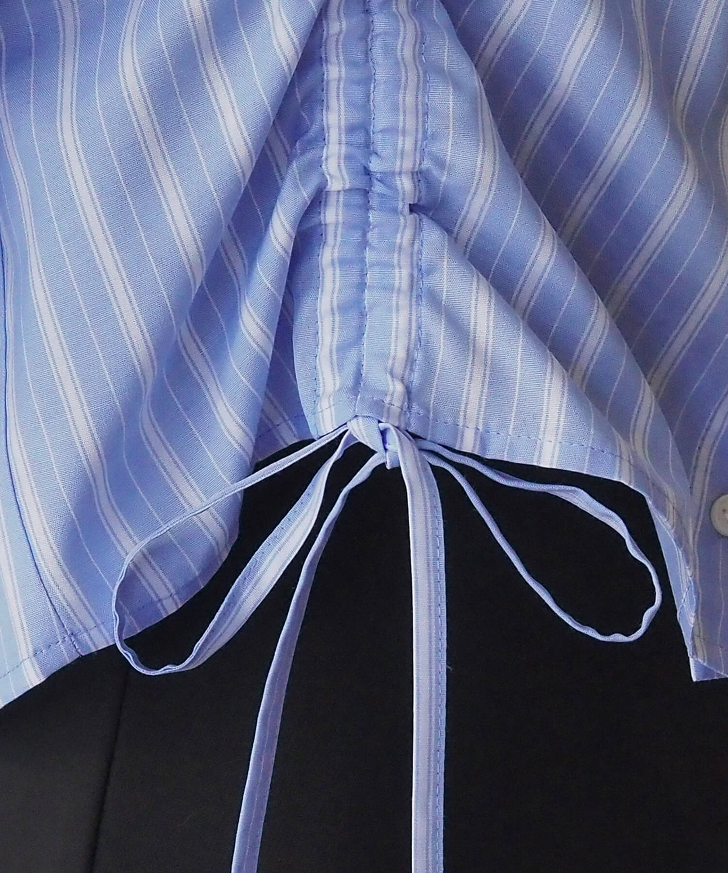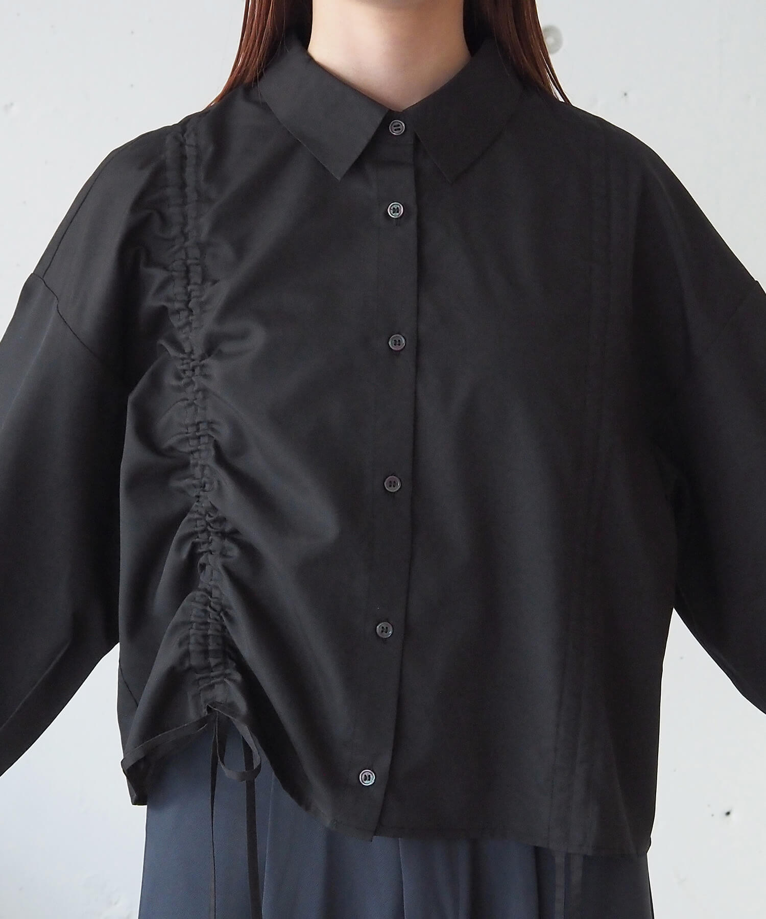 ・フロントのドロストデザインが目を惹くショート丈シャツです。