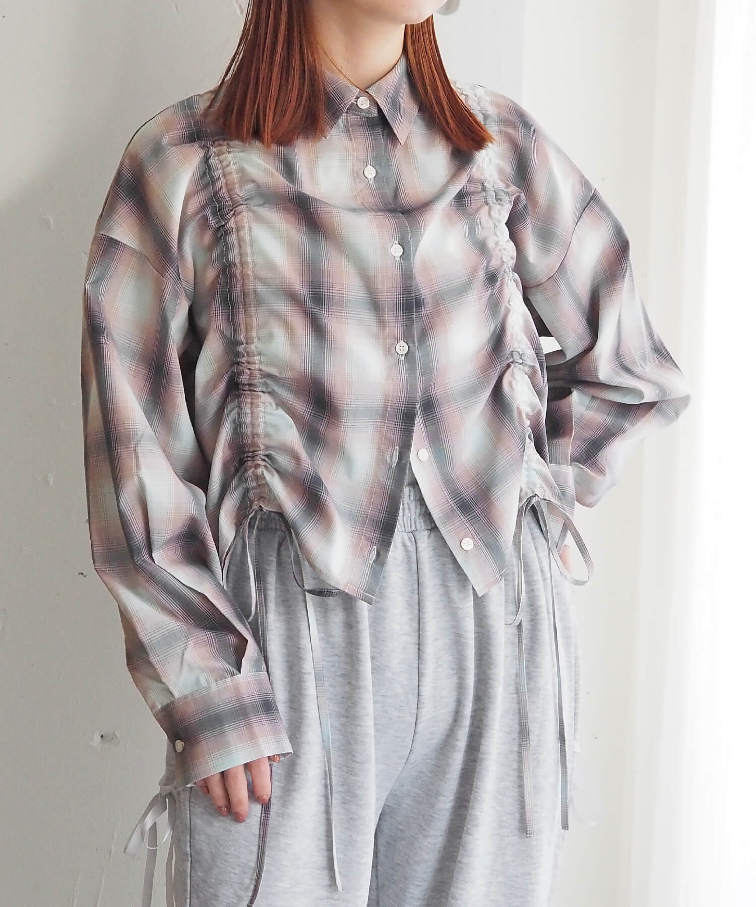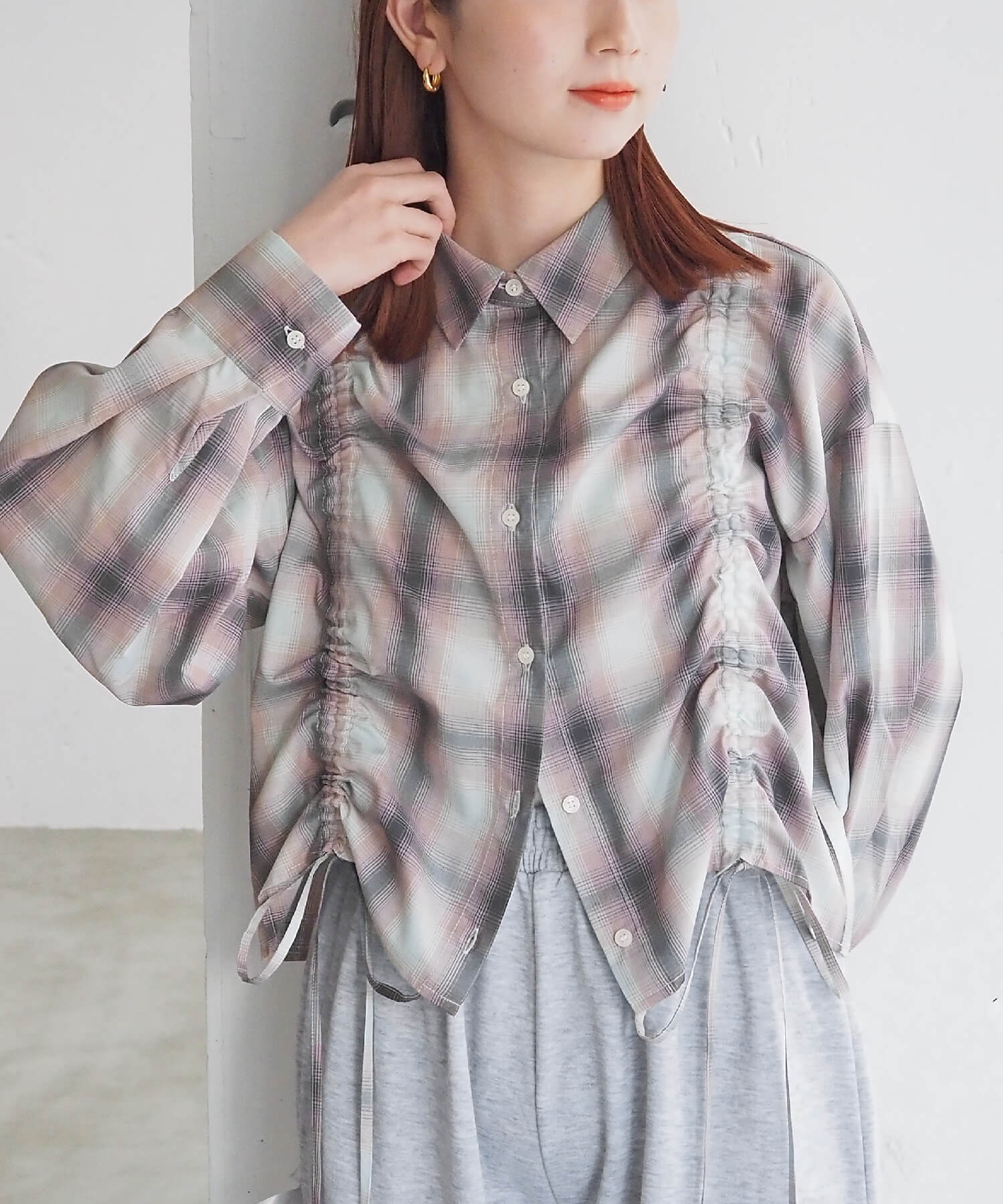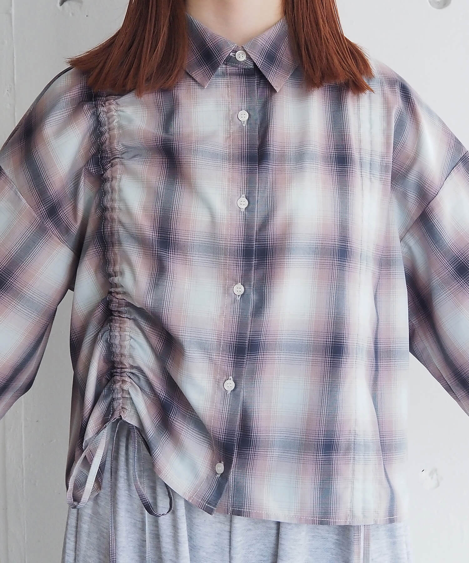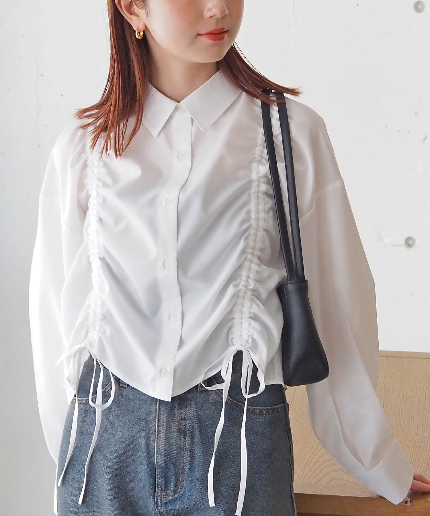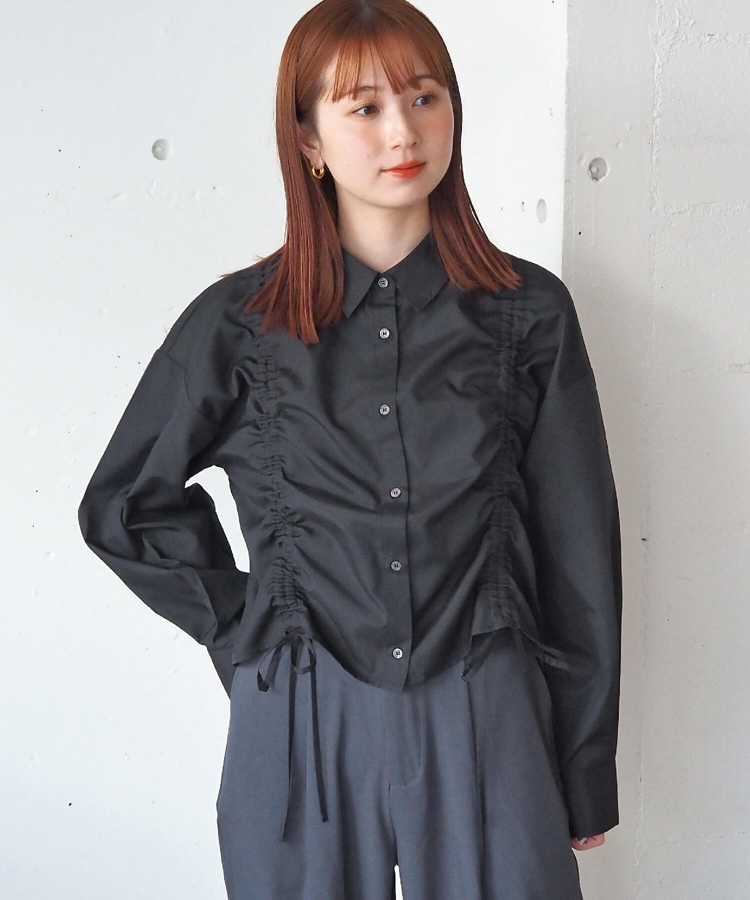 ・フロントのドロストデザインが目を惹くショート丈シャツです。