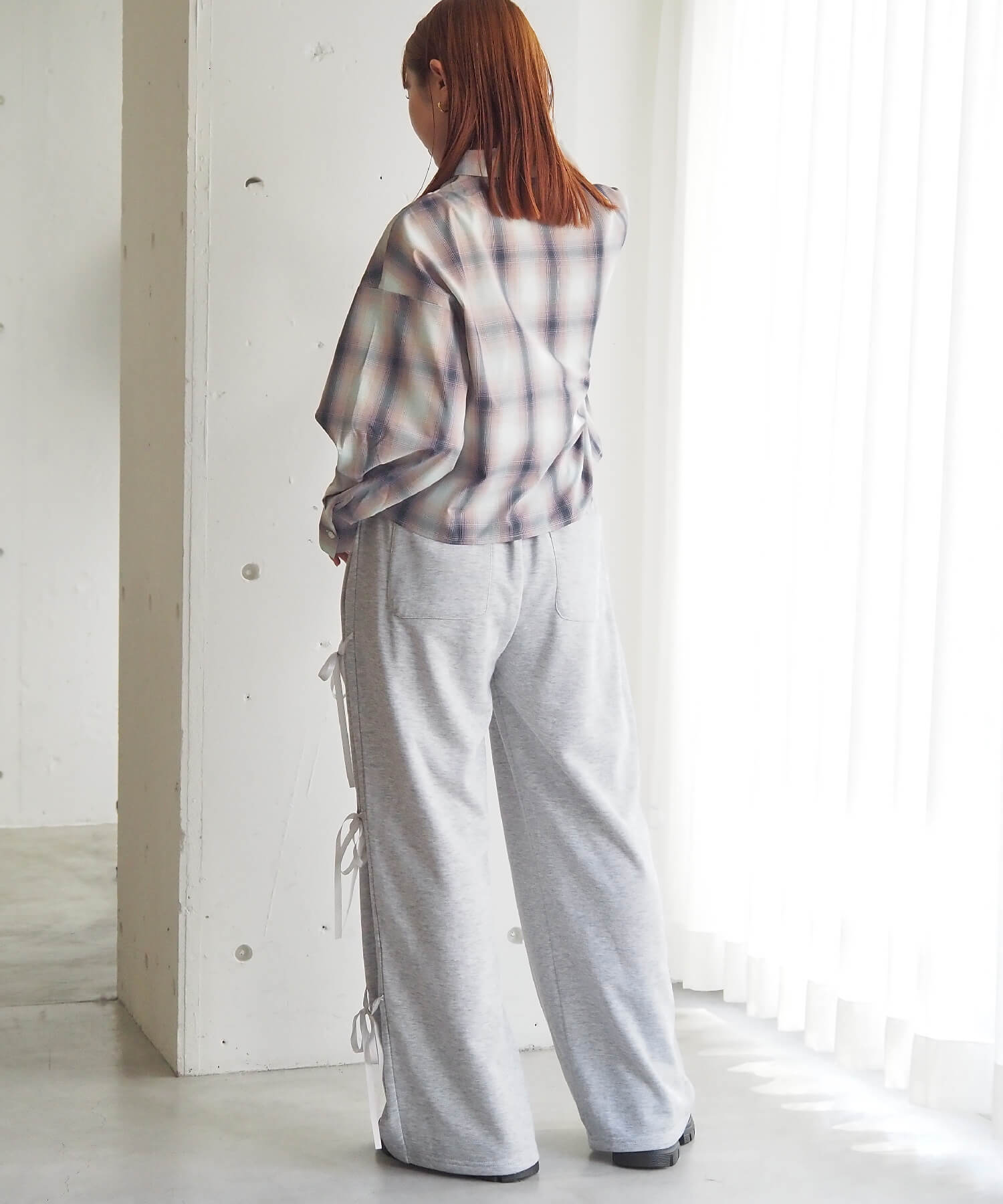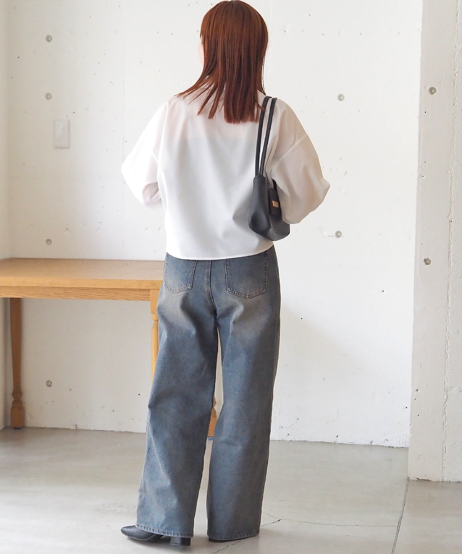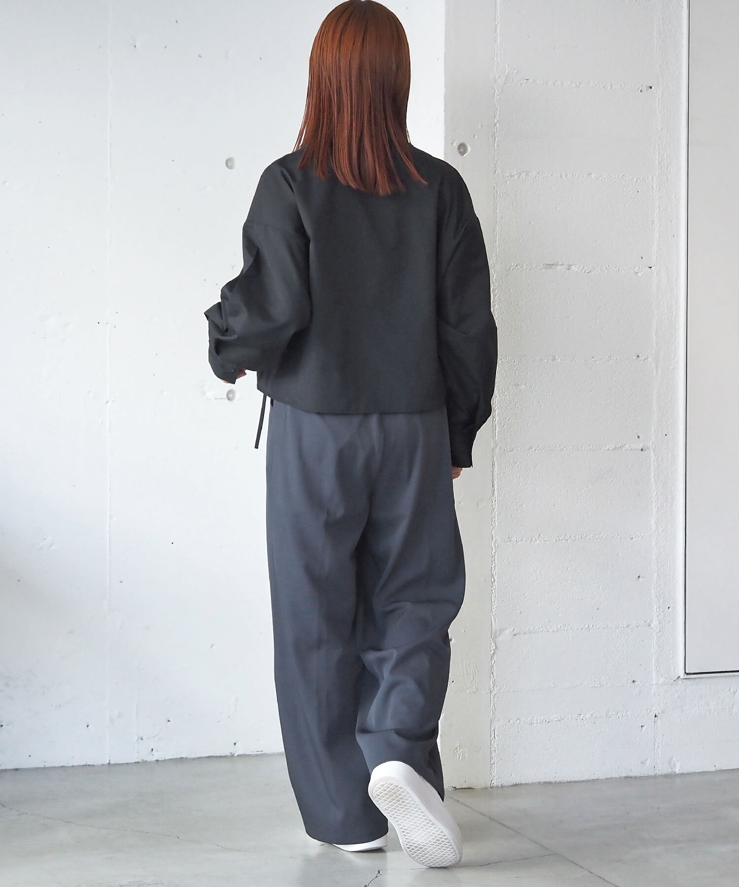 ・トレンドのワイドパンツもおすすめ。ウェストデザインが見えるよう裾のボタンを1.2個開けるとさらに重心が上がります。