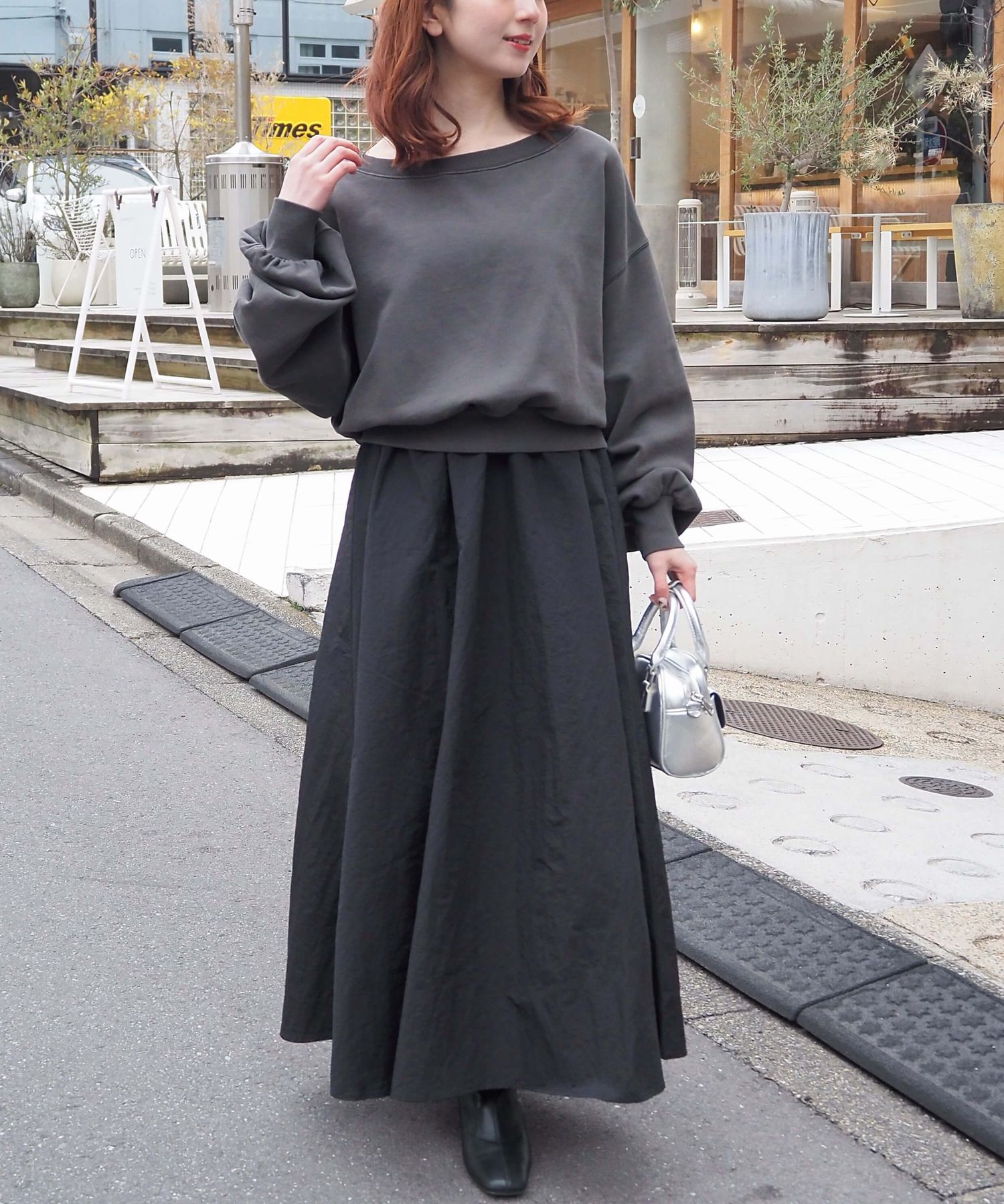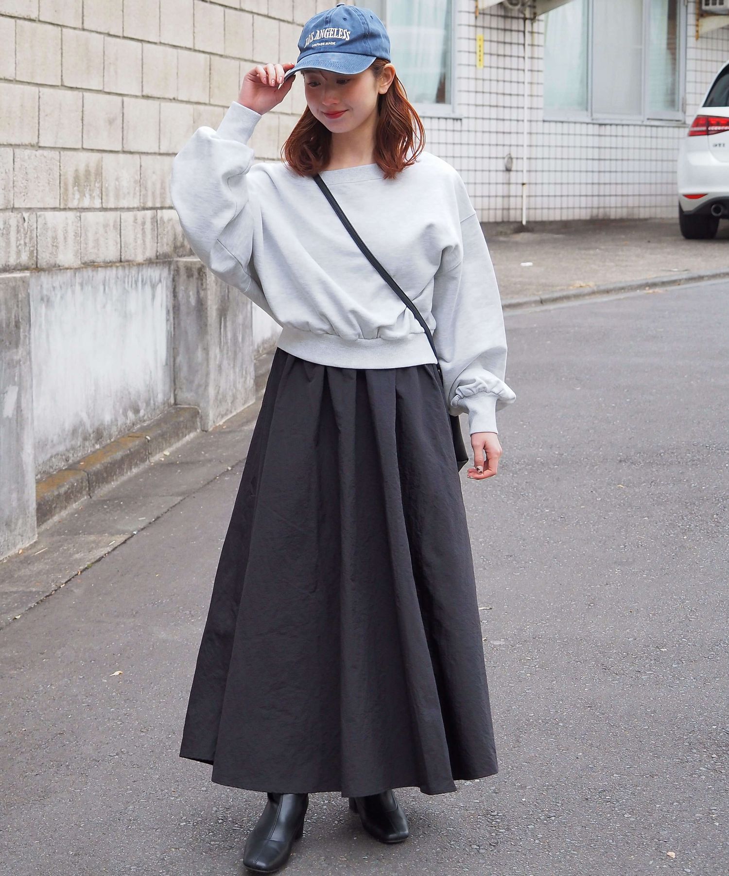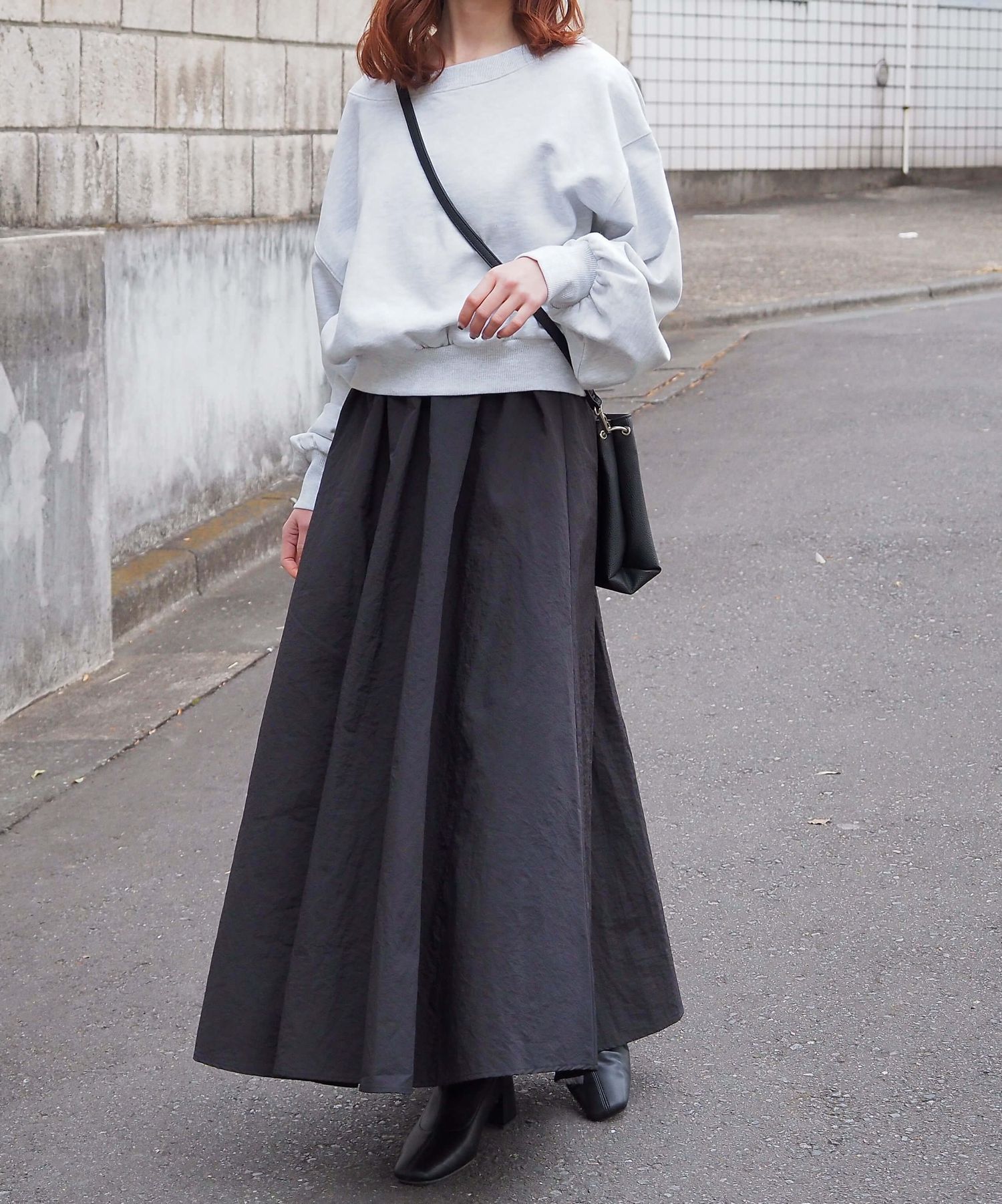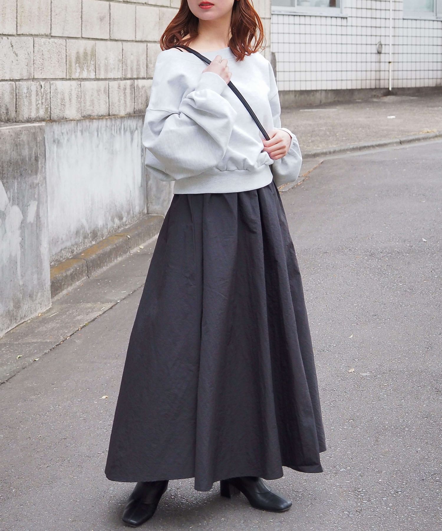 ・スカート部分は程よくカジュアル感も出る素材なので、幅広いシューズに馴染みます。ヒールやサンダルはもちろん、スニーカーでトレンドのスポーツミックスもおすすめです。