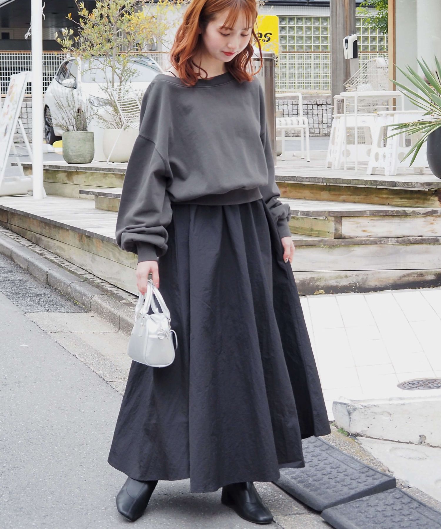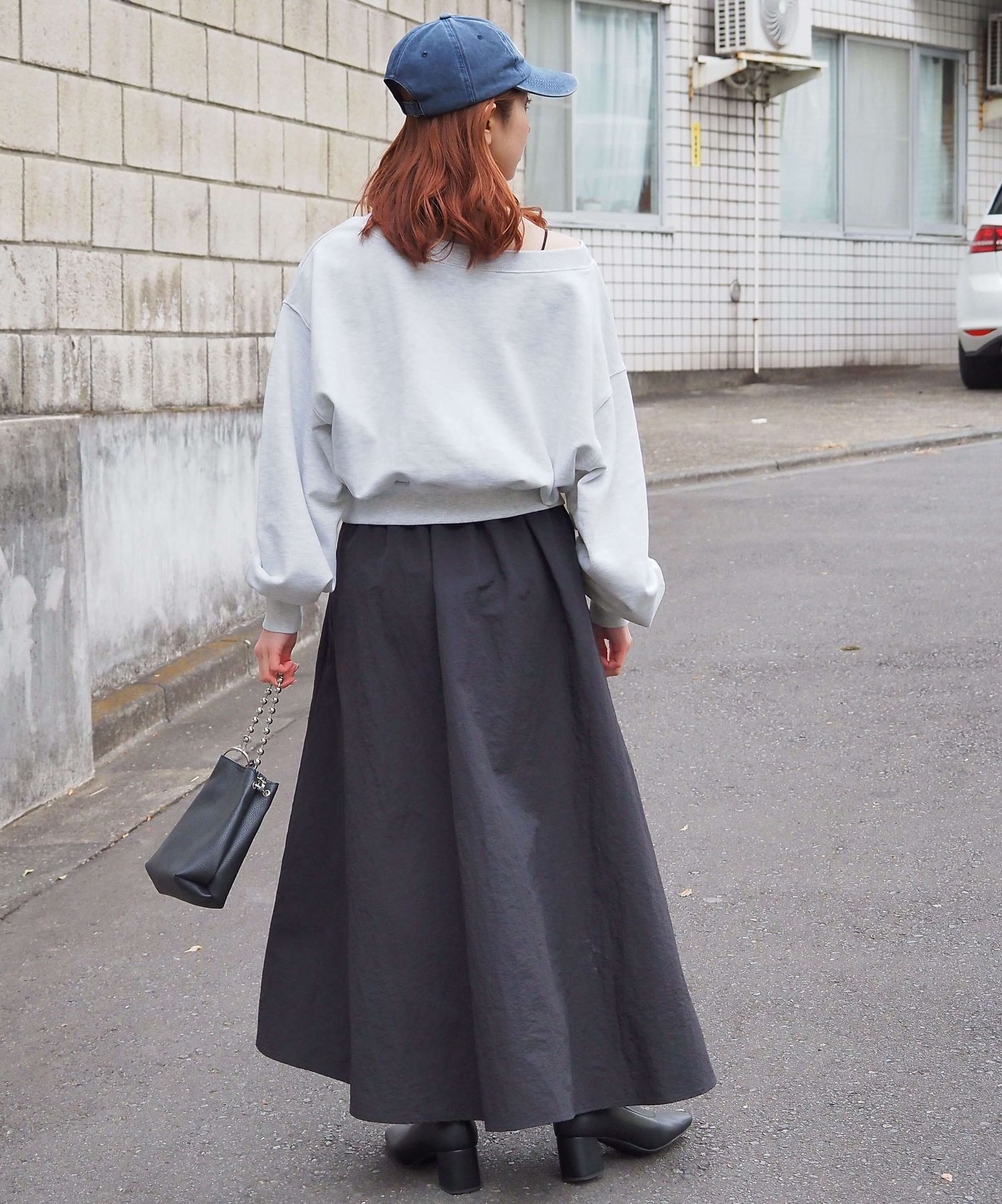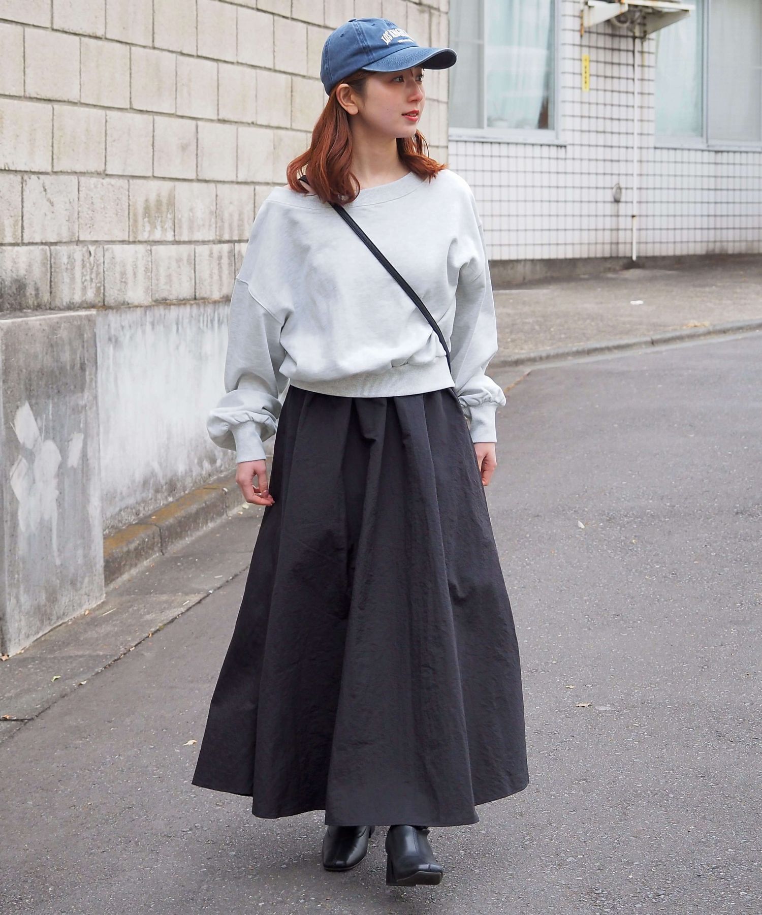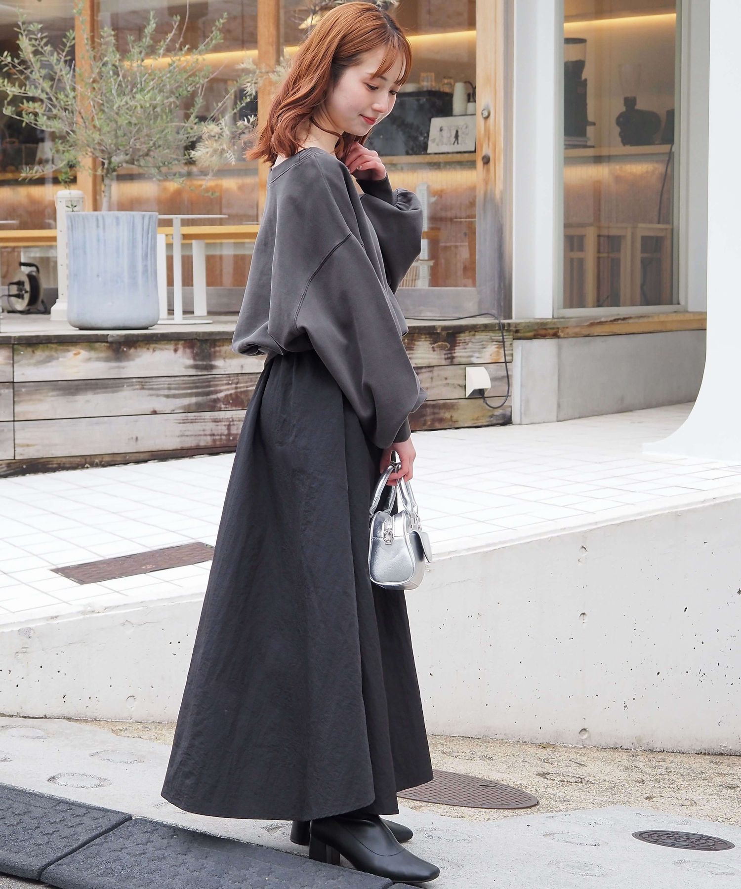 ・スカート部分は程よくカジュアル感も出る素材なので、幅広いシューズに馴染みます。ヒールやサンダルはもちろん、スニーカーでトレンドのスポーツミックスもおすすめです。