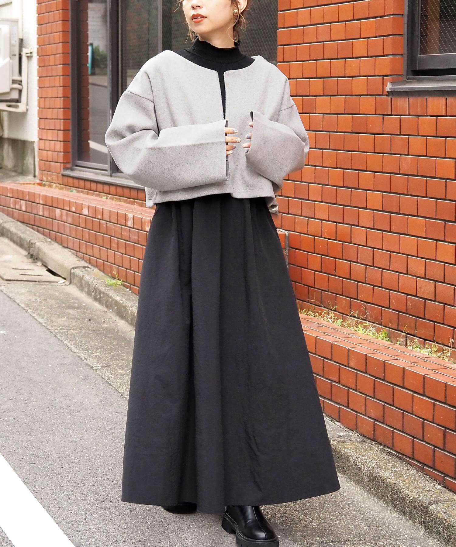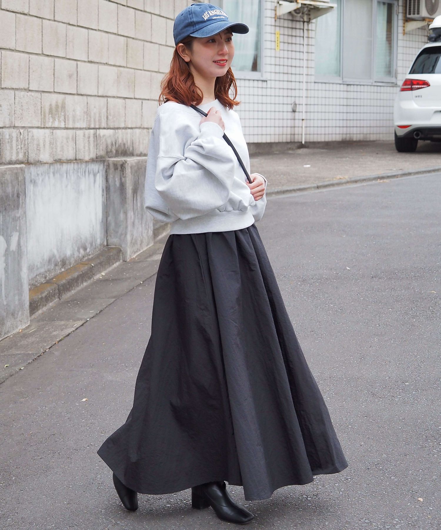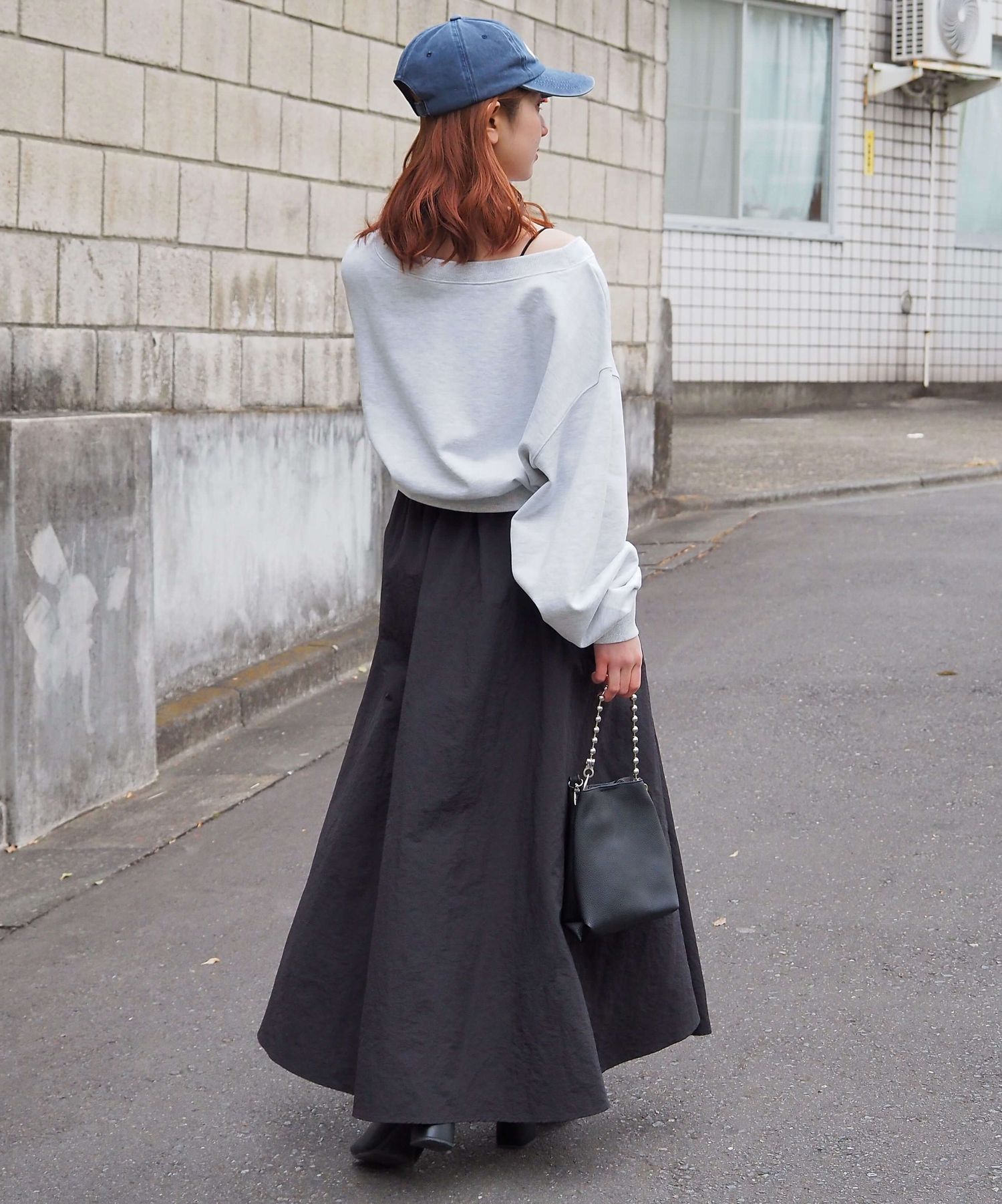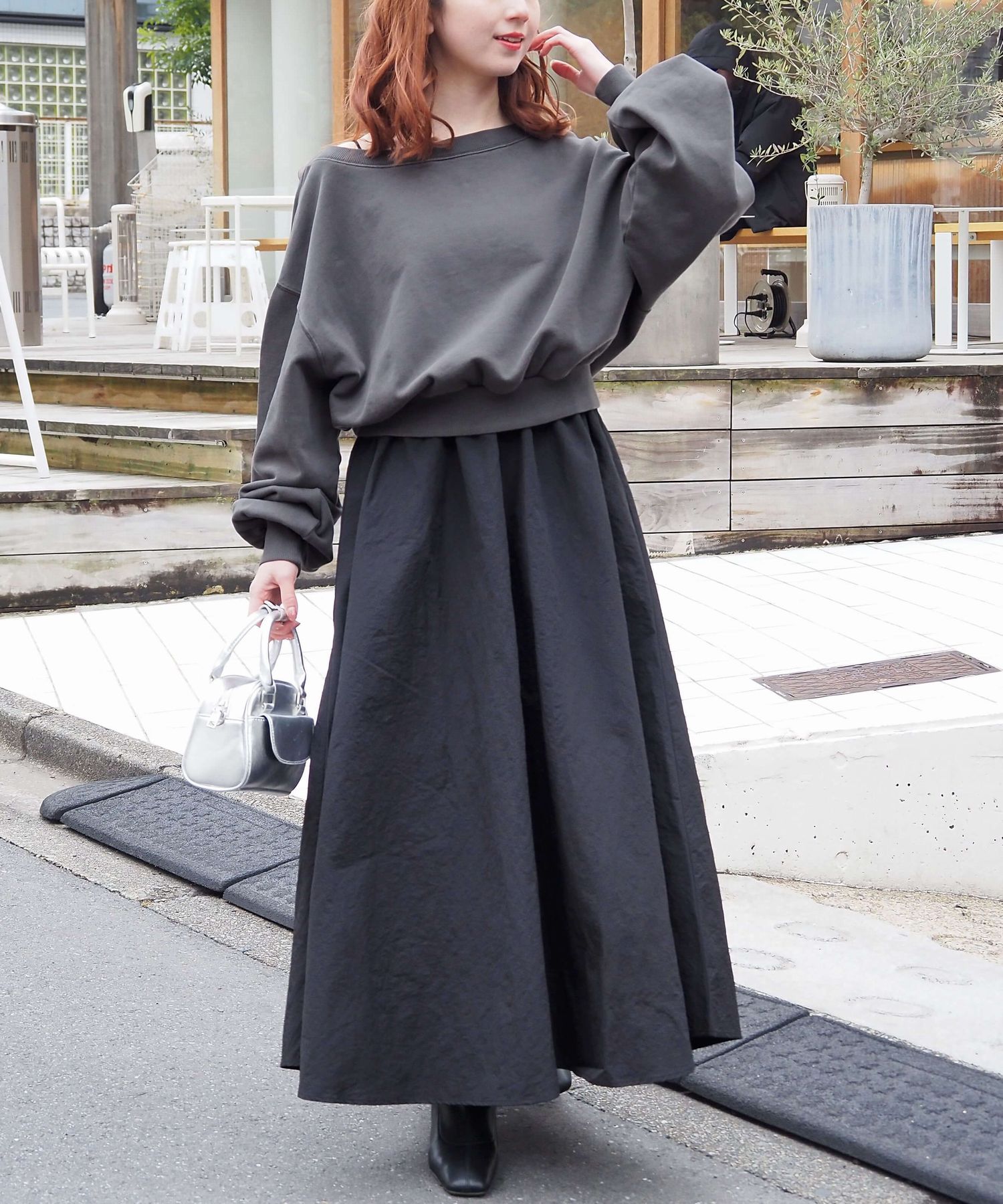 ・スカート部分は程よくカジュアル感も出る素材なので、幅広いシューズに馴染みます。ヒールやサンダルはもちろん、スニーカーでトレンドのスポーツミックスもおすすめです。