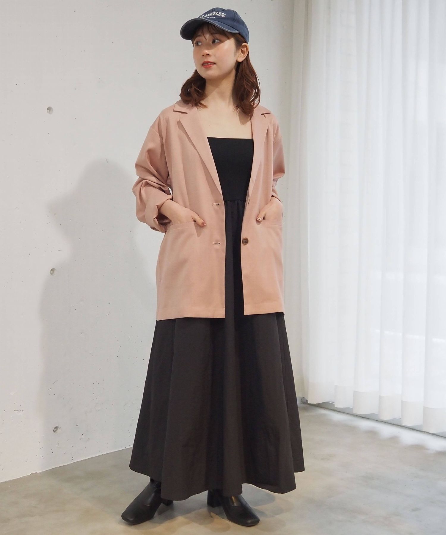 ・キャミワンピースは1枚でも着用しやすいテレコ素材なので、ジャケットやカーディガンなどを羽織るとグッと上品なコーディネートに。