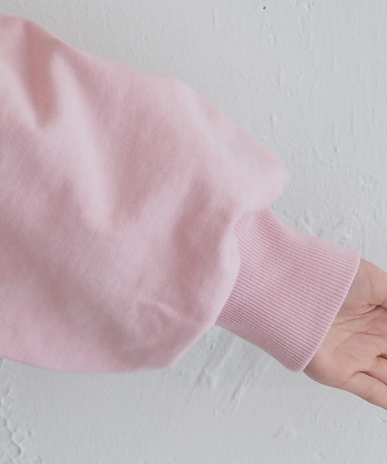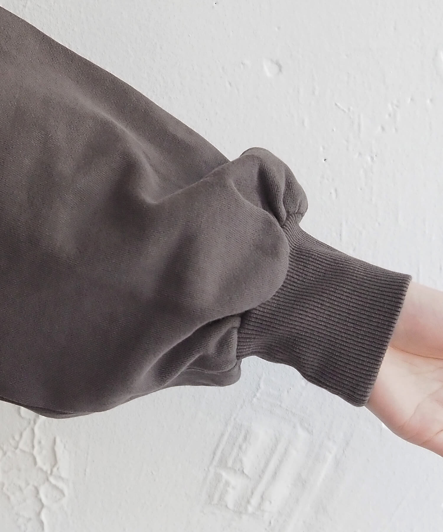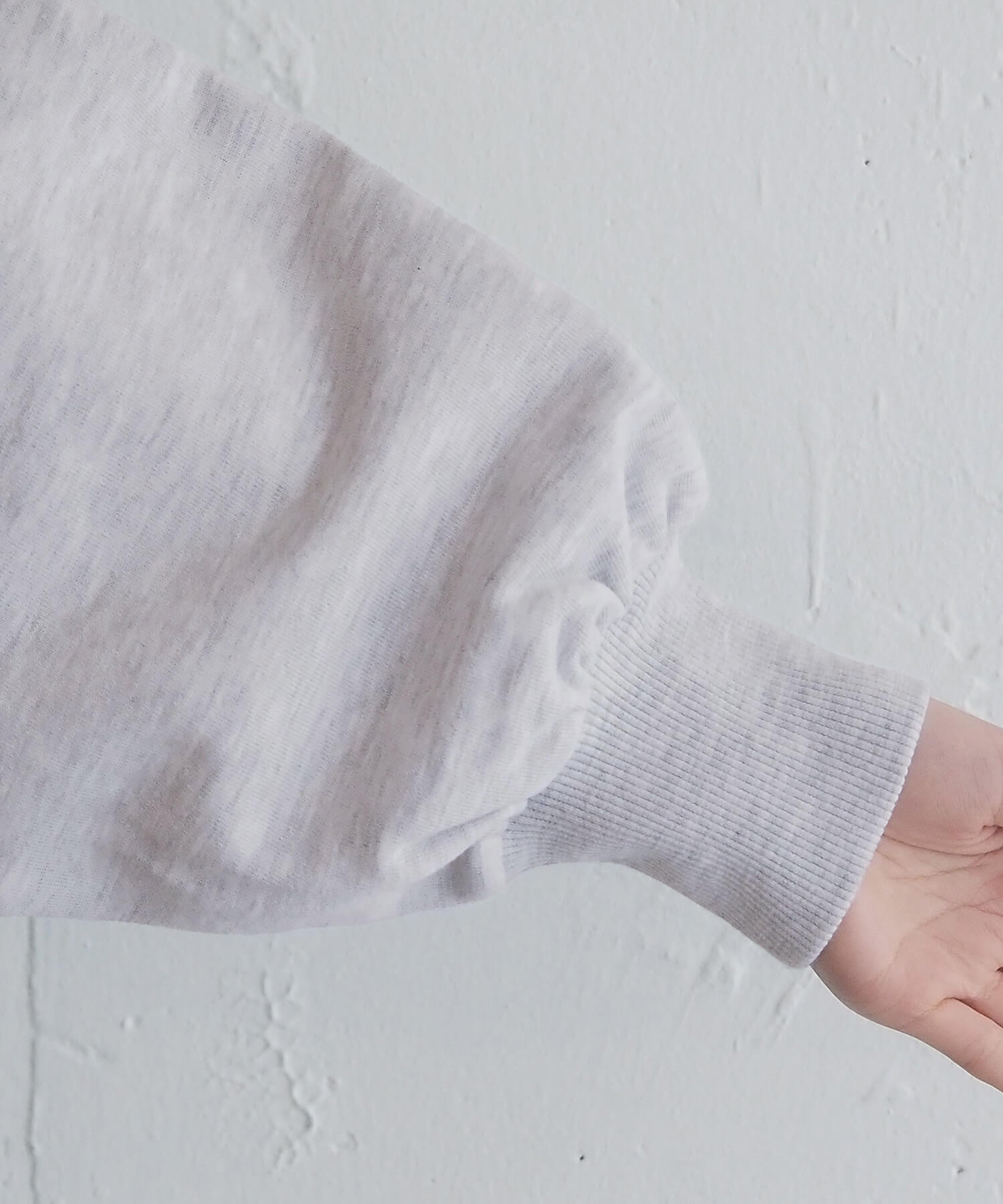 ・裏毛素材で着心地の良いスウェットは、ショート丈のコンパクトさとボリューム袖がポイント。裾のリブ編みを効かせ、スウェットらしい立体感をつくりました。