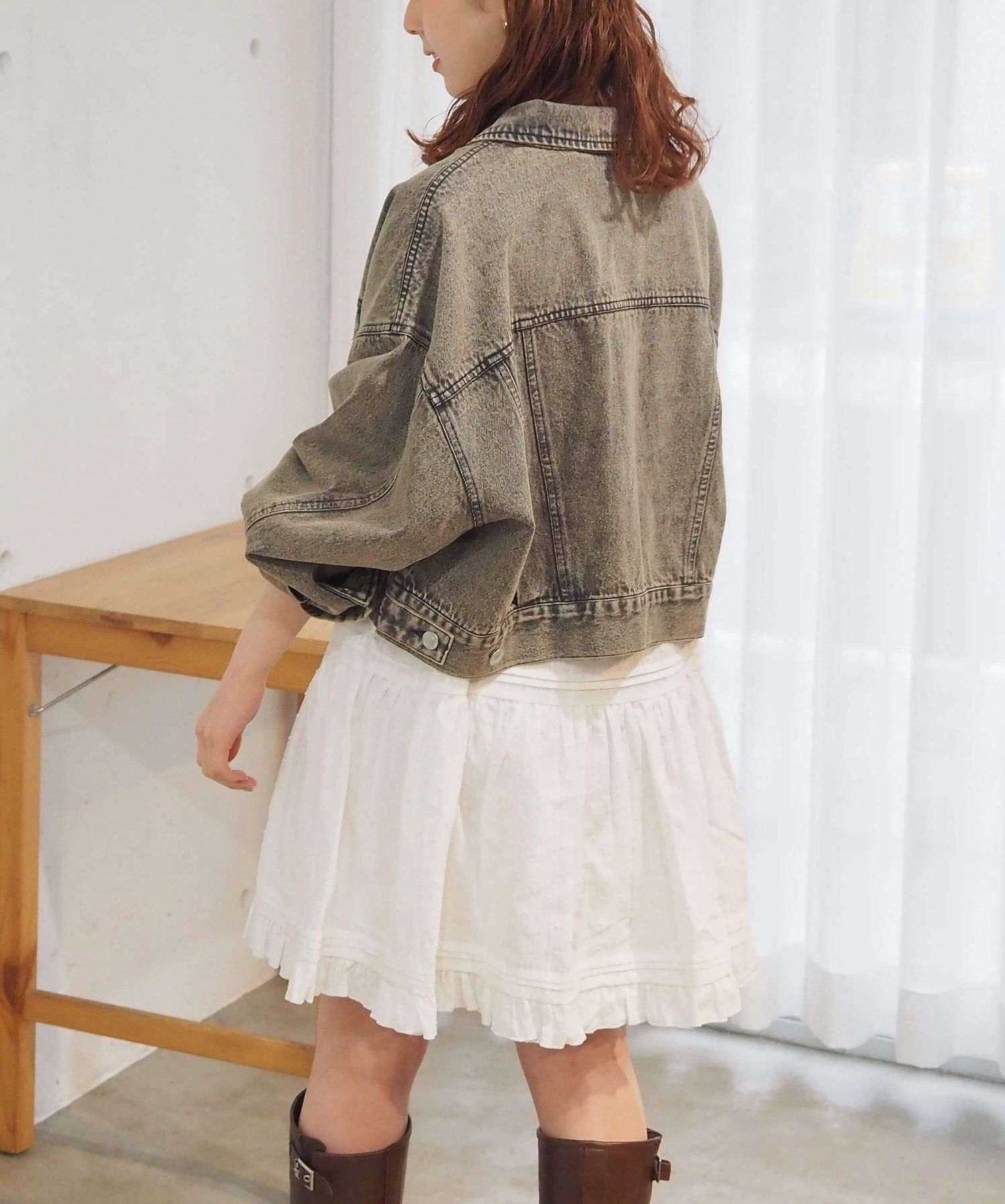 ・広がりすぎないフレアシルエットなので、ボトムスをプラスすると旬のレイヤードコーデに。