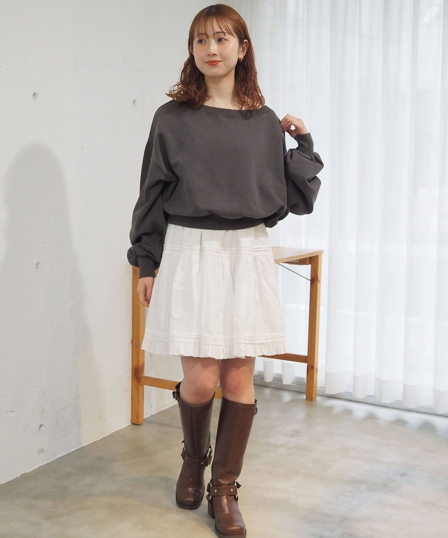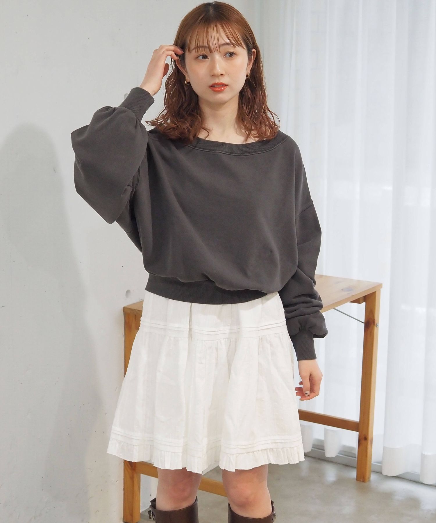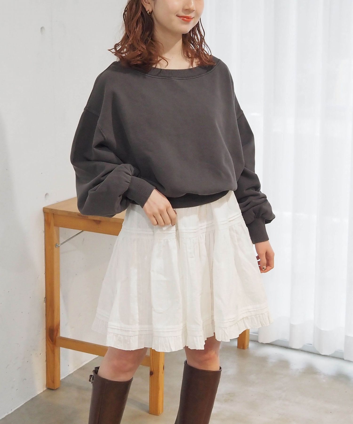 ・スウェットやニットプルオーバーの下に着て、スカートとしての着こなしもおすすめです。