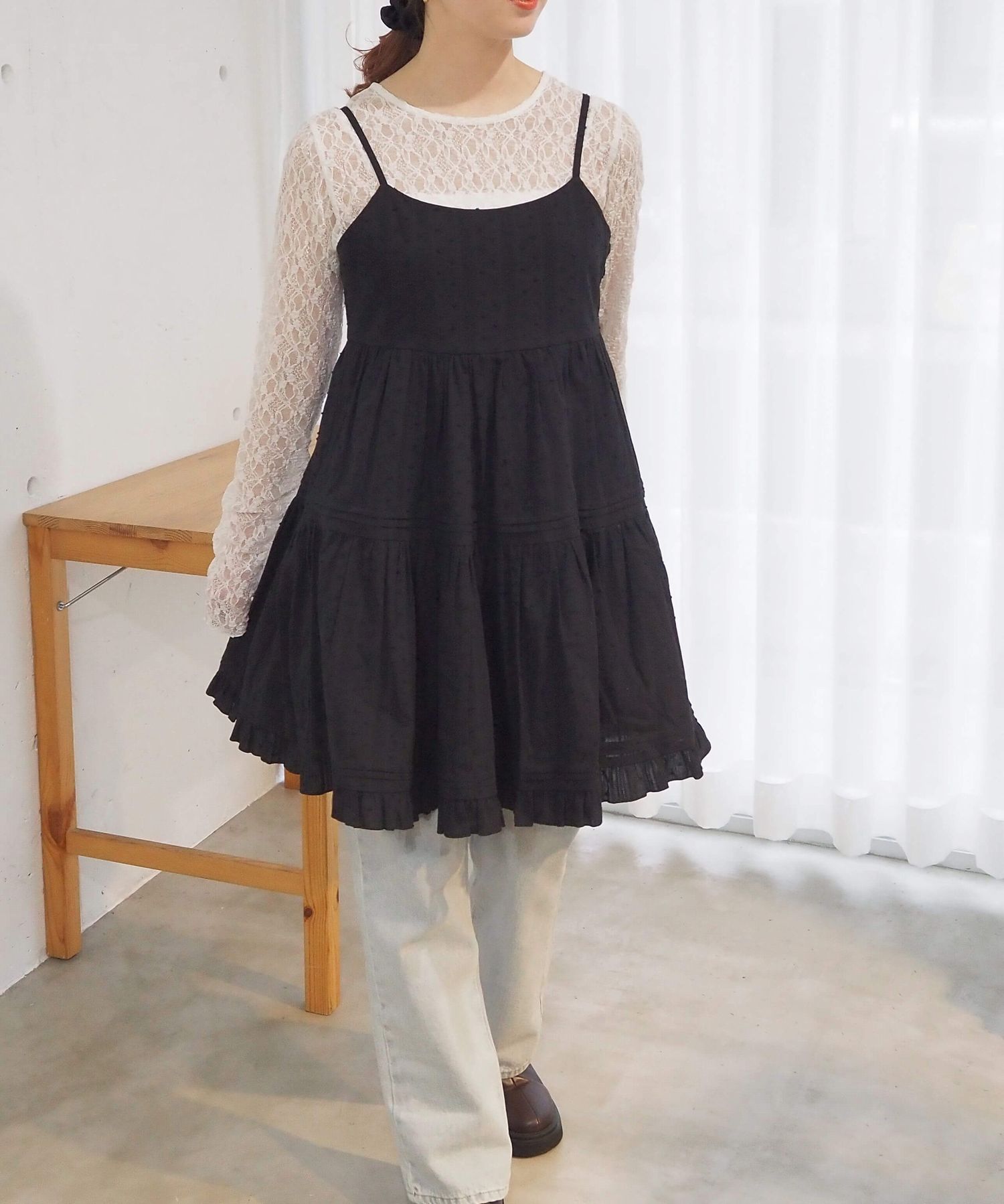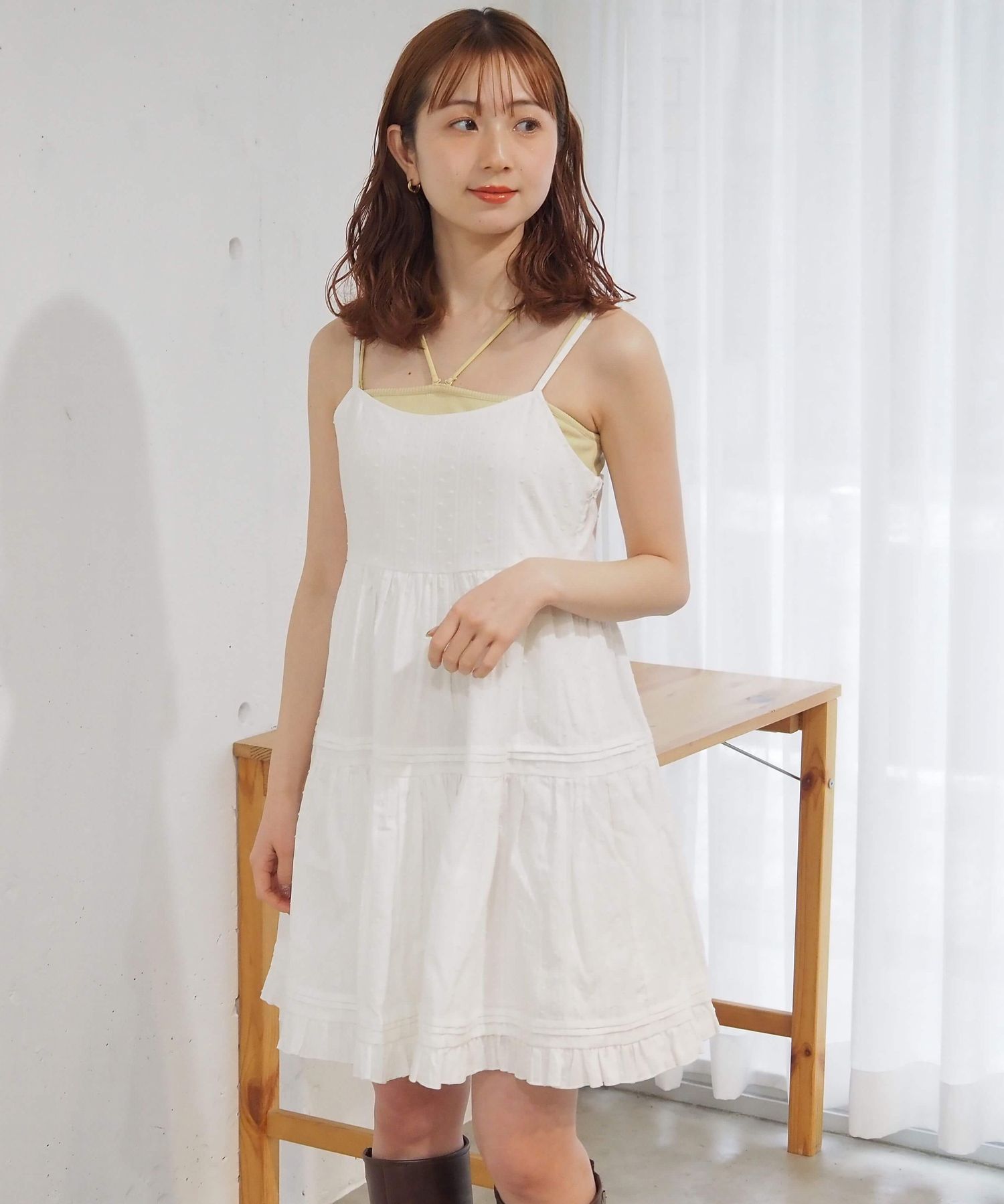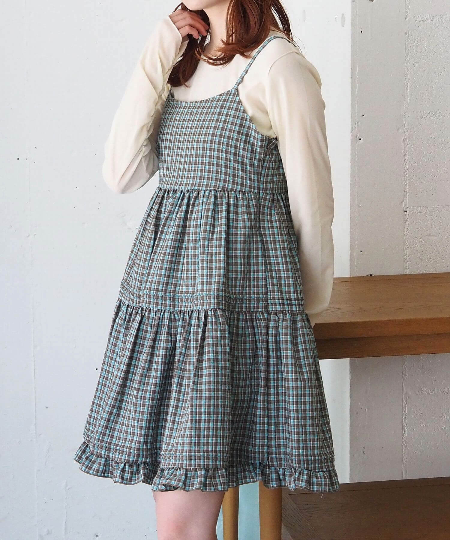 ・タック×フリルが女性らしいミニ丈のキャミソールワンピース。