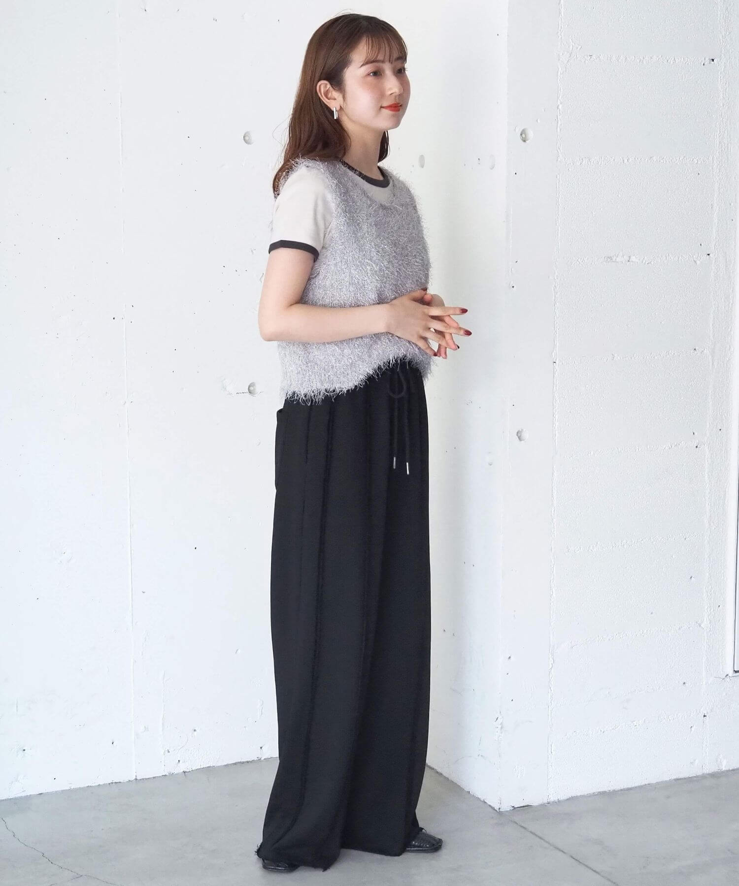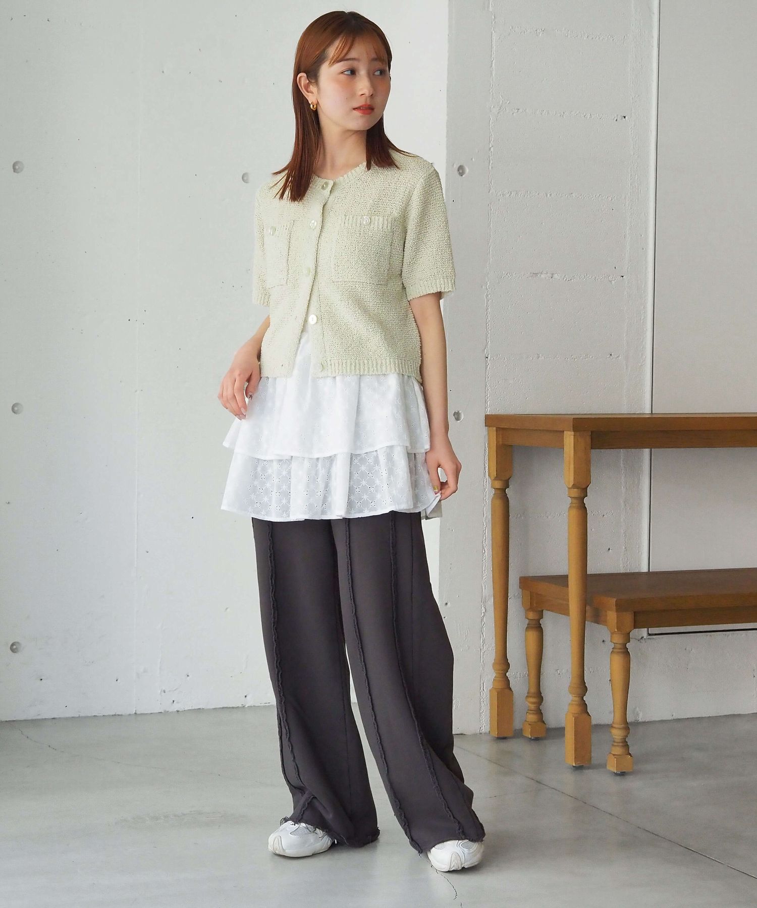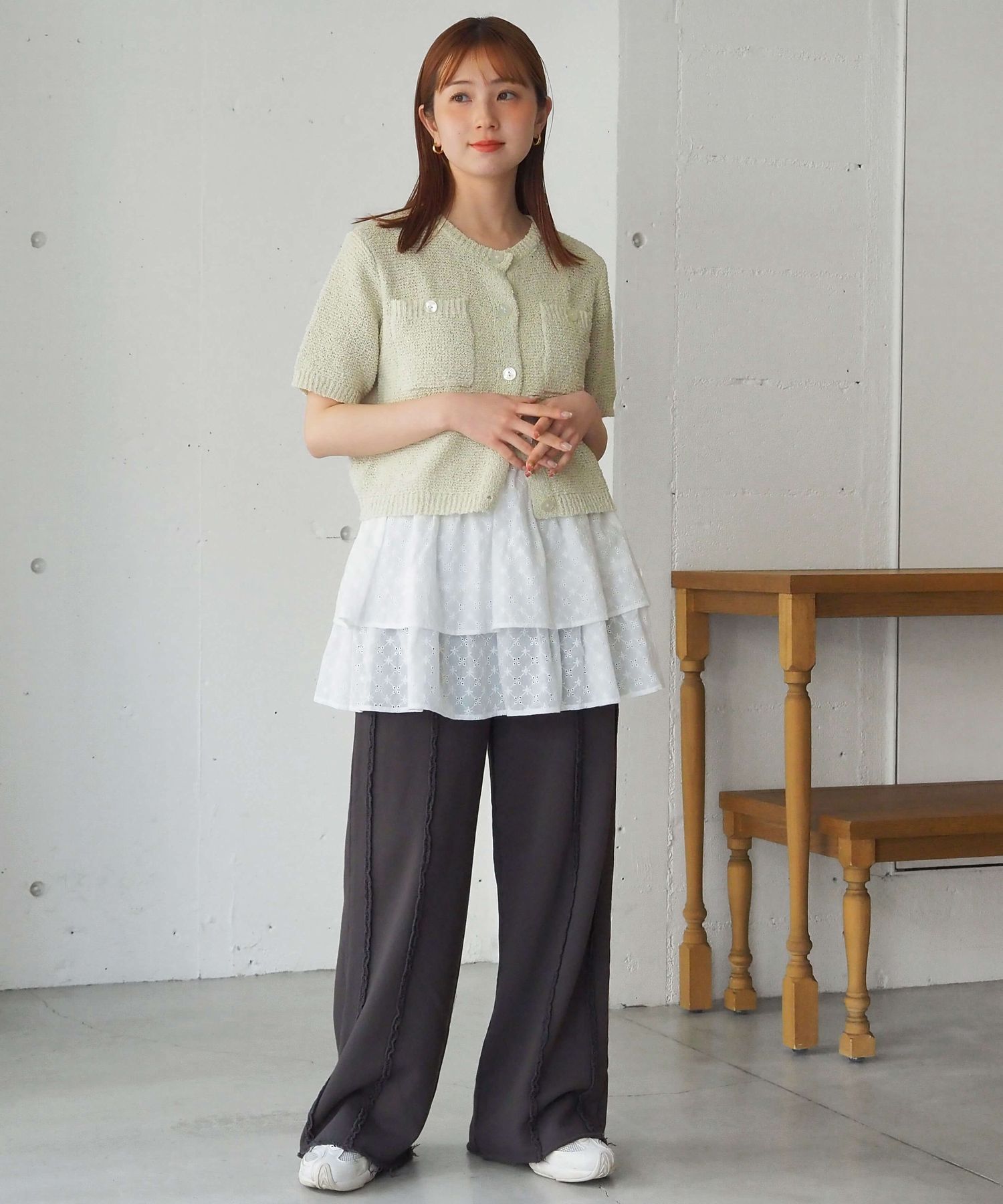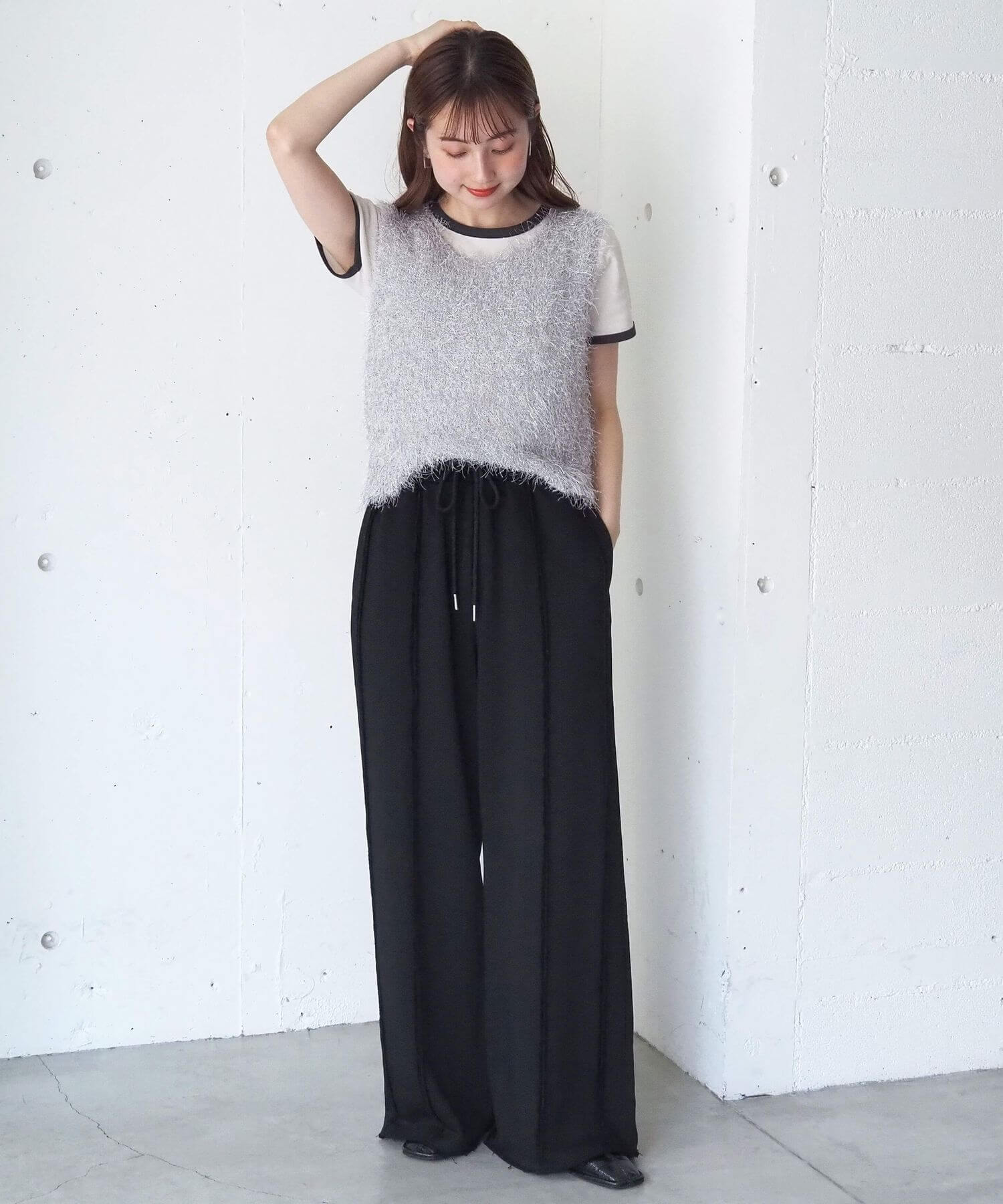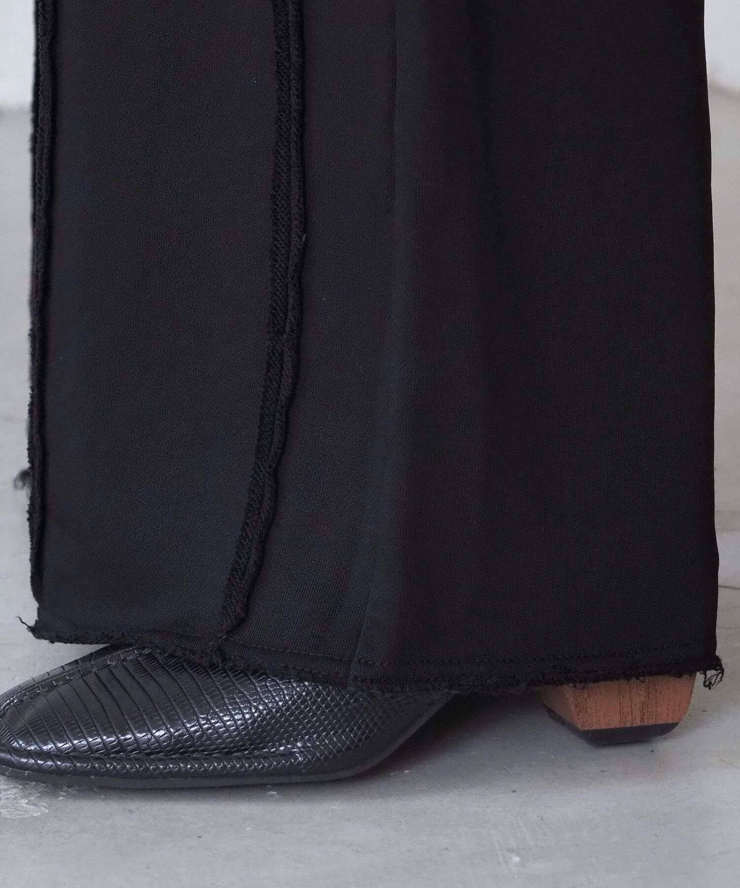 ・デザイン性はもちろん、脚長効果も狙えるリメイク風の裁ち切りラインがポイント。