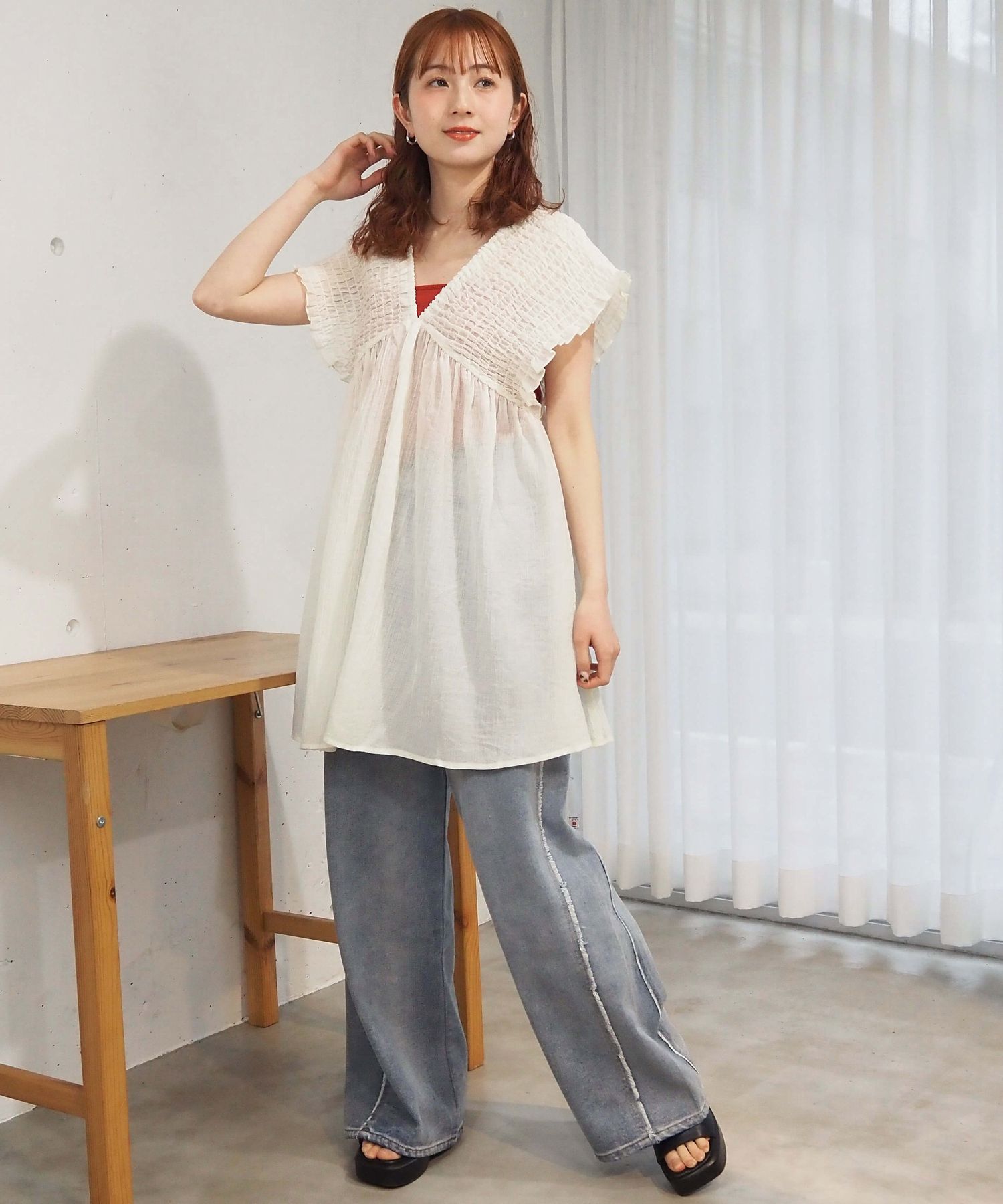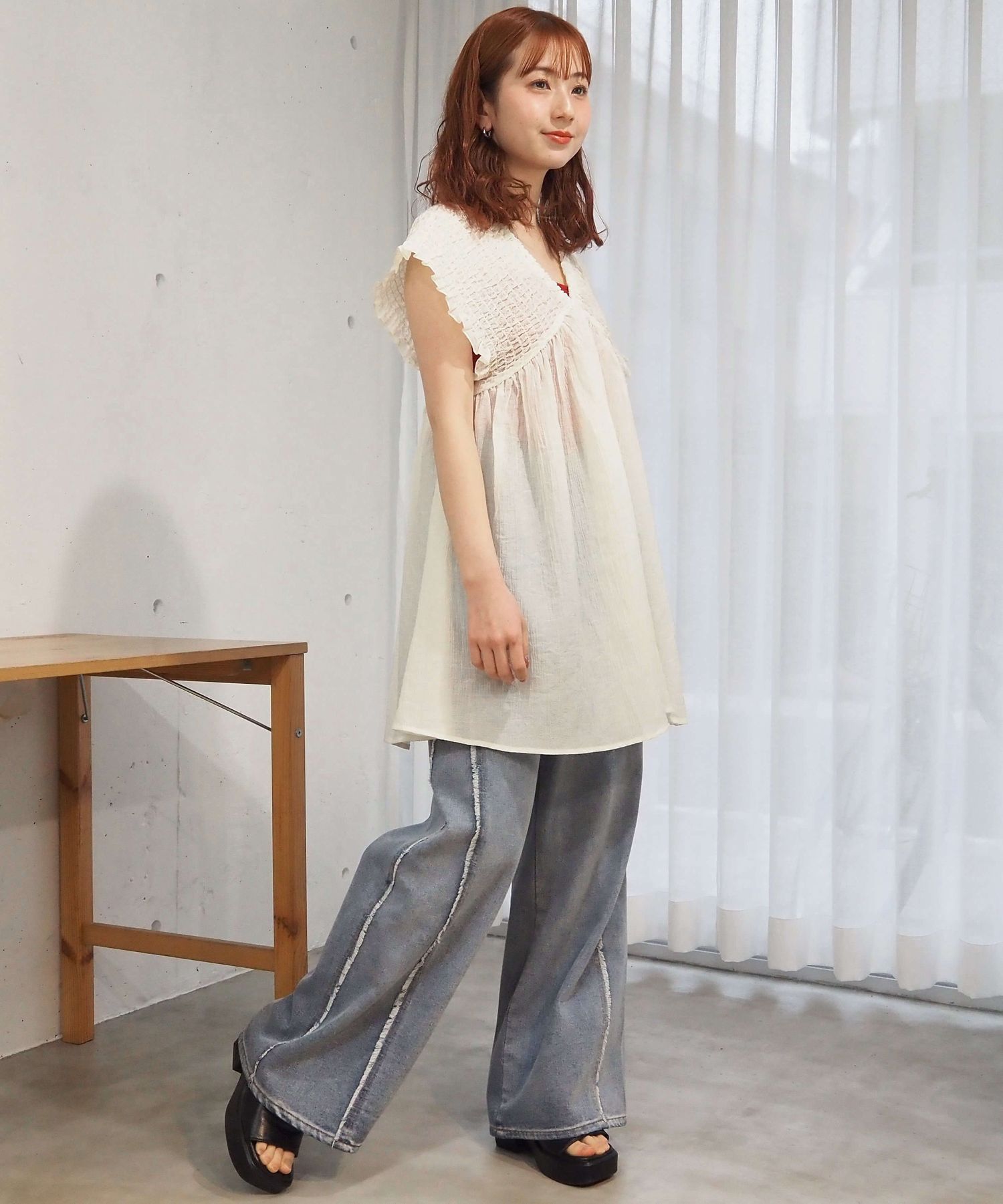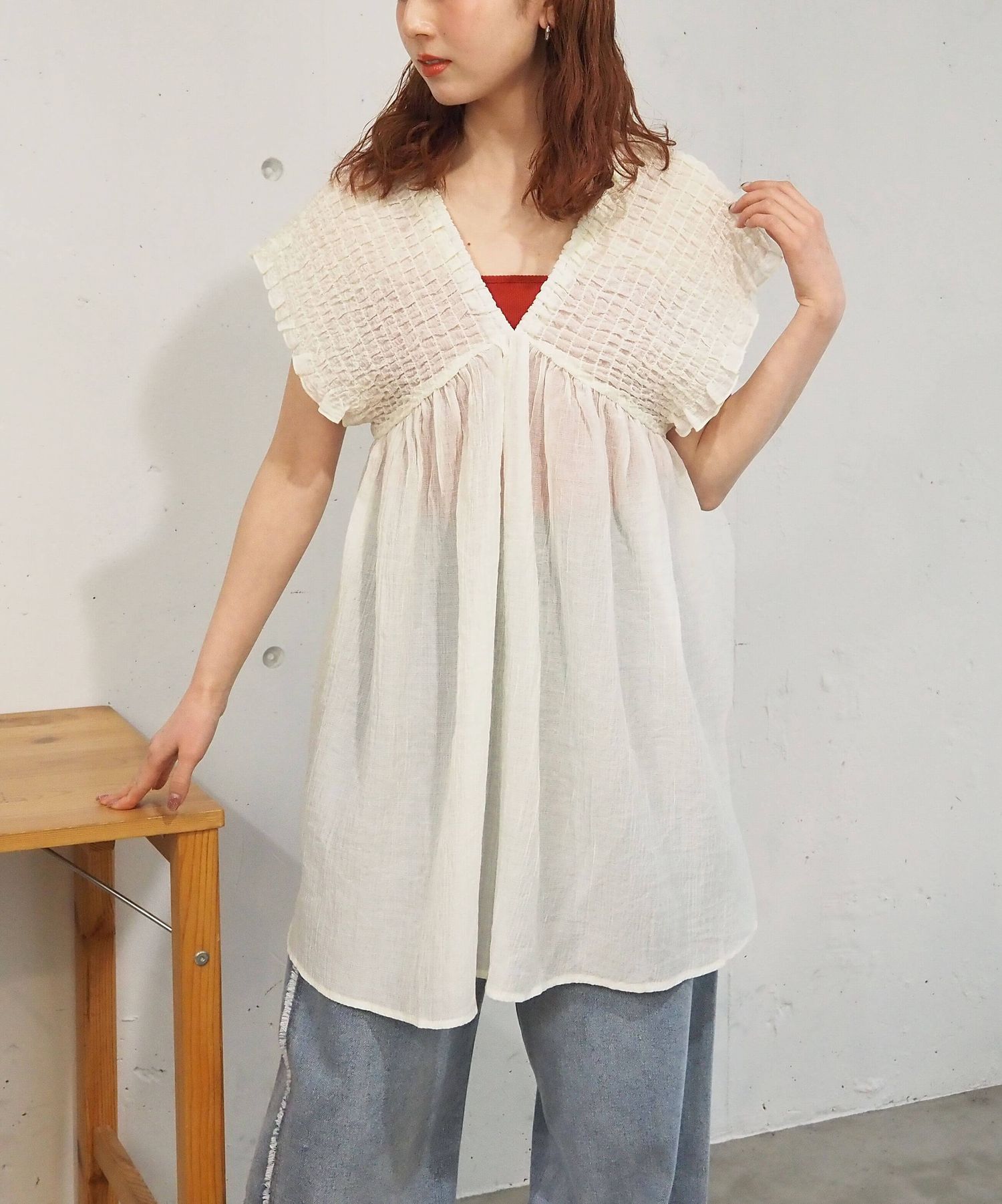 ・カラーインナーで透け感がヘルシーなカジュアルコーデに。