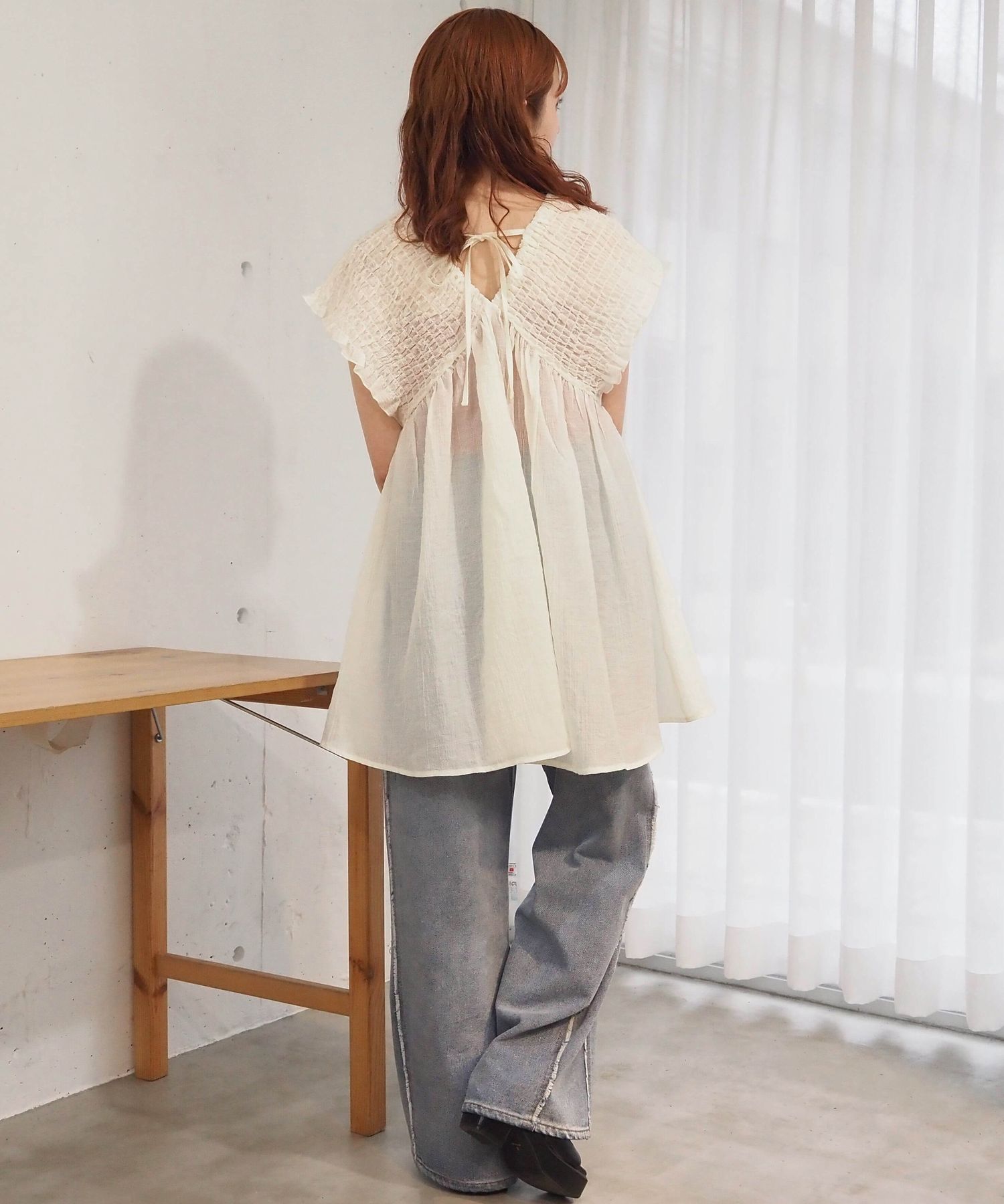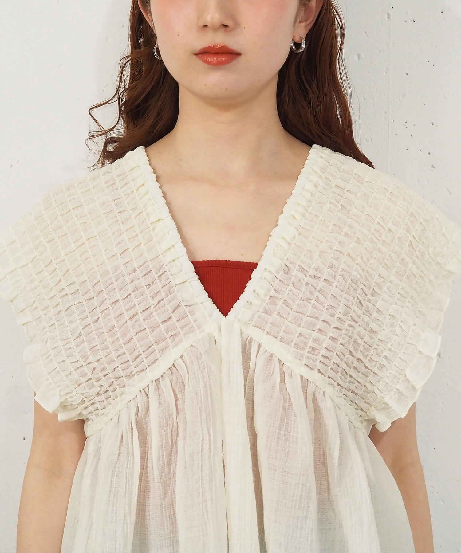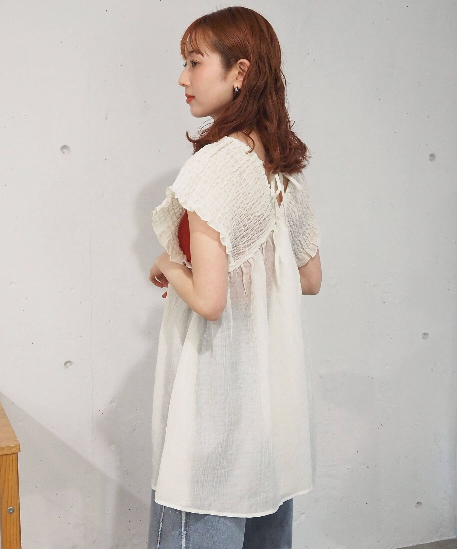 ・カラーインナーで透け感がヘルシーなカジュアルコーデに。