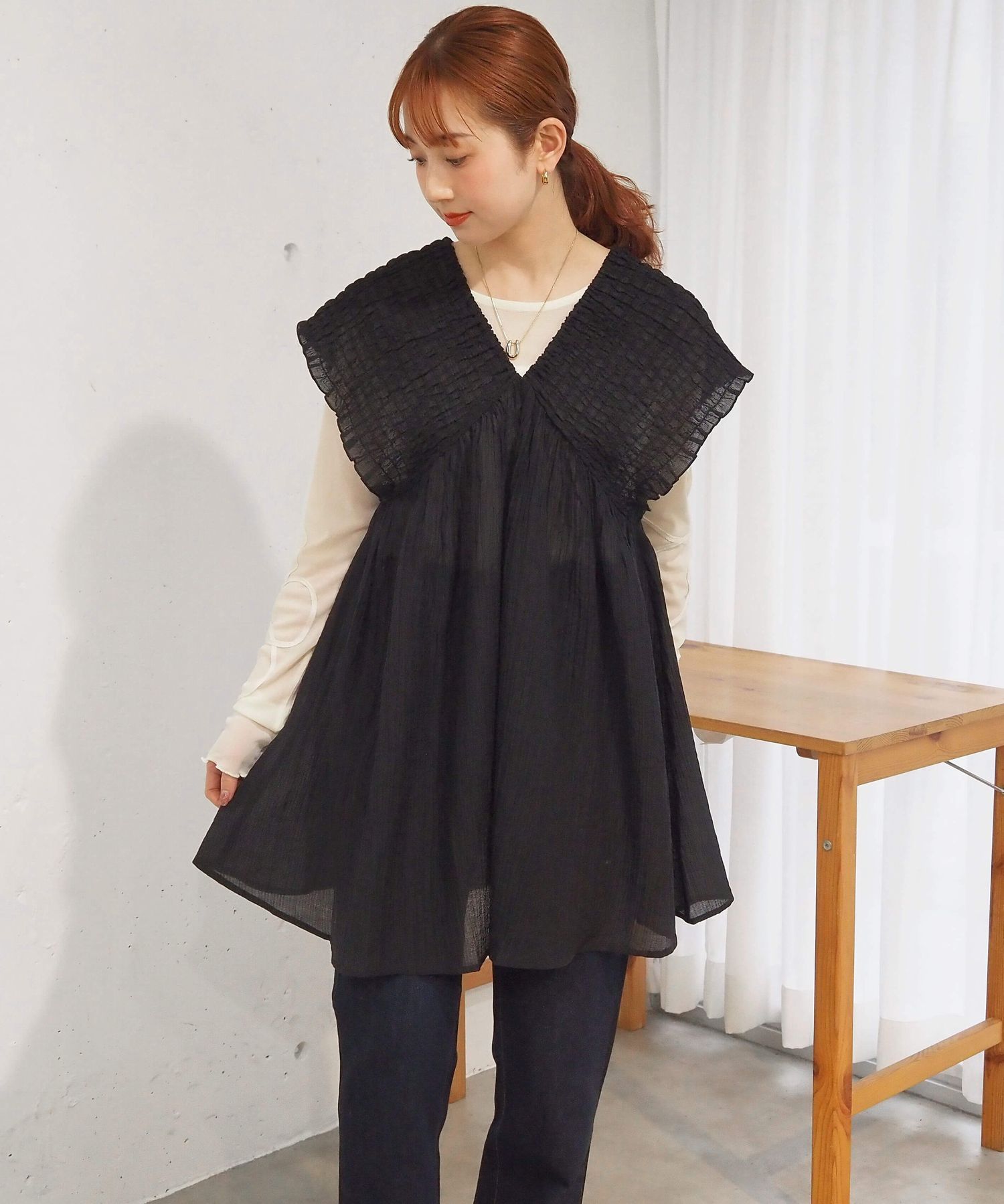 ・ロンTやハイネックトップスとのレイヤードで秋冬も活躍します。