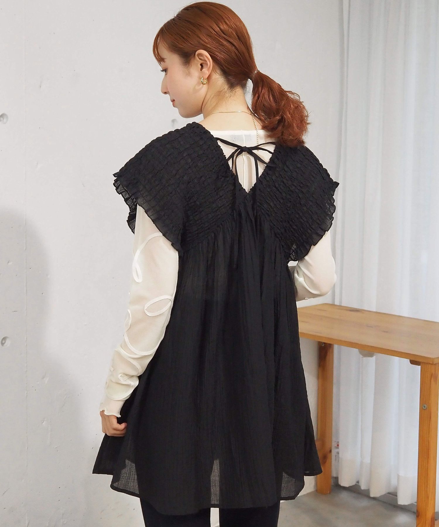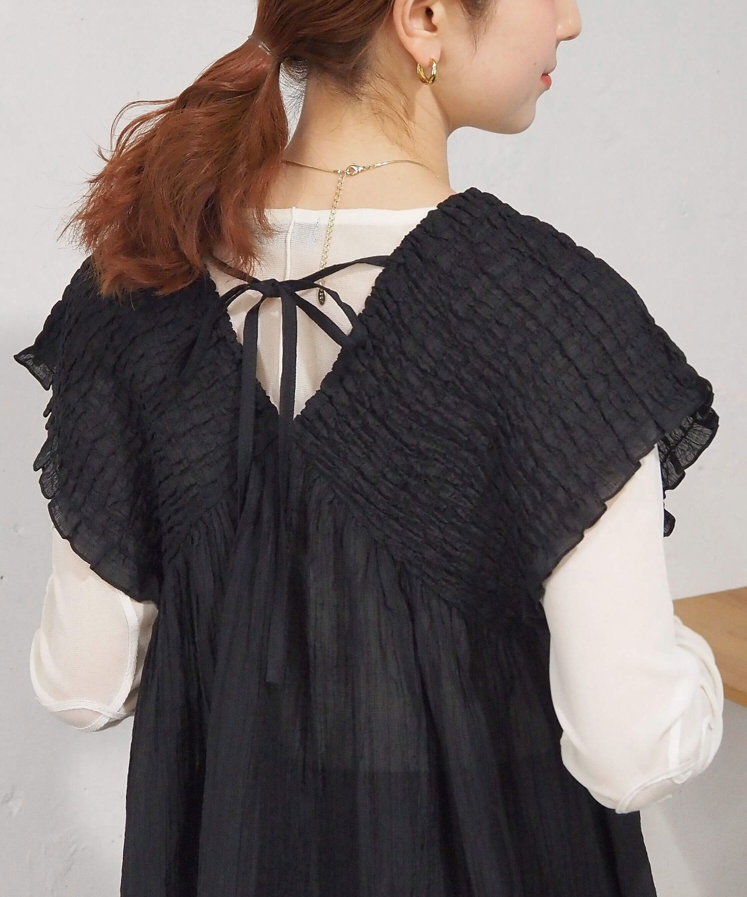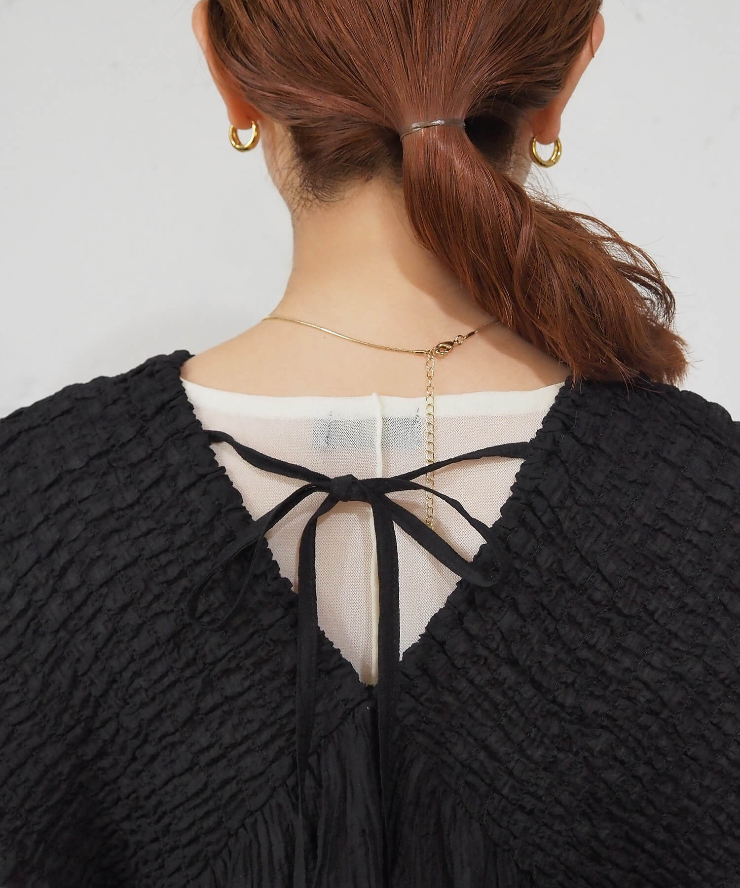 ・襟元は前後Vネックですっきりと仕上げつつ、アクセントのバックリボンがさりげなく女性らしさを演出。