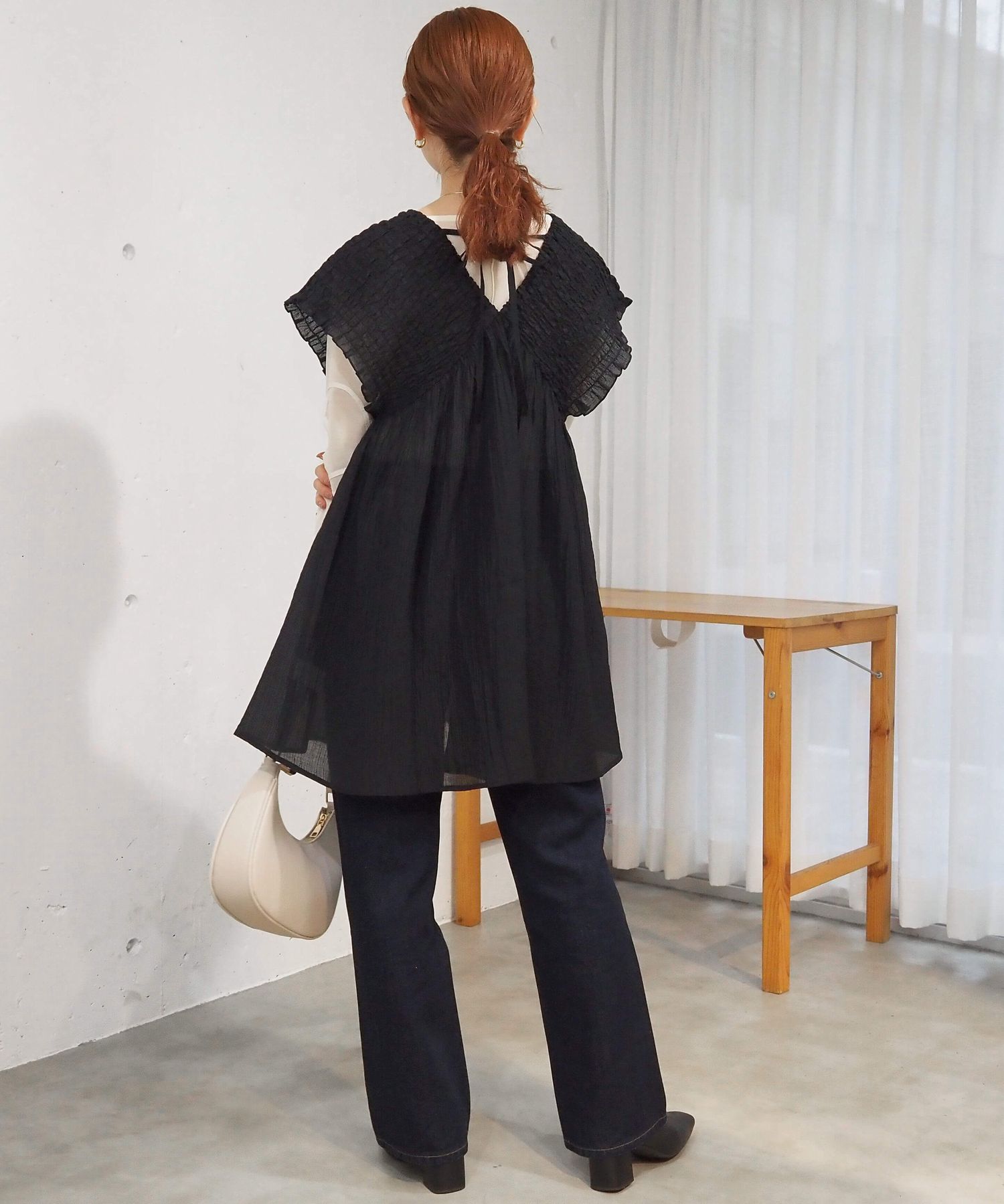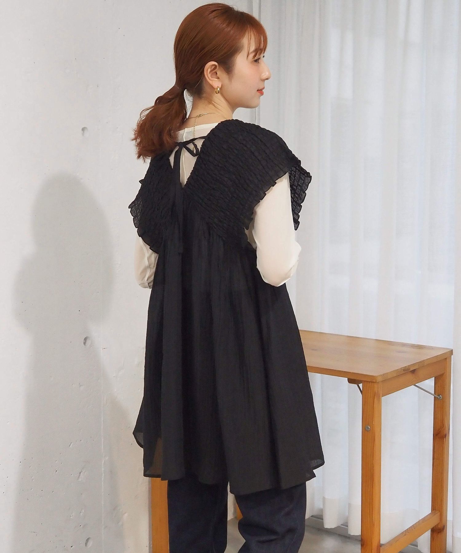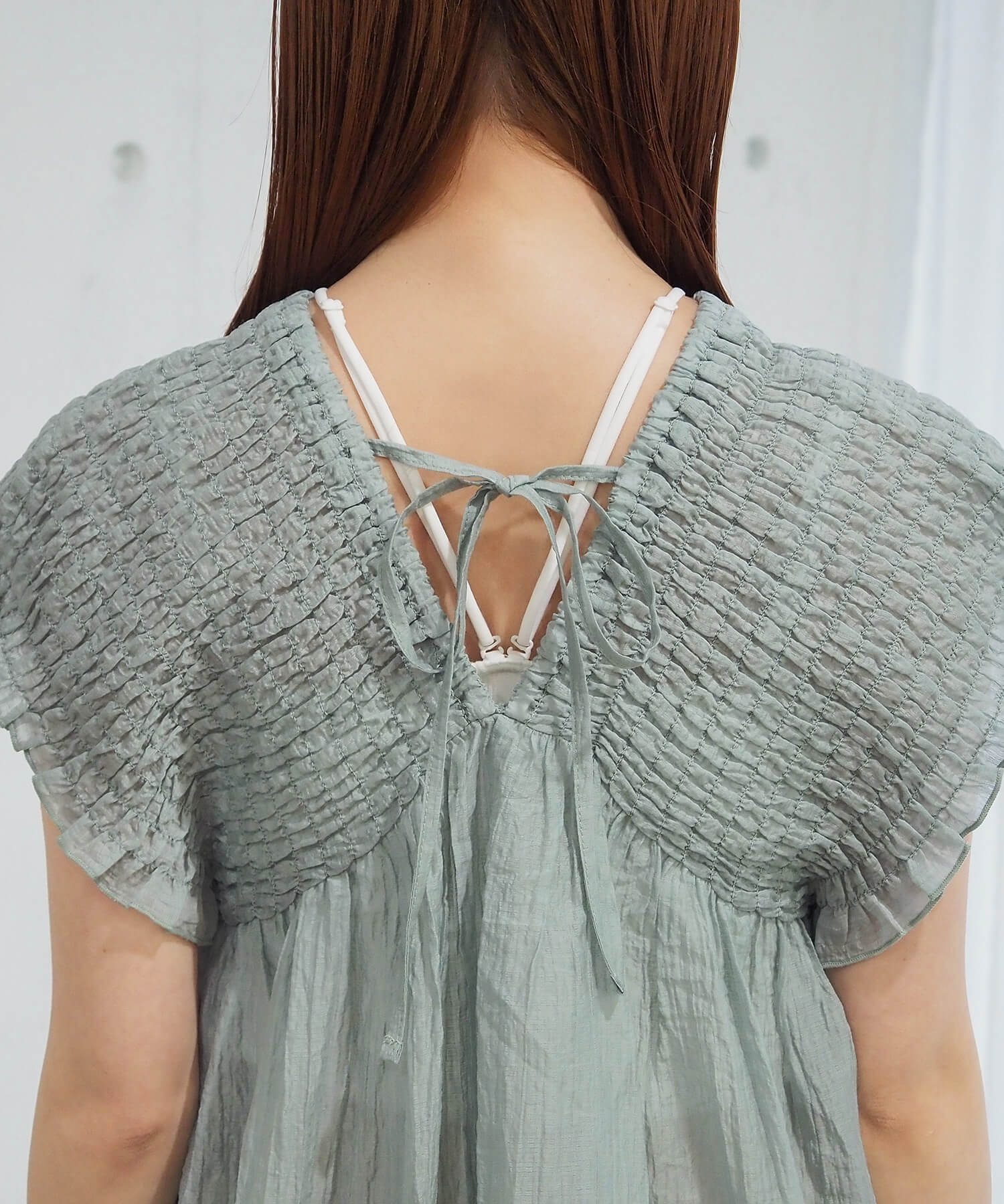 ・襟元は前後Vネックですっきりと仕上げつつ、アクセントのバックリボンがさりげなく女性らしさを演出。