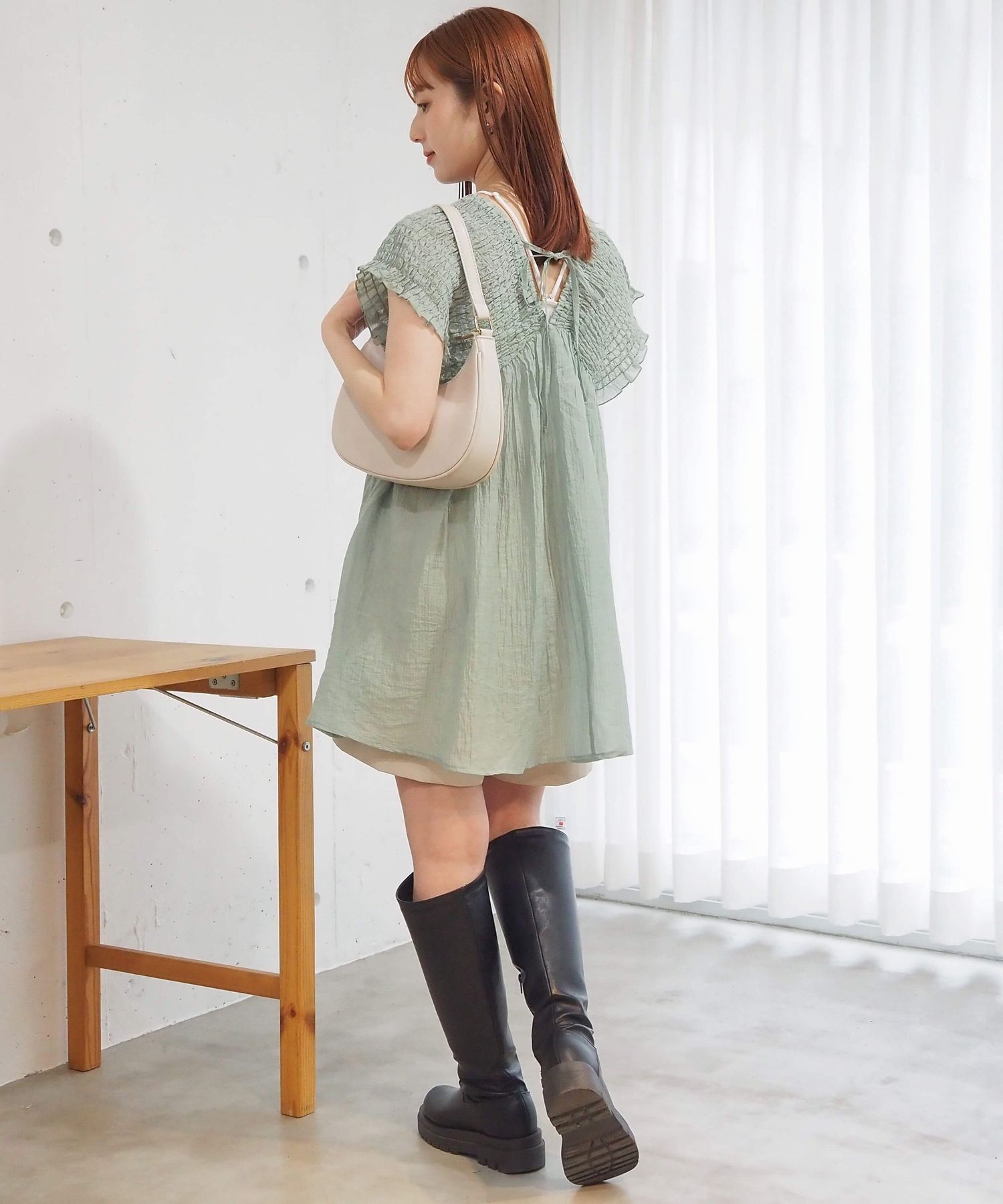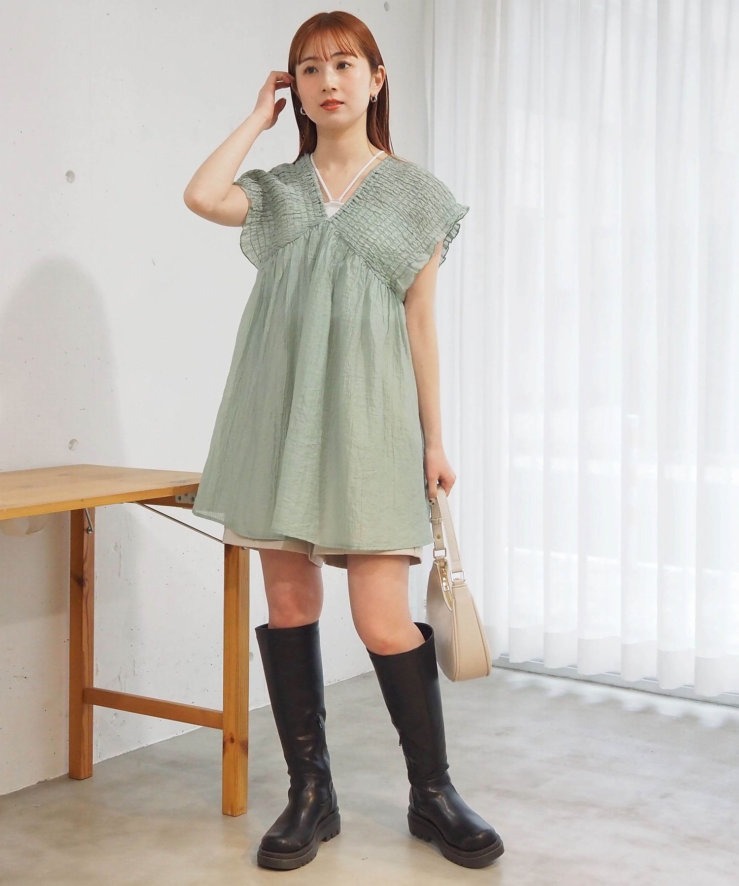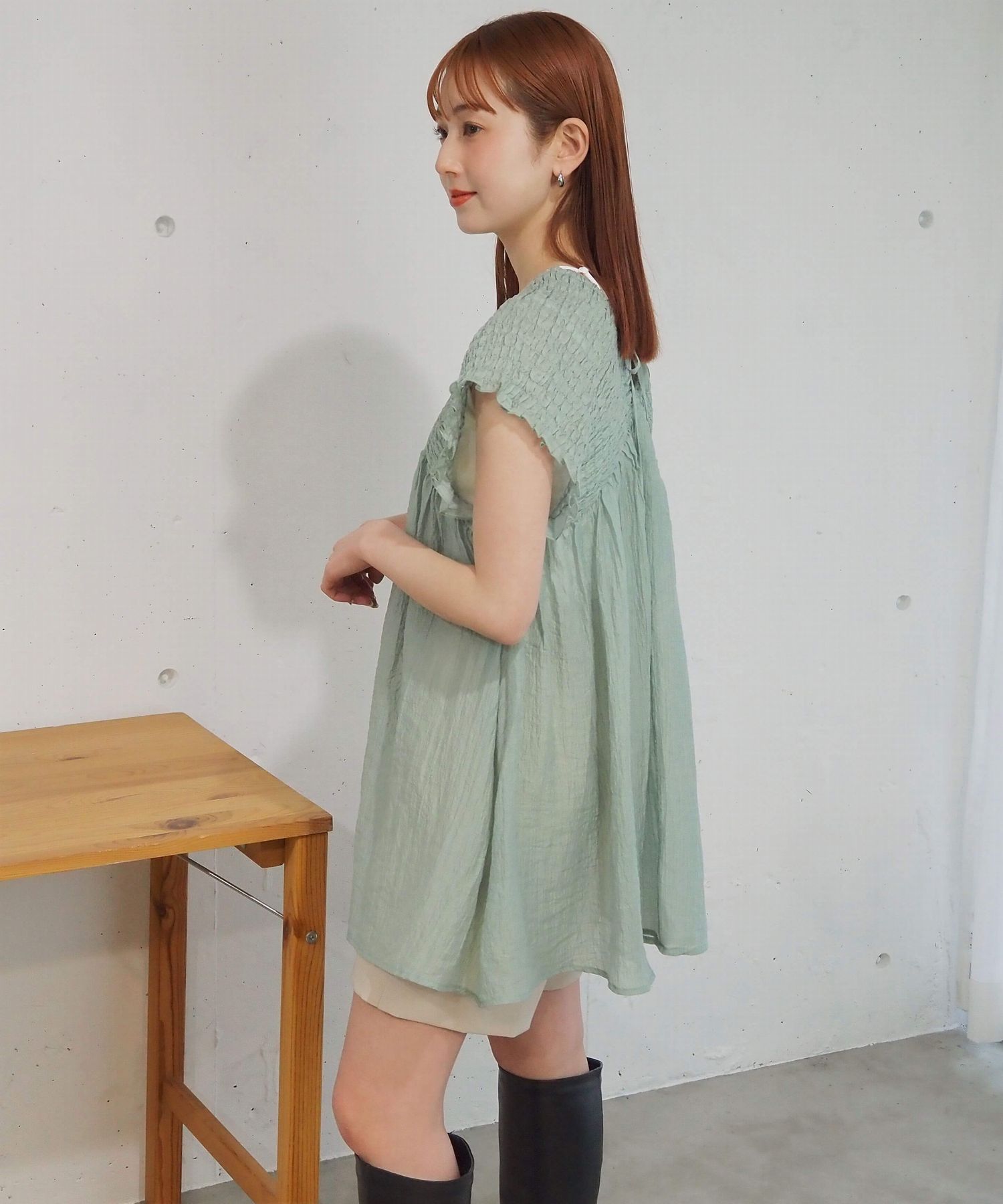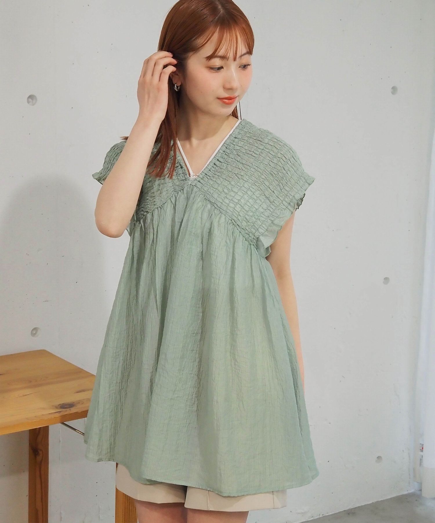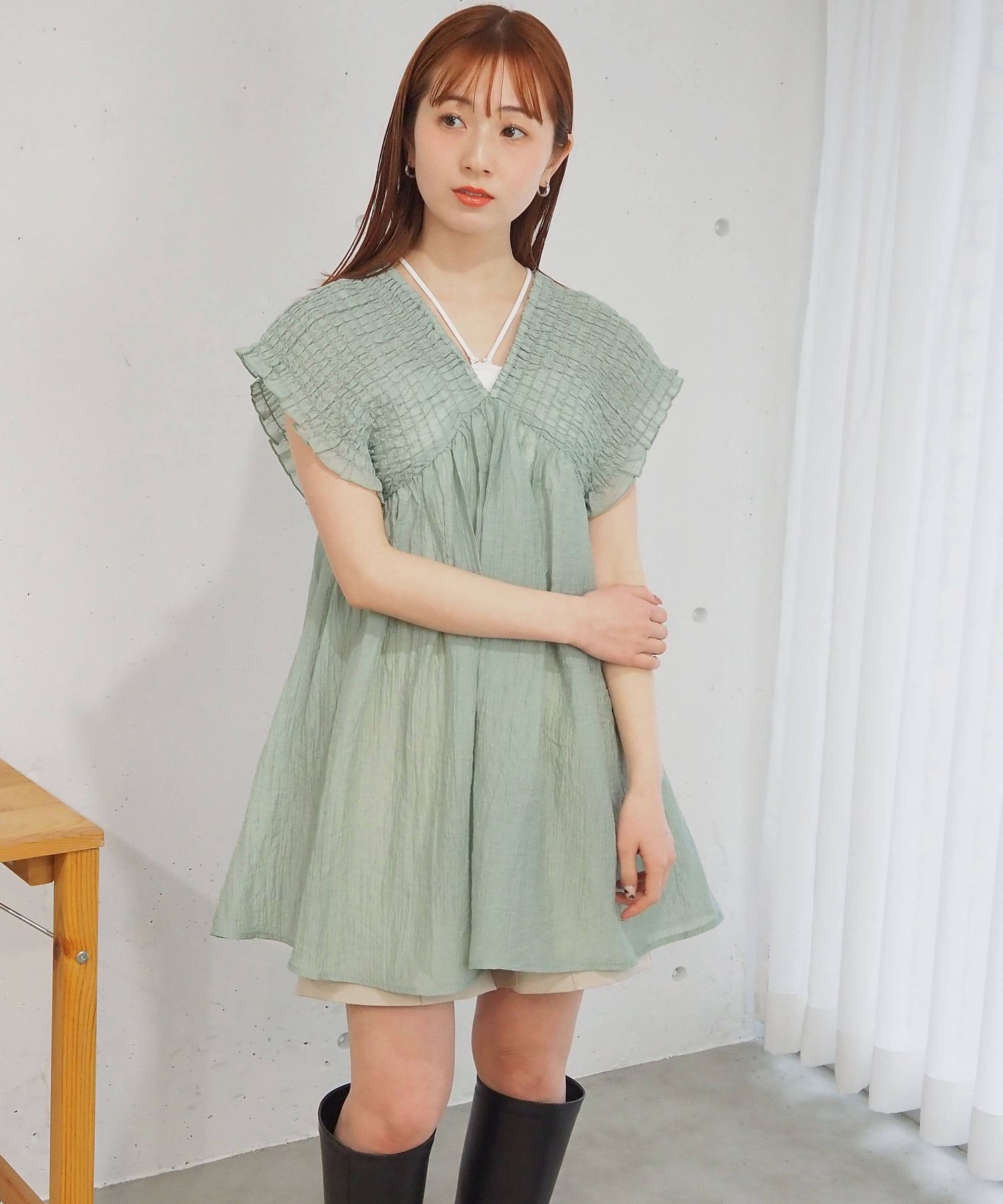 ・シャーリングデザインが目を惹くミニワンピース。