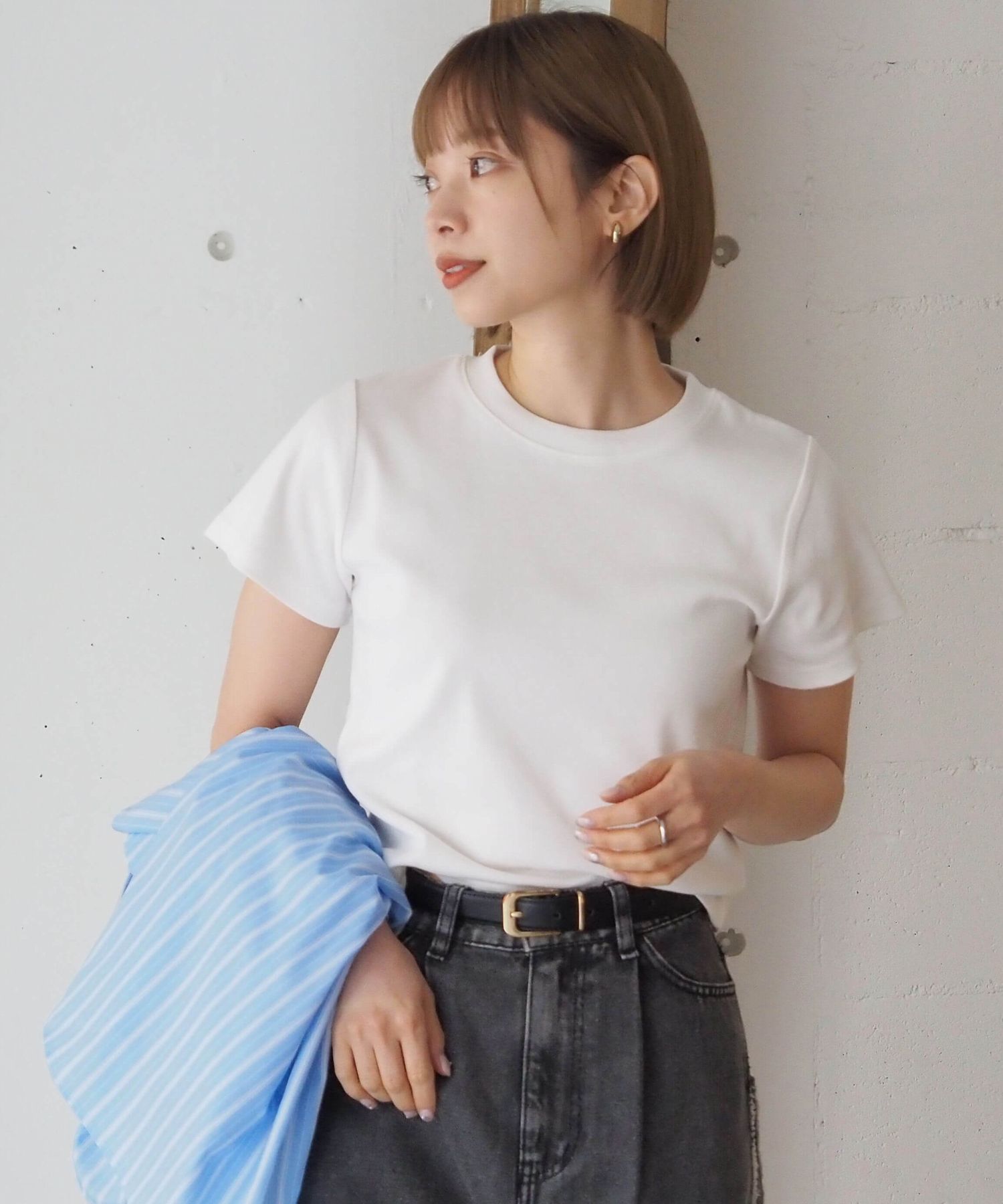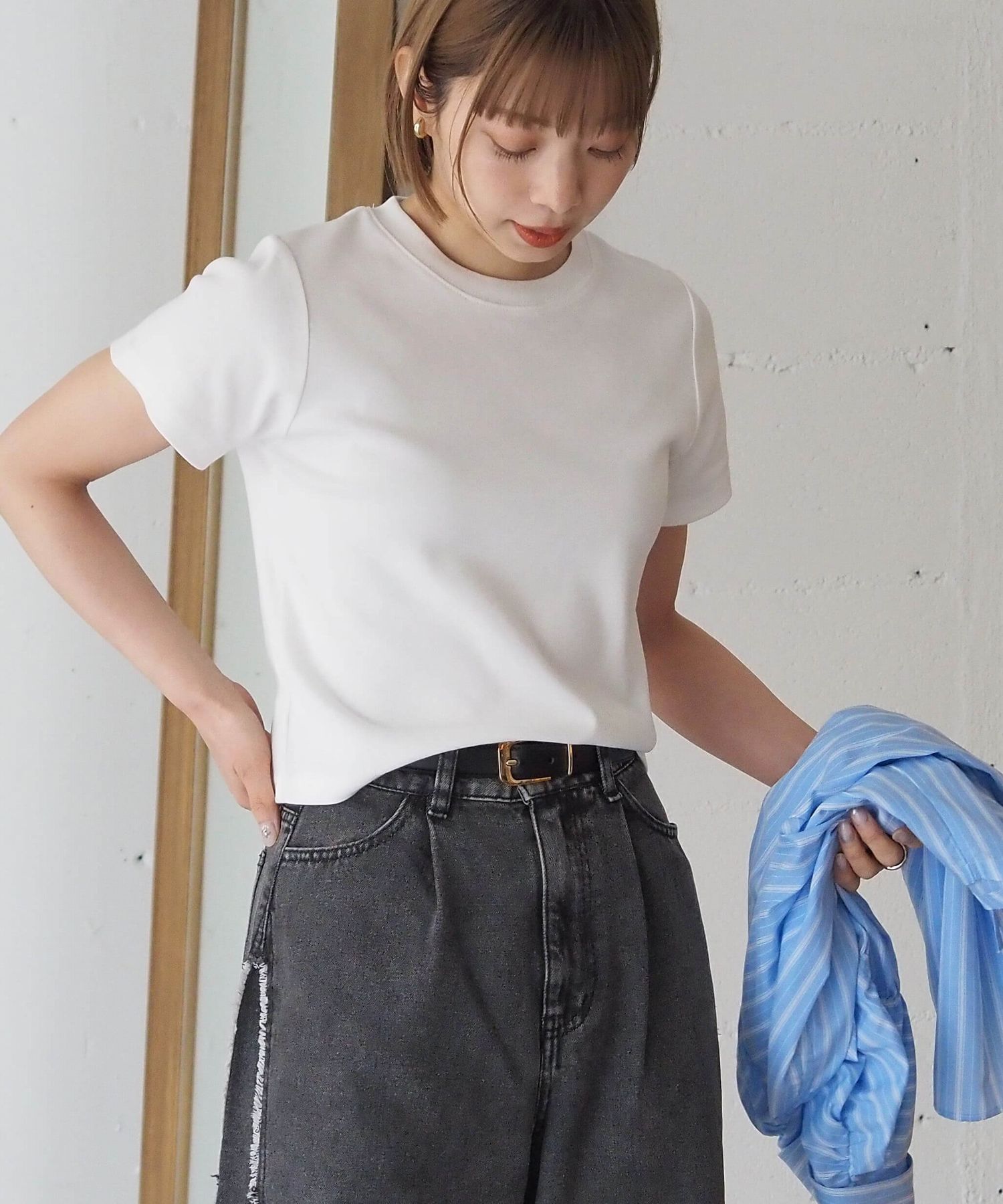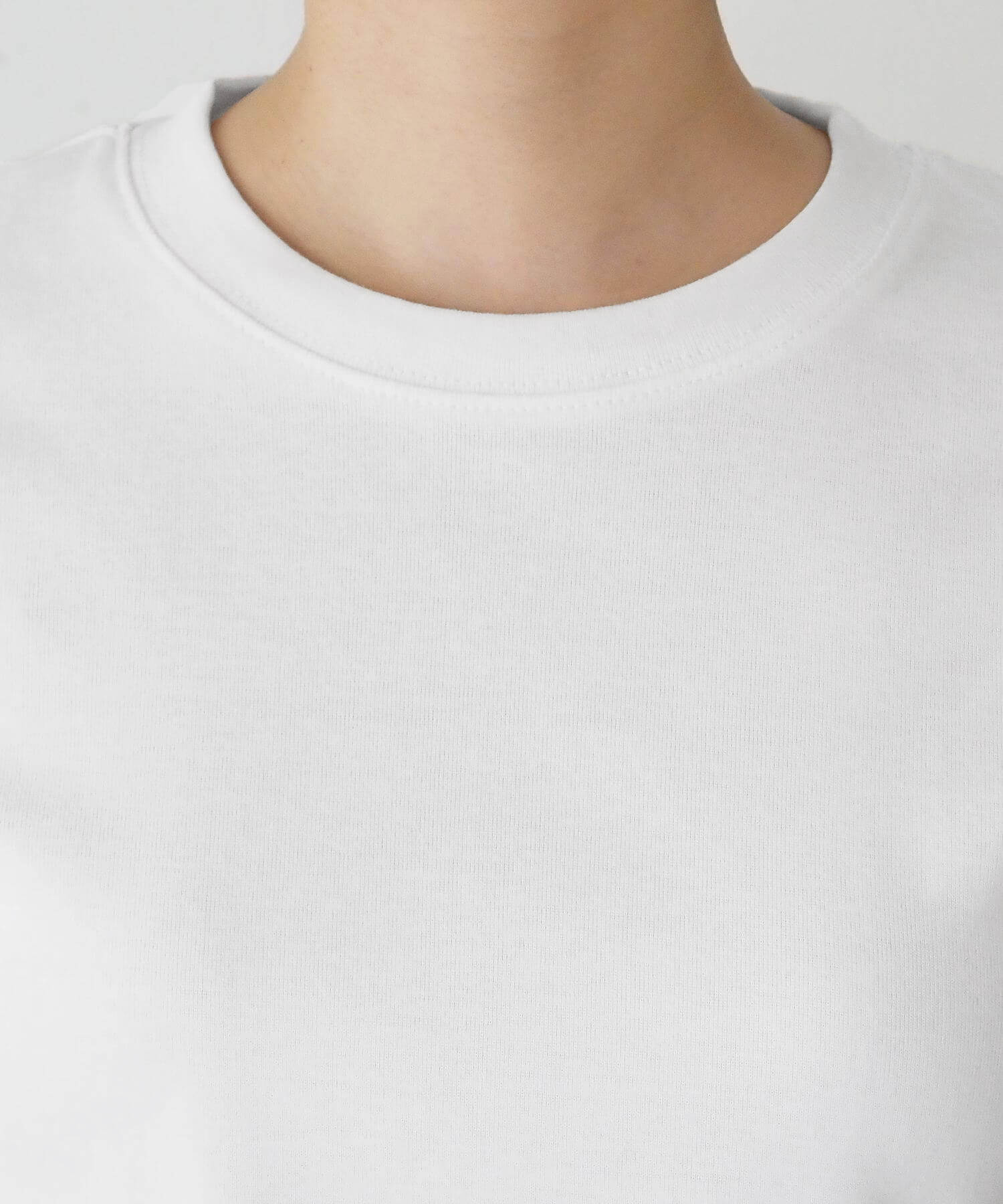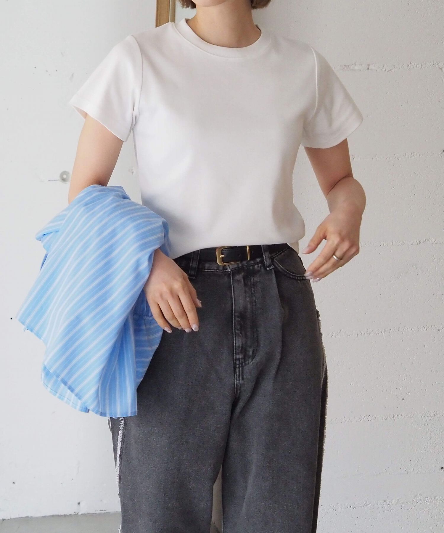 ・大人カジュアルな印象に仕上がる絶妙なクルーネックや、肩周りをすっきりと見せる袖丈もポイント。
