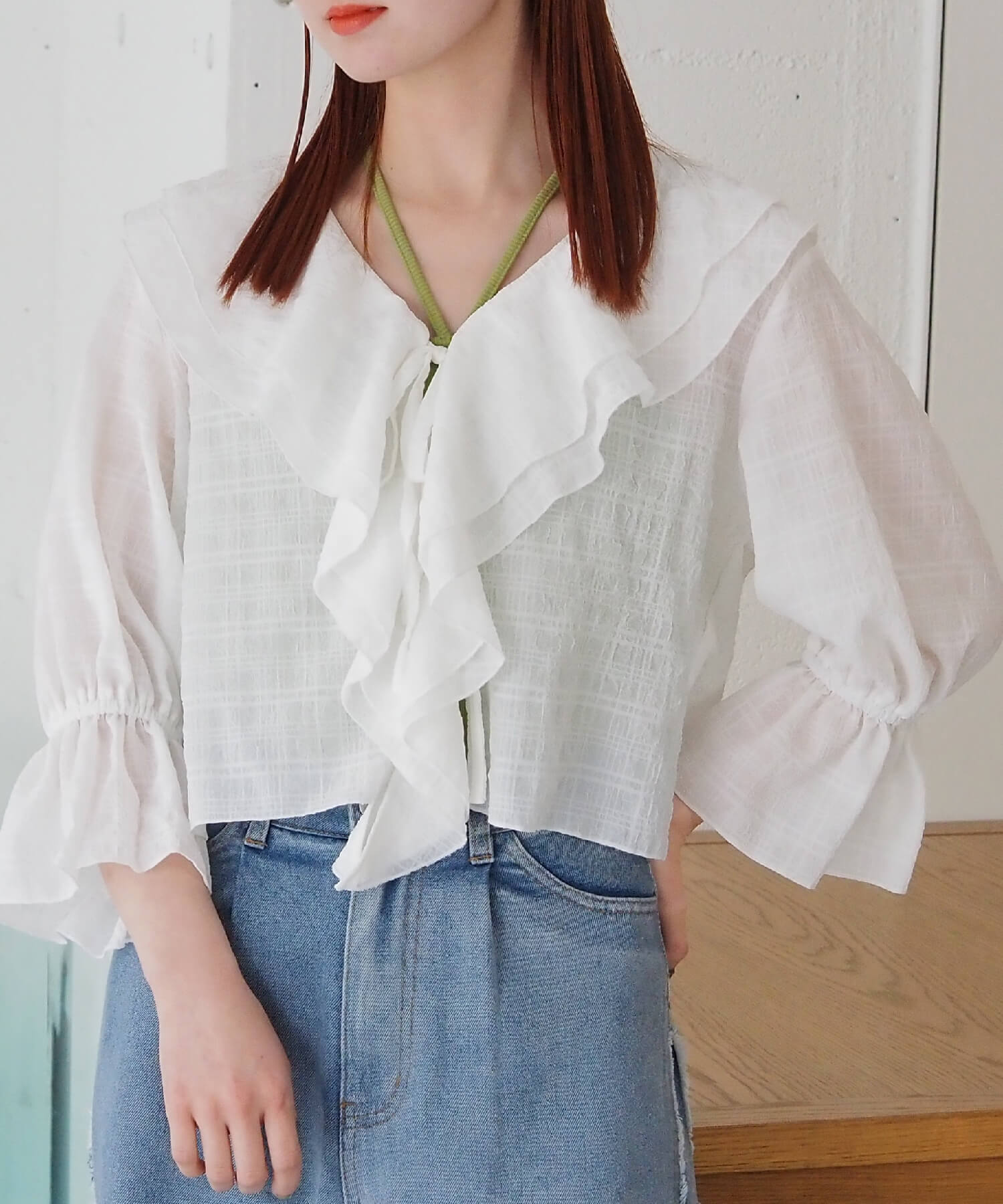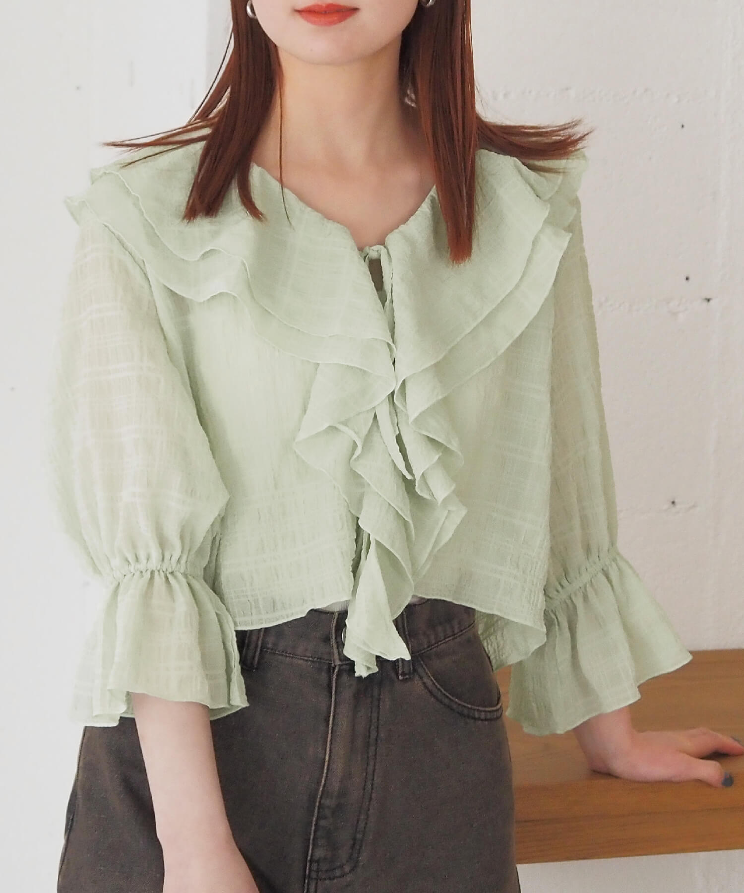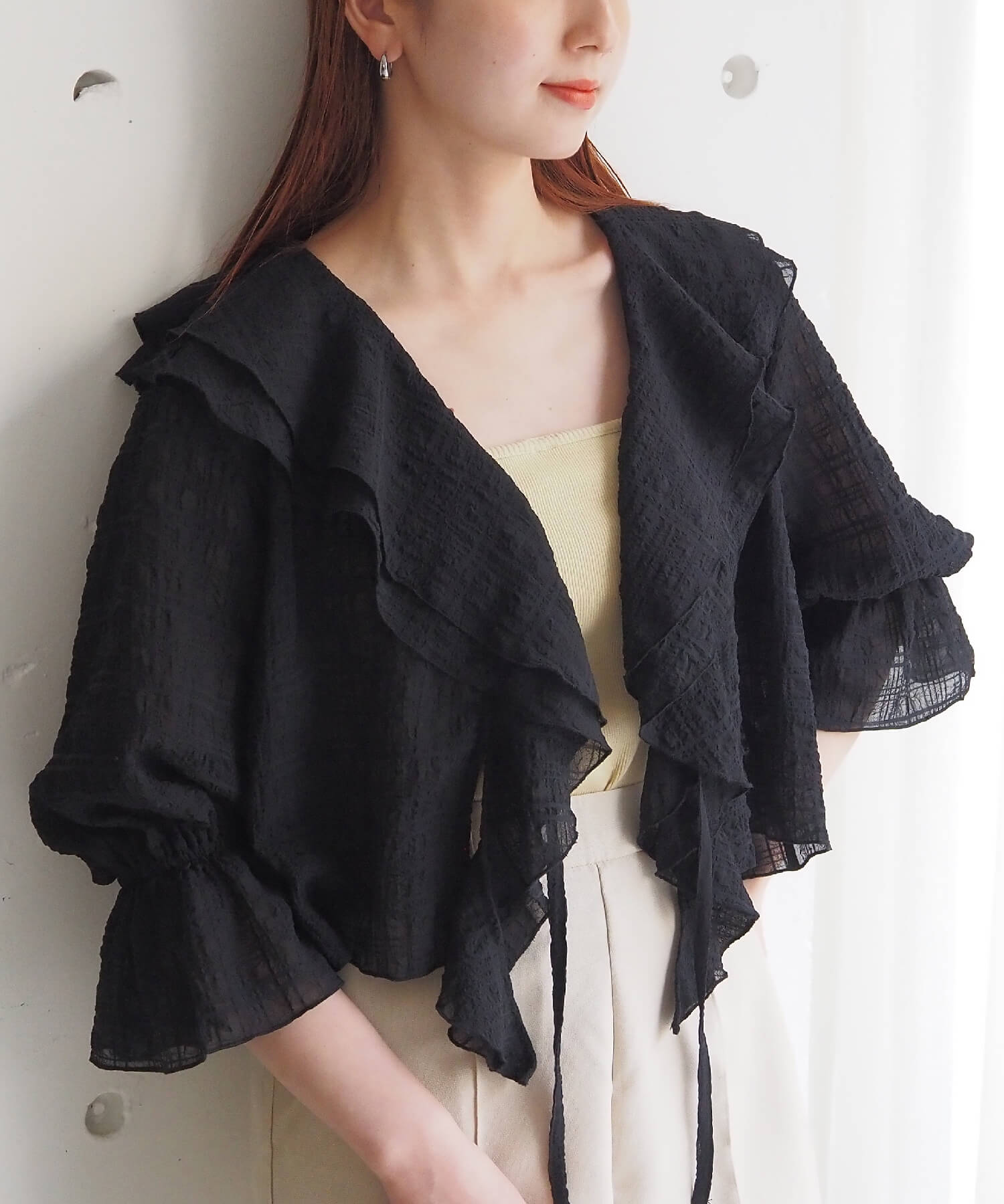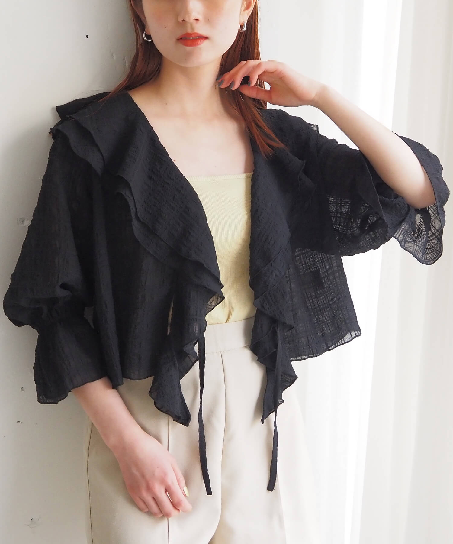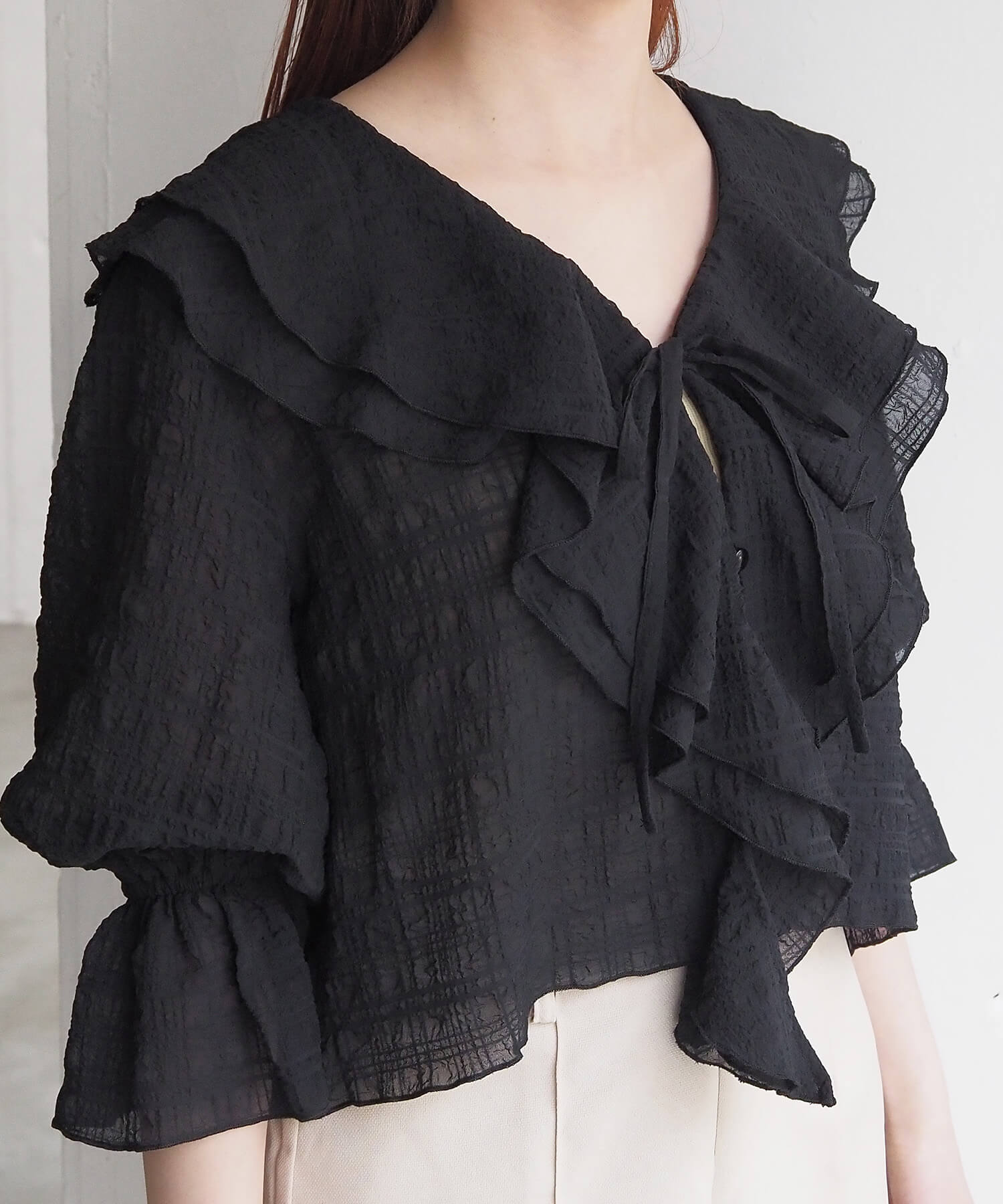 ・大きなフリル襟が華やかなショート丈のシアーブラウス。