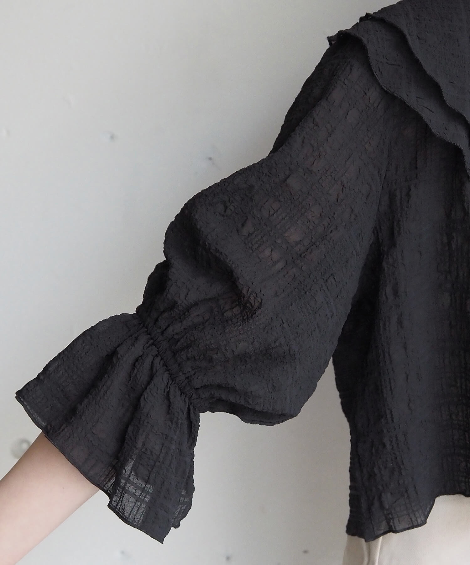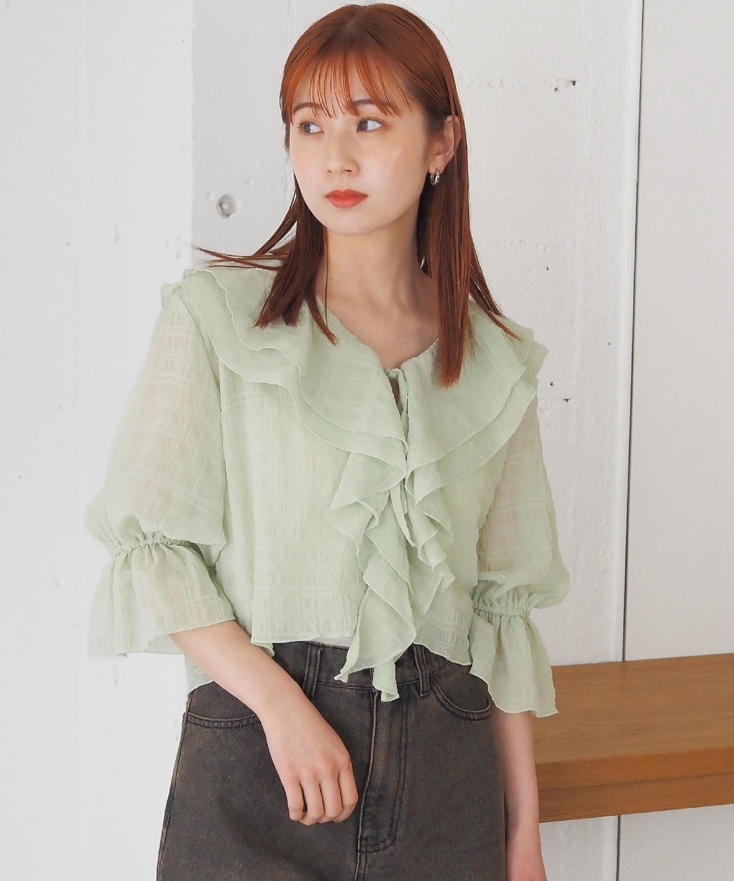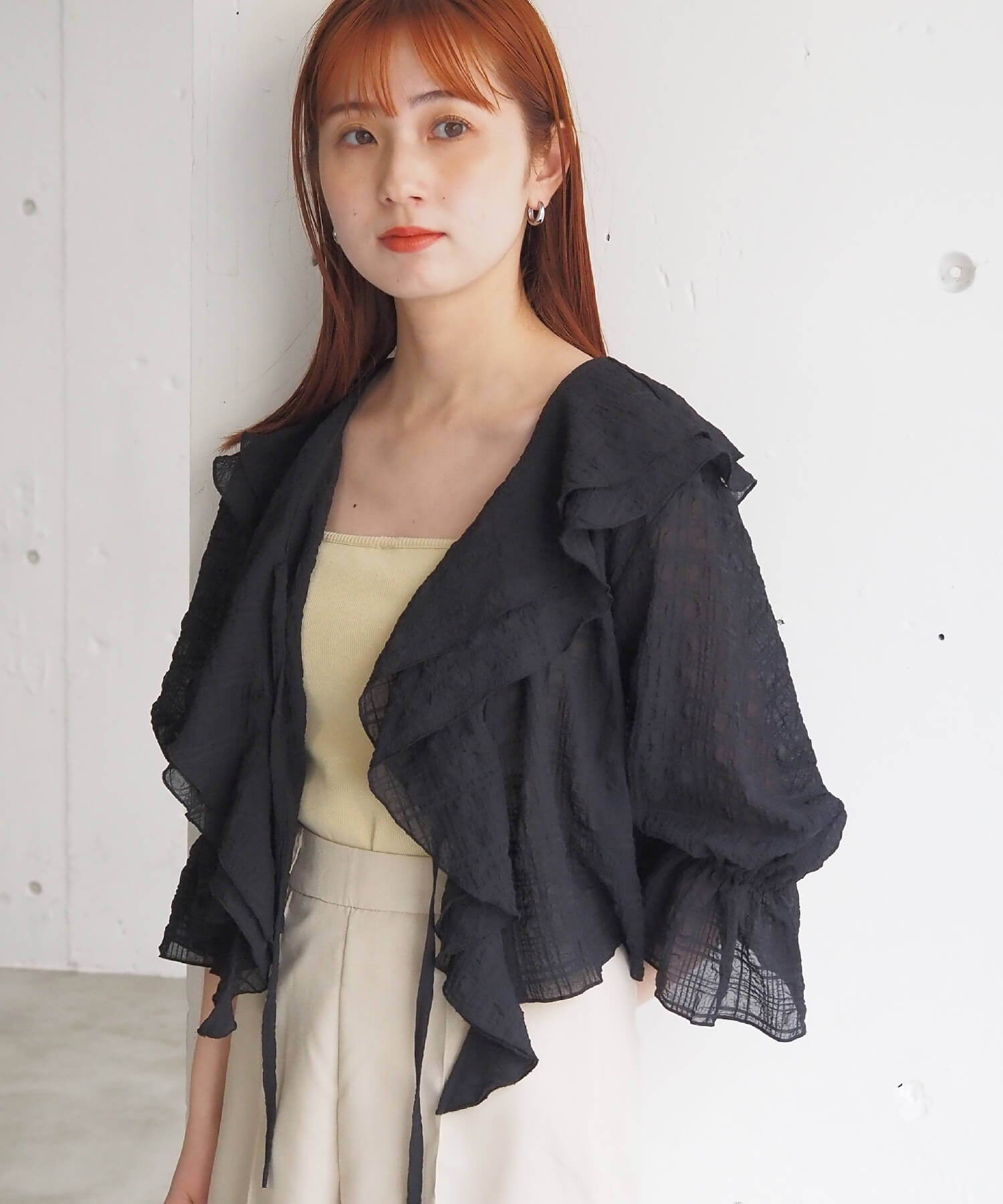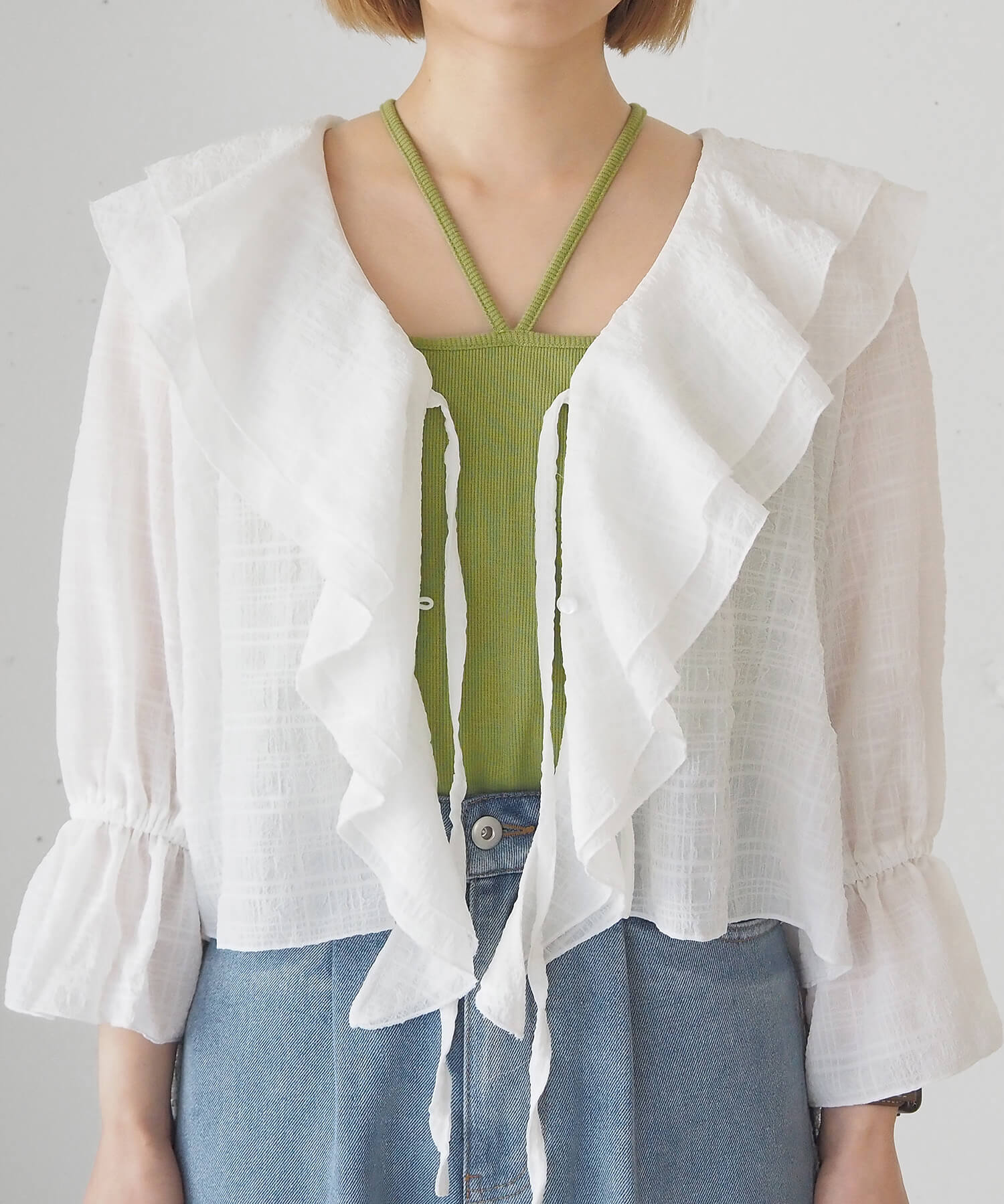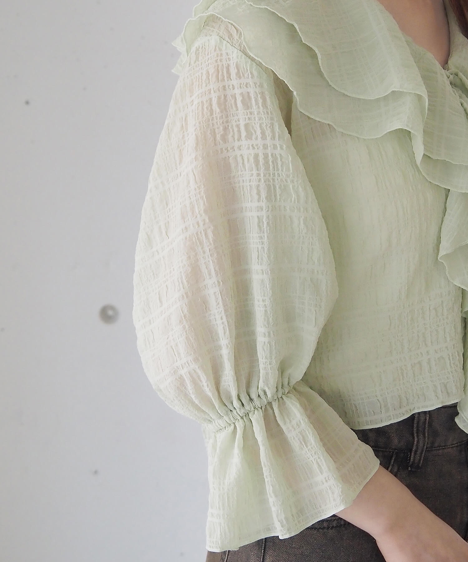 ・大きなフリル襟が華やかなショート丈のシアーブラウス。
