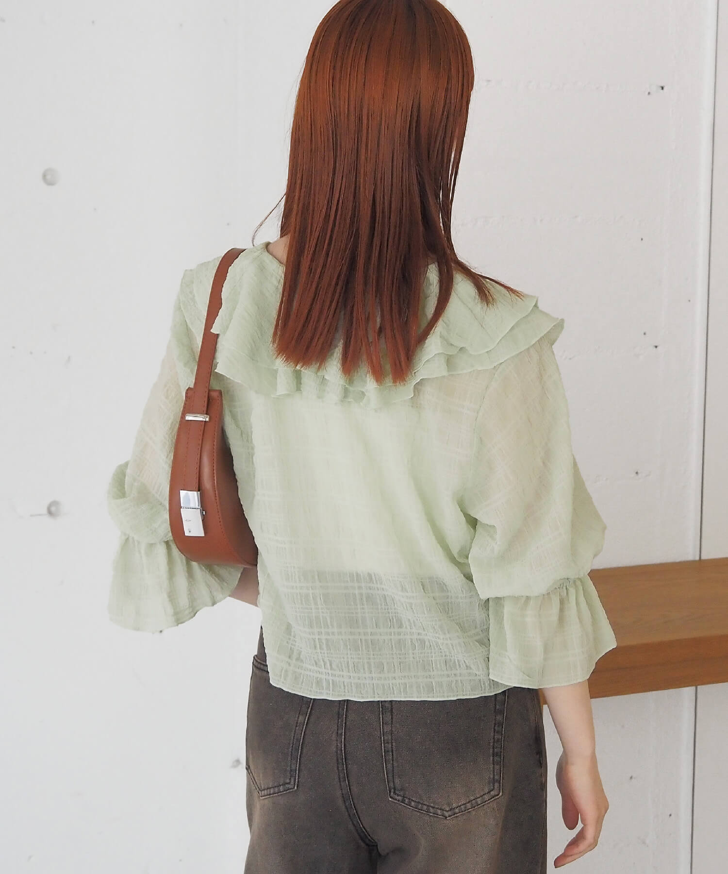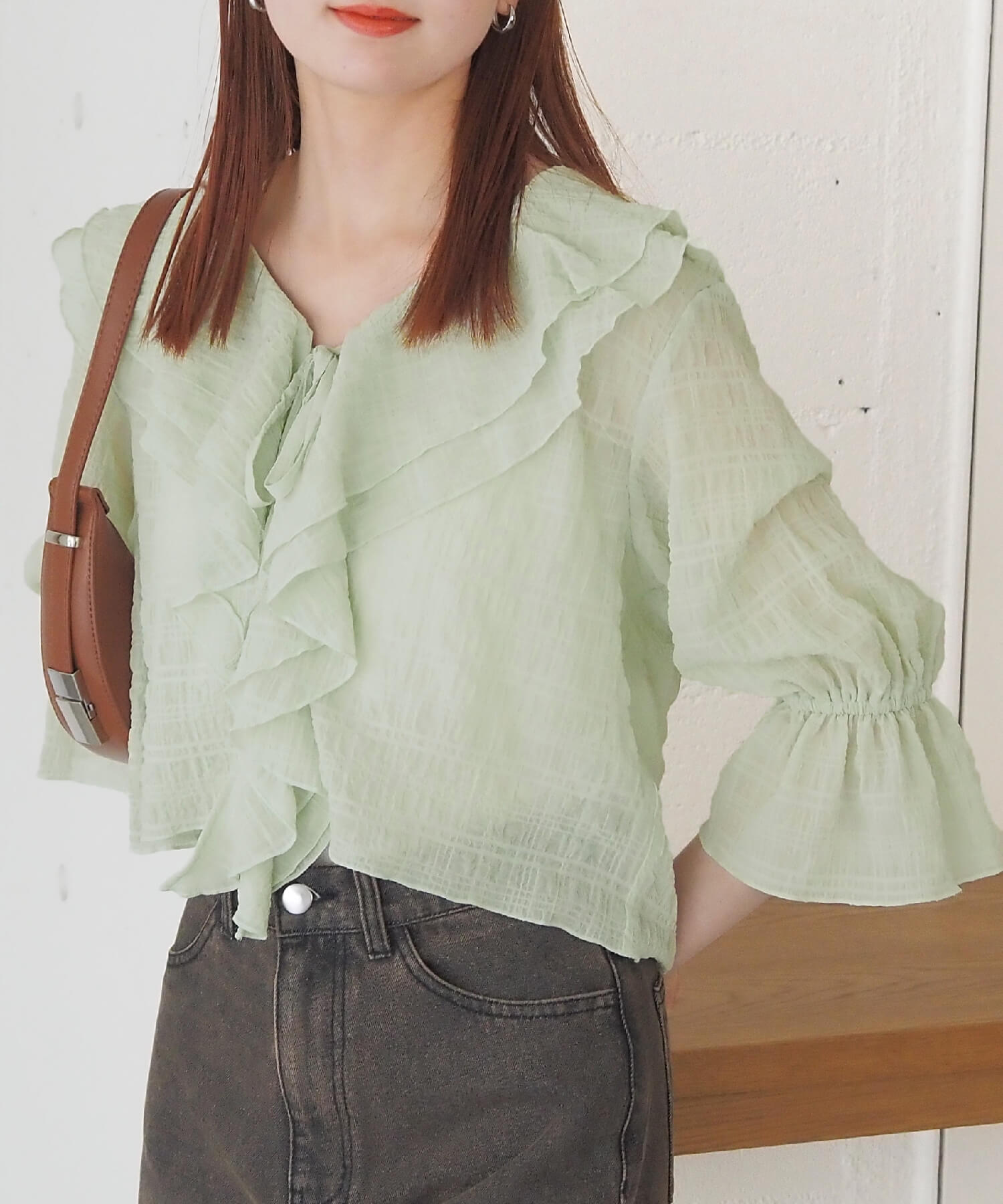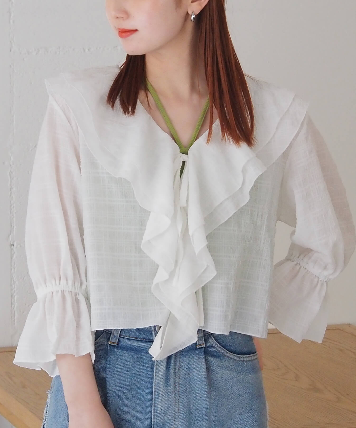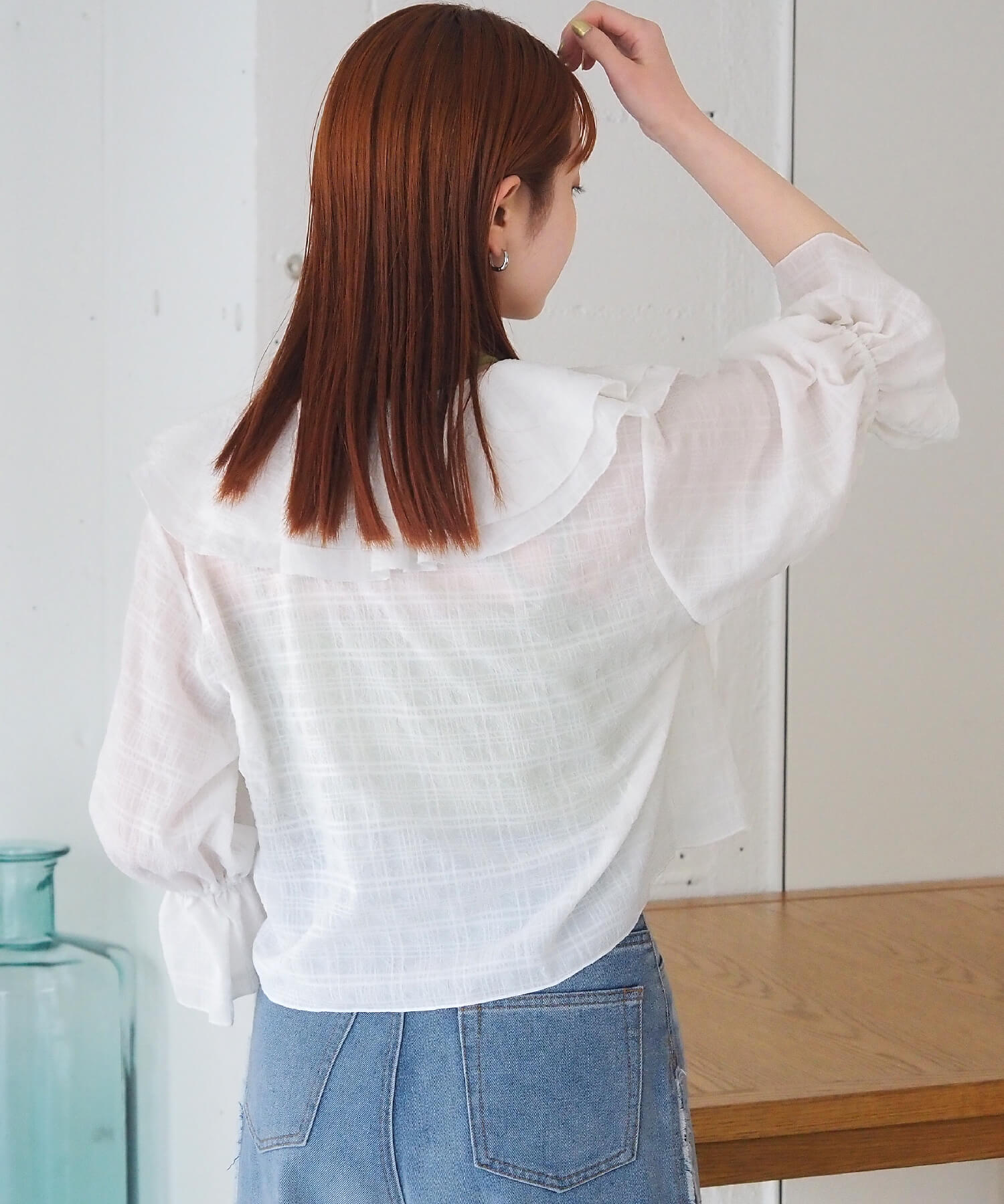 ・大きなフリル襟が華やかなショート丈のシアーブラウス。