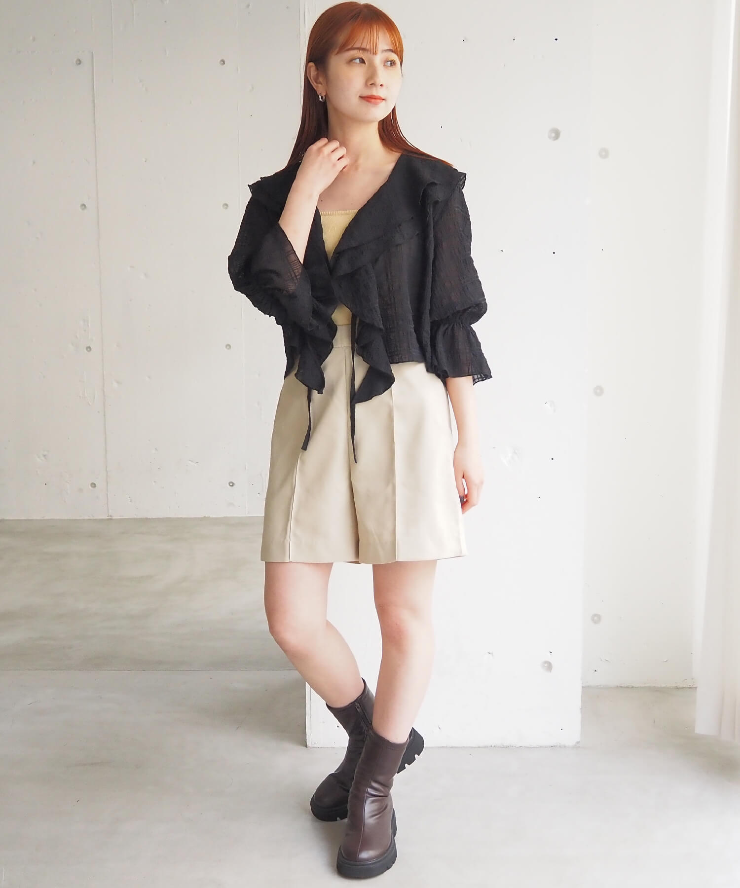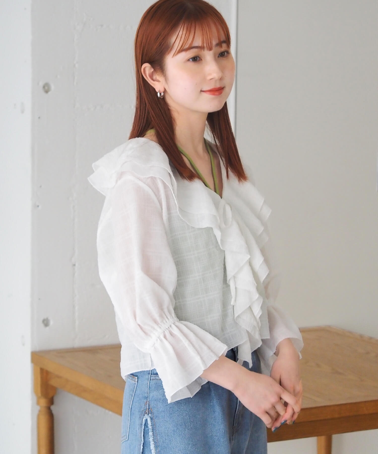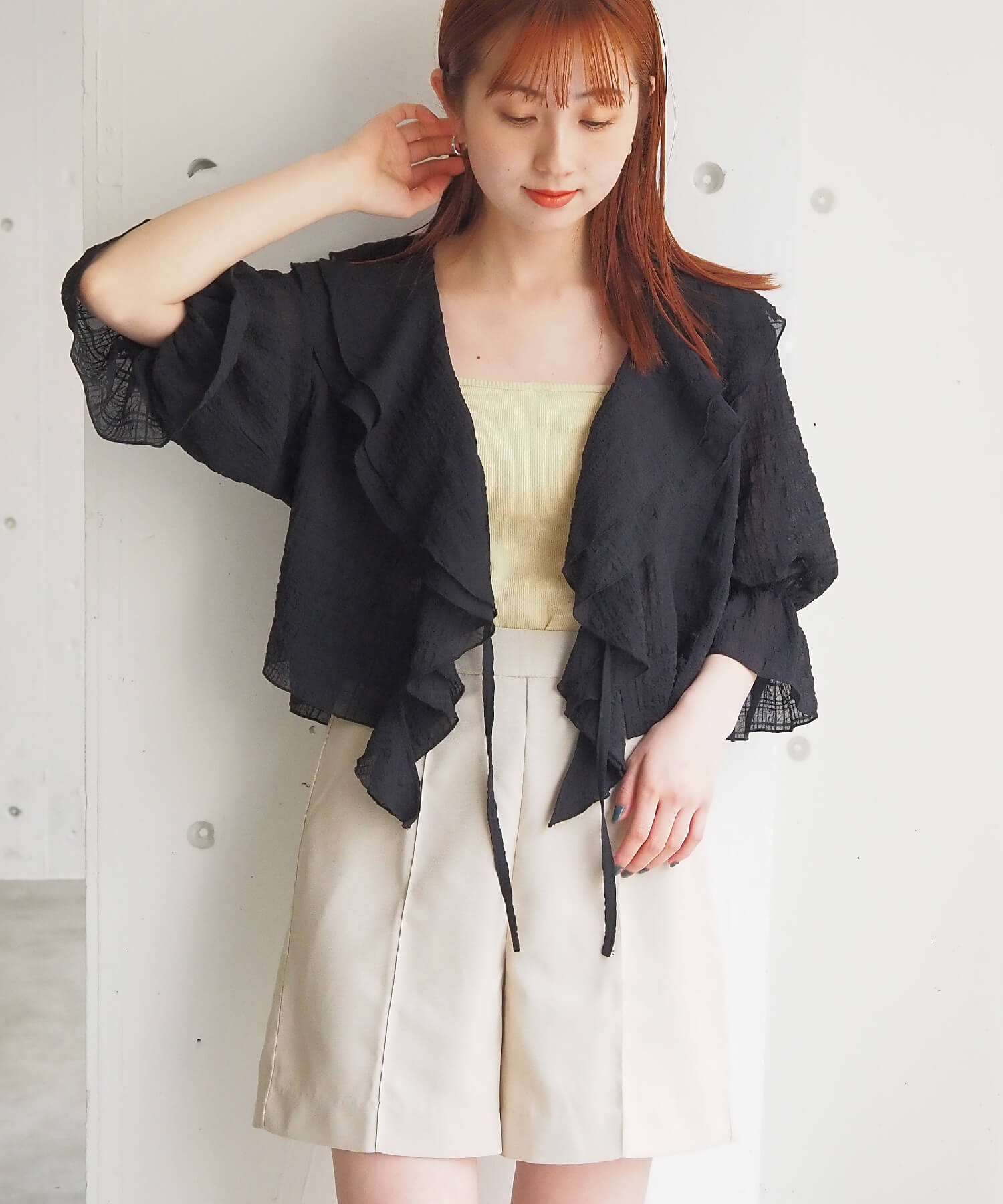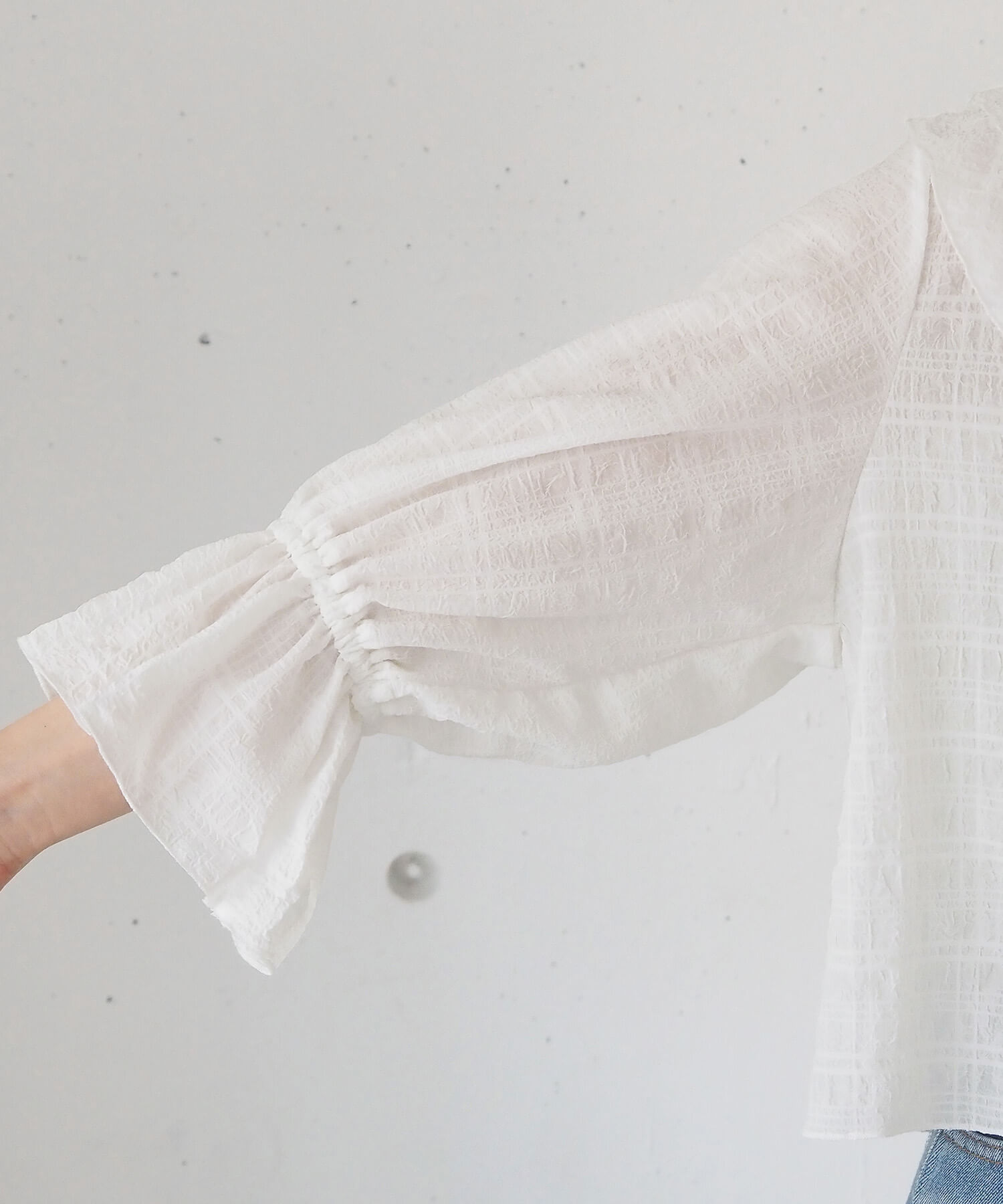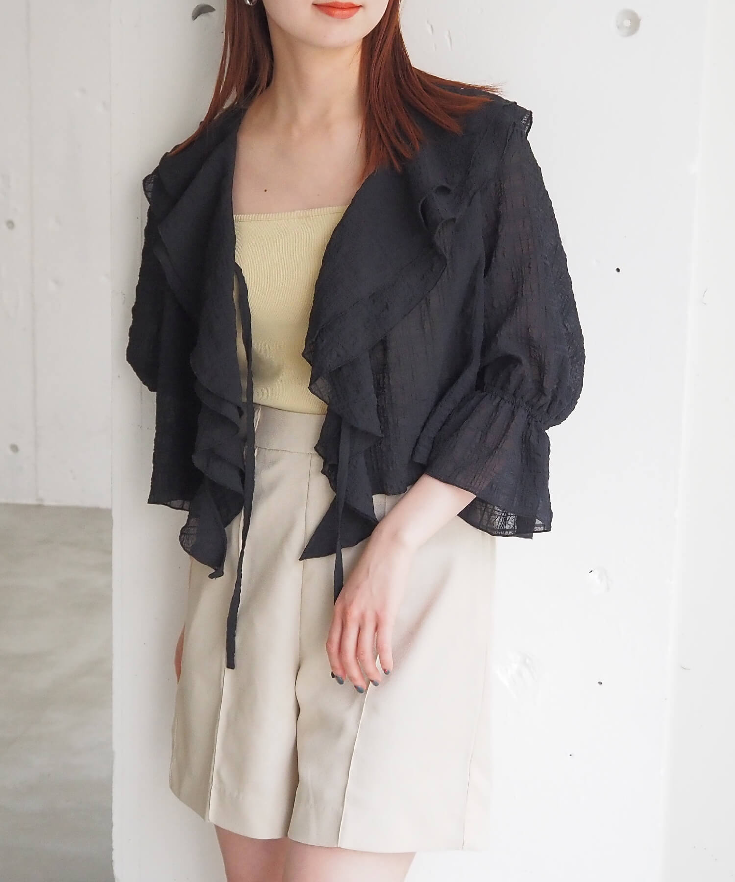 ・大きなフリル襟が華やかなショート丈のシアーブラウス。
