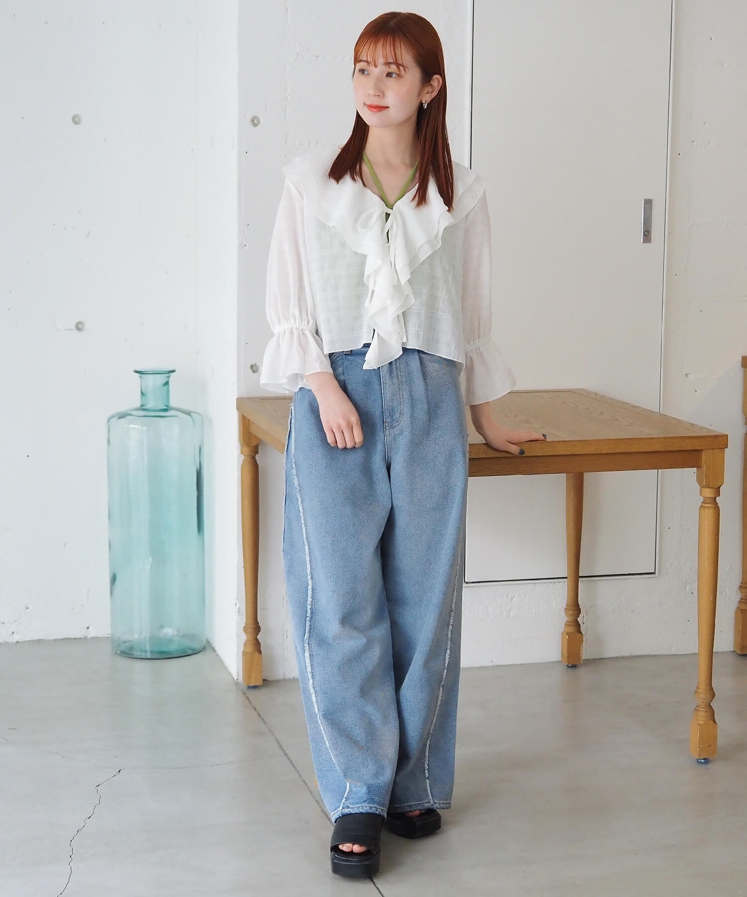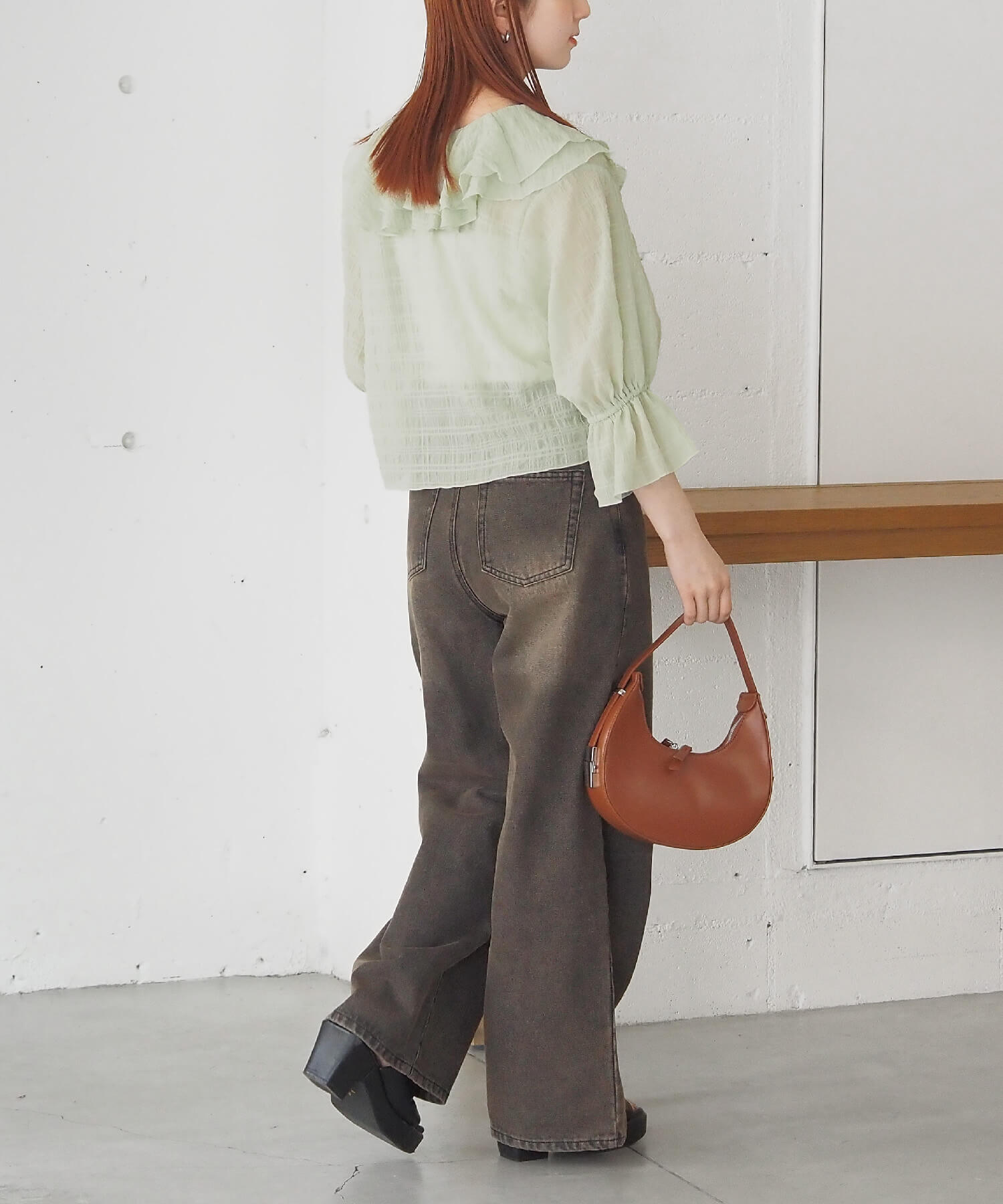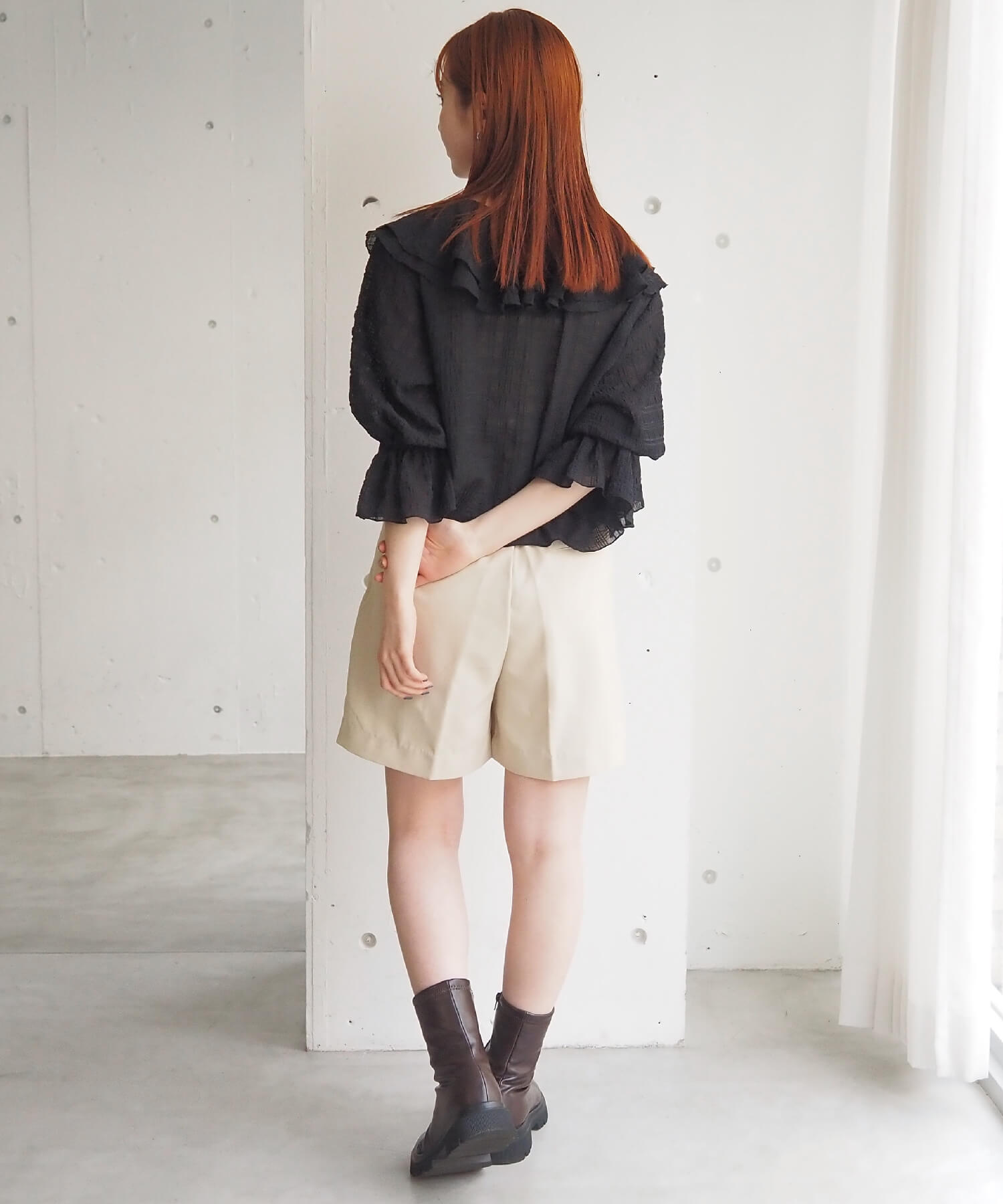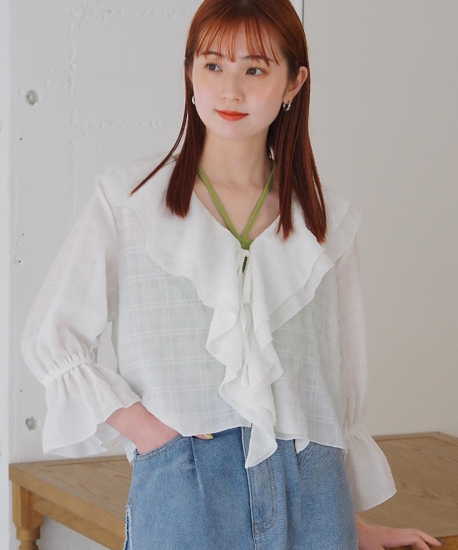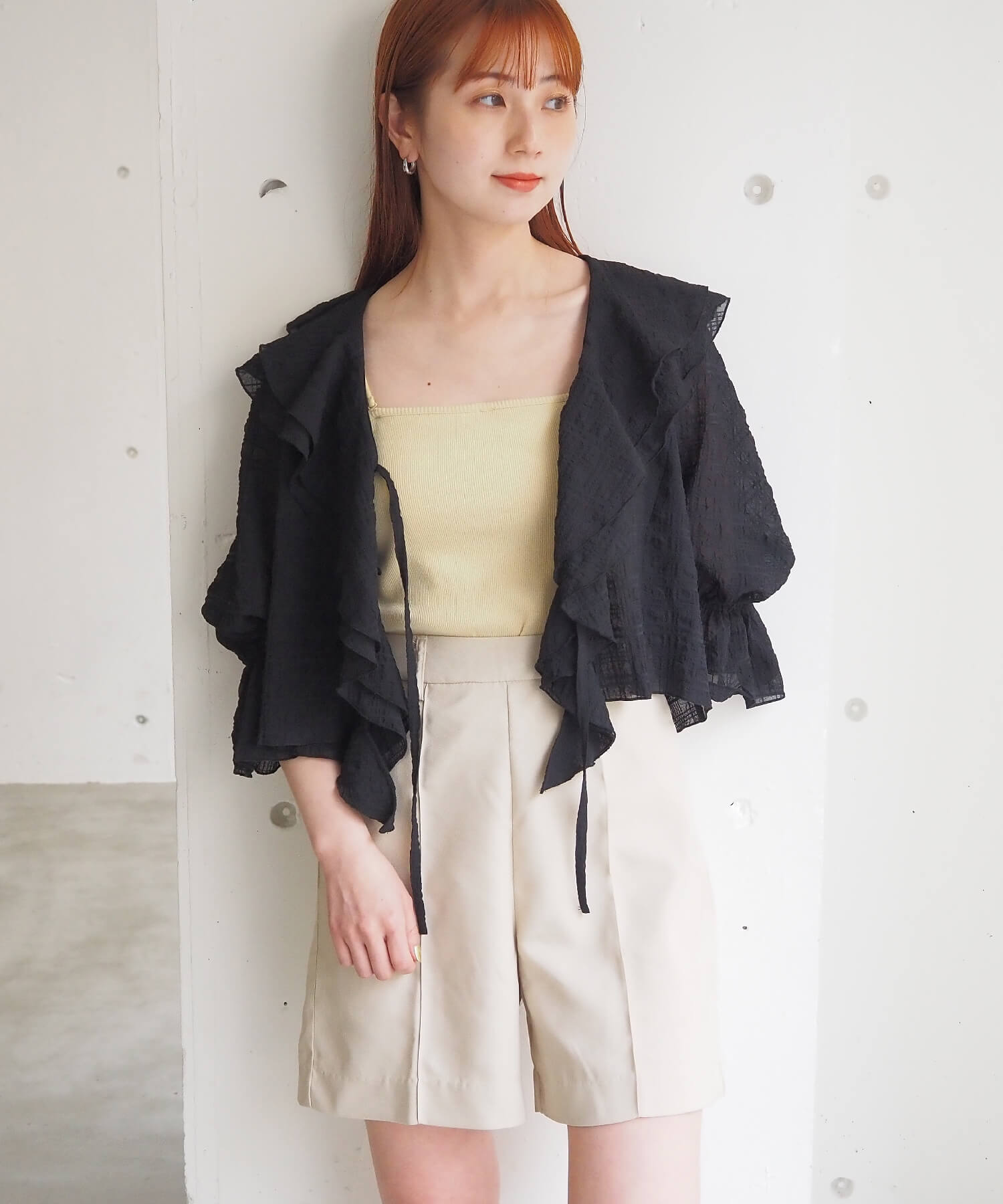 ・大きなフリル襟が華やかなショート丈のシアーブラウス。