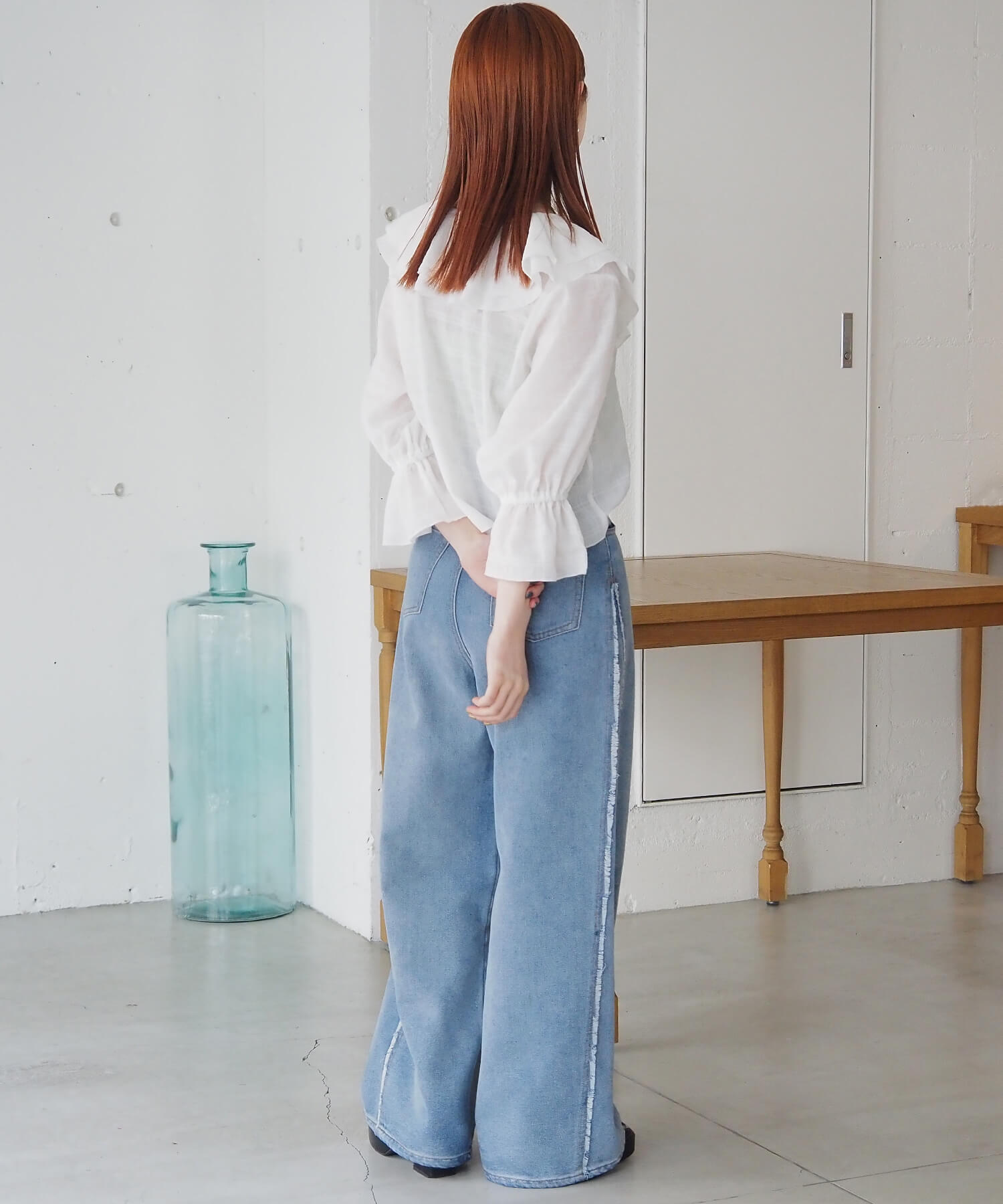 ・襟からフロントにかけて施された2枚仕立てのフリルが、着るだけで女性らしい印象をつくります。