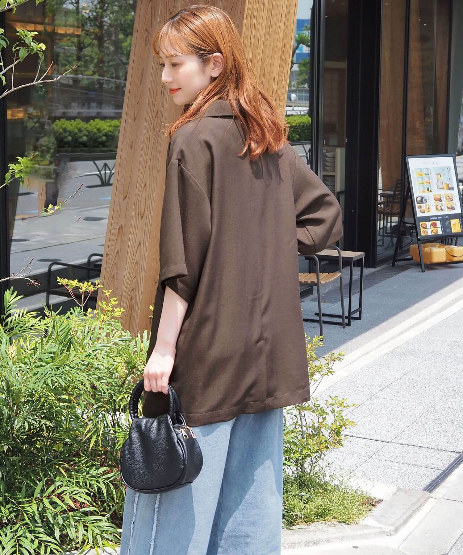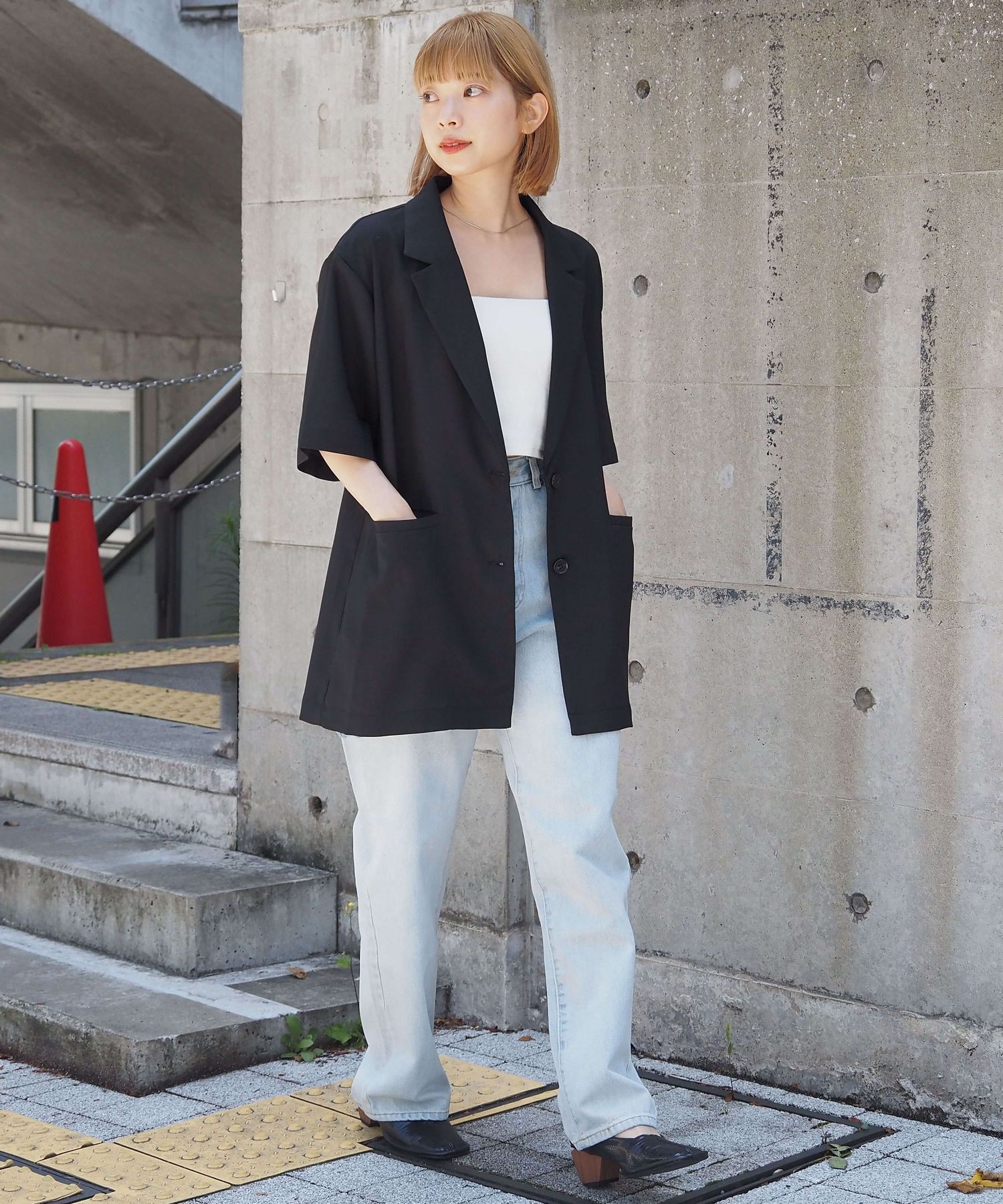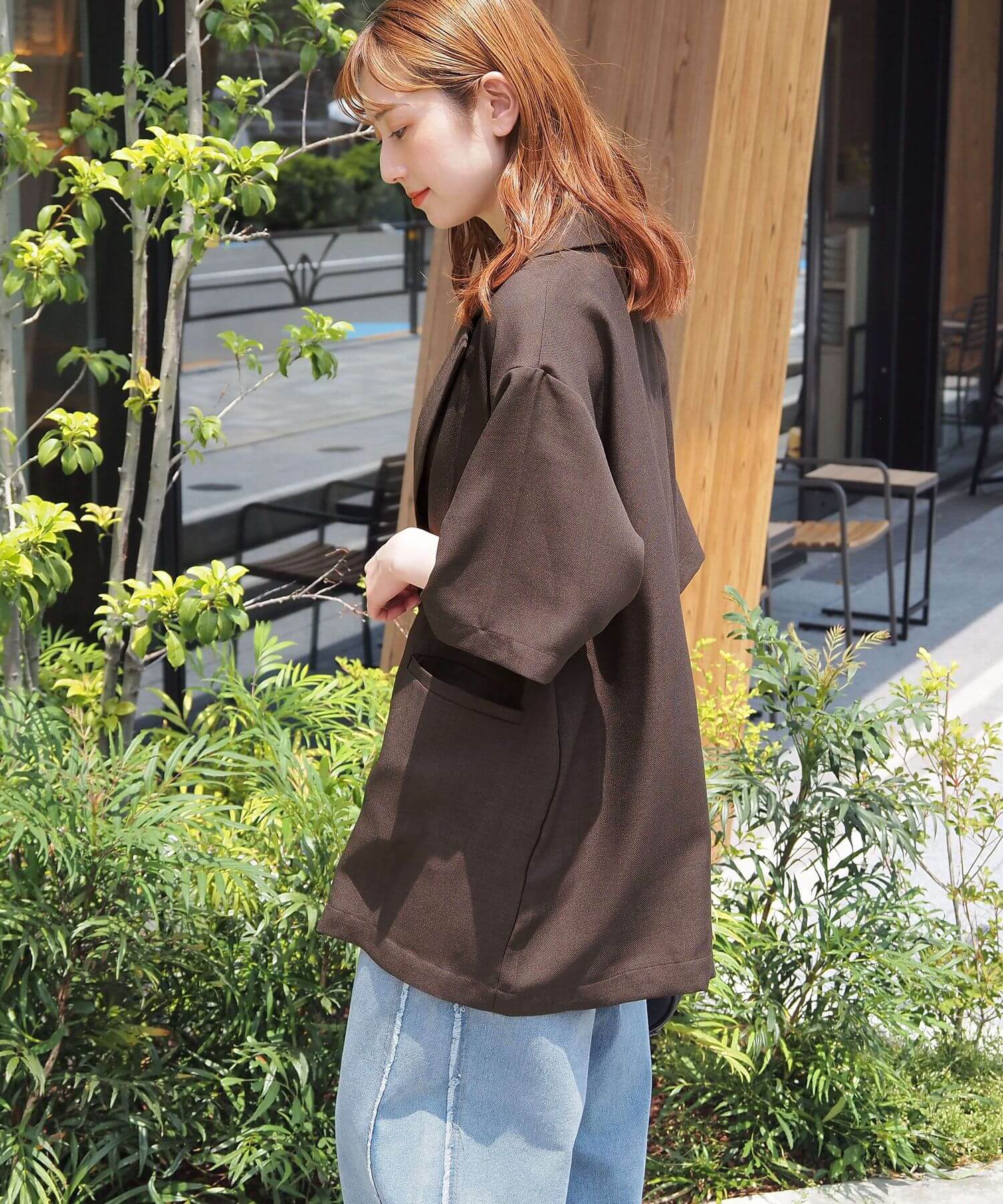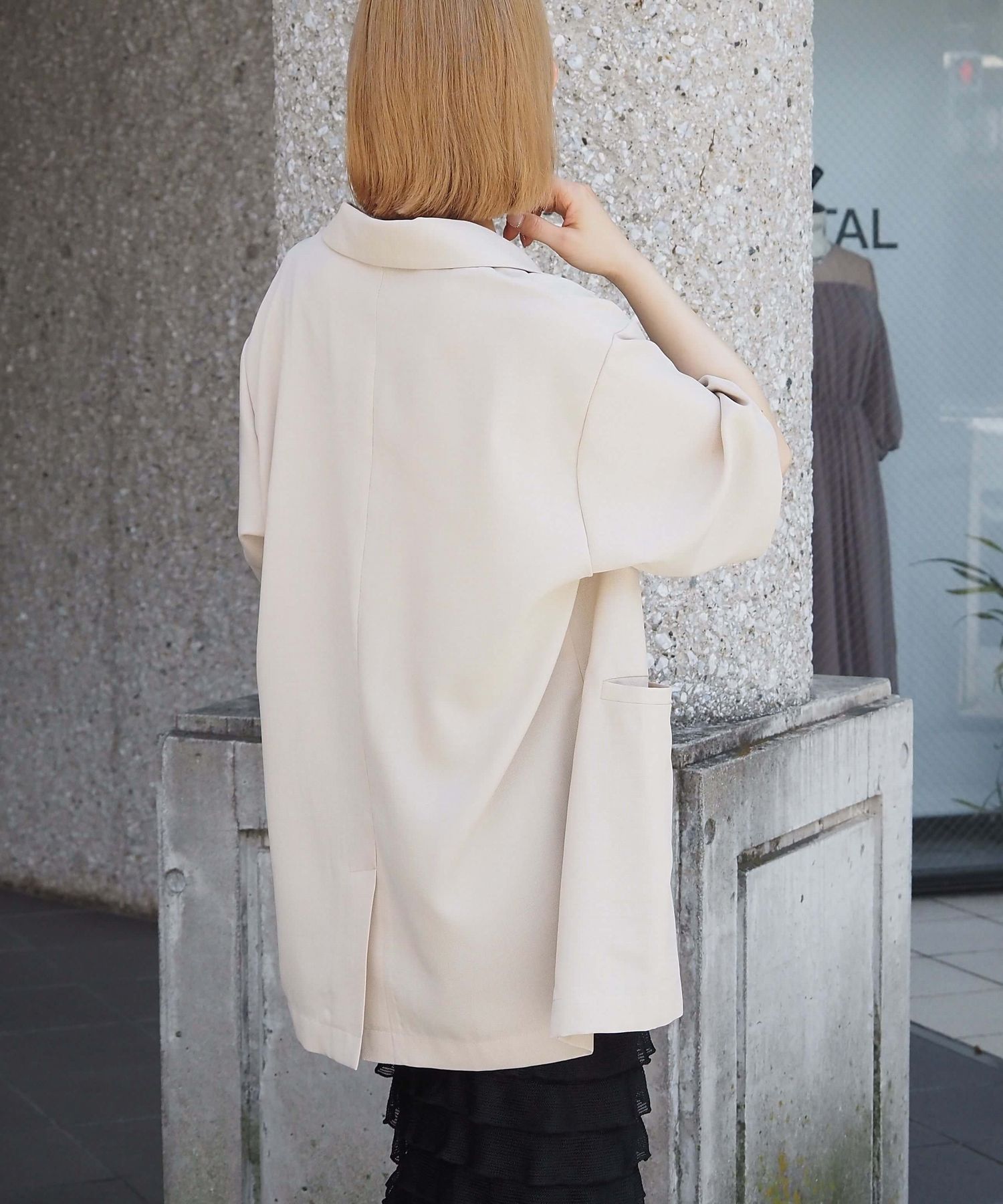 ・上品なテーラードデザインをビッグシルエットで仕上げたので、こなれ感のある大人カジュアルが楽しめます。